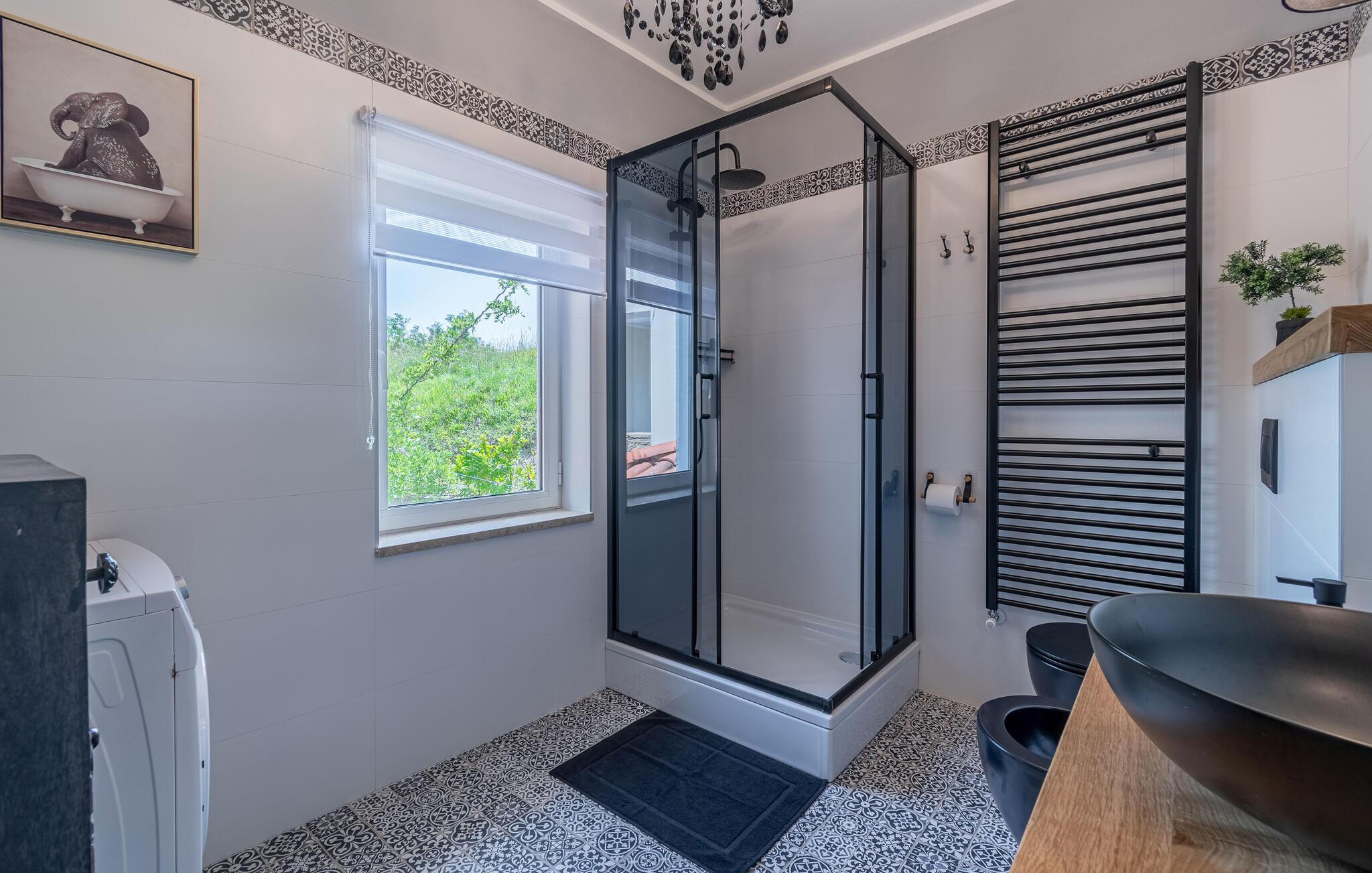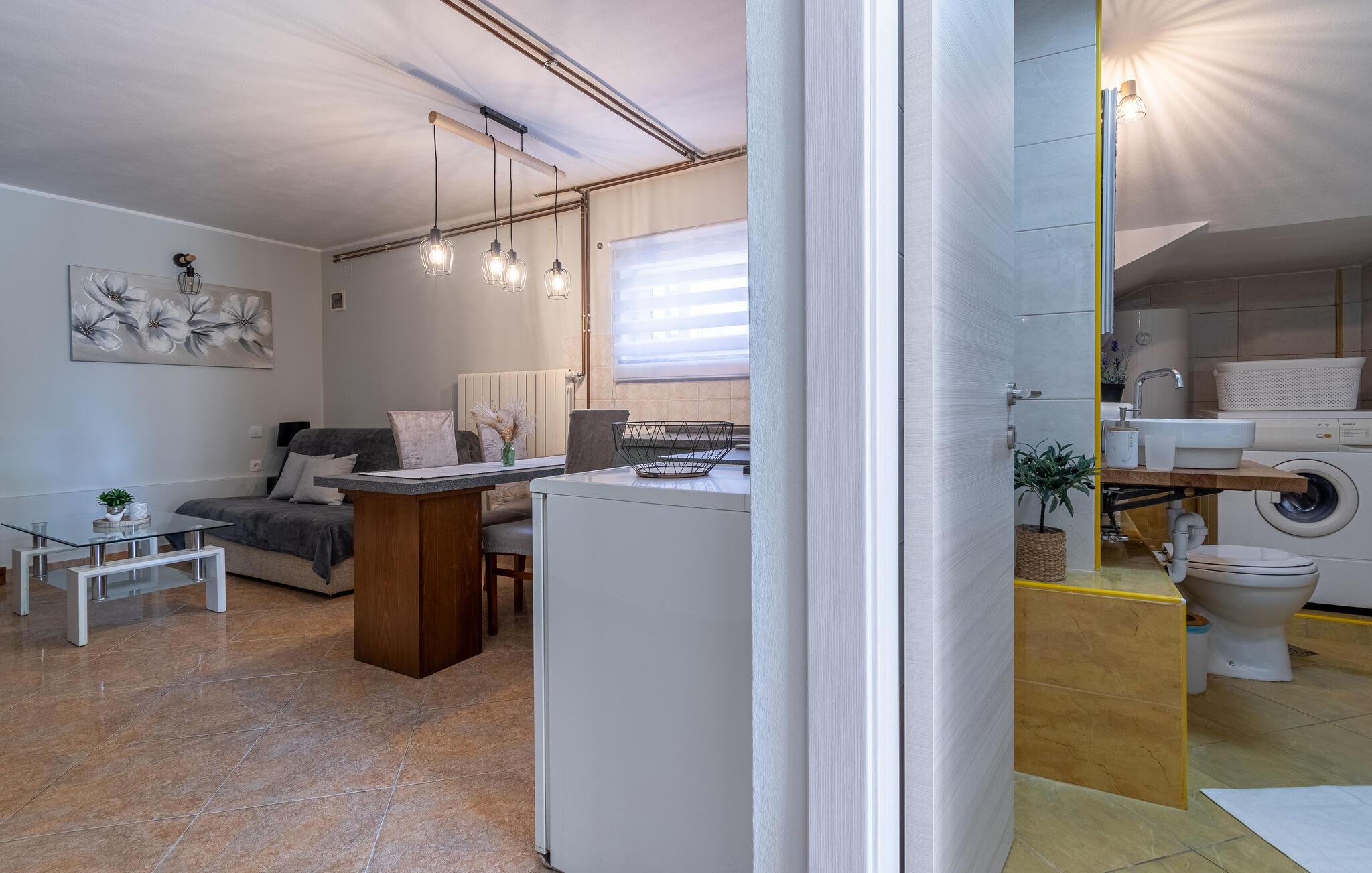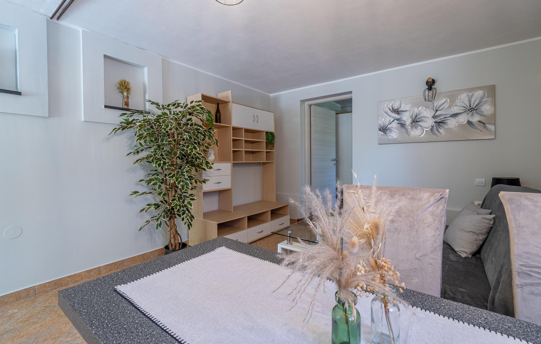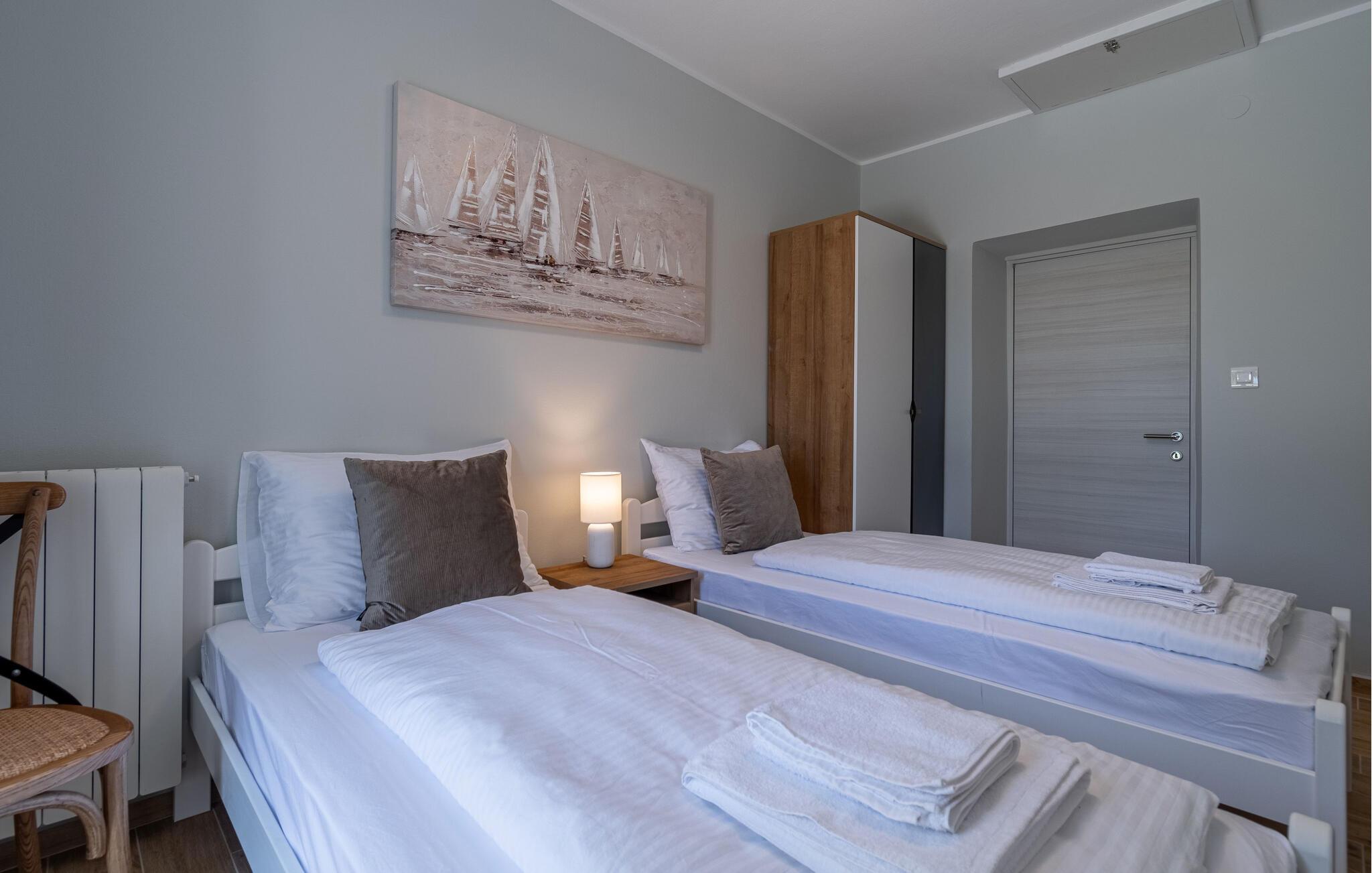 Dette vakre tomannsboligen med basseng og velholdt hage ligger i hjertet av Istria. De to halvdelene av huset er atskilt fra hverandre og kan bare nås utenfra. Alt er pent og komfortabelt innredet. I første etasje er det separate innganger til stuen og det ekstra soverommet med eget bad. I 1. etasje finner du de resterende tre soverommene, badet og kjøkkenet med spisestuen. I hagen er det fasiliteter for volleyball, badminton, fotball og en lekeplass for barn. Det omkringliggende landskapet er grønt og hjem til mange konobas og vingårder, og inviterer deg til å ta fantastiske turer. Smak på det istriske kjøkkenet, spesielt den deilige rå skinken med ost, oliven eller den tradisjonelle suppen, som er en spesialitet i hele Istria. Besøk de historiske og romantiske kystbyene, deres severdigheter og monumenter, nyt det rike nattelivet og dra nytte av mulighetene for forskjellige utflukter. Eieren bor i den andre halvdelen av huset. Det er en kafé ved siden av huset.