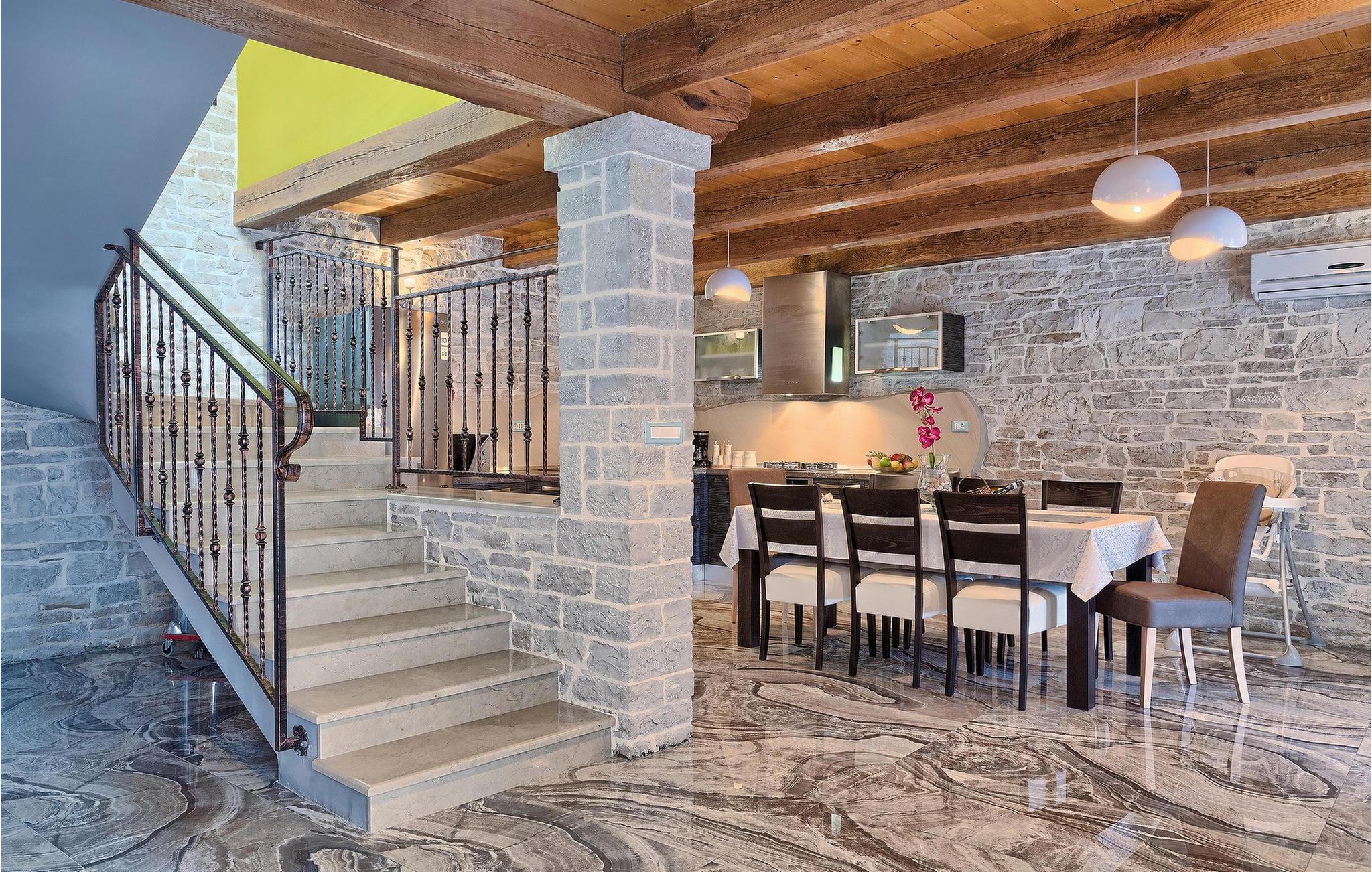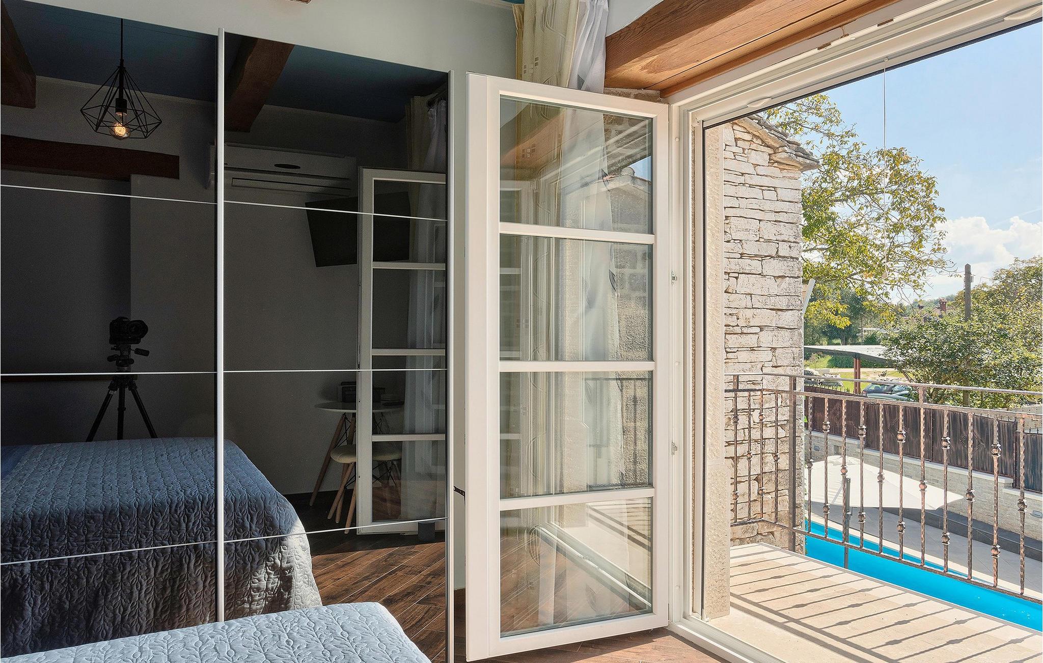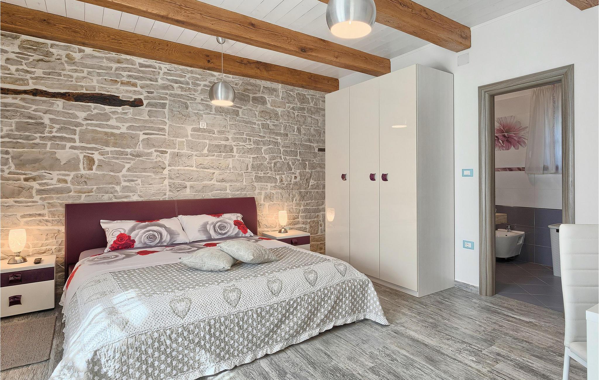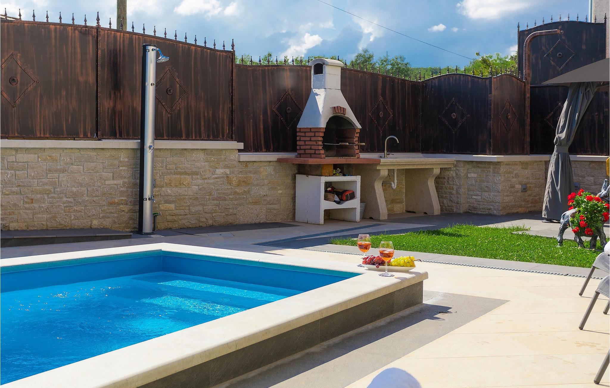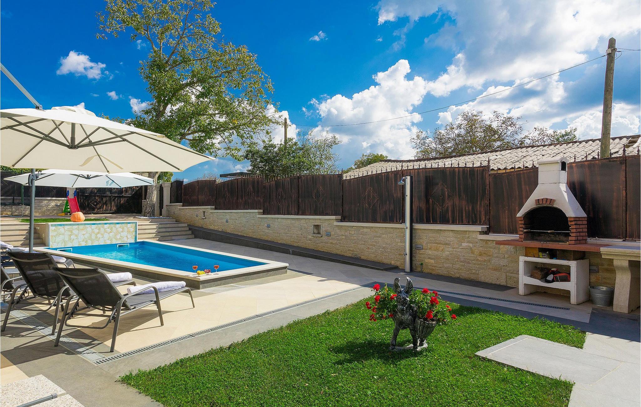 Den sjarmerende, nybygde Villa Patrick ligger i byen Pazin og tilbyr et rolig og fredelig miljø i hjertet av Istria. Villaen er fullstendig inngjerdet og tilbyr absolutt privatliv. Du kan prøve zip-line, Pazin?ica-bekken, hvor du også kan bade på varme sommerdager, mange kirker, naturparker osv. Villaen har plass til 8 personer og har 4 soverom med eget bad og et ekstra bad i første etasje. Hele villaen har gulvvarme, og alle rom har klimaanlegg for å gjøre oppholdet ditt så behagelig som mulig uansett årstid. Kjøkkenet er fullt utstyrt med alle nødvendige hvitevarer og ligger i forbindelse med stuen, hvor du kan slappe av ved peisen og ha utsikt over terrassen med privat basseng. Utenfor villaen er det også en lekeplass med trampoline og sklie for barna, mens de voksne kan kose seg med å tilberede måltider ved peisen ved bassenget. Alle gjester i villaen får en velkomstpakke ved ankomst for å gjøre oppholdet i villaen enda hyggeligere. Maksimalt 8 personer + 2 ekstra personer kan bo i villaen, men mot et pristillegg på 50 ? per person hele året.