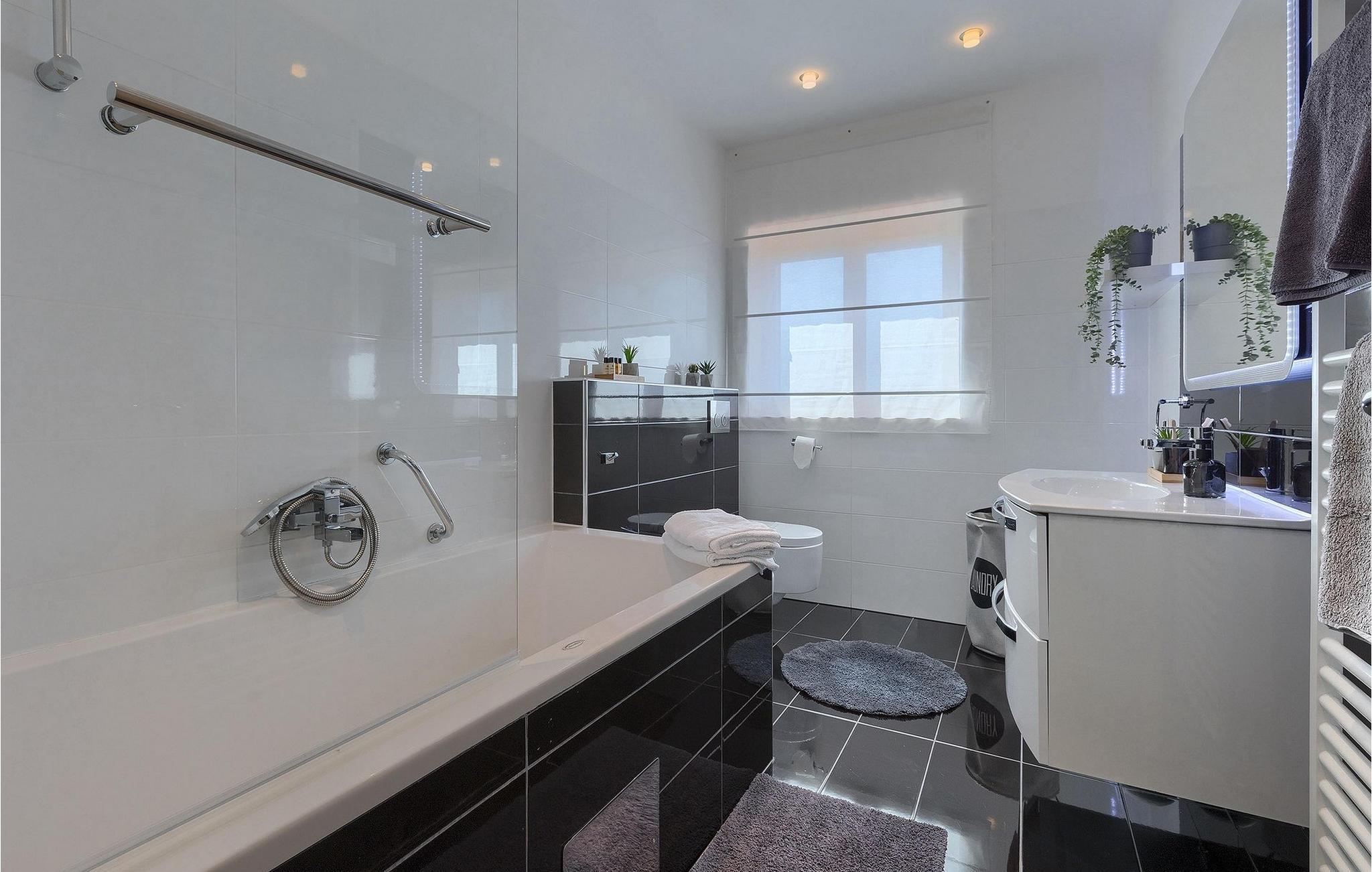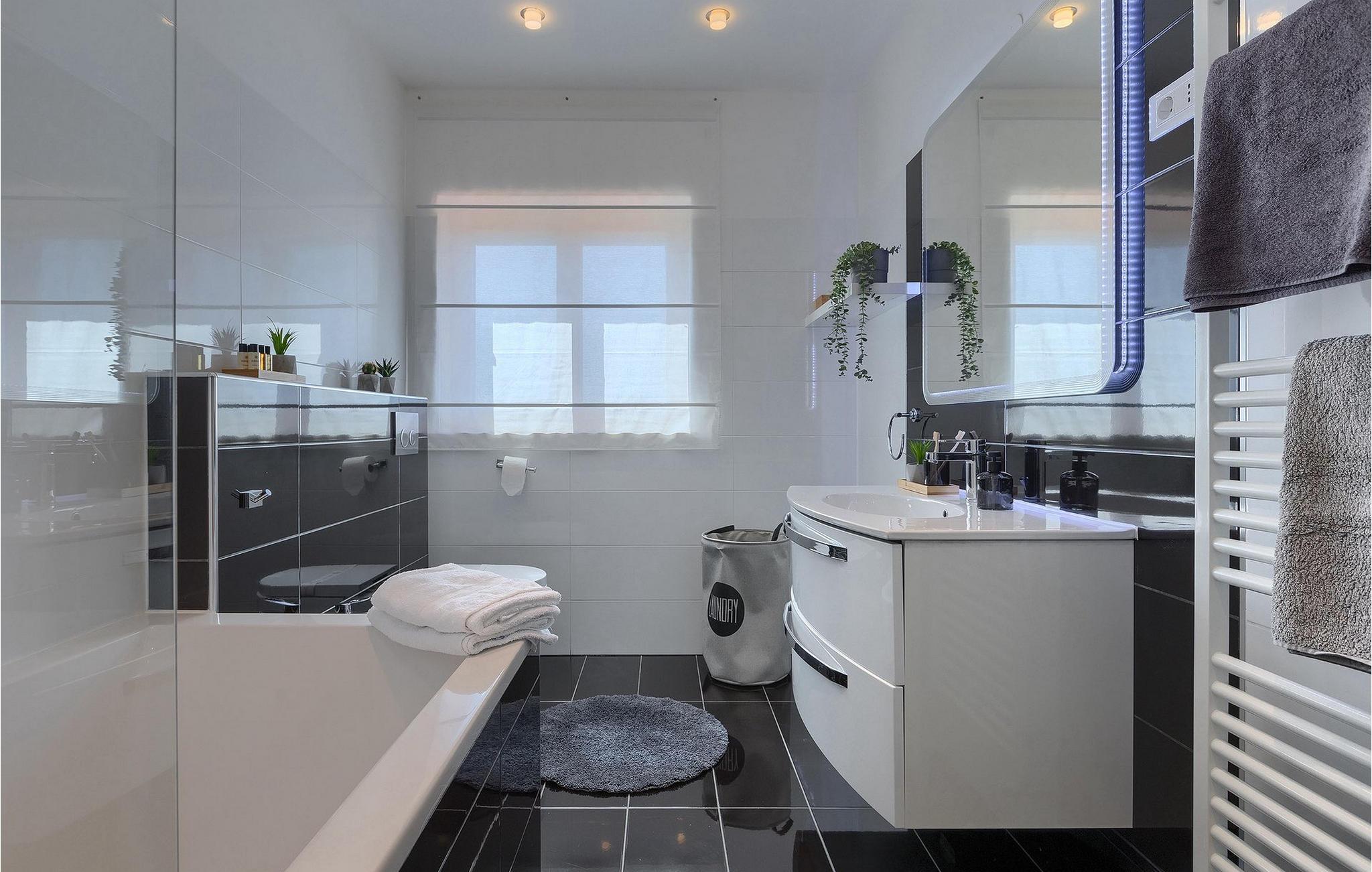 Interiøret i villaen er moderne og sjarmerende innredet, og her vil du føle deg som hjemme. Myke fargetoner skaper en koselig atmosfære, ikke bare i stuen og spisestuen, men også på soverommene. I første etasje finner du en stue, et fullt utstyrt kjøkken, et soverom og et bad. Går du opp trappene til første etasje, finner du tre vakre, moderne innredede soverom og et elegant bad.