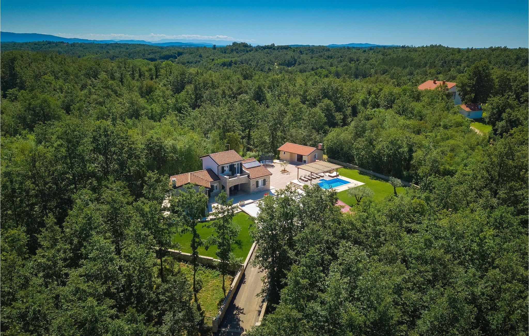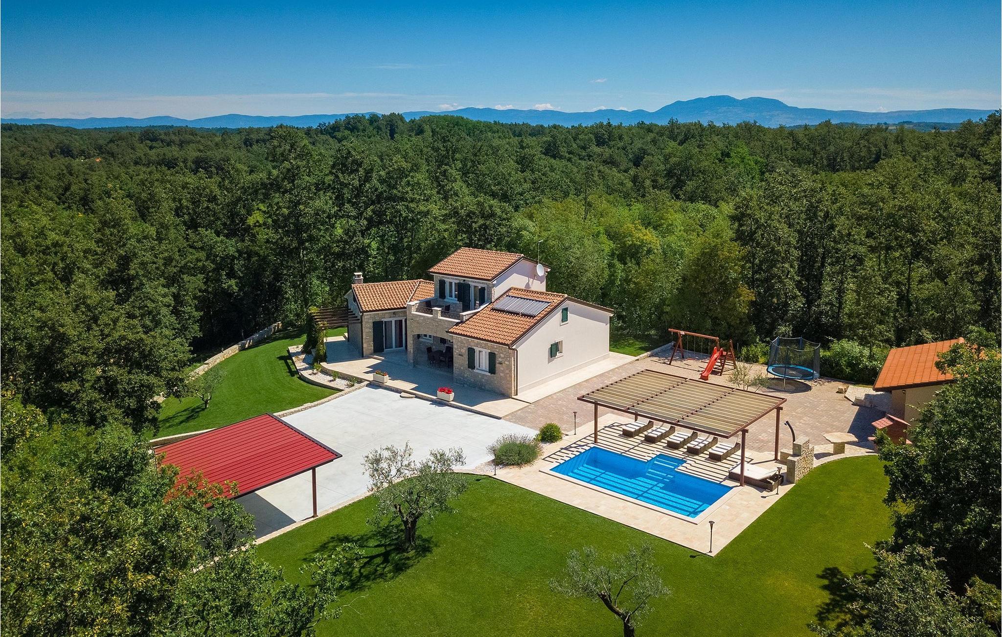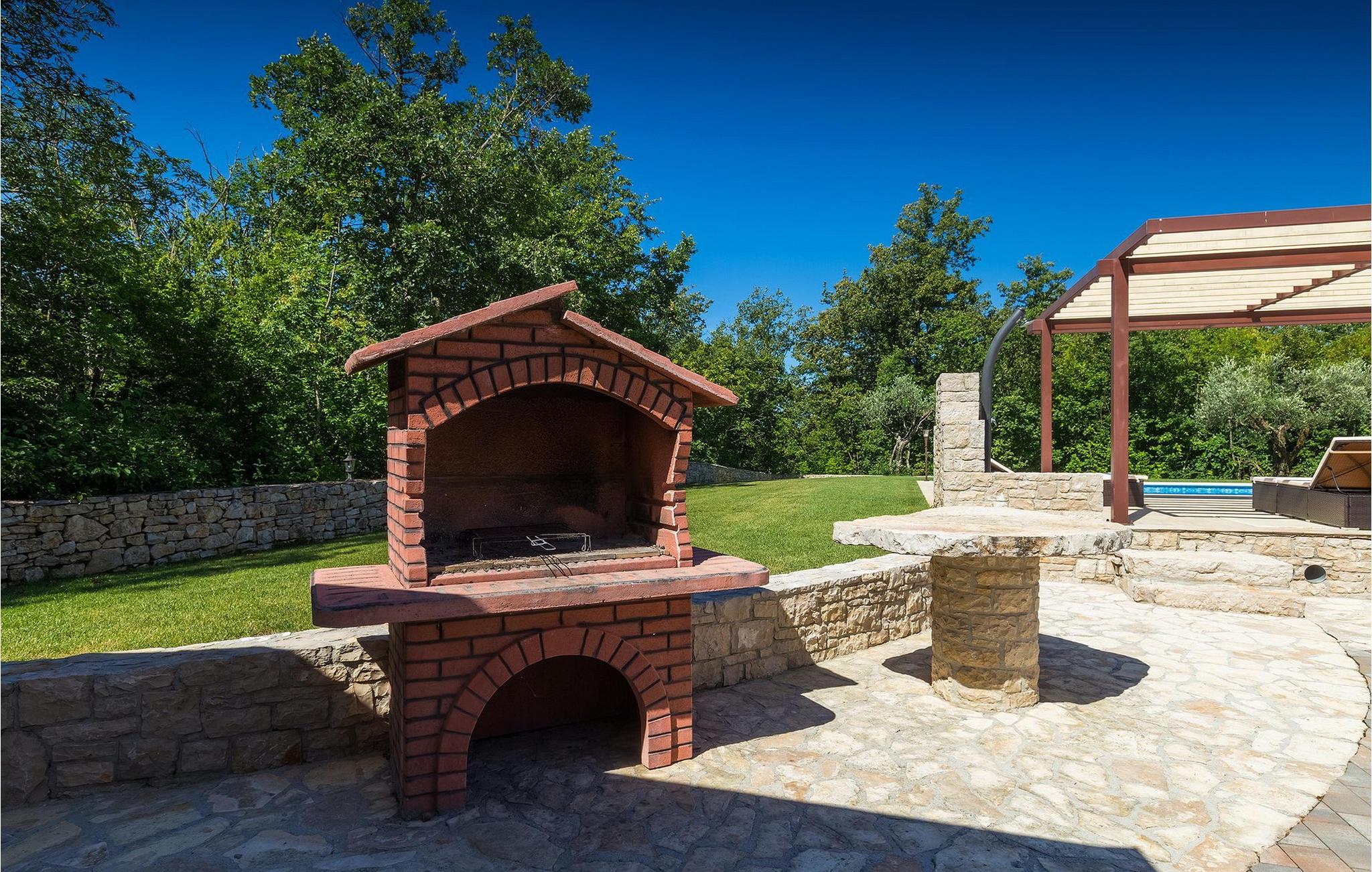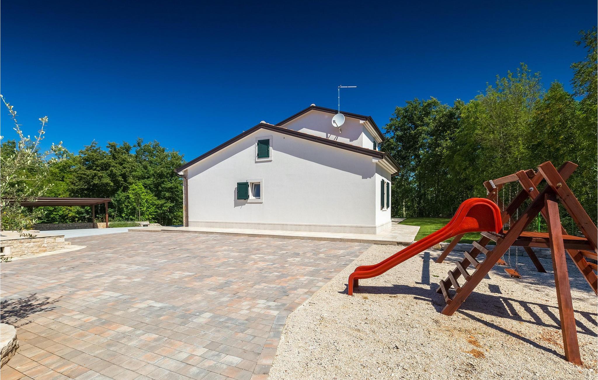Den vakre familievillaen Funcici med privat basseng ligger midt i den idylliske naturen i det sentrale Istria. Det er et utmerket tilfluktssted for alle som ønsker å tilbringe en avslappende ferie, men som samtidig ikke vil være for langt unna større byer som Pazin. I den lyse og gjennomlyste første etasje finner du en åpen stue og et moderne, fullt utstyrt kjøkken med spiseplass. I villaens første etasje er det 2 soverom, 1 bad og et ekstra toalett. Ett av soverommene har direkte utgang til det vakre, private bassenget hvor du kan slappe av og nyte den varme istriske solen. I øverste etasje finner du enda et soverom med eget bad og en terrasse hvor du kan beundre den vakre naturen som omgir huset eller bare slappe av. I den velstelte hagen til Villa Funcici finner du også et utendørs sommerkjøkken med spiseplass, ideelt for å tilberede deilige måltider mens du puster inn den friske luften, samt det fjerde soverommet og et bad. For de som ønsker å prøve seg på en populær sport i Istria, er det en boulebane i nærheten av villaen. Den vakre familievillaen Funcici ligger midt i idyllisk natur i det sentrale Istria, ca. 7 km fra byen Pazin. Pazin, med sine lange tradisjoner og rike kultur, er det administrative senteret i Istrias fylke. På grunn av den utmerkede beliggenheten i hjertet av Istria har byen svært gode forbindelser til andre byer, og større turistsentre ligger bare ca. 30 km unna. Denne regionen har noe for enhver smak. Adrenalinelskere kan prøve zip-lining og tauhopping over det geografiske fenomenet Pazin Pit, friklatring, kajakkpadling eller speleologi. I Pazin ligger Istrias største og best bevarte middelalderslott (Kastel) over 130 meter høye klipper der elven Pazincica renner ut i Pazin-gropa. Den kjente franske forfatteren Jules Verne ble også inspirert av Pazin, og deler av romanen hans "Mathias Sandorf" utspiller seg i Pazin. I dag finnes det en Jules Verne-klubb i byen, og Jules Verne-dagene arrangeres hvert år i slutten av juni.