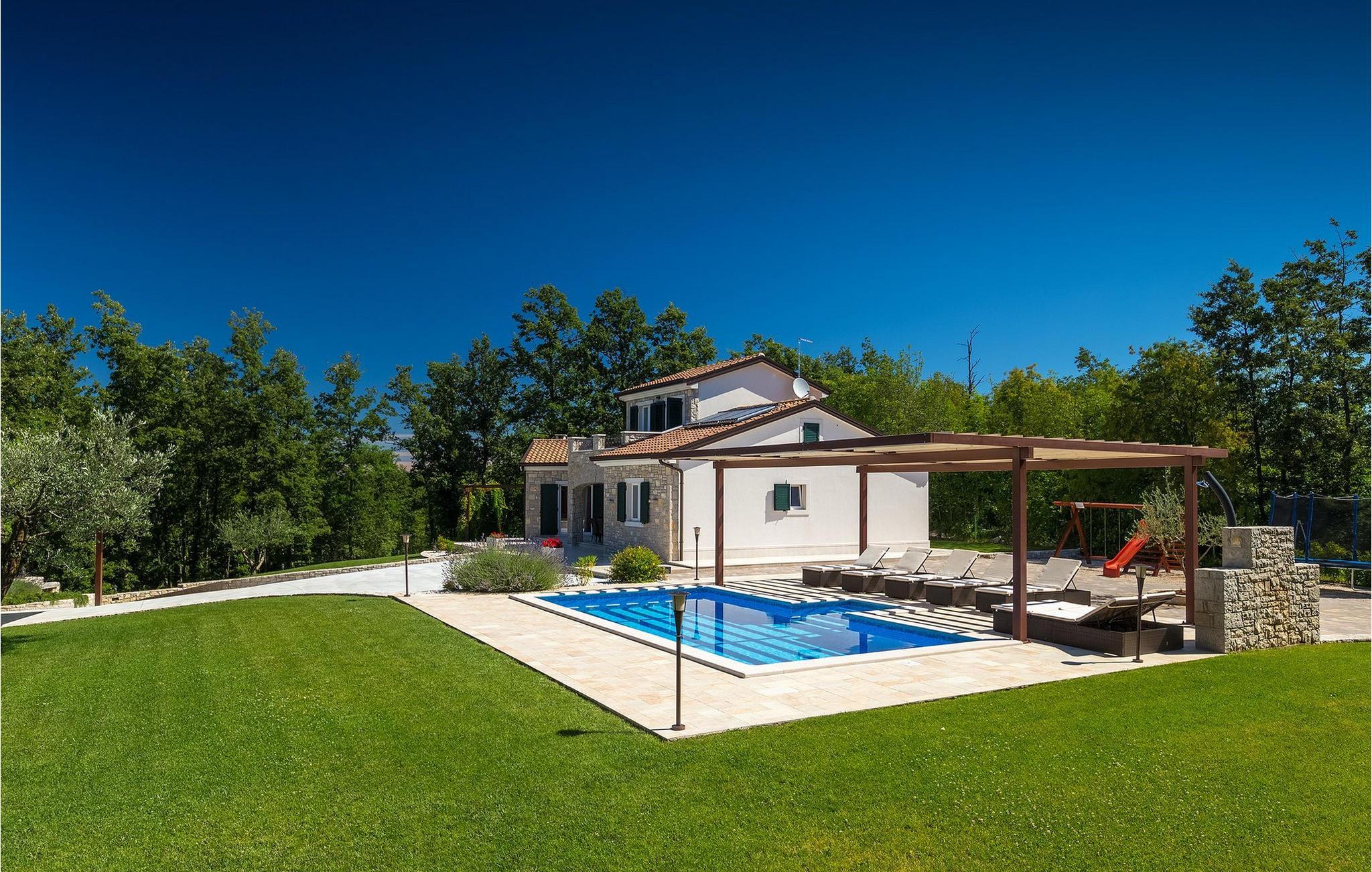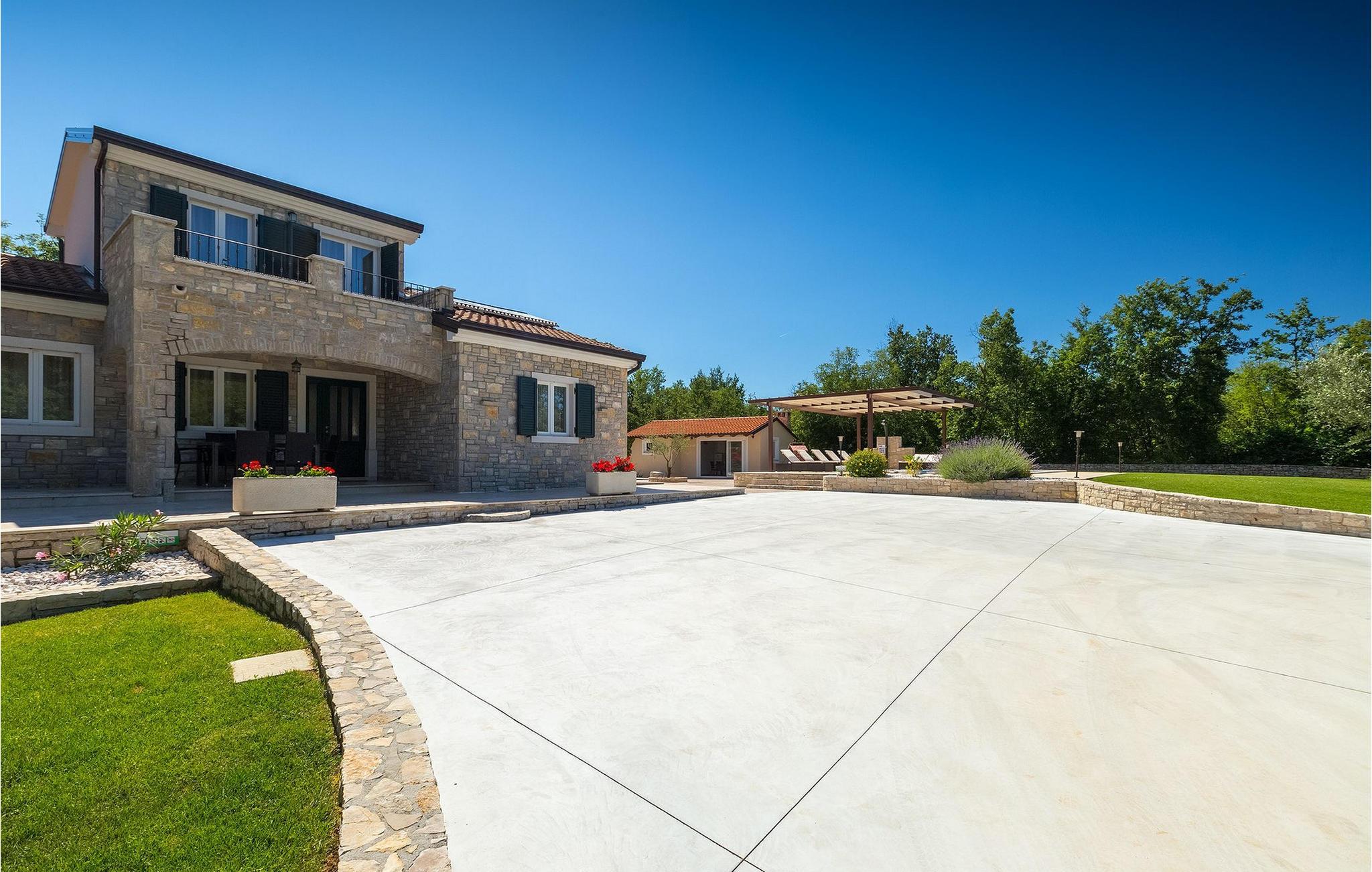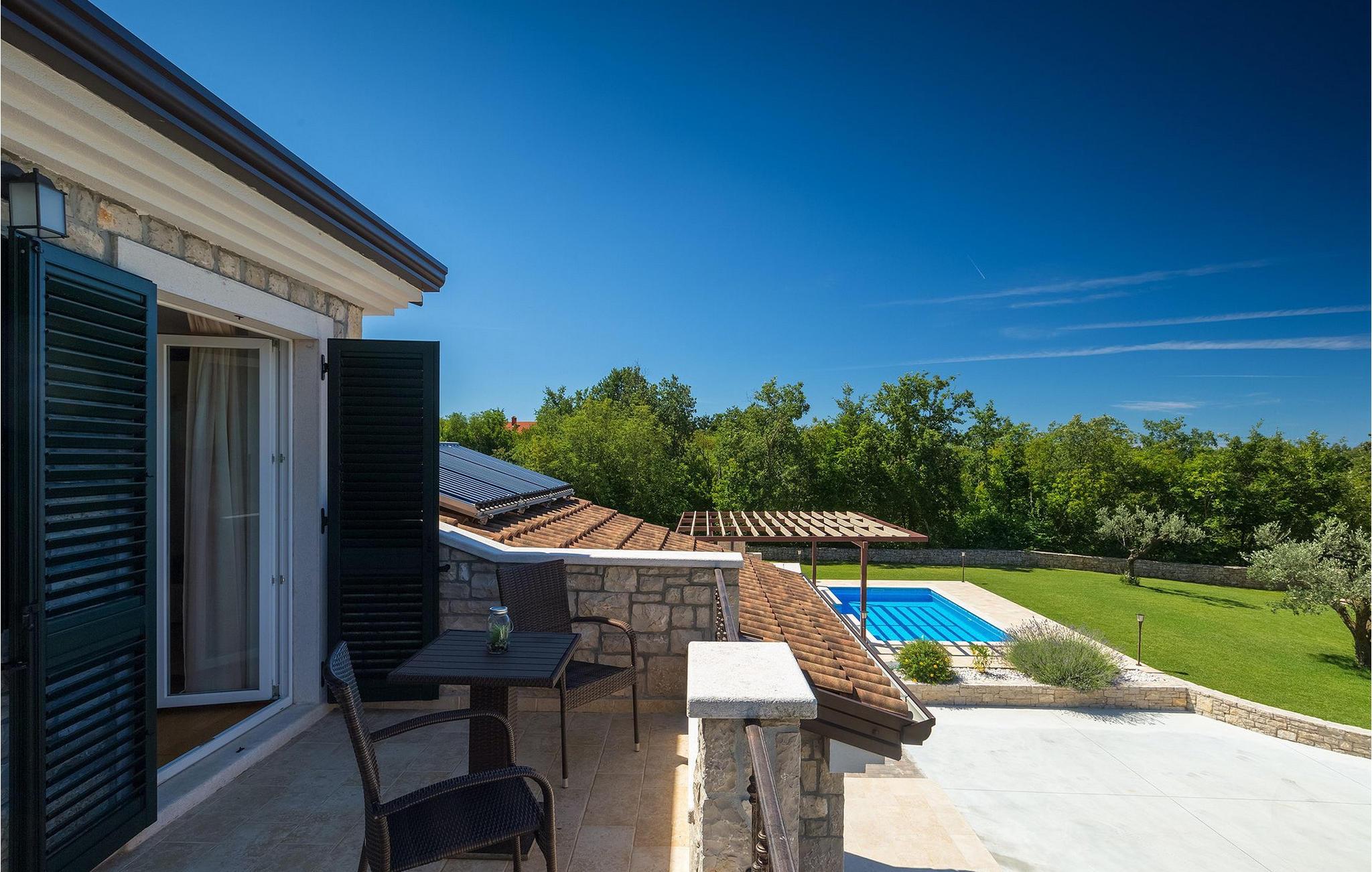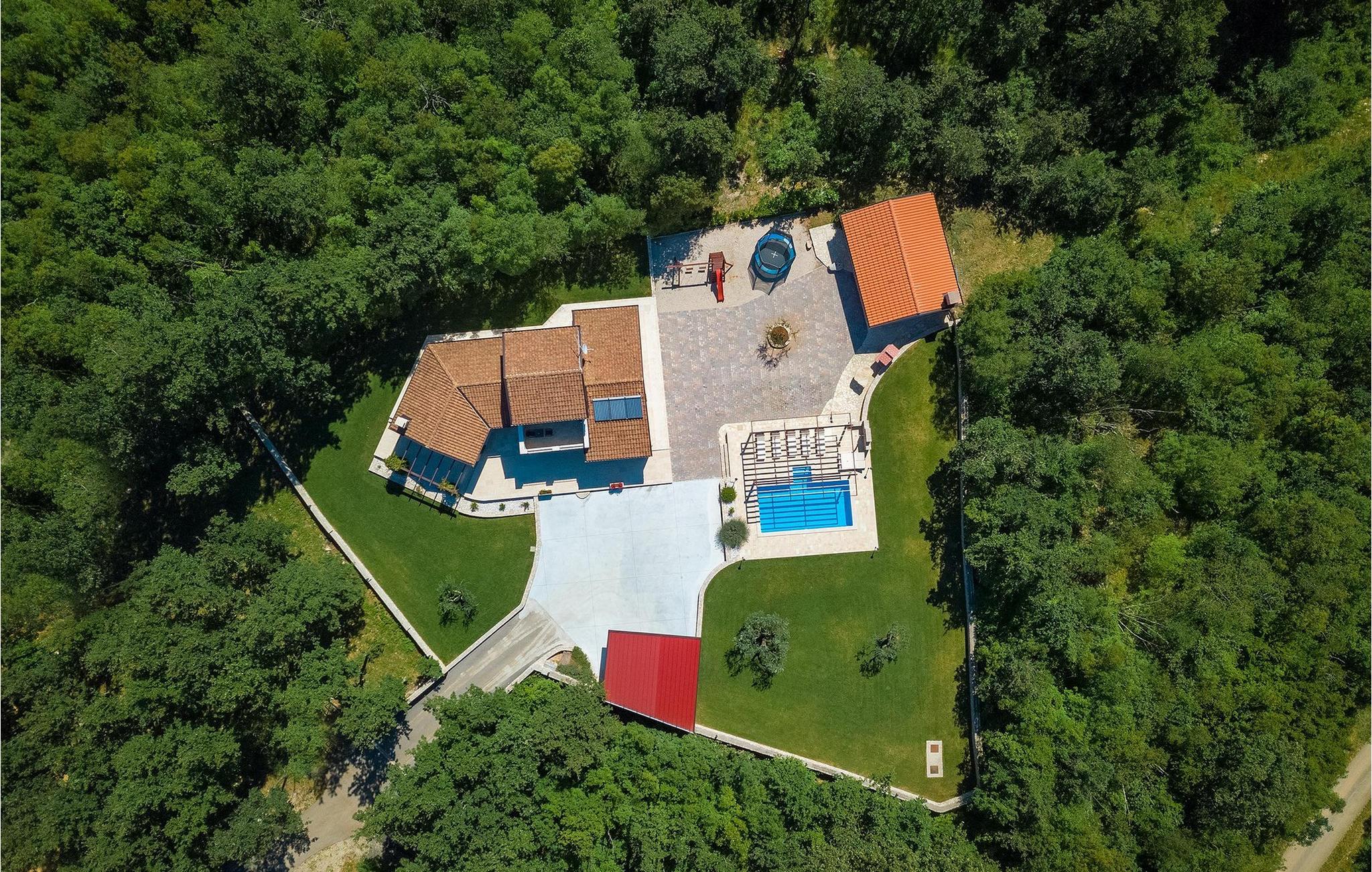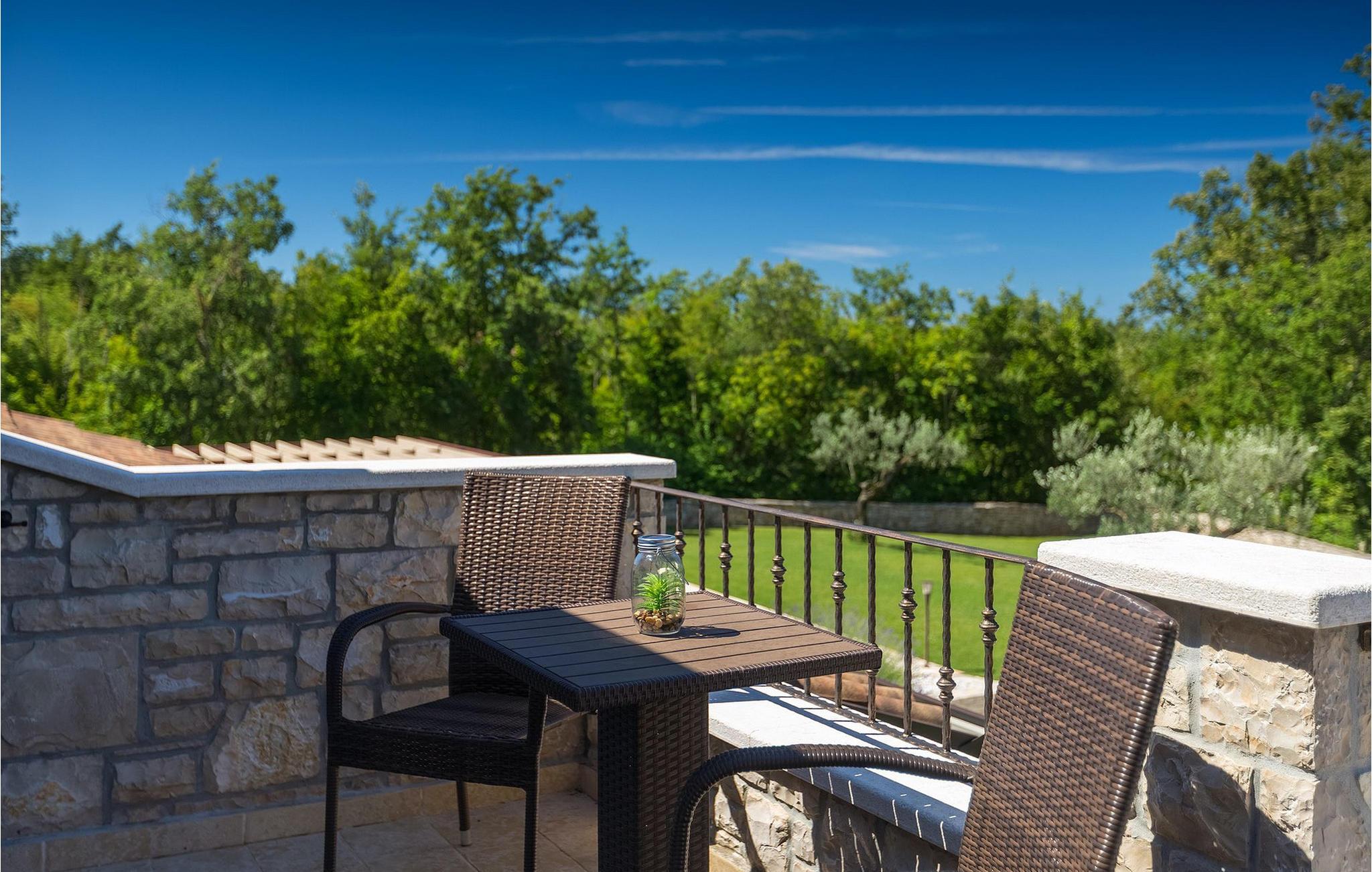 Den vakre familievillaen Funcici med privat basseng ligger midt i den idylliske naturen i det sentrale Istria. Det er et utmerket tilfluktssted for alle som ønsker å tilbringe en avslappende ferie, men som samtidig ikke vil være for langt unna større byer som Pazin. I den lyse og gjennomlyste første etasje finner du en åpen stue og et moderne, fullt utstyrt kjøkken med spiseplass. I villaens første etasje er det 2 soverom, 1 bad og et ekstra toalett. Ett av soverommene har direkte utgang til det vakre, private bassenget hvor du kan slappe av og nyte den varme istriske solen. I øverste etasje finner du enda et soverom med eget bad og en terrasse hvor du kan beundre den vakre naturen som omgir huset eller bare slappe av. I den velstelte hagen til Villa Funcici finner du også et utendørs sommerkjøkken med spiseplass, ideelt for å tilberede deilige måltider mens du puster inn den friske luften, samt det fjerde soverommet og et bad. For de som ønsker å prøve seg på en populær sport i Istria, er det en boulebane i nærheten av villaen. Den vakre familievillaen Funcici ligger midt i idyllisk natur i det sentrale Istria, ca. 7 km fra byen Pazin. Pazin, med sine lange tradisjoner og rike kultur, er det administrative senteret i Istrias fylke. På grunn av den utmerkede beliggenheten i hjertet av Istria har byen svært gode forbindelser til andre byer, og større turistsentre ligger bare ca. 30 km unna. Denne regionen har noe for enhver smak. Adrenalinelskere kan prøve zip-lining og tauhopping over det geografiske fenomenet Pazin Pit, friklatring, kajakkpadling eller speleologi. I Pazin ligger Istrias største og best bevarte middelalderslott (Kastel) over 130 meter høye klipper der elven Pazincica renner ut i Pazin-gropa. Den kjente franske forfatteren Jules Verne ble også inspirert av Pazin, og deler av romanen hans "Mathias Sandorf" utspiller seg i Pazin. I dag finnes det en Jules Verne-klubb i byen, og Jules Verne-dagene arrangeres hvert år i slutten av juni.