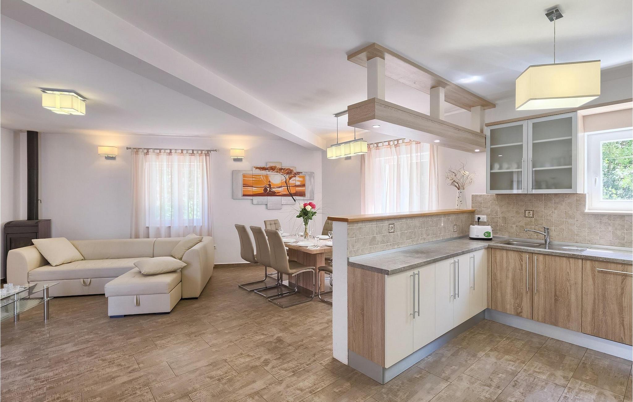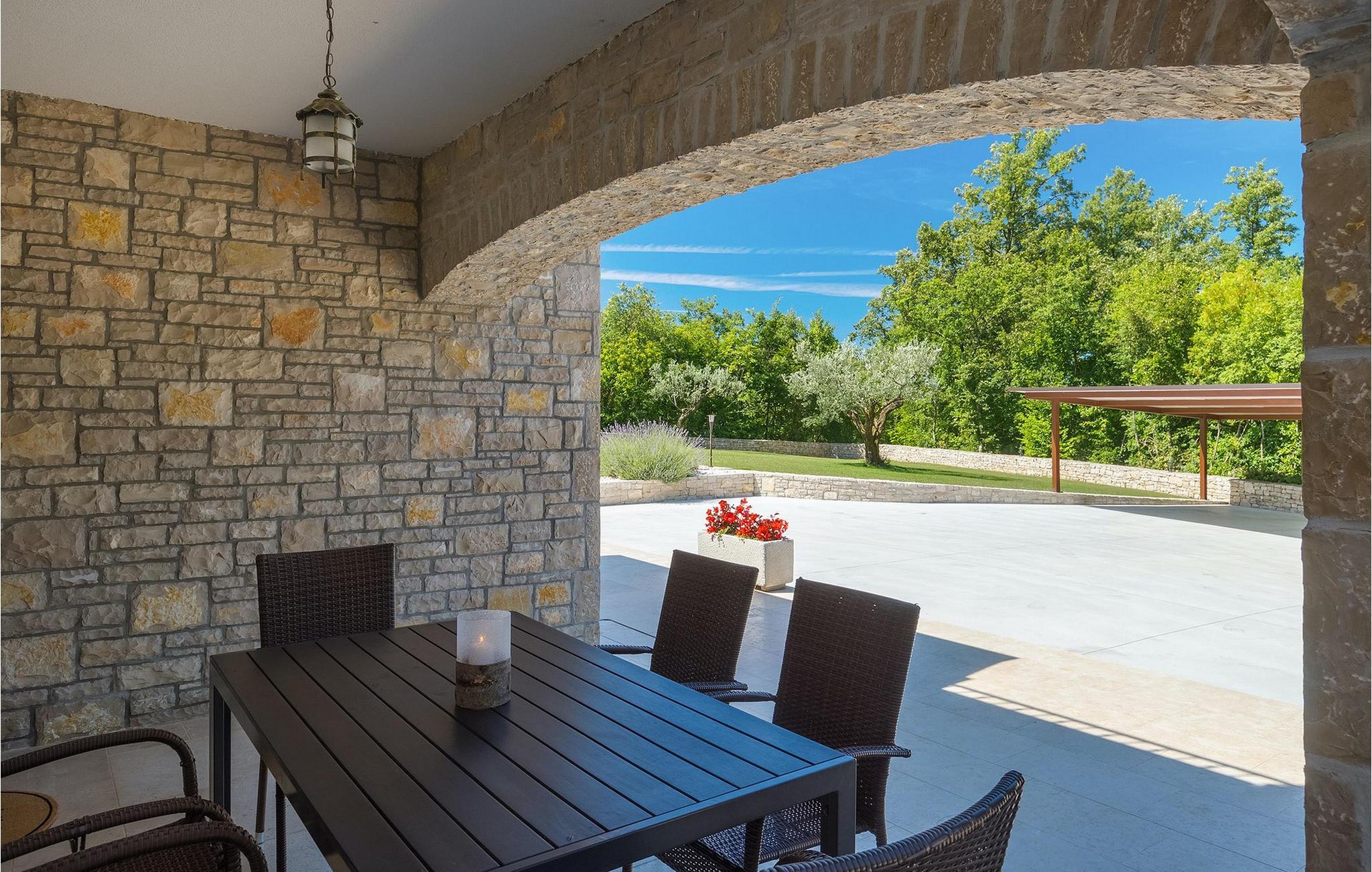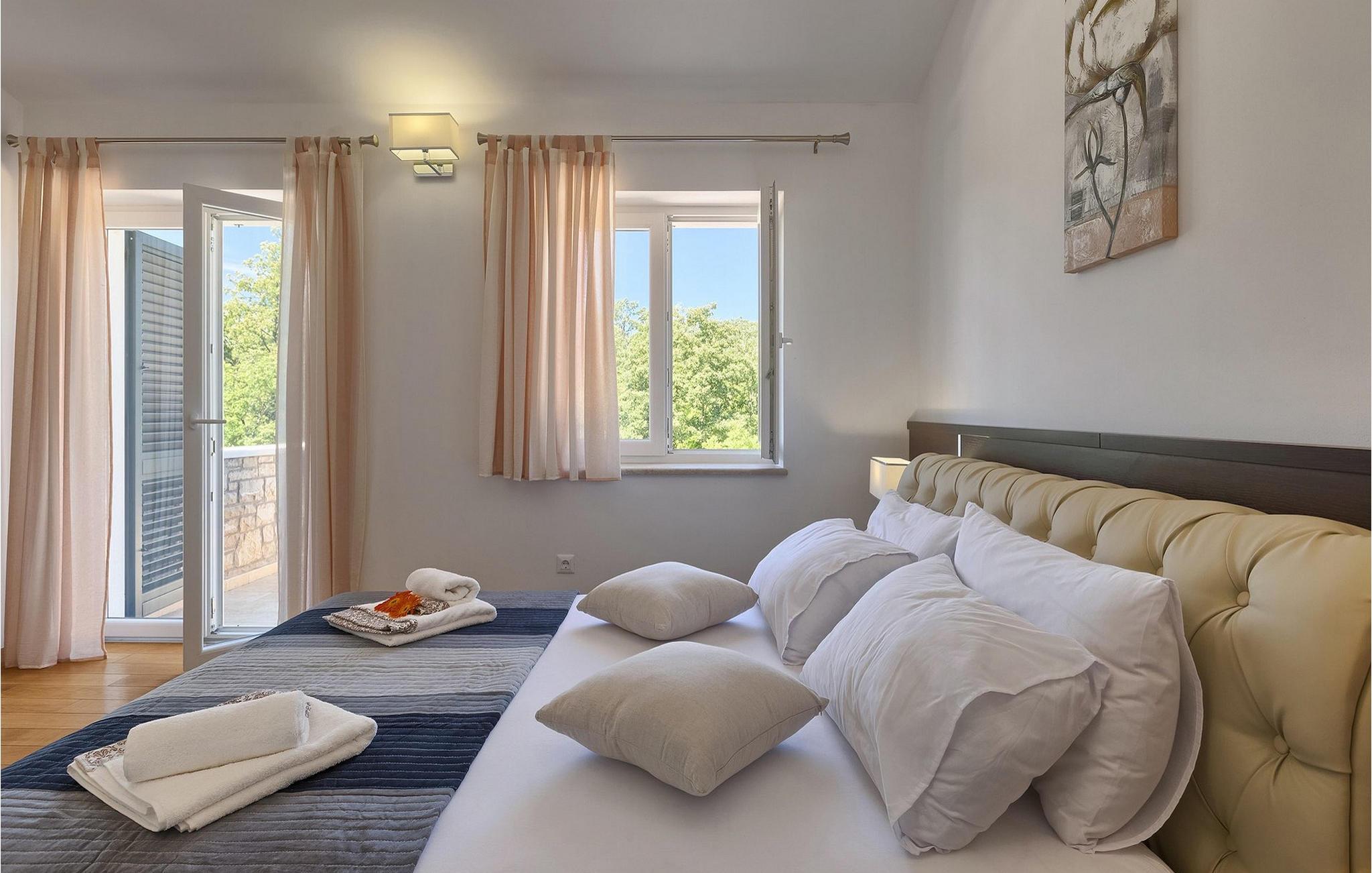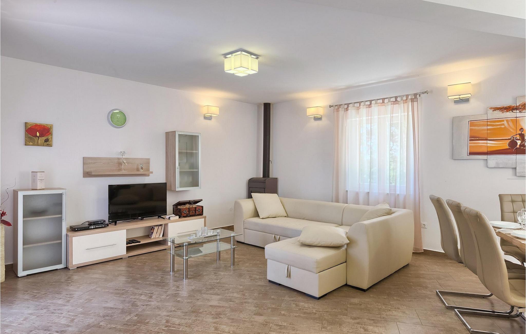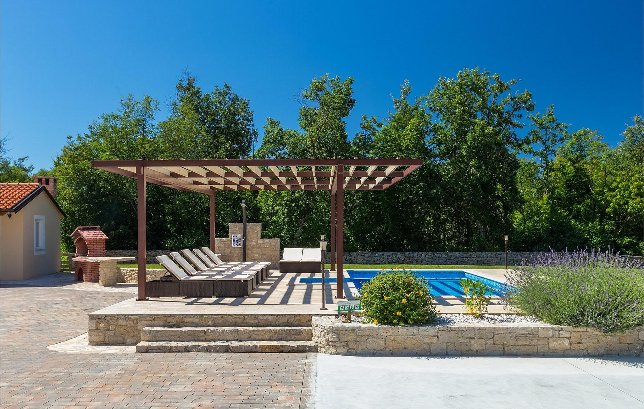 Den vakre familievillaen Funcici med privat basseng ligger midt i den idylliske naturen i det sentrale Istria. Det er et utmerket tilfluktssted for alle som ønsker å tilbringe en avslappende ferie, men som samtidig ikke vil være for langt unna større byer som Pazin. I den lyse og gjennomlyste første etasje finner du en åpen stue og et moderne, fullt utstyrt kjøkken med spiseplass. I villaens første etasje er det 2 soverom, 1 bad og et ekstra toalett. Ett av soverommene har direkte utgang til det vakre, private bassenget hvor du kan slappe av og nyte den varme istriske solen. I øverste etasje finner du enda et soverom med eget bad og en terrasse hvor du kan beundre den vakre naturen som omgir huset eller bare slappe av. I den velstelte hagen til Villa Funcici finner du også et utendørs sommerkjøkken med spiseplass, ideelt for å tilberede deilige måltider mens du puster inn den friske luften, samt det fjerde soverommet og et bad. For de som ønsker å prøve seg på en populær sport i Istria, er det en boulebane i nærheten av villaen. Den vakre familievillaen Funcici ligger midt i idyllisk natur i det sentrale Istria, ca. 7 km fra byen Pazin. Pazin, med sine lange tradisjoner og rike kultur, er det administrative senteret i Istrias fylke. På grunn av den utmerkede beliggenheten i hjertet av Istria har byen svært gode forbindelser til andre byer, og større turistsentre ligger bare ca. 30 km unna. Denne regionen har noe for enhver smak. Adrenalinelskere kan prøve zip-lining og tauhopping over det geografiske fenomenet Pazin Pit, friklatring, kajakkpadling eller speleologi. I Pazin ligger Istrias største og best bevarte middelalderslott (Kastel) over 130 meter høye klipper der elven Pazincica renner ut i Pazin-gropa. Den kjente franske forfatteren Jules Verne ble også inspirert av Pazin, og deler av romanen hans "Mathias Sandorf" utspiller seg i Pazin. I dag finnes det en Jules Verne-klubb i byen, og Jules Verne-dagene arrangeres hvert år i slutten av juni.