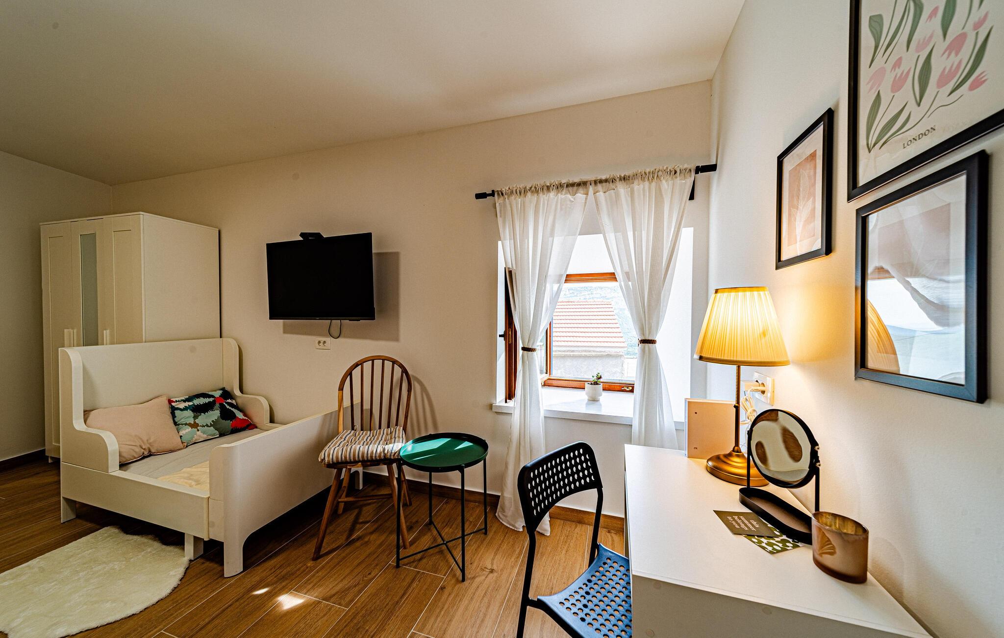 Dette smakfulle feriehuset venter på deg på Peljeac-halvøya, der middelhavslivsstilen og avslapping nær naturen går hånd i hånd. Nyt roen på det lille feriestedet med sin tradisjonelle karakter og lad batteriene midt i det dalmatiske bakkelandskapet. Gå inn i det vakre oppholdsrommet med koselig sofakrok, stilfulle møbler og et stort TV-hjørne. Dra nytte av den åpne overgangen til det moderne kjøkkenet, som kan skilte med kjærlige detaljer, gjennomtenkt utstyr og et tilstøtende spisebord, for å nyte måltider sammen.