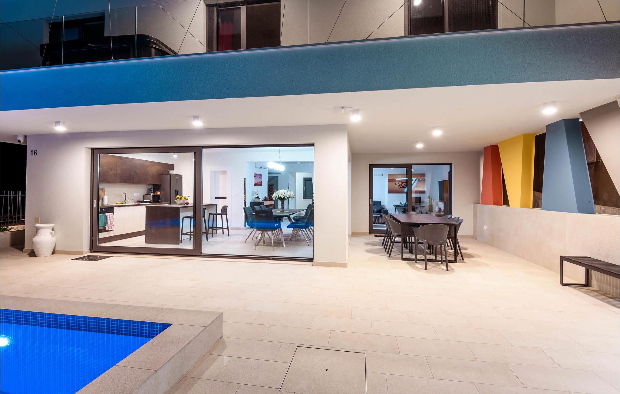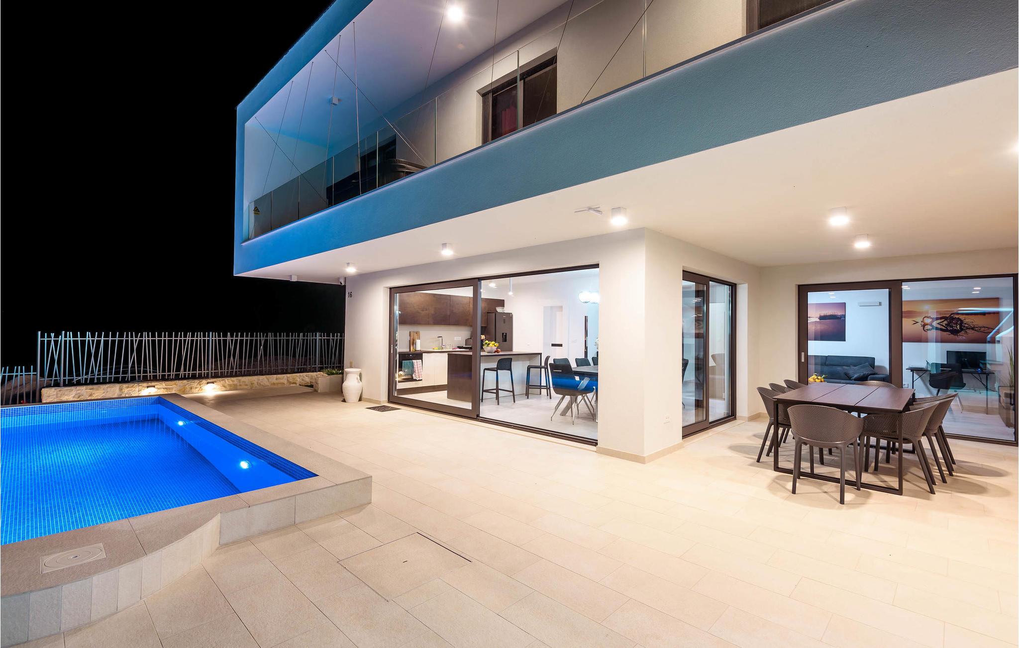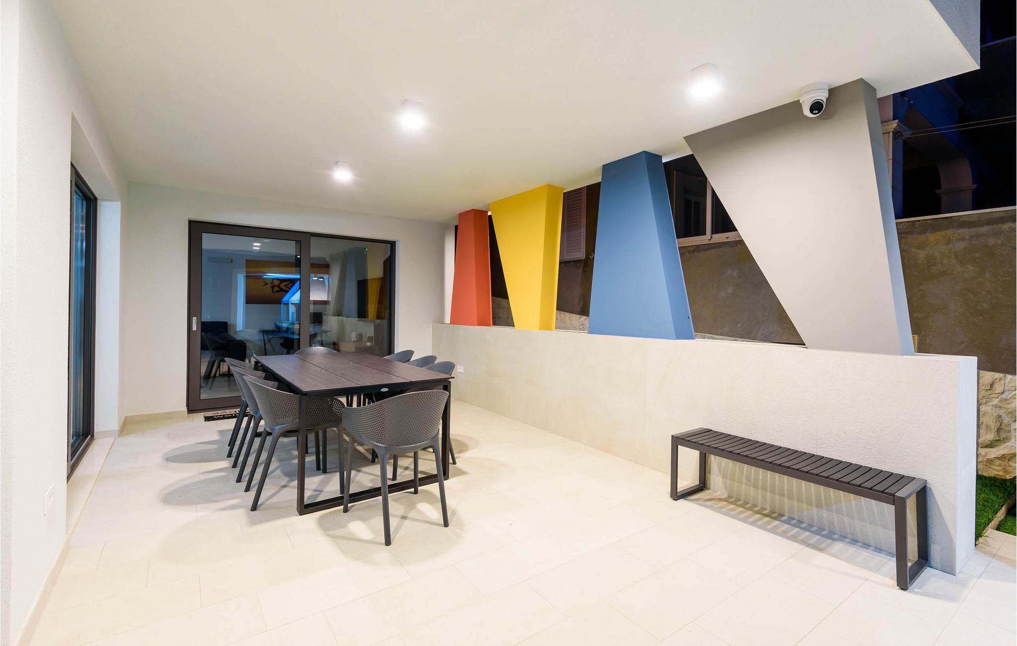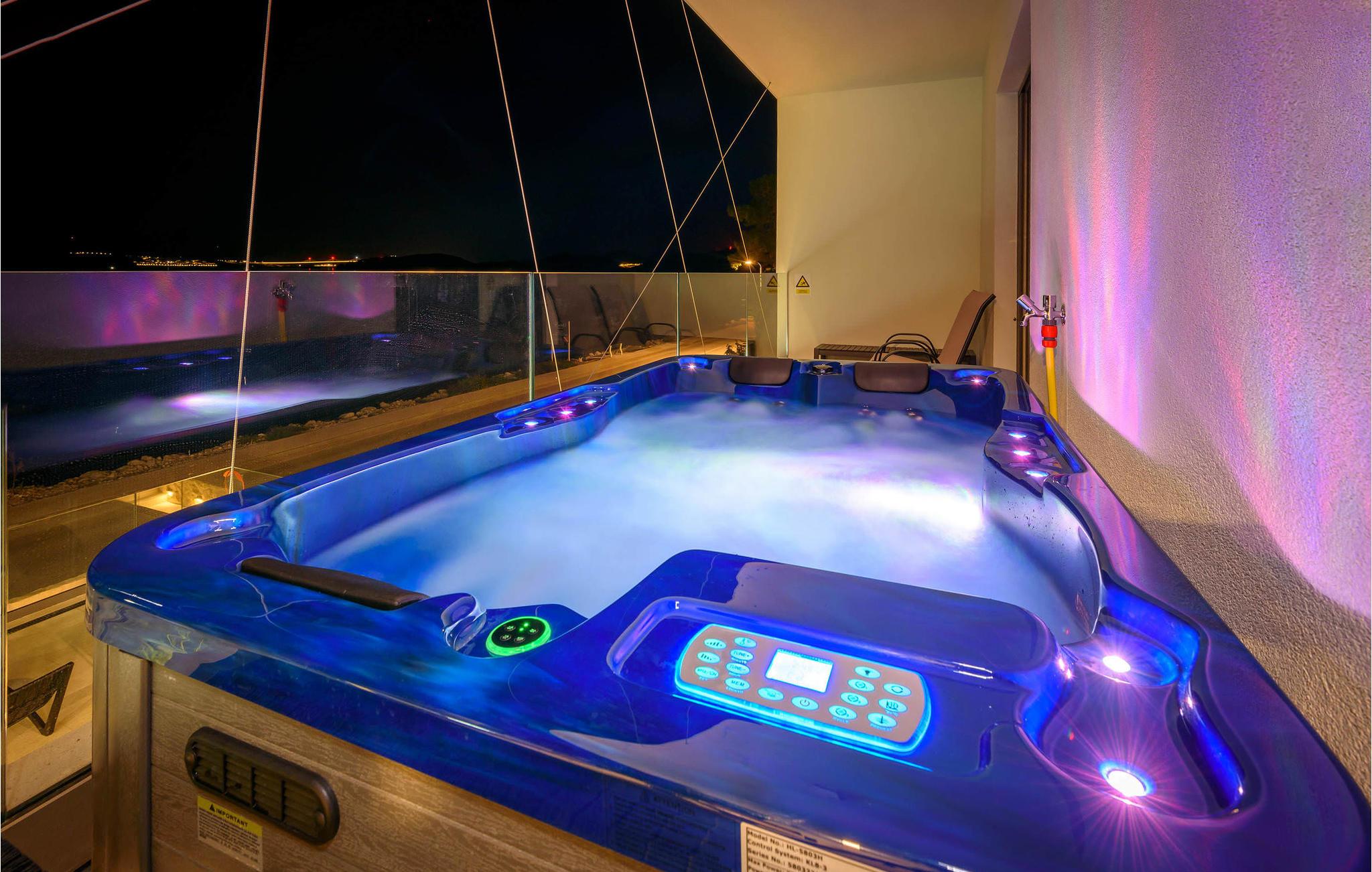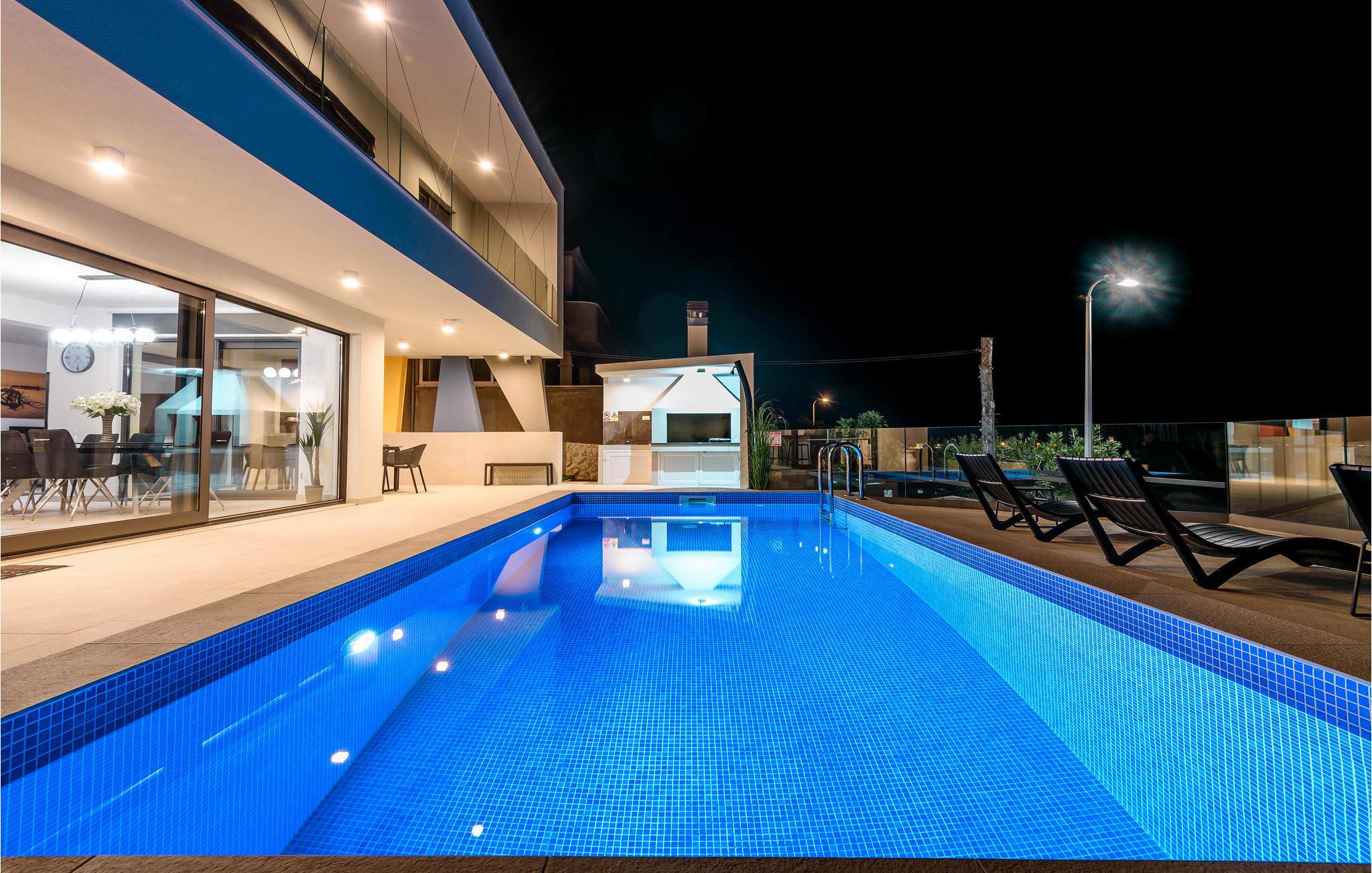 Huset byr også på mange muligheter for å tilbringe hyggelige timer utendørs. Mens barna boltrer seg på lekeplassen, kan du nyte den fantastiske utsikten over havet i bassenget eller en forfriskende dukkert i boblebadet. Sett deg godt til rette på en av solsengene og lukk øynene mens du nyter solen i fulle drag.