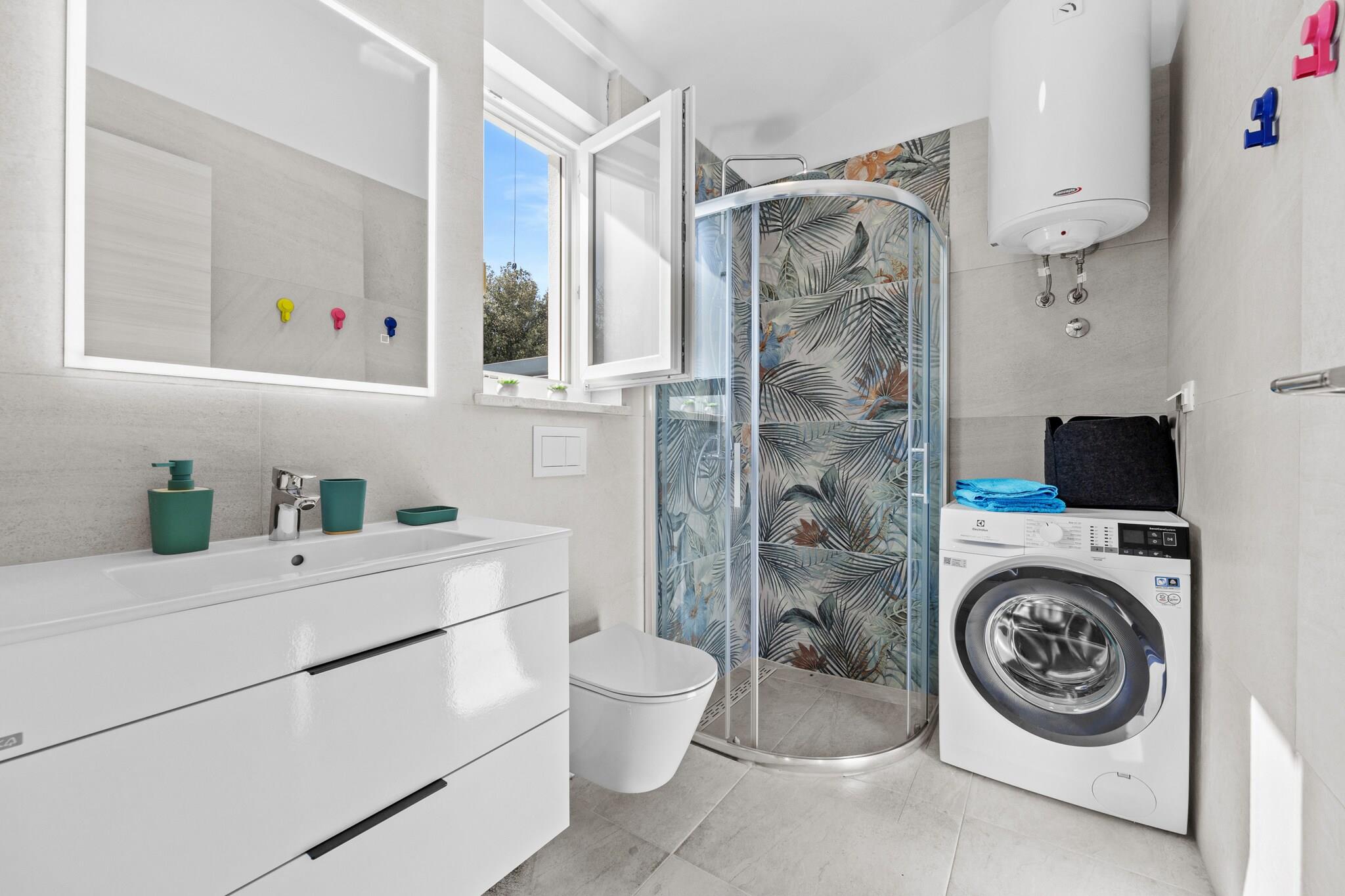 Oppdag et sjarmerende sommerferiested i Peroj, perfekt designet for par og små familier (to voksne og to barn) som søker en fredelig ferie ved kysten. Denne nybygde, smakfullt møblerte leiligheten tilbyr en komfortabel 40 kvadratmeter innendørs plass, supplert med en romslig 40 kvadratmeter stor terrasse, ideell for avslapning og utendørs nytelse. Boligen har et velutstyrt kjøkken i amerikansk stil, komplett med moderne bekvemmeligheter som induksjonstopp, stekeovn, oppvaskmaskin, kjøleskap, fryser og alt nødvendig kjøkkenutstyr. Stuen inkluderer en koselig sofa (egnet for to barn å sove på), et spisebord og en flatskjerm-TV, noe som skaper en innbydende plass for å slappe av etter en dag med utforsking. Det gjennomtenkte soverommet har en king-size-seng, mens det private badet har dusj for ekstra bekvemmelighet og privatliv. Klimaanlegg sørger for en kjølig atmosfære på varme sommerdager, og gratis Wi-Fi holder deg tilkoblet. Friluftsentusiaster vil sette pris på det inngjerdede hageområdet utstyrt med hagemøbler, perfekt for utendørs servering eller soling i middelhavssolen. Eiendommen har også praktiske fasiliteter som tørkestativ, utendørs spiseplass og en anvist parkeringsplass. Denne leiligheten ligger kun 190 meter fra en steinstrand og 300 meter fra både et supermarked og en restaurant, og fungerer som en ideell base for å utforske området. Familier vil finne beliggenheten spesielt praktisk, med lett tilgang til lokale attraksjoner og fasiliteter. Kjæledyrseiere vil gjerne vite at ett lite kjæledyr er velkommen mot en ekstra avgift, noe som øker fleksibiliteten og komforten til oppholdet ditt.