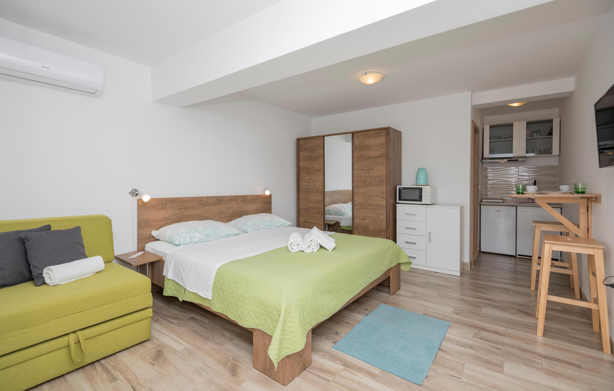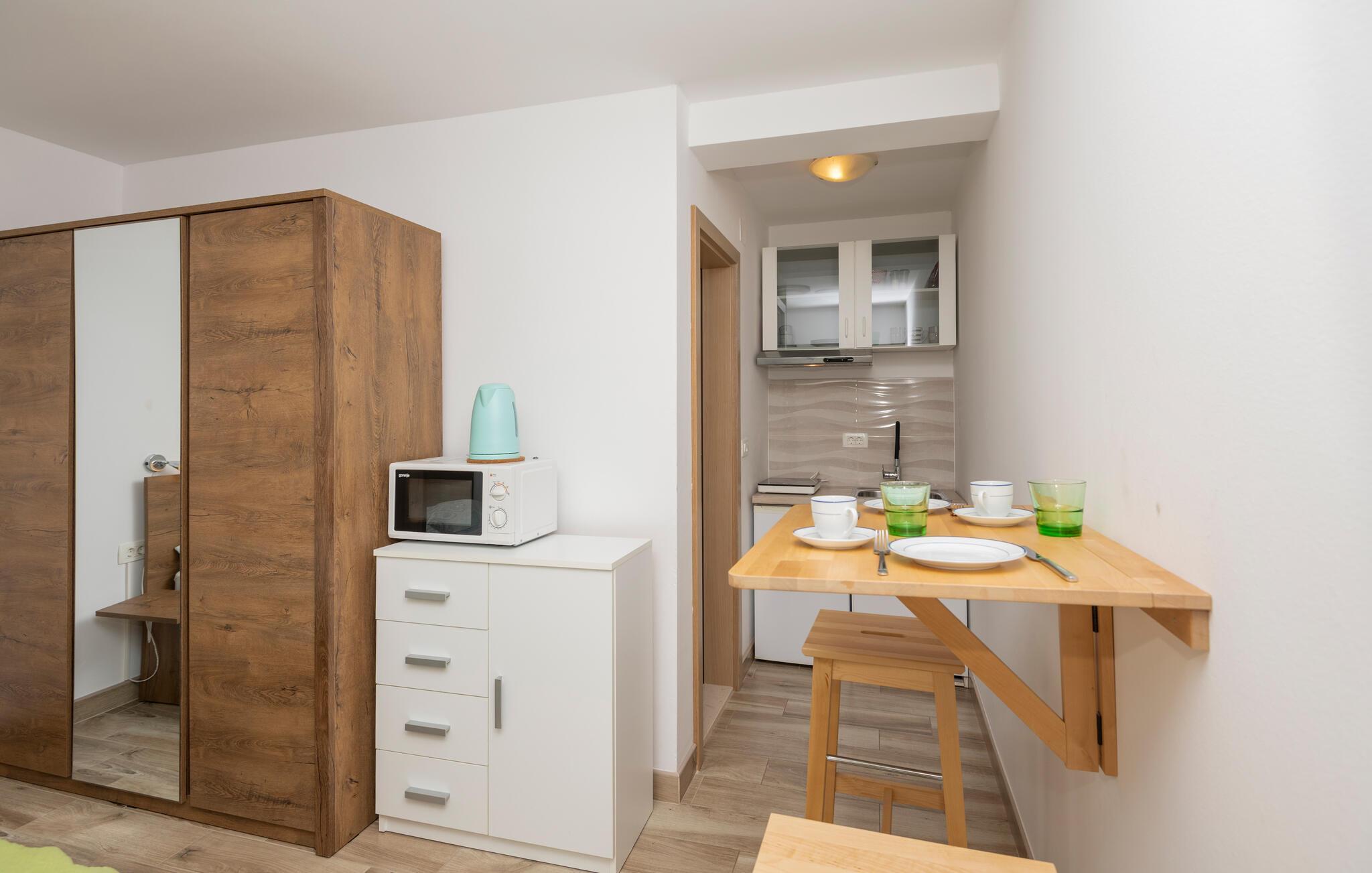 Denne lyse og velutstyrte ferieleiligheten ligger ikke langt fra innsjøen Vlaska. Den ligger i en bygning med flere ferieleiligheter, hvorav to ligger i første etasje og to i andre etasje med separate innganger. I første etasje finner du en familievennlig ferieleilighet i to etasjer, mens de andre ettromsleilighetene er et ideelt og rolig sted for par som setter pris på god og vakker innredning.