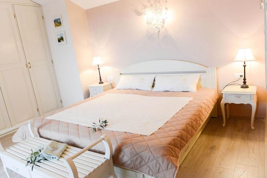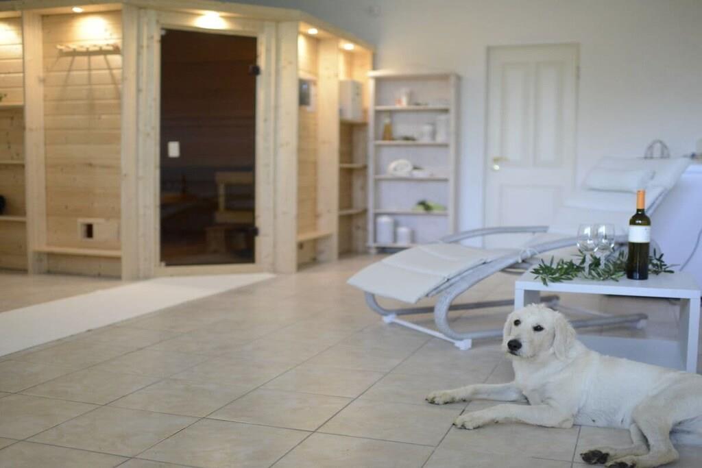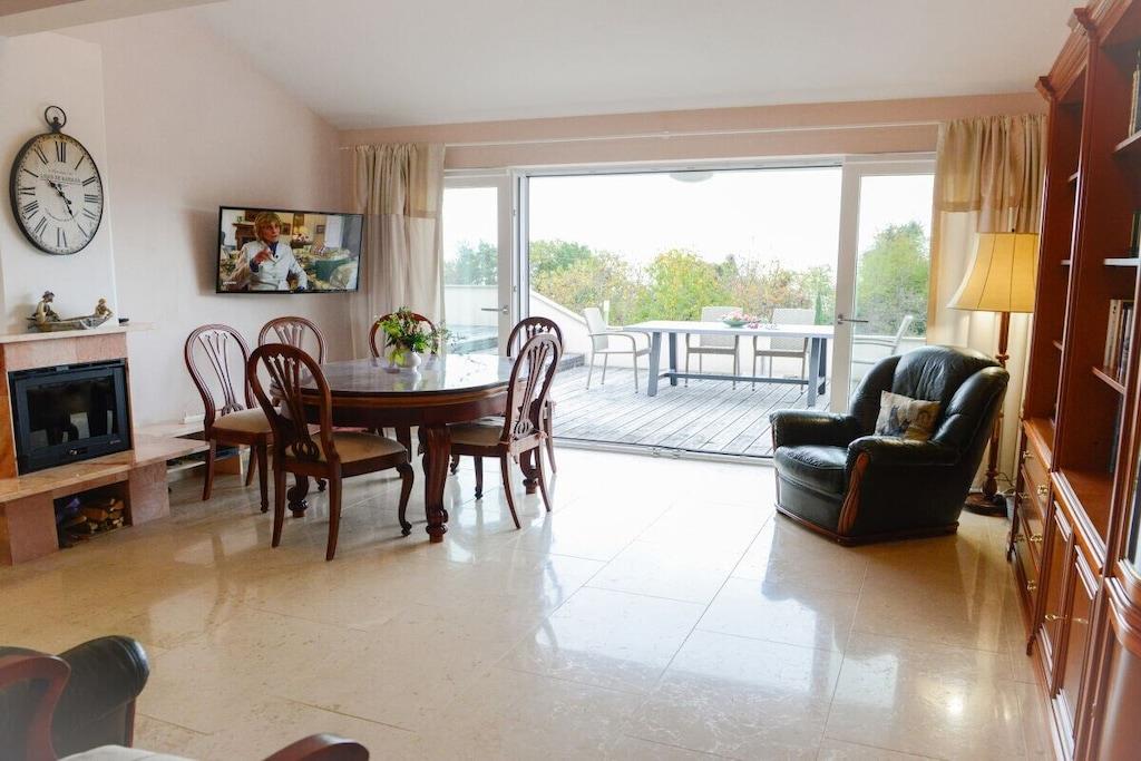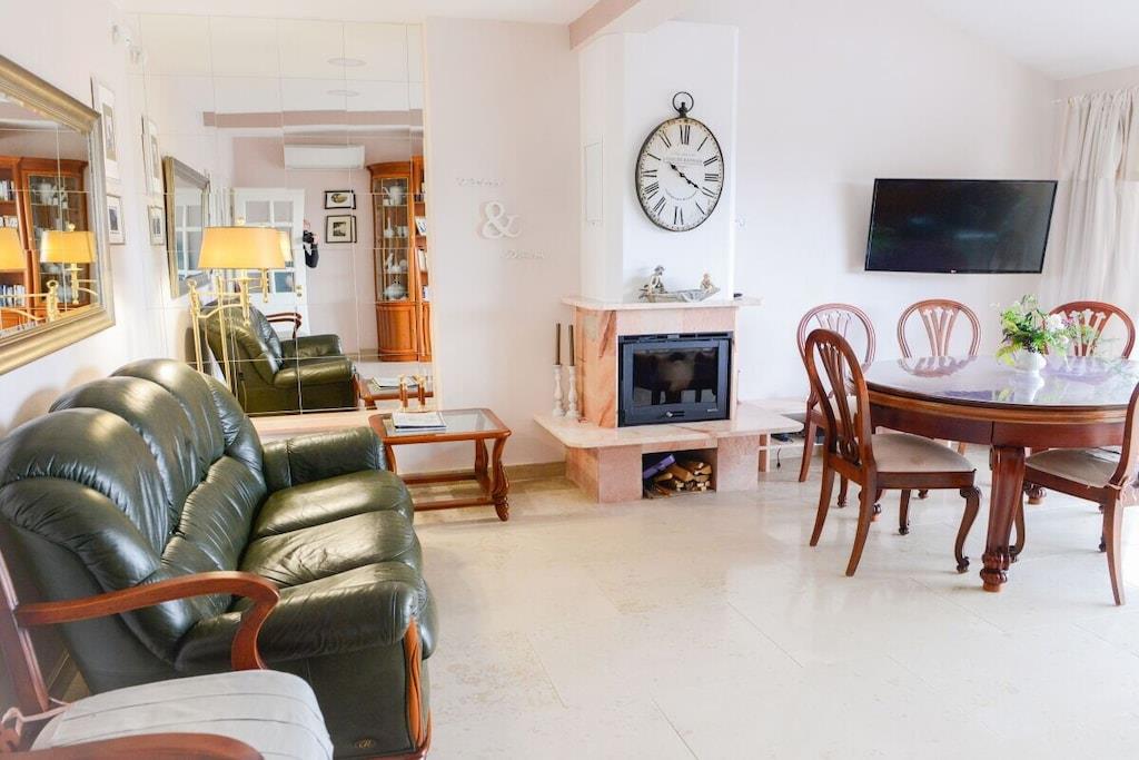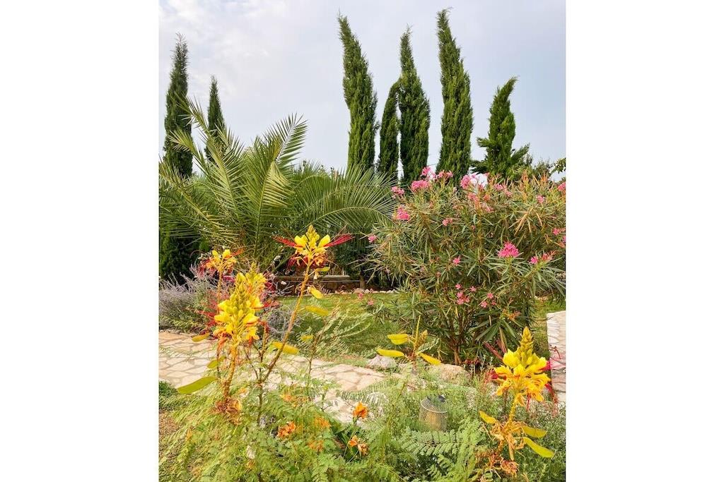 Gepflegte Villa im Landhausstil, in ruhiger Lage Das Haus befindet sich inmitten der Natur und besteht aus zwei Hälften mit zwei separaten Eingängen. Die zu vermietende Haushälfte ist auf zwei Etagen verteilt und besteht aus drei Schlafzimmern, zwei Bädern, einem Wohnzimmer sowie einer voll ausgestatteten Küche. Alle Räume sind klimatisiert und gemütlich eingerichtet. Jedes Zimmer hat einen eigenen Balkon mit Blick auf das Meer. Im Erdgeschoß befinden sich ein Wohn- und Esszimmer mit Kamin, eine Küche und ein Schlafzimmer mit Zugang auf die Terrasse. Die Küche ist voll ausgestattet mit Kühlschrank und Gefrierfach, Spülmaschine, Backofen, Kochfeld, Wasserkocher, Kaffeemaschine, Geschirr und allen notwendigen Küchenutensilien. Die Klimaanlagen sowie eine Fußbodenheizung im Winter sorgen für eine gemütliche Atmosphäre zu jeder Jahreszeit. Die einladende Terrasse im Außenbereich mit Liegestühlen und einem großen Swimming Pool ist nahe am Haus und bietet jede Menge Platz zur Entspannung. Die zweite Haushälfte wird vom Eigentümer selbst genutzt und wird nicht vermietet. Ein angelegter 2.000 qm großer Garten mit Rasenflächen und mediterranen Pflanzen umgibt das Haus und bietet ausreichend Platz sowie Privatsphäre. Eine finnische Sauna, ein Grillhaus mit großem Esstisch stehen ebenfalls zur Verfügung.