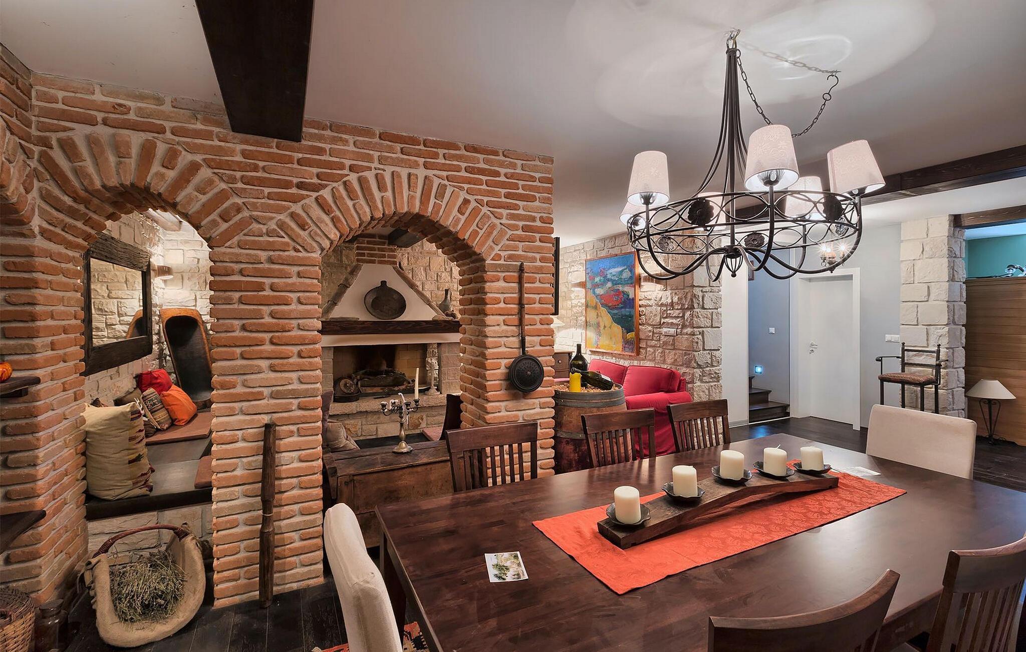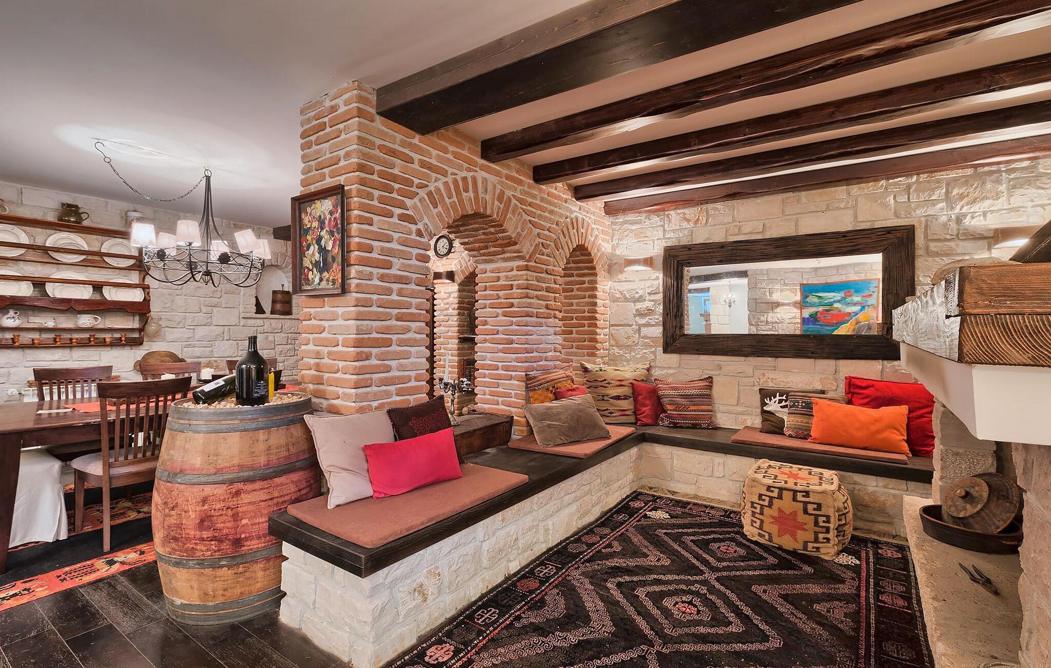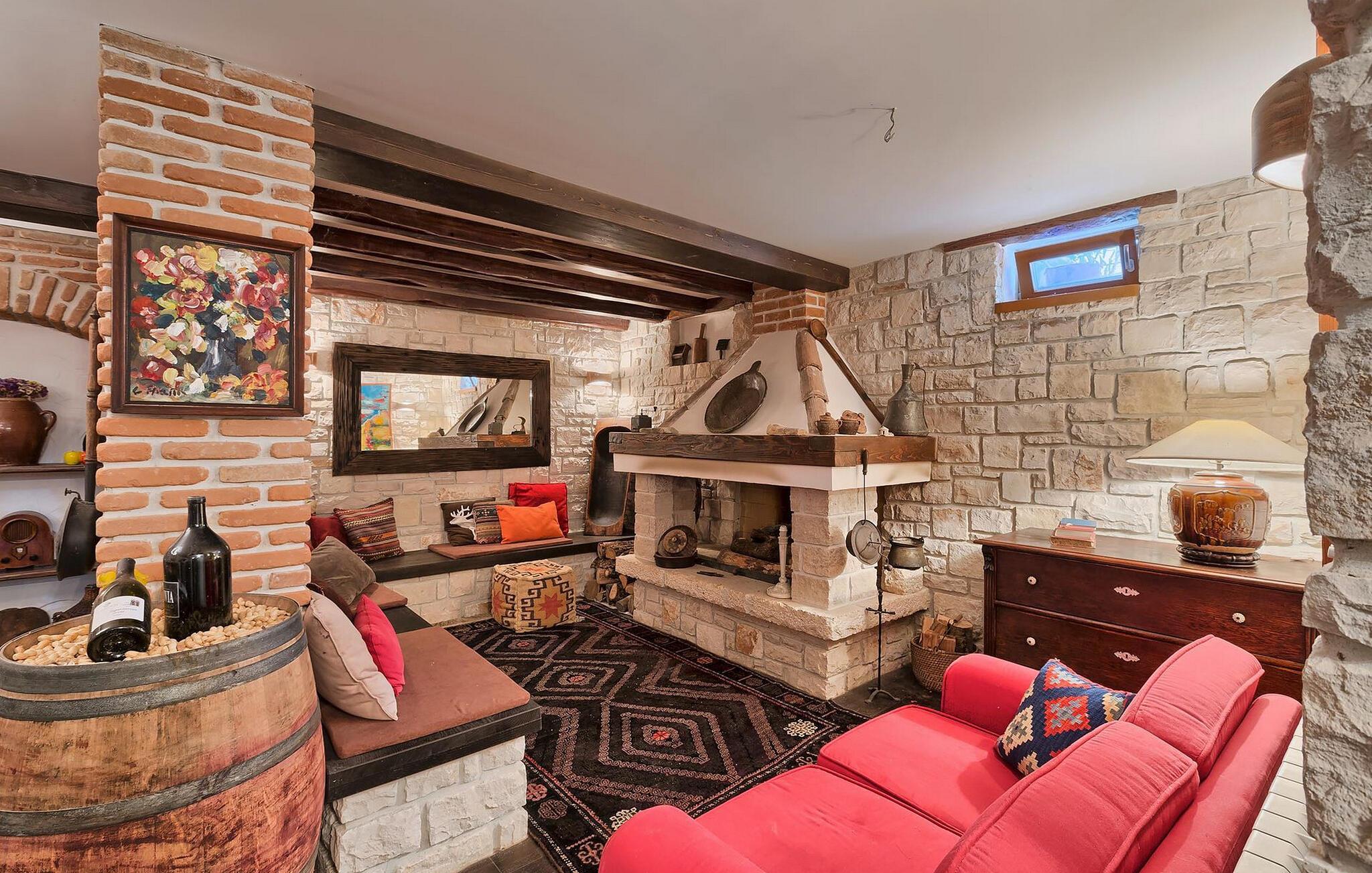 Dette karakterfulle huset kombinerer rustikk sjarm med koselige detaljer: natursteinvegger, trebjelker og møbler i landlig stil skaper en varm atmosfære. Tilbring avslappende timer ved peisen i stuen, eller avslutt kvelden med et glass vin. Det fullt utstyrte kjøkkenet innbyr til felles matlaging, og spisestuen med sin imponerende peis er det perfekte stedet for sosialt samvær.