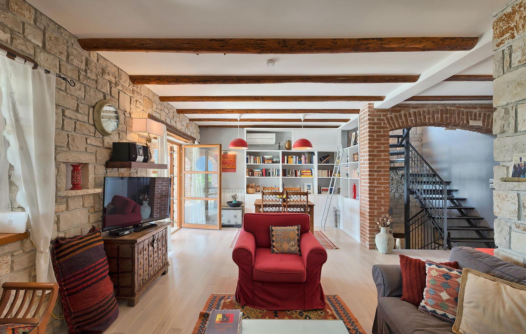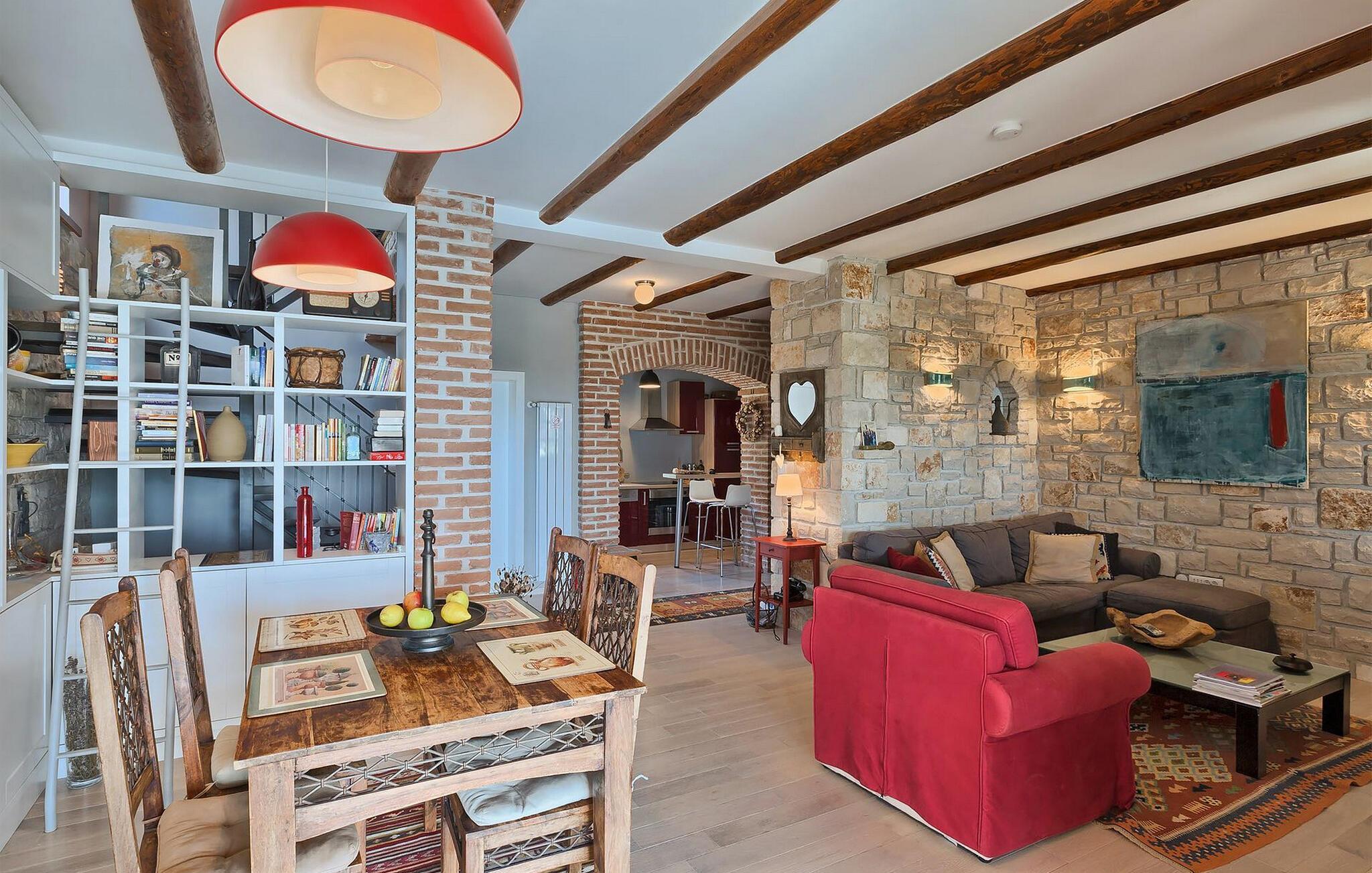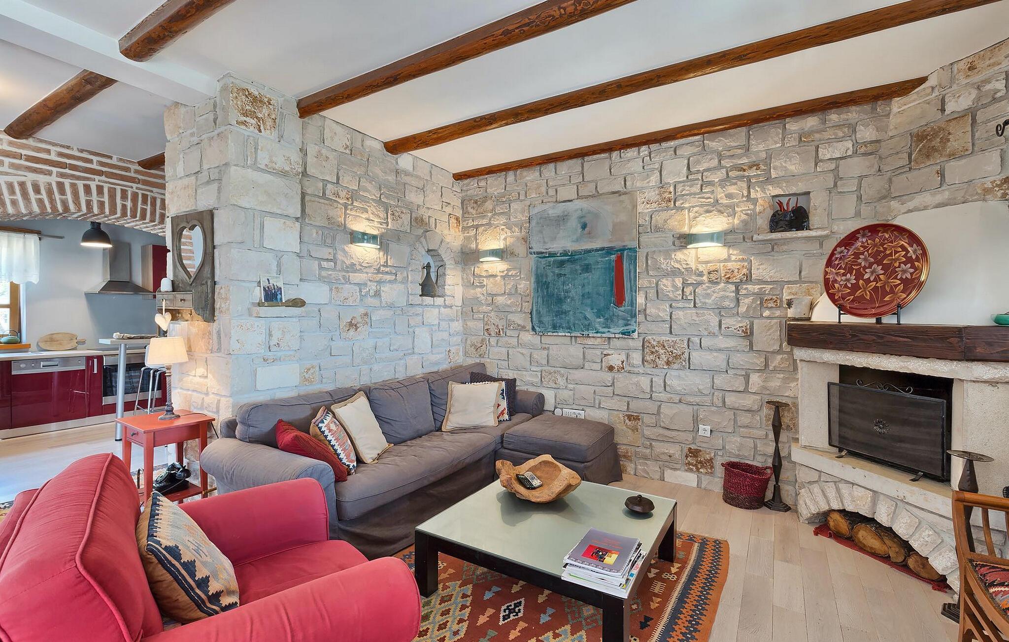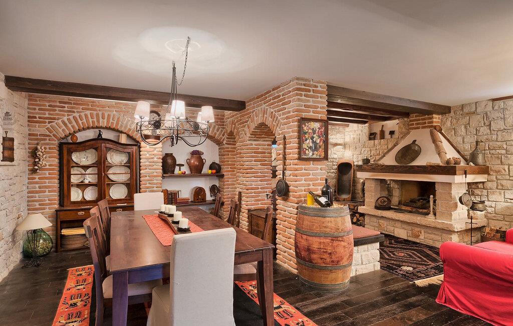 Dette karakterfulle huset kombinerer rustikk sjarm med koselige detaljer: natursteinvegger, trebjelker og møbler i landlig stil skaper en varm atmosfære. Tilbring avslappende timer ved peisen i stuen, eller avslutt kvelden med et glass vin. Det fullt utstyrte kjøkkenet innbyr til felles matlaging, og spisestuen med sin imponerende peis er det perfekte stedet for sosialt samvær.