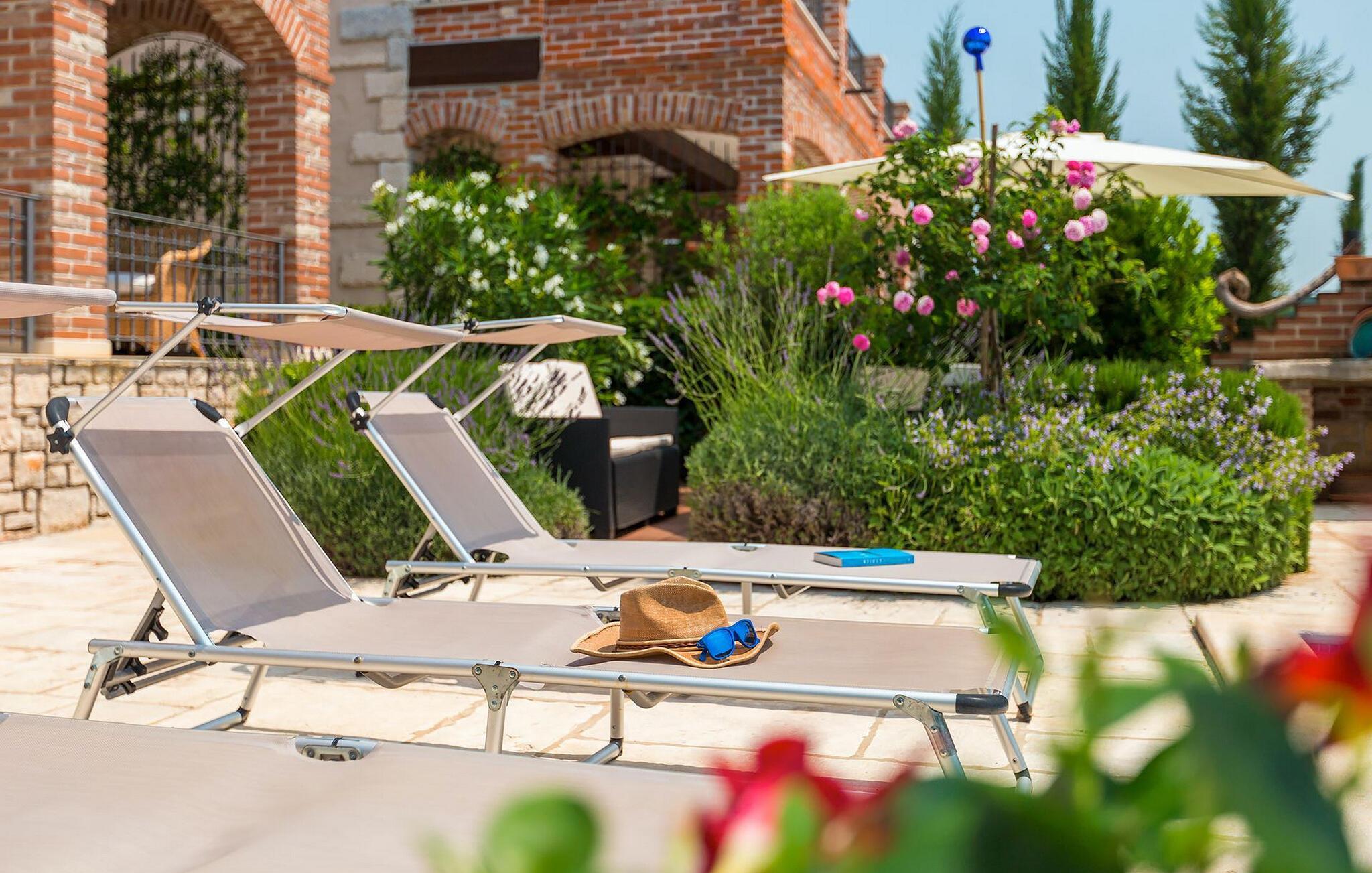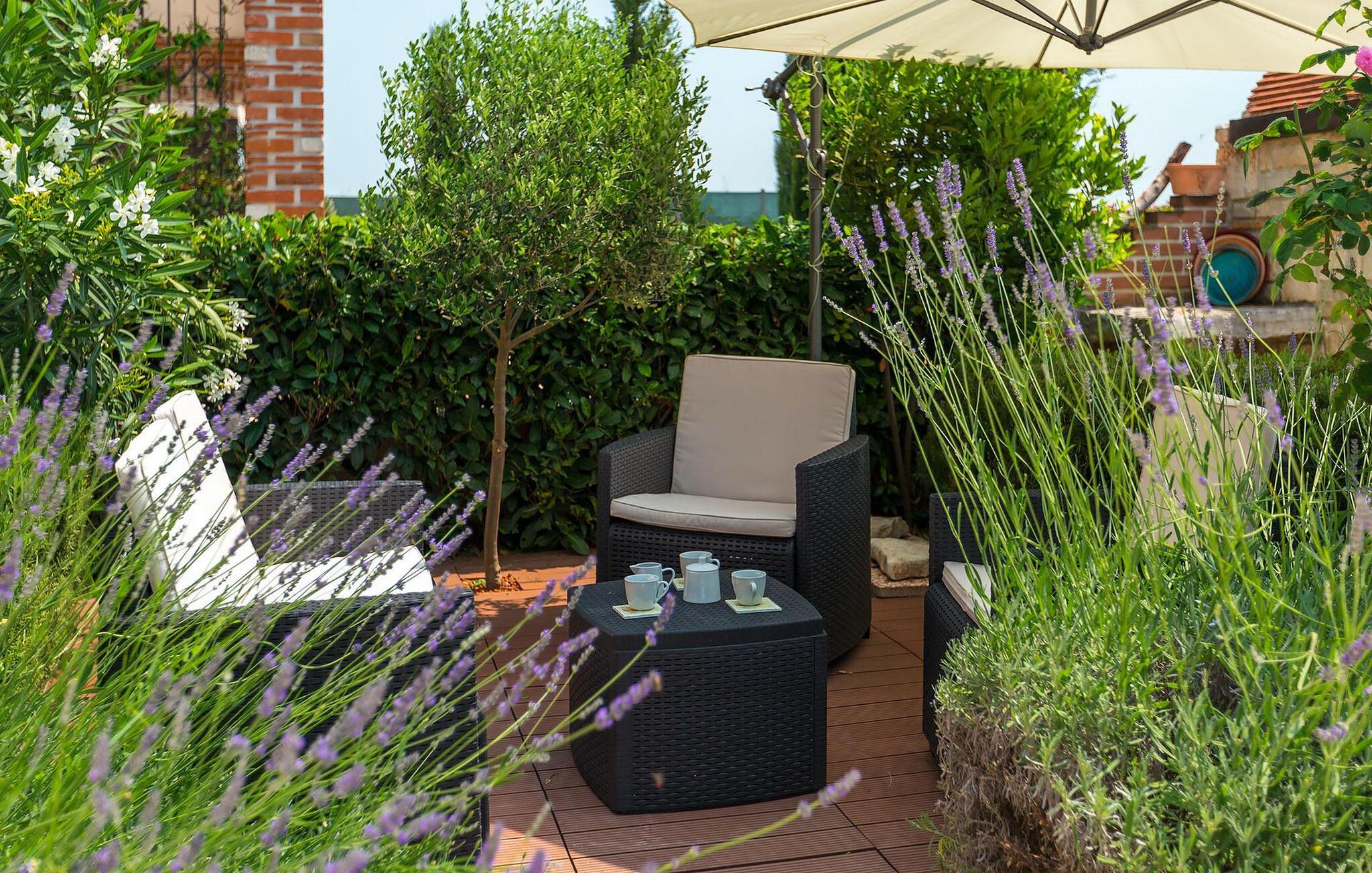 Ta en forfriskende dukkert i bassenget, og slapp deretter av på solsengene. Tilbered en saftig biff eller fersk fisk på den mursteinsgrillen. Slå deg ned i den koselige sittegruppen blant de blomstrende lavendlene og kjenn på den avslappede atmosfæren i hagen. Når kvelden faller på, ledsages du av et stemningsfullt lysspill gjennom sommertimene i det fri.