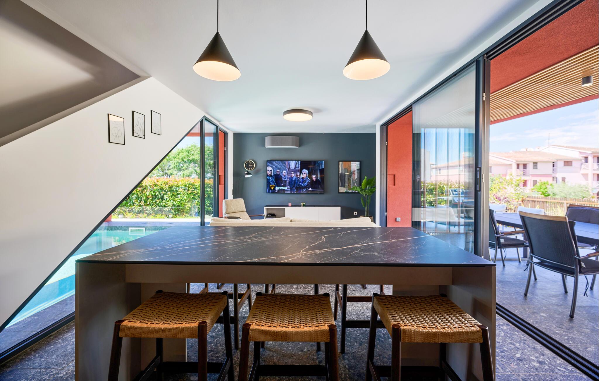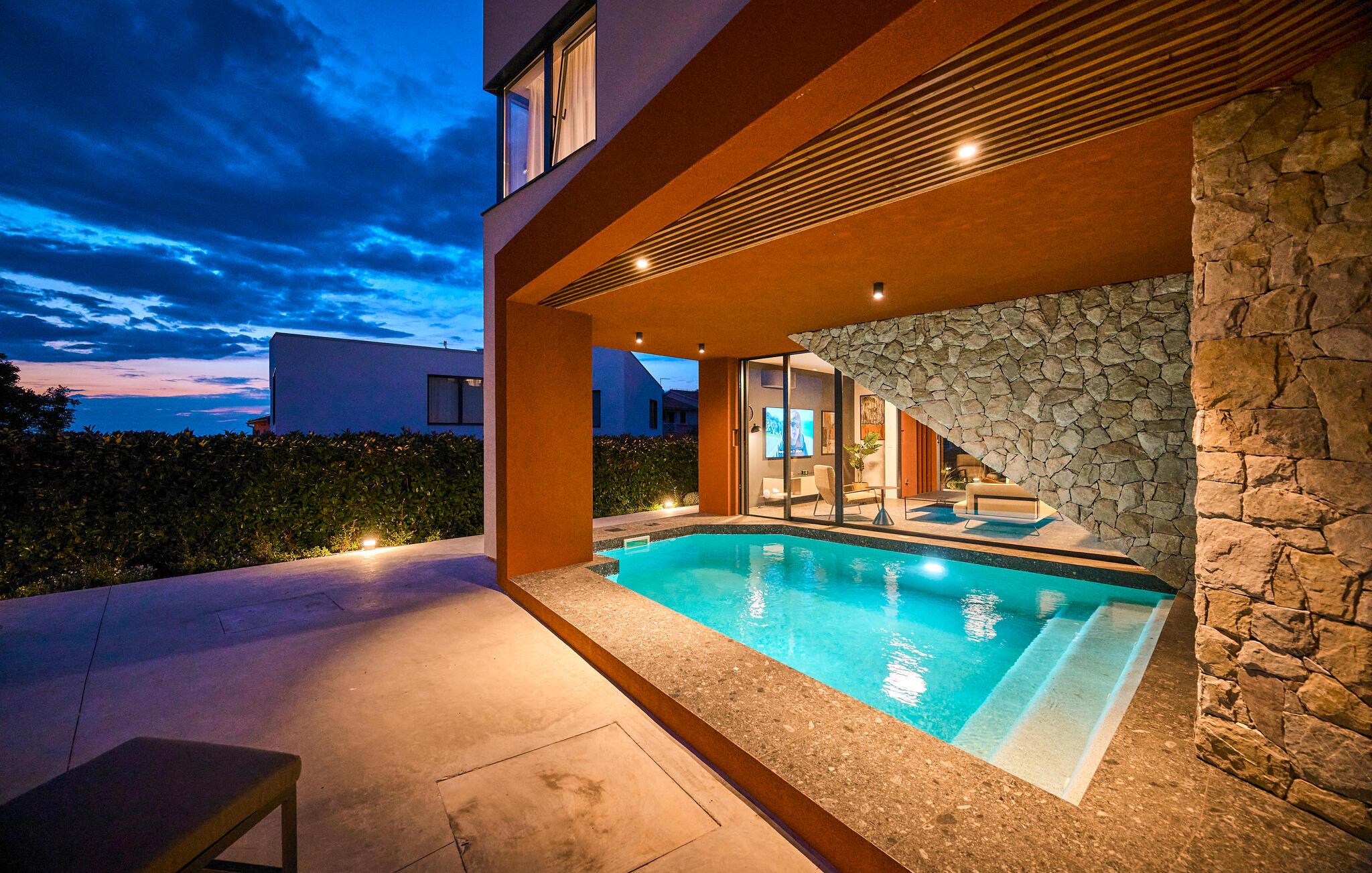 Det vakre bassenget, som er stemningsfullt opplyst om kvelden, er en kjærkommen forfriskning når som helst på dagen på varme sommerdager. Lad batteriene på de komfortable solsengene, nyt et glass vin i den innbydende utesalongen og fyr opp grillen ved solnedgang.