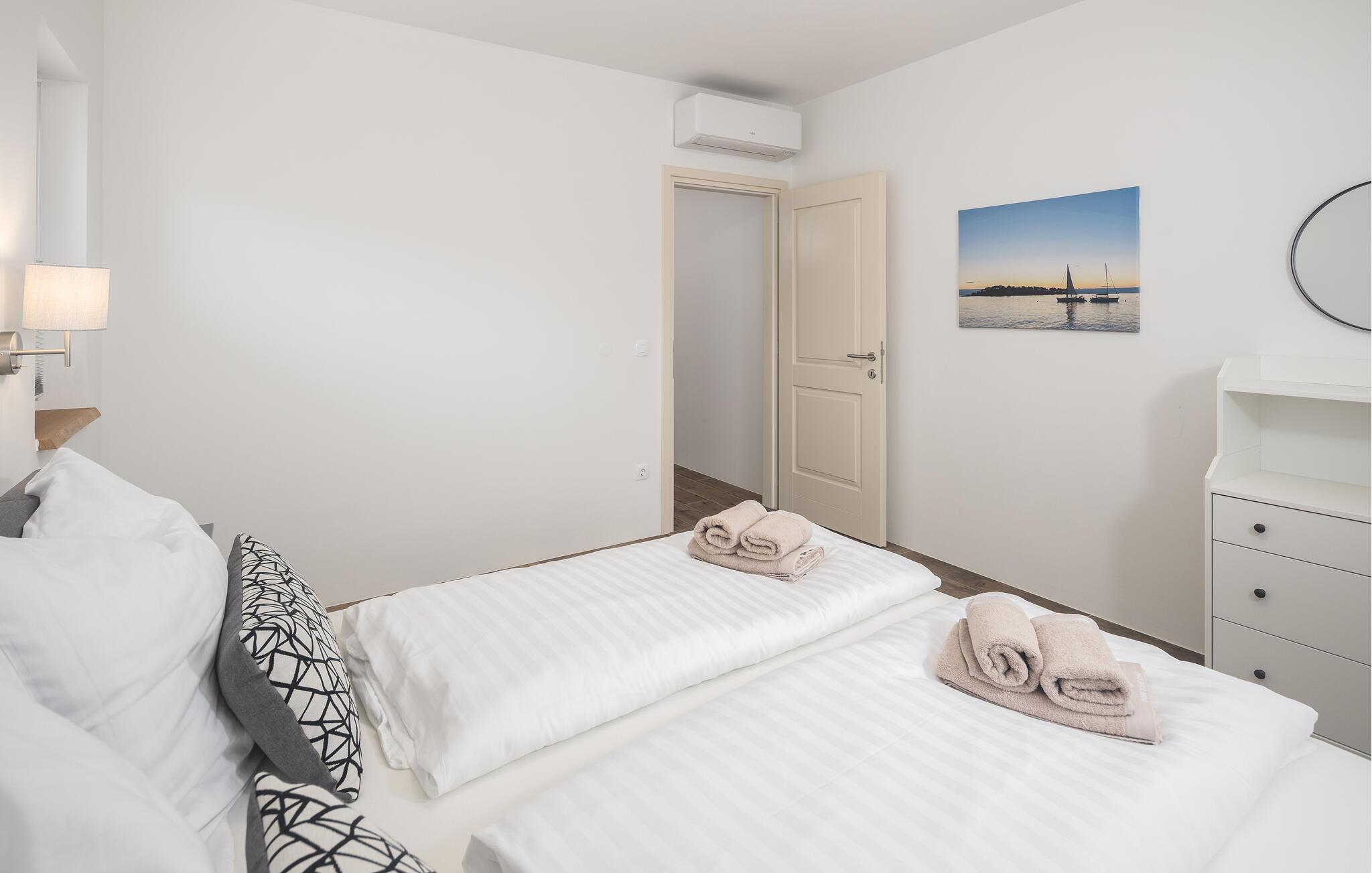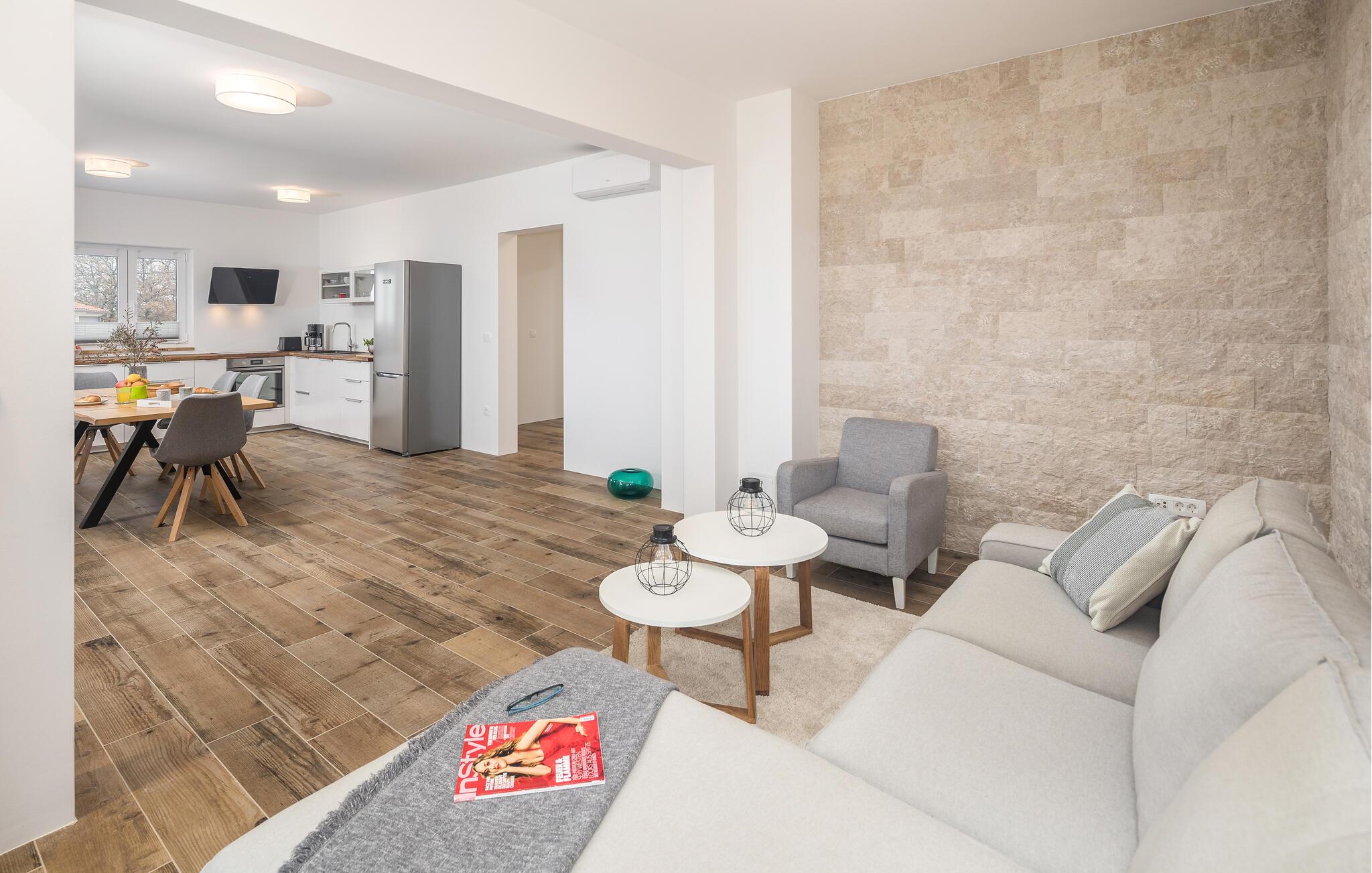 Denne lyse villaen, som ligger i nærheten av Porecs turistsentrum, ønsker deg velkommen og vil gi deg en perfekt ferie. Planløsningen i to etasjer er ideell for to familier som reiser sammen, men likevel ønsker å beholde privatlivet. Utsatte steinvegger, fliser i tre og stilige møbler innbyr til å føle seg hjemme og nyte livet. Slapp av i stuene, lag mat sammen og slapp av med et glass vin på balkongene. Herfra kan du også se ut over havet og landskapet og planlegge de neste aktivitetene i tankene. Du kan også glede deg til å tilbringe tid i hagen, ta en dukkert i saltvannsbassenget og lytte til favorittpodcasten din på solterrassen.