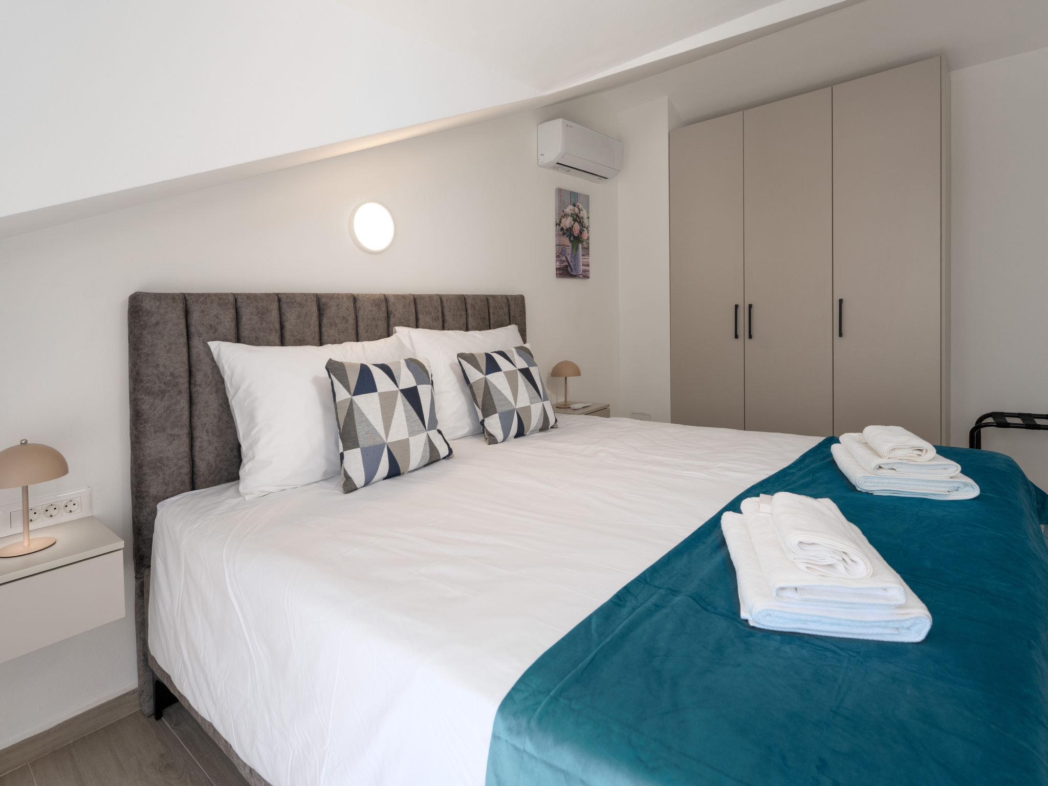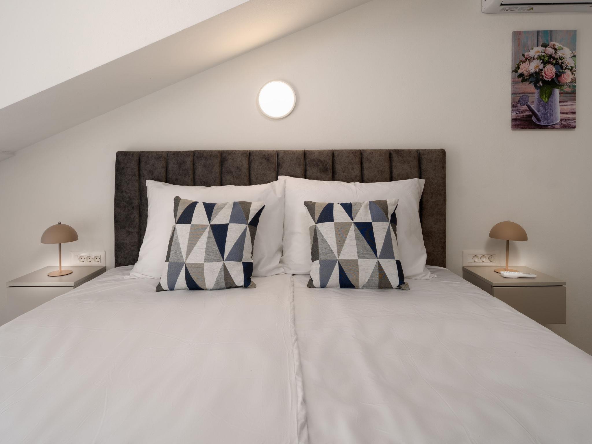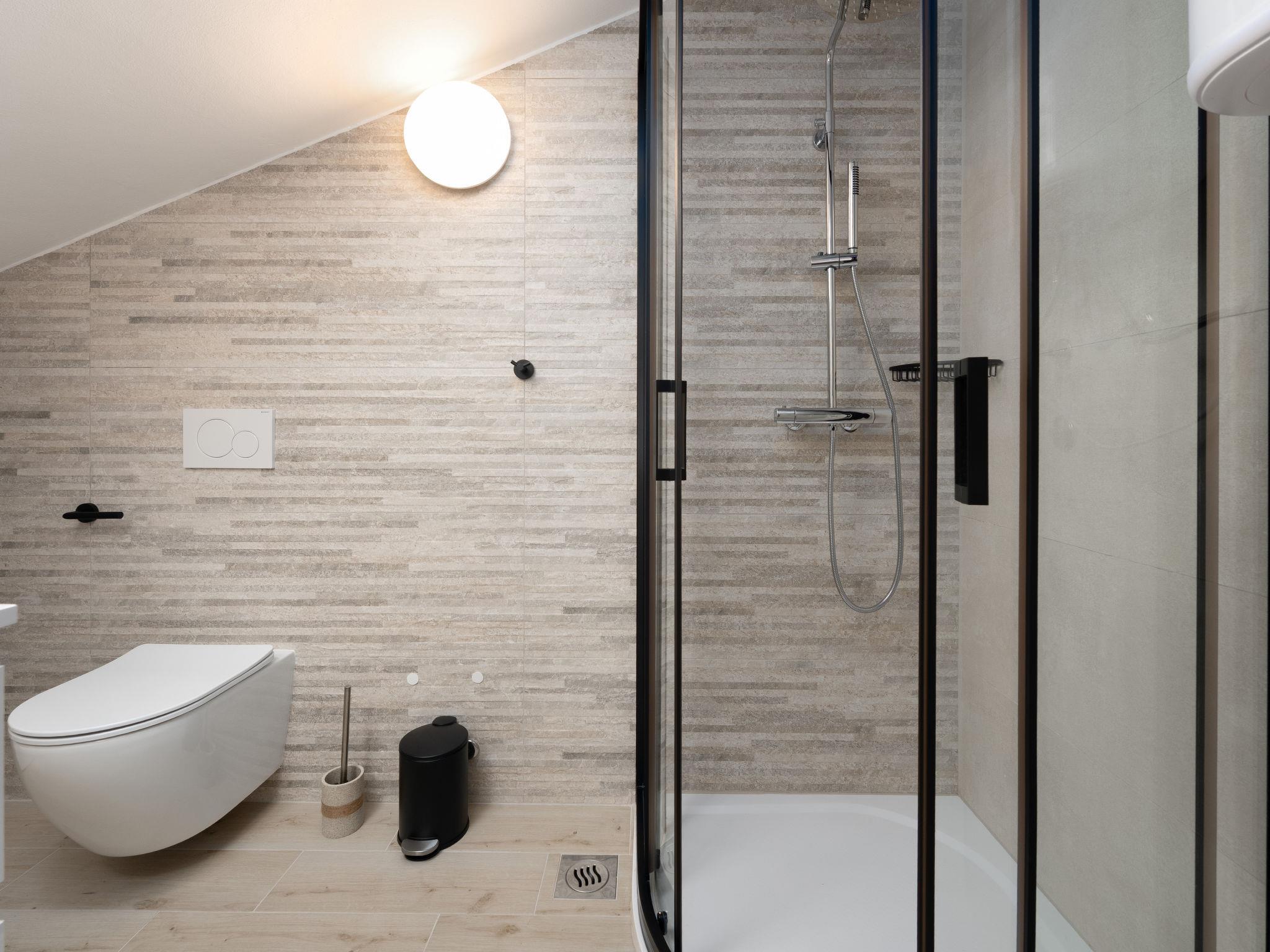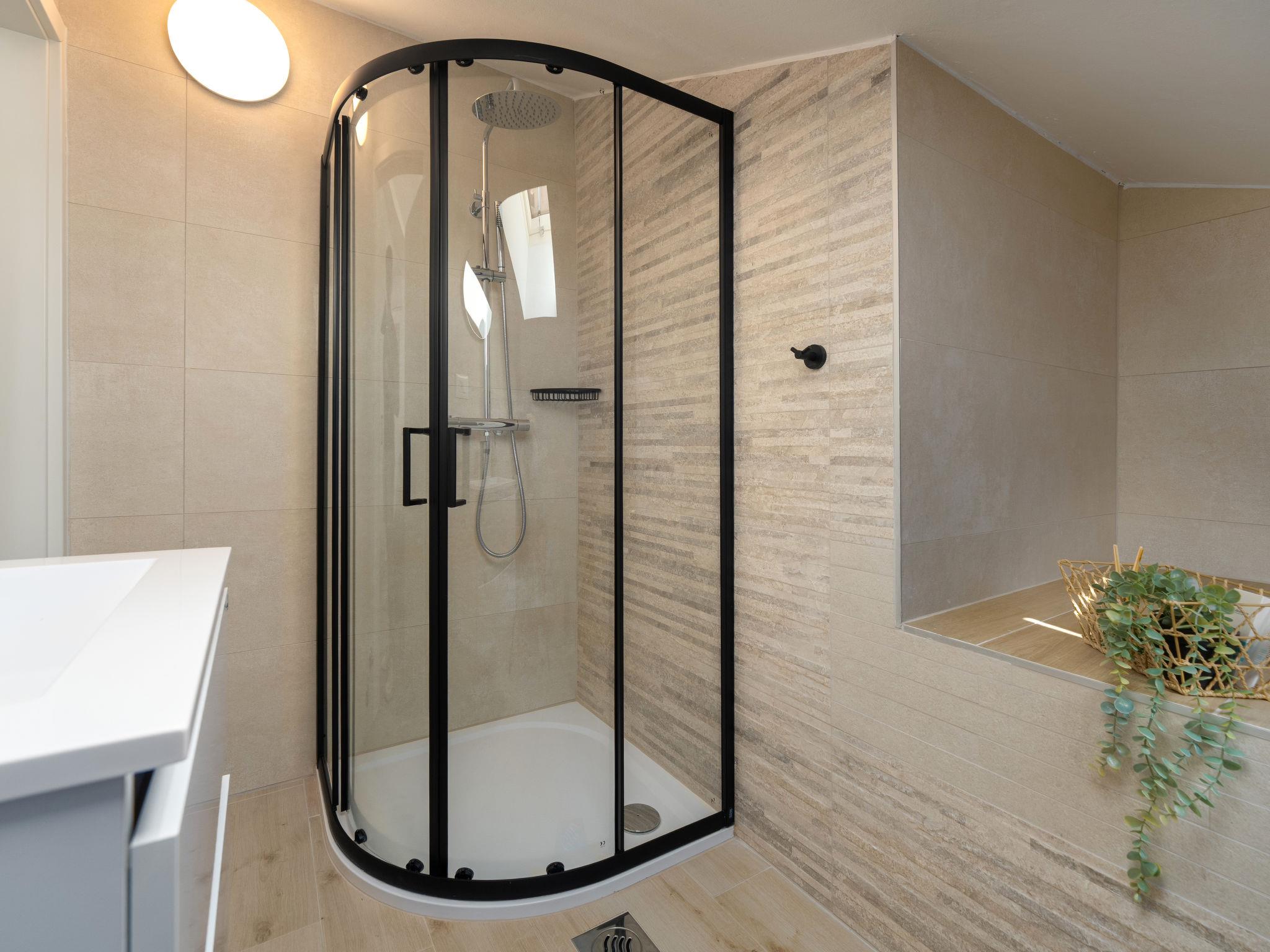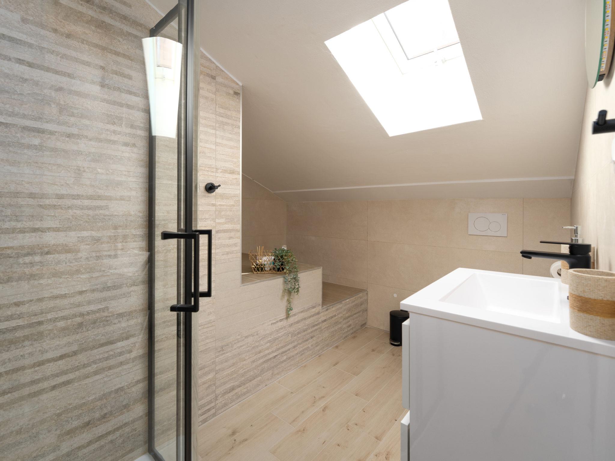 "B3", 3-room apartment 90 m2 on 2 levels, on the upper floor. Spacious and bright, beautiful furnishings: living/dining room with 1 sofabed (140 cm, length 200 cm), satellite TV and air conditioning. Exit to the terrace. Open kitchen (oven, dishwasher, 4 ceramic glass hob hotplates, toaster, kettle, microwave, freezer, electric coffee machine). Sep. WC. Upper floor: (spiral staircase), 1 room with 1 french bed (180 cm, length 200 cm), shower/WC and air conditioning. Exit to the terrace. 1 room with sloping ceilings with 2 beds (90 cm, length 200 cm), shower/WC and air conditioning. Forced-air heating. Terrace 12 m2, terrace 12 m2, roofed. Terrace furniture. Facilities: washing machine, safe, iron, baby cot, hair dryer. Internet (WiFi, free). Parking (1 car) at the house. Please note: non-smoking house.