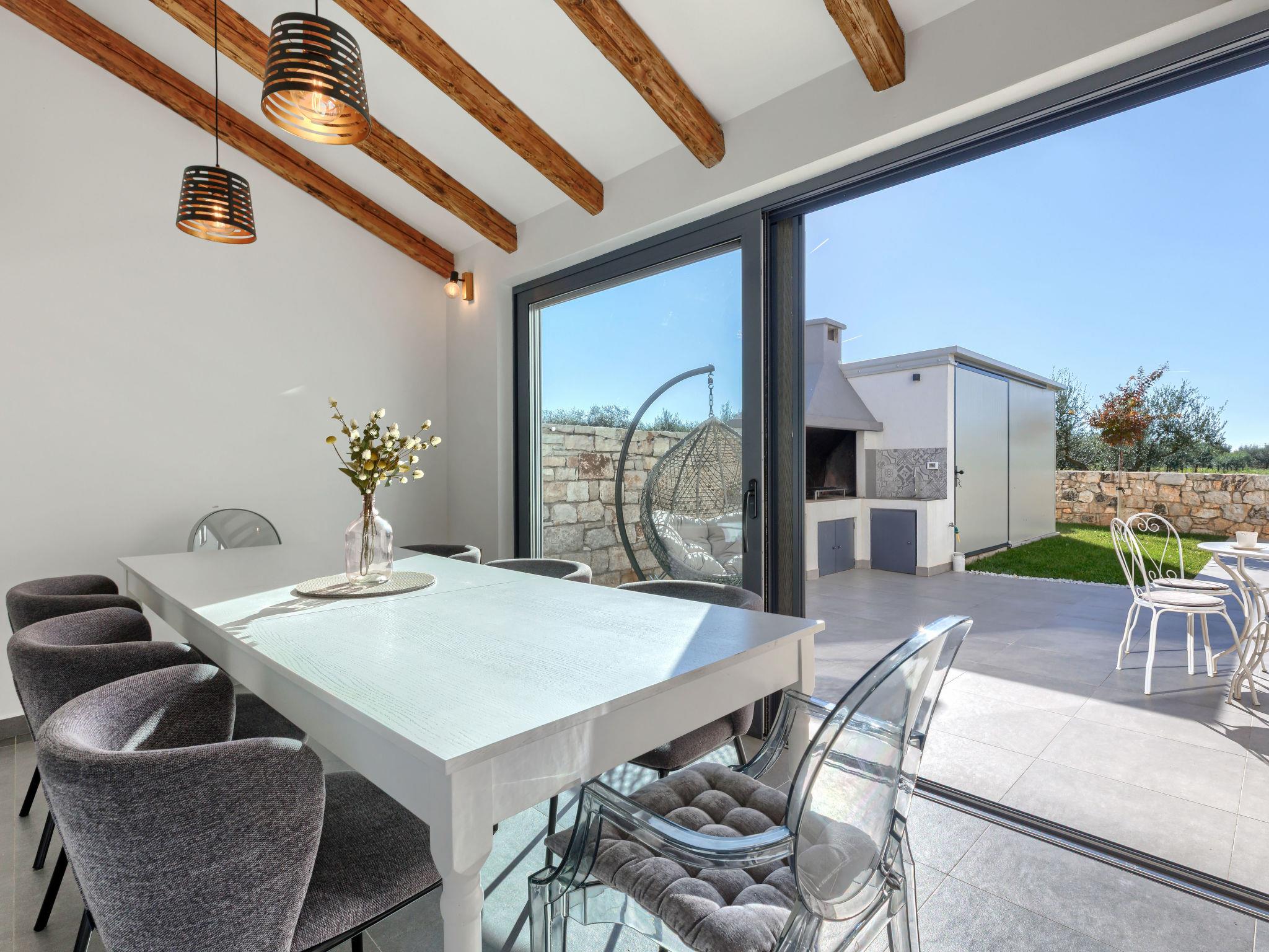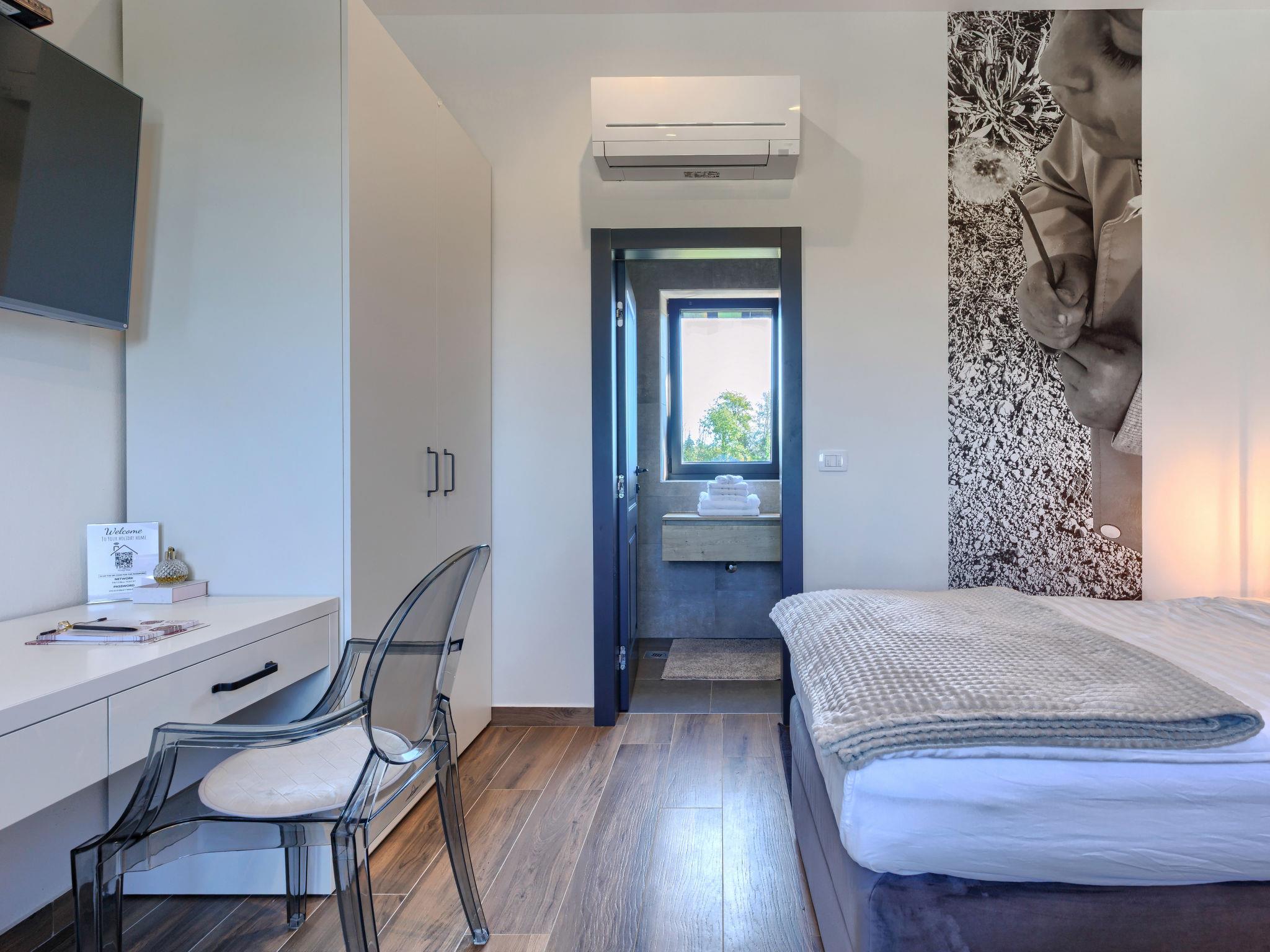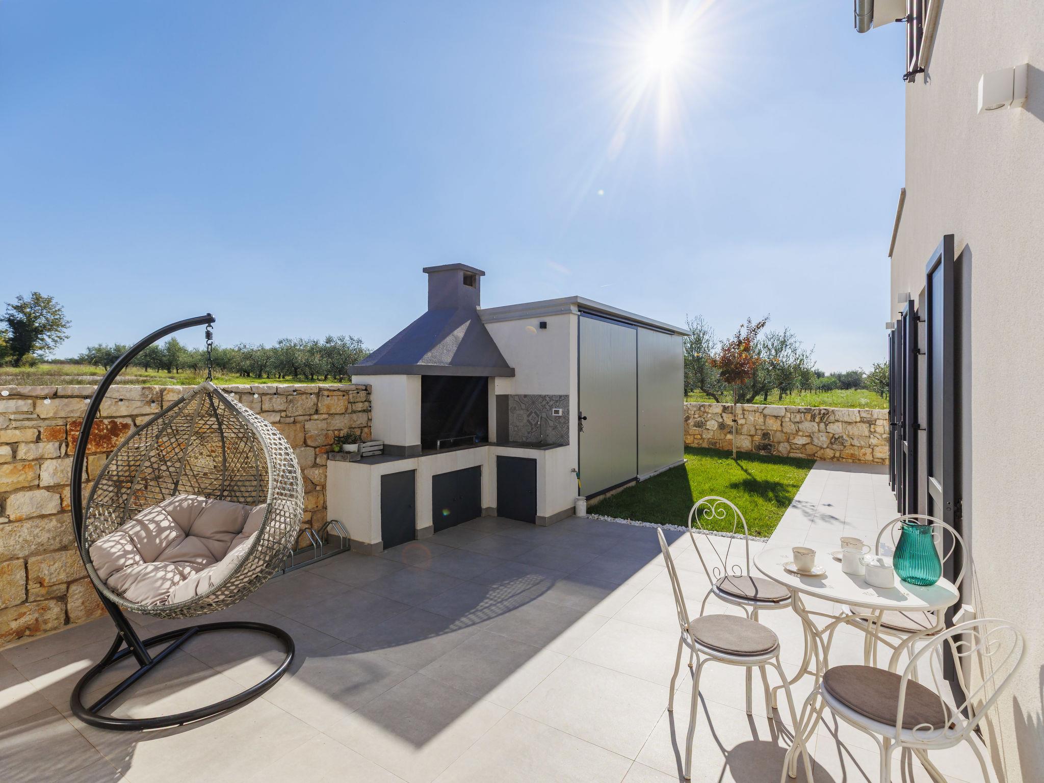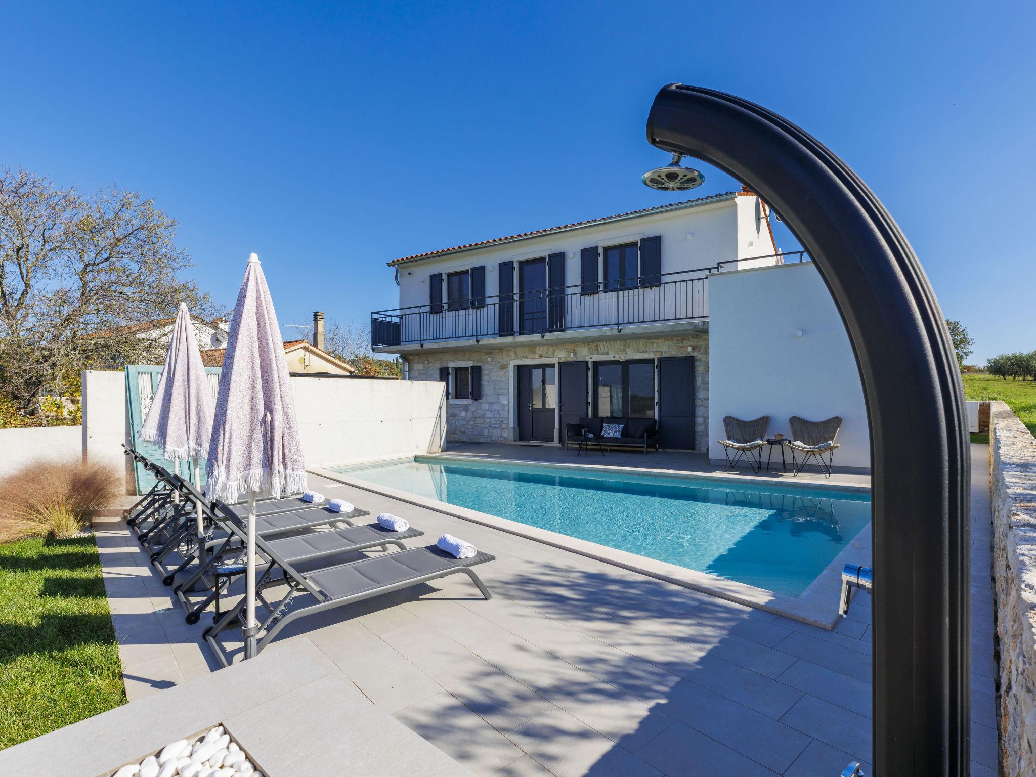 Modern, beautiful single-family house "Villa Tiamo", 2 storeys. In the hamlet Labinci 3 km from the centre of Kaštelir, 13 km from the centre of Porec, in a sunny position, 11 km from the sea. Private: property 350 m2 (fenced) with lawn and wildlife garden, swimming pool kidney shaped (6 x 6 m, depth 150 cm, seasonal availability: 01.Apr. - 01.Nov.) with internal staircase and salt-electrolysis pool-cleaning system. Outdoor shower, garden furniture, barbecue, pool maintenance by the owner/gardener. In the house: internet access, washing machine, tumble dryer. Parking (for 2 cars) at the house on the premises. E-charging station. Shop 300 m, supermarket 7 km, restaurant, bus stop 600 m, pebble beach 11 km, rocky beach 11 km. Nearby attractions: Aquapark 17 km. The owner does not accept any youth groups.