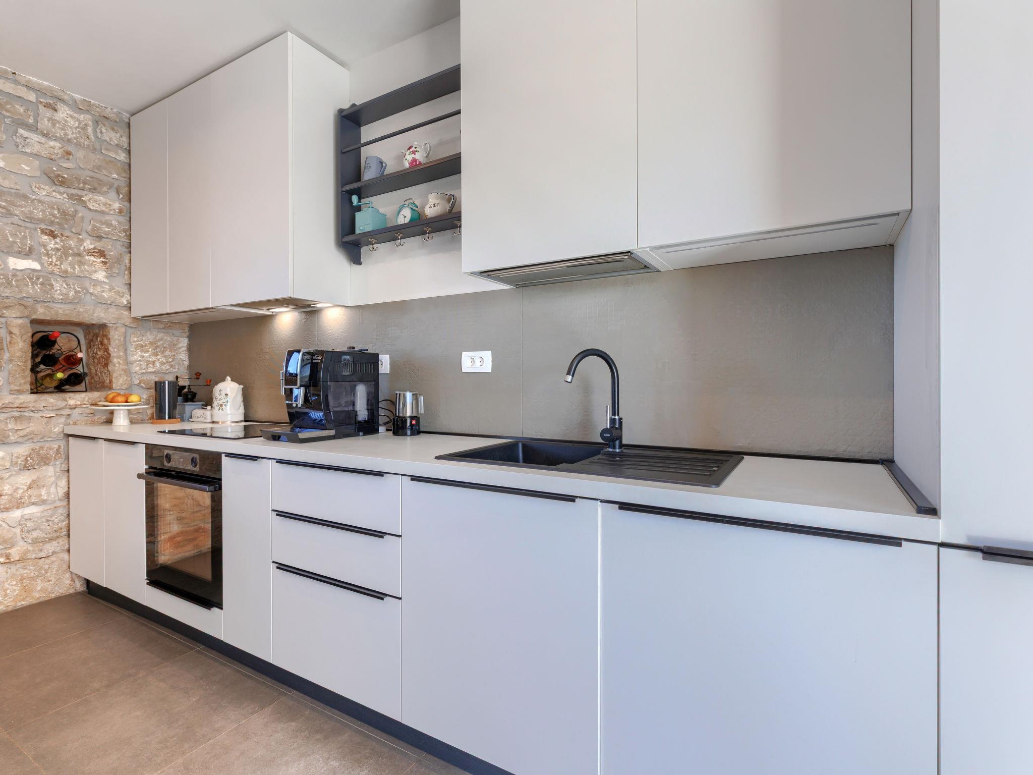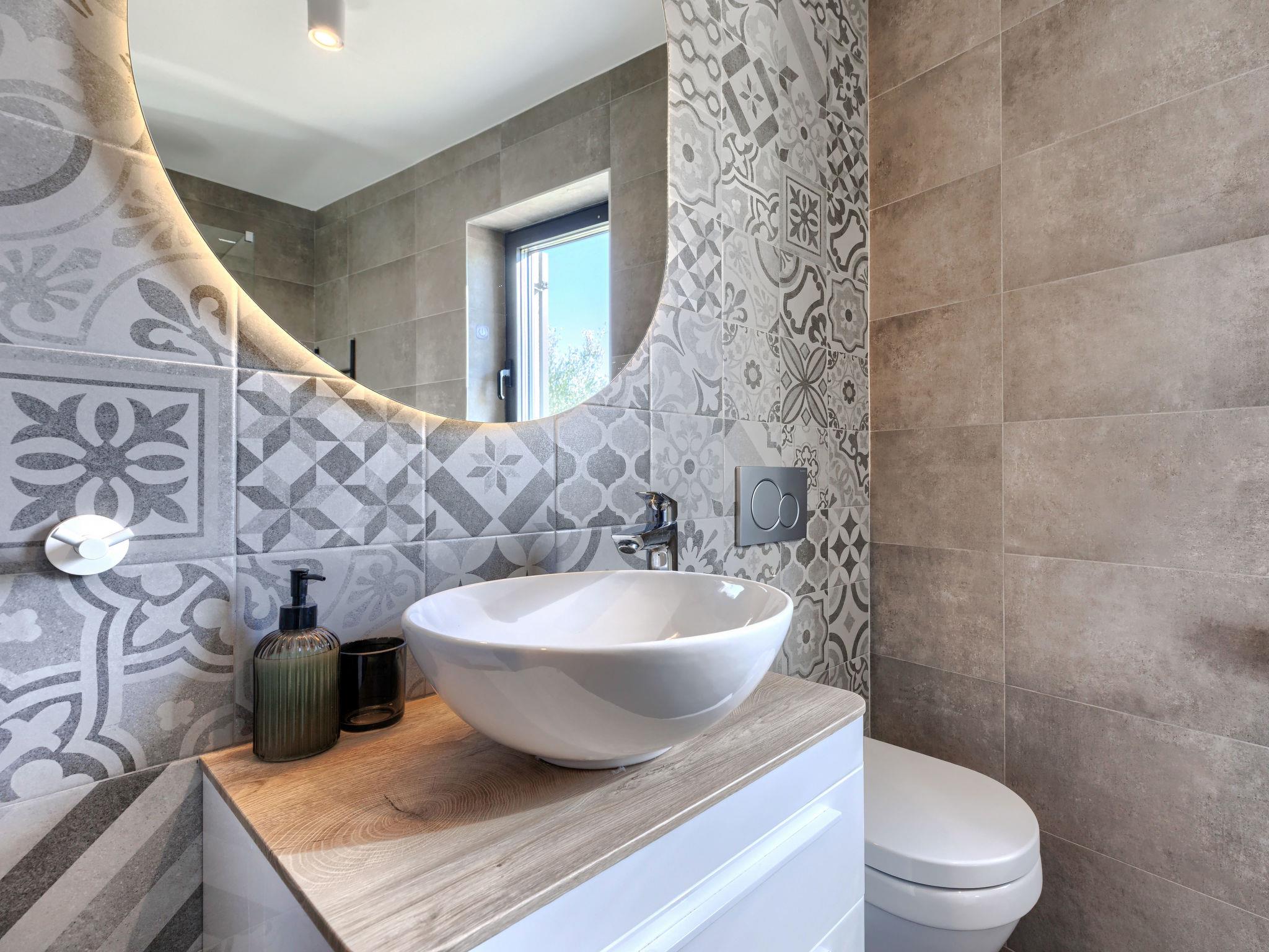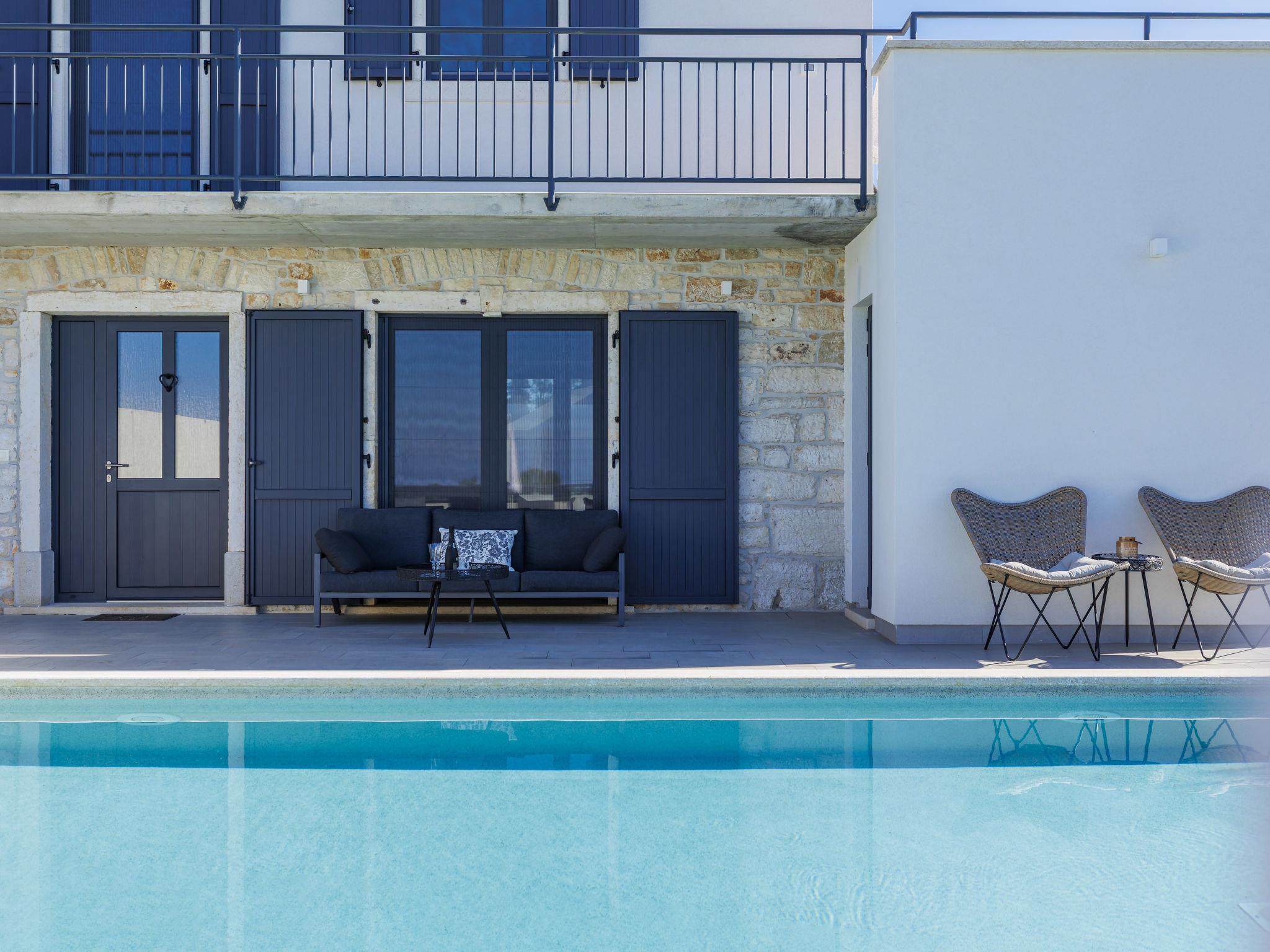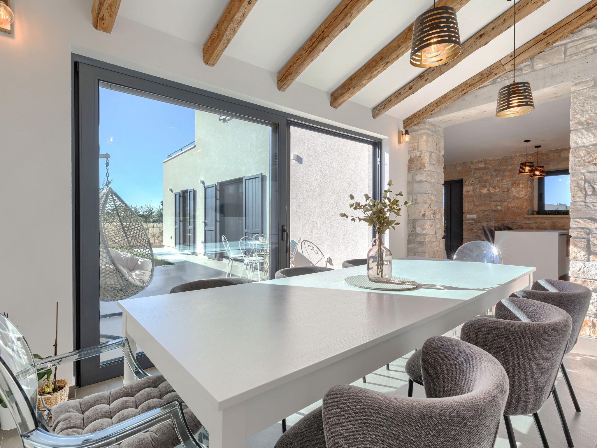 Modern, beautiful single-family house "Villa Tiamo", 2 storeys. In the hamlet Labinci 3 km from the centre of Kaštelir, 13 km from the centre of Porec, in a sunny position, 11 km from the sea. Private: property 350 m2 (fenced) with lawn and wildlife garden, swimming pool kidney shaped (6 x 6 m, depth 150 cm, seasonal availability: 01.Apr. - 01.Nov.) with internal staircase and salt-electrolysis pool-cleaning system. Outdoor shower, garden furniture, barbecue, pool maintenance by the owner/gardener. In the house: internet access, washing machine, tumble dryer. Parking (for 2 cars) at the house on the premises. E-charging station. Shop 300 m, supermarket 7 km, restaurant, bus stop 600 m, pebble beach 11 km, rocky beach 11 km. Nearby attractions: Aquapark 17 km. The owner does not accept any youth groups.