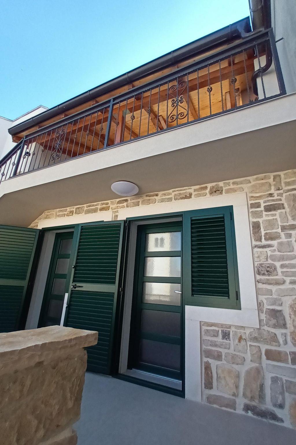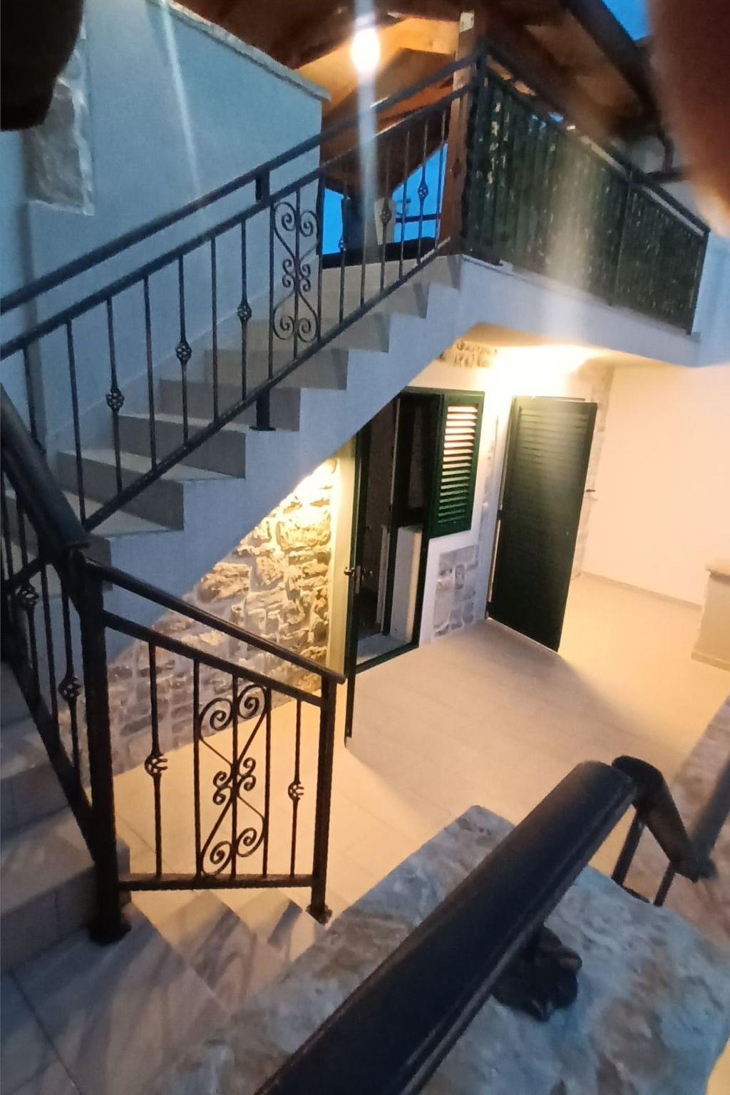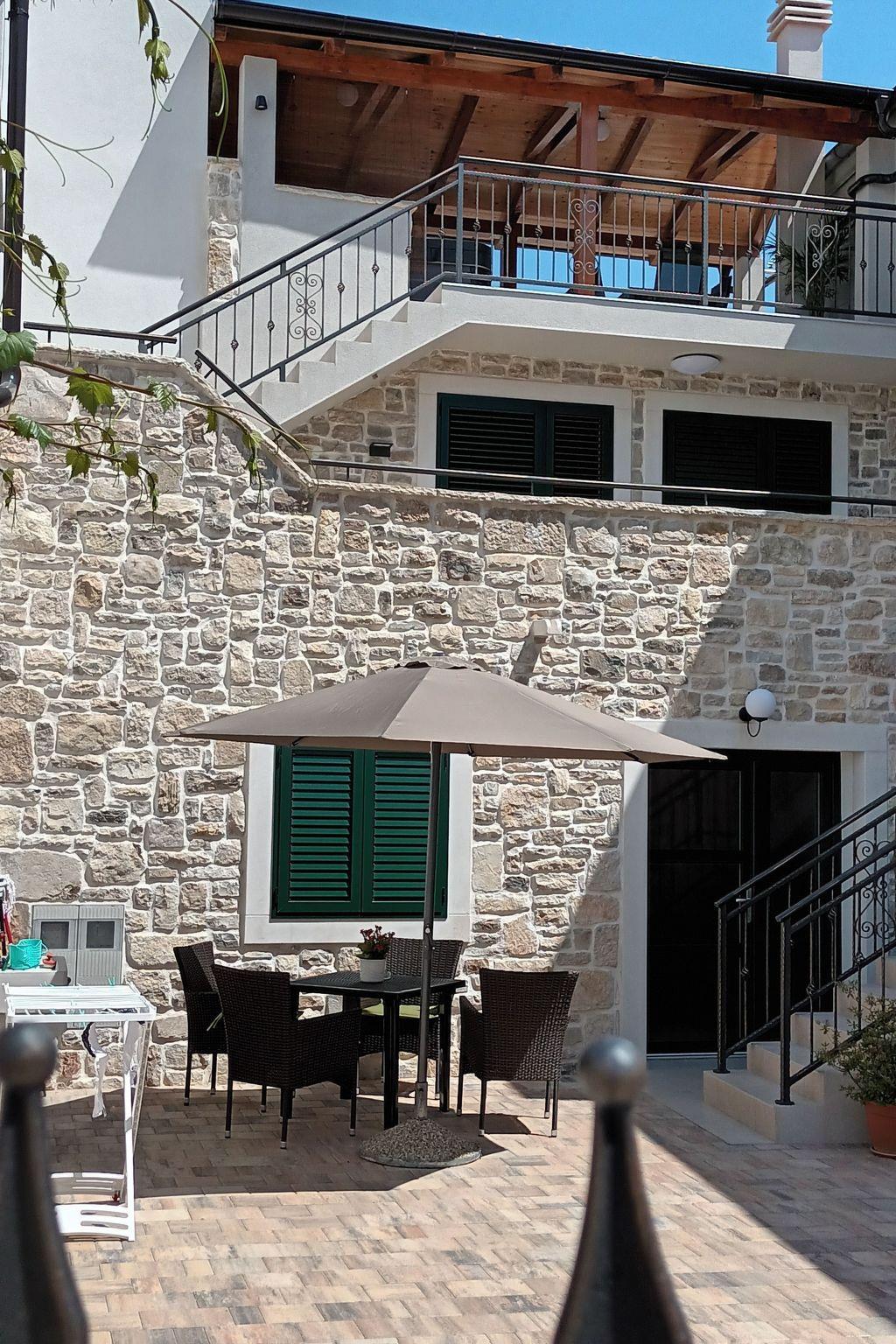 Ground floor- 1 bathroom, 1 bedroom, familyroom with kitchen.First floor-upstairs you go outside-2 bedrooms,1 bathroomSecend floor-terassa with jakuzzi (whirlpool) and sea view..,table, chairs, deck chairs.Grill is on parking . House is for 6+1.