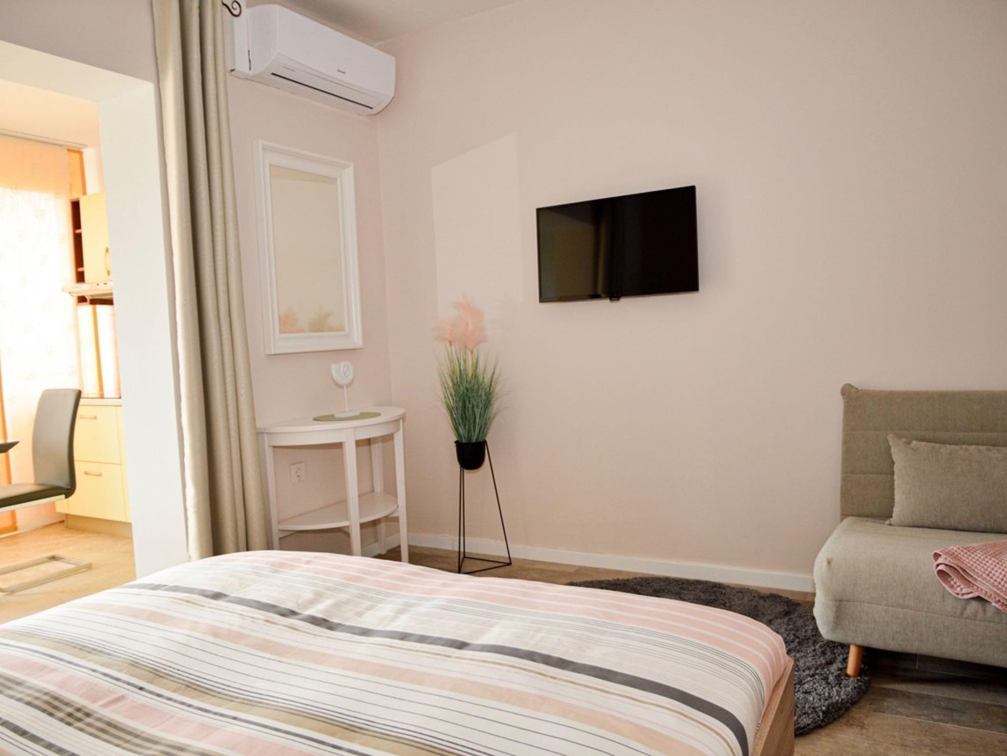 Studio bietet Platz für 2 Gäste. Die Betten sind in Schlafzimmern, die es 1 gibt, innerhalb einer Gesamtfläche von 28m2, angeordnet. Das Studio-Apartment bietet Meerblick. Es ist erlaubt, Speisen auf dem Gemeinschafts-Grill vorzubereiten. Während ihres Aufenthalts können Gäste das gemeinsam zur Nutzung stehende Schwimmbad benutzen. In der Unterkunftseinheit besteht die Möglichkeit des Mitbringens von Haustieren gegen Aufpreis. Die reservierte Unterkunftseinheit hat keinen Balkon und keine Terrasse. IM PREIS INBEGRIFFEN: Kurtaxe, Endreinigung, Klimatisierung, Pool, Parkplatz, Internet, Wäschewaschen, Bootsanlegeplatz, Kinderbett, Bügeleisen, Bügelbrett, Föhn, Sonnenschirm. VERBINDLICHE ZUSÄTZLICHE KOSTEN: Aufzahlung für Kurzaufenthalte (prozentualer Zuschlag pro Nächtigungsanzahl: 30% - 1, 20% - 2, 10% - 3). UNVERBINDLICHE ZUSÄTZLICHE KOSTEN: Haustiere (10,00 € pro Nacht). Die Verfügbarkeit zusätzlicher Dienstleistungen in Ihrem reservierten Termin und die Preise derselben (falls nicht aufgeführt) müssen im Voraus überprüft werden. Zusätzliche Dienstleistungen die in der Zahlungsaufforderung nicht aufgeführt sind werden direkt beim Vermieter bezahlt, angenommen der Gast nutzt auch diese. Ermäßigung auf den Grundpreis: Gratistag 14=13 (bei einem Aufenthalt von 14 Tagen oder mehr erhalten Sie einen Gratistag für den Aufenthalt bis 31.12.26).