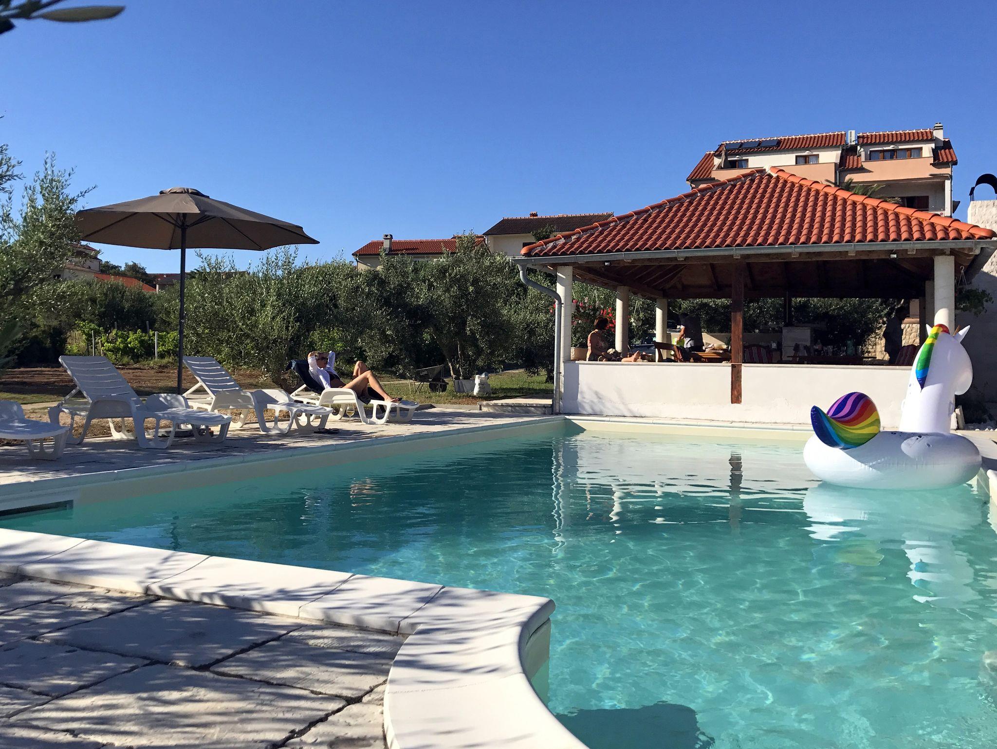 Hof (50m2, Kinderbereich, Sitzbereich), Parkplatz (Anzahl der Parkplätze: 6, Entfernung vom Objekt: im Hof), Pool: gemeinsam, Dimensionen: 10m x 5m x 1.5m, Wassertyp: Süßwasser, Grill: gemeinsam, WiFi Internet, Wäschewaschen, Bootsanlegeplatz (Entfernung vom Objekt: 750 m, Bootsanlegeplatztyp: an der Küste), Föhn, Bügeleisen, Bügelbrett, Sonnenschirm, Kinderbett