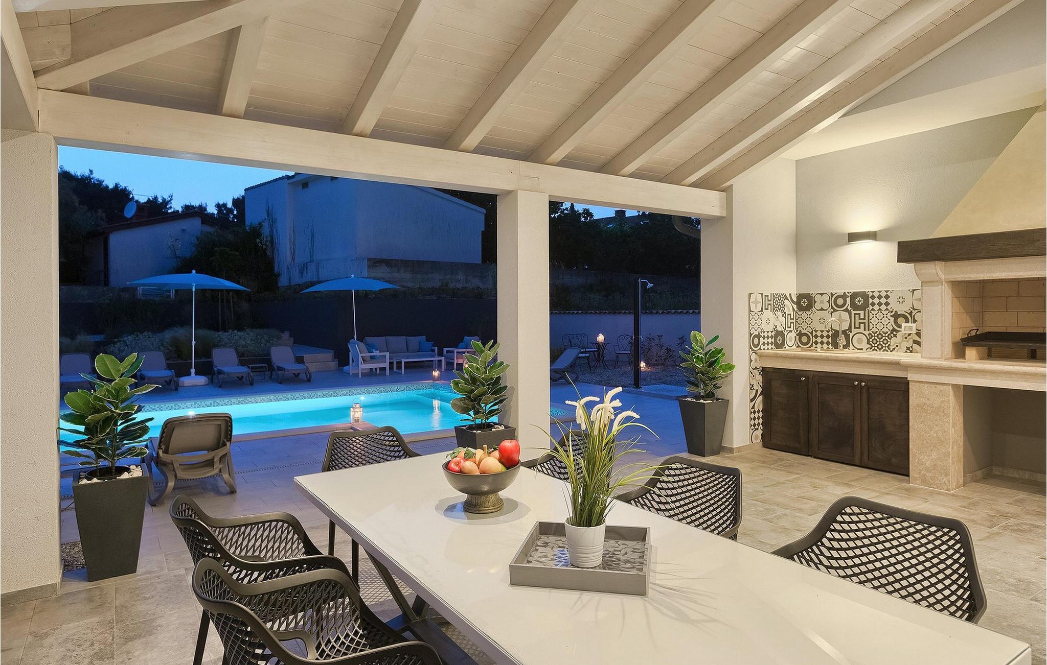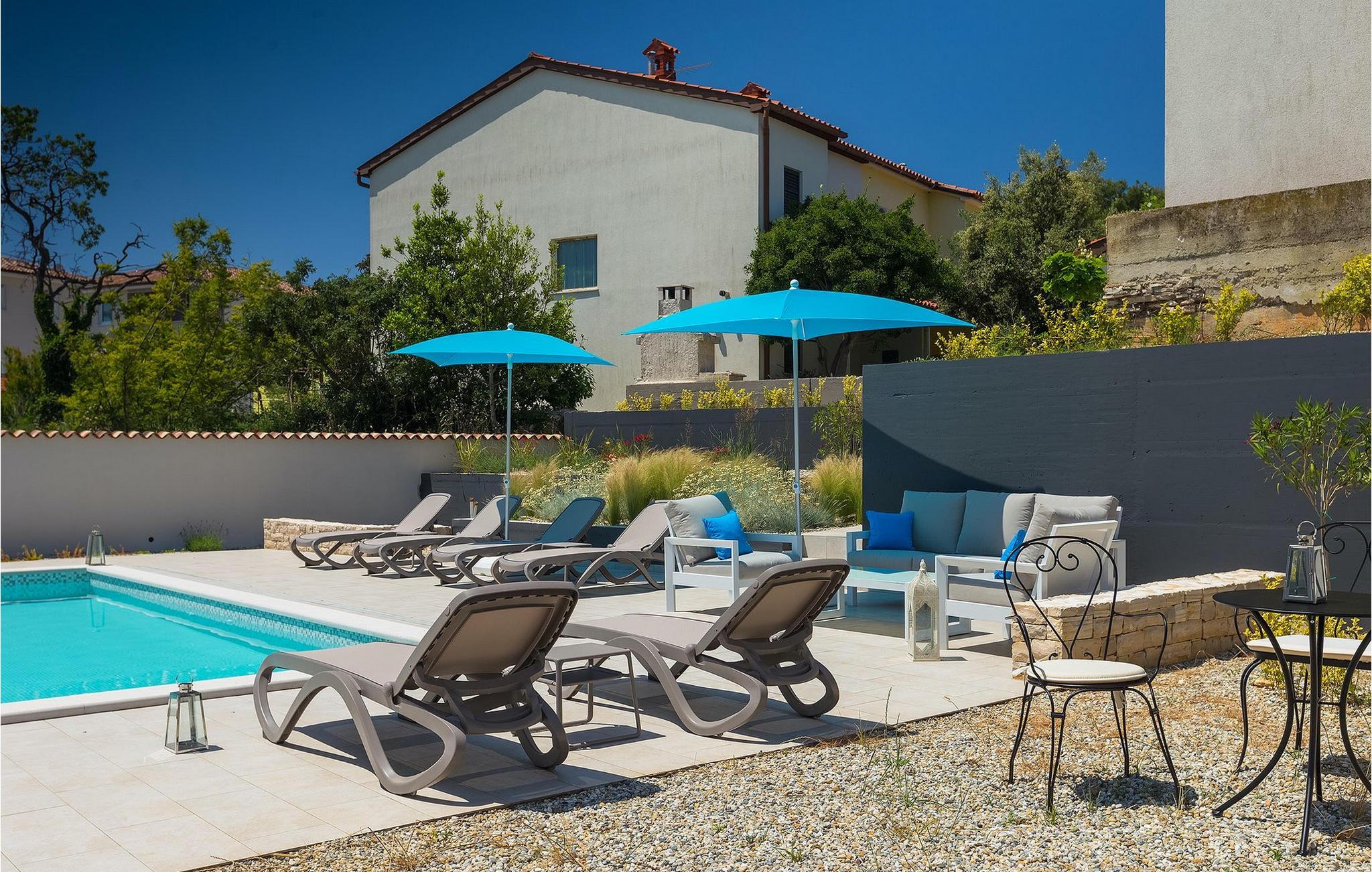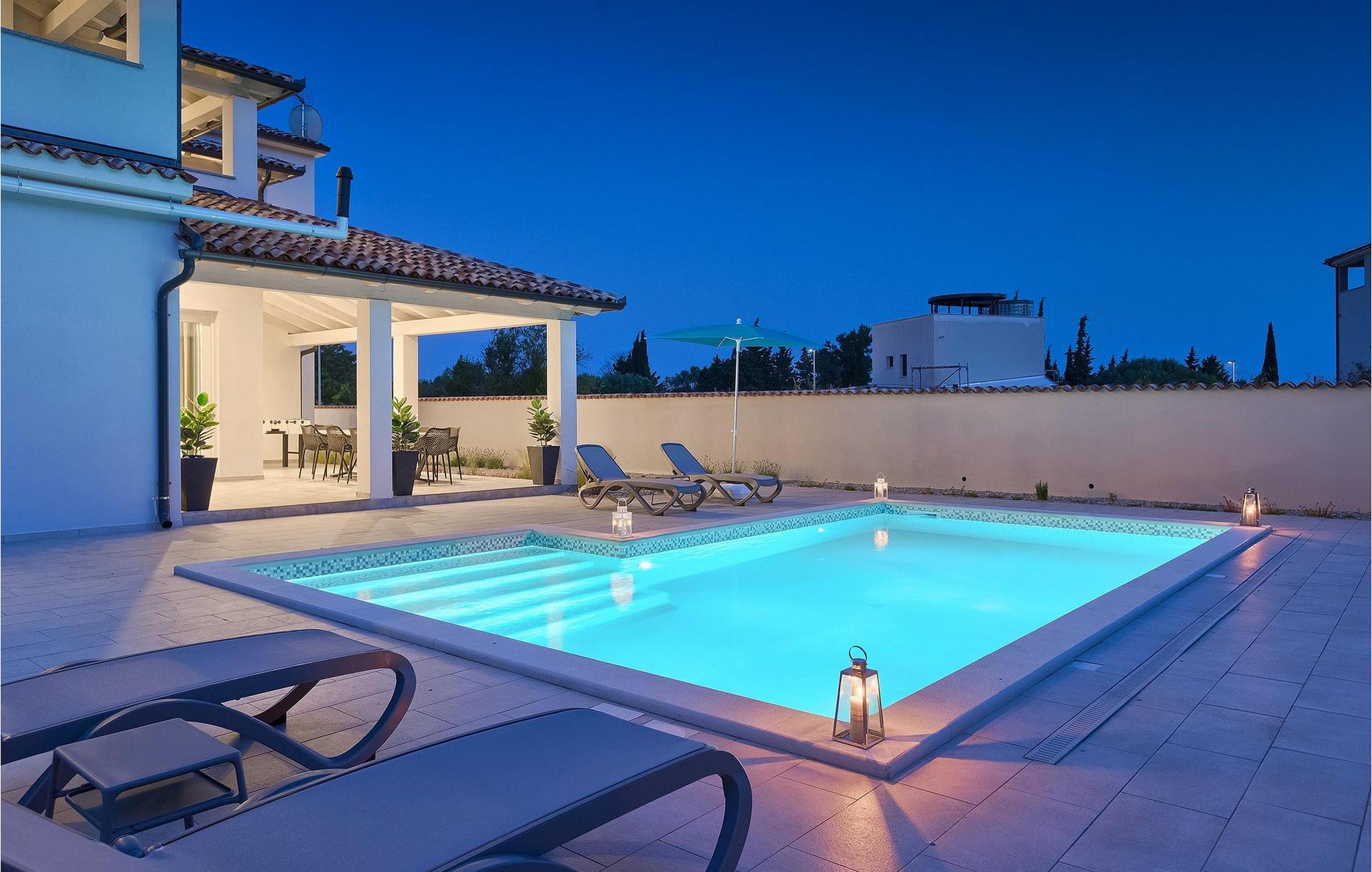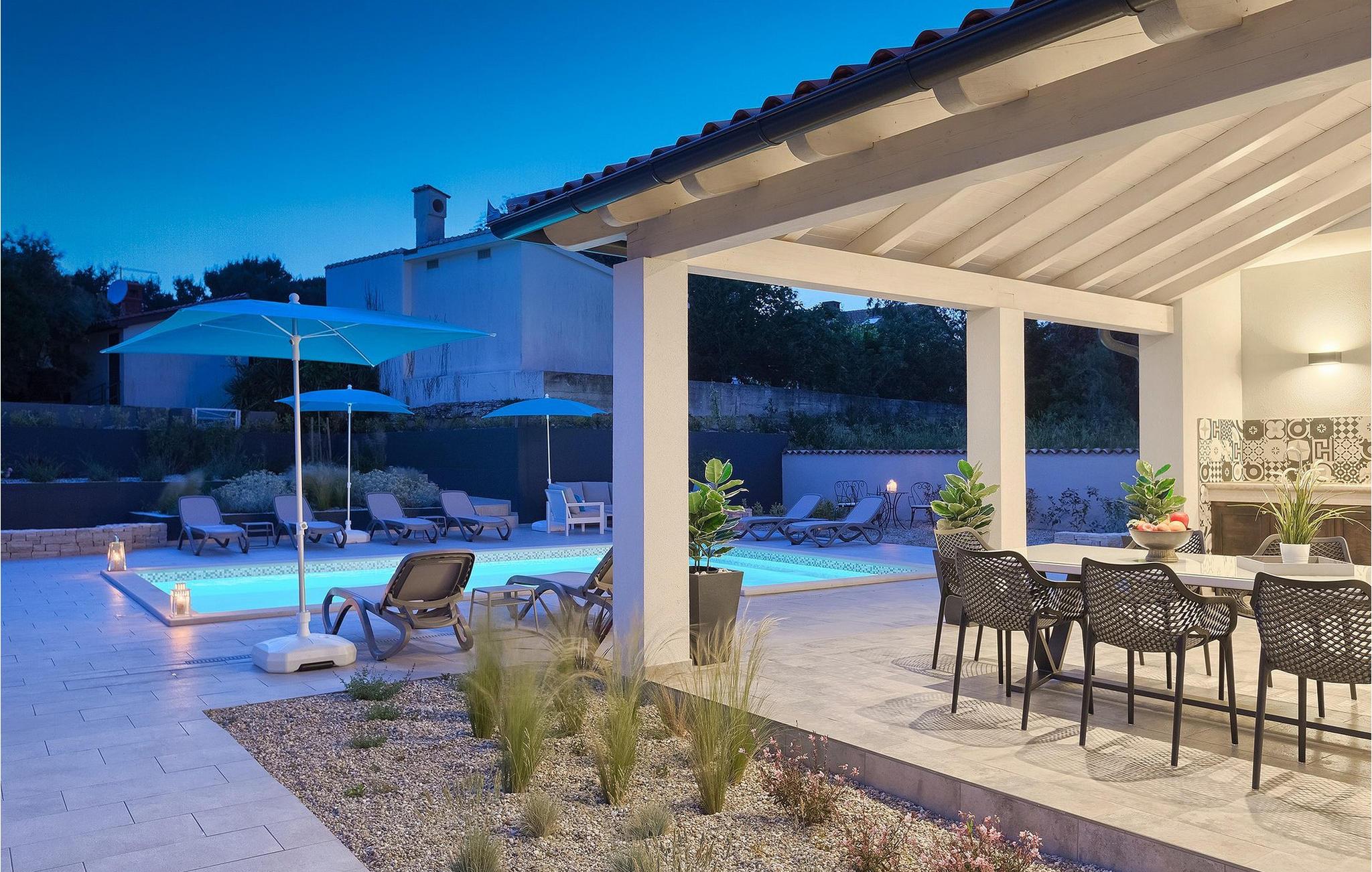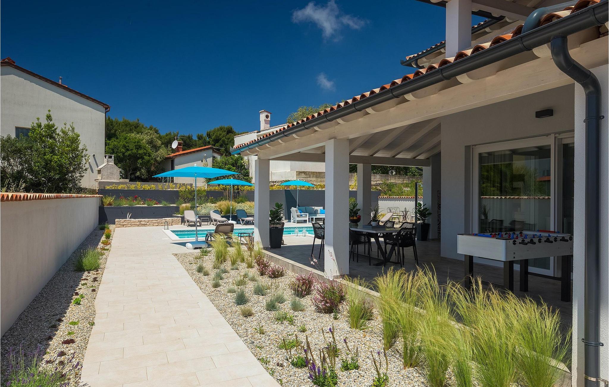 Uteområdet til Villa Dream House er ikke mindre attraktivt. Fra stuen og spisestuen er det glassdører ut til den overbygde terrassen med spisebord, kullgrill og bordfotball. Hva ville vel et drømmehus være uten et privat basseng? Forfrisk deg i det kjølige vannet eller slapp av på solsengene og nyt Istrias sol.