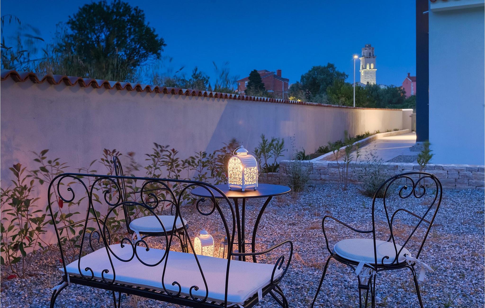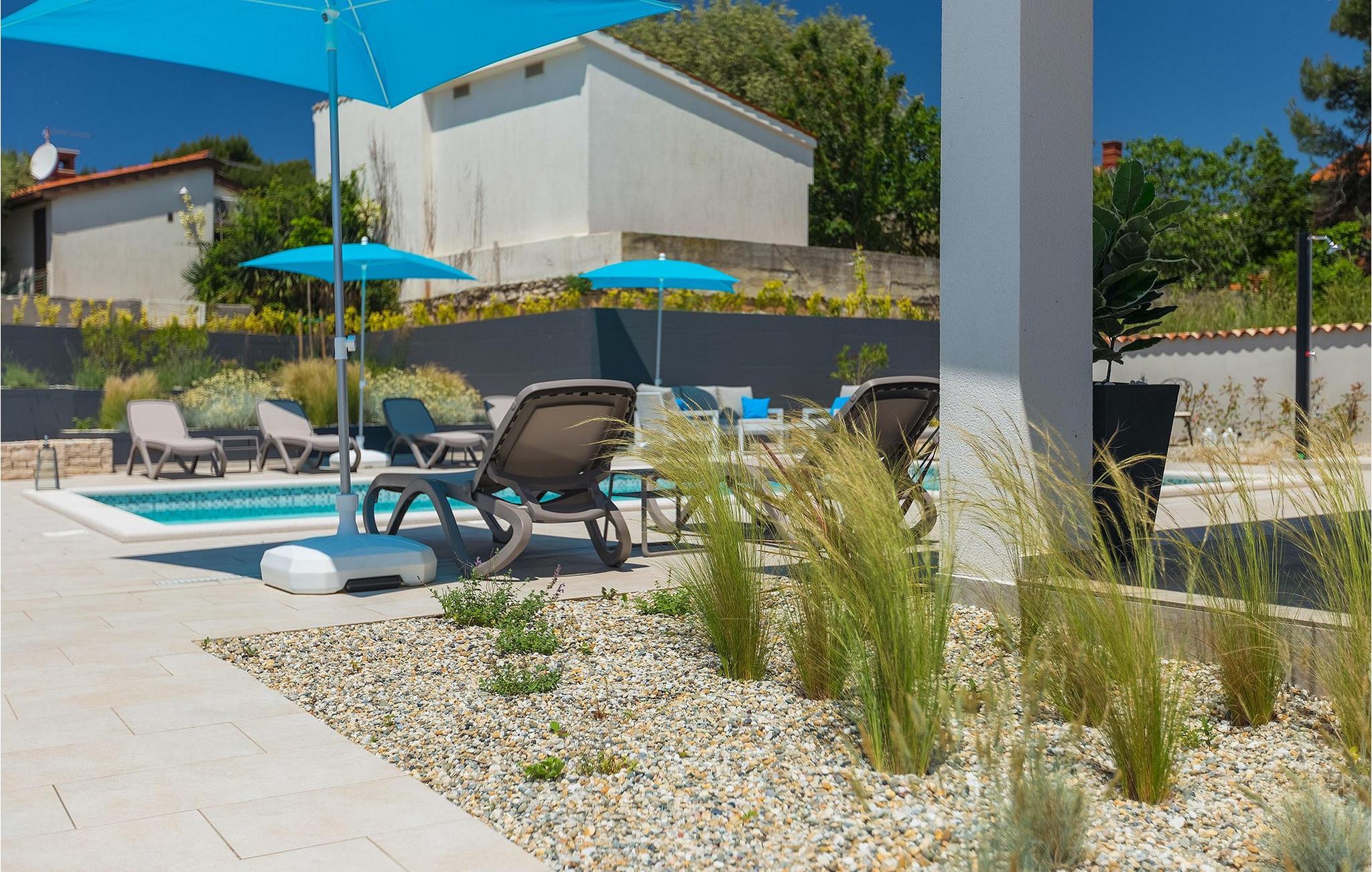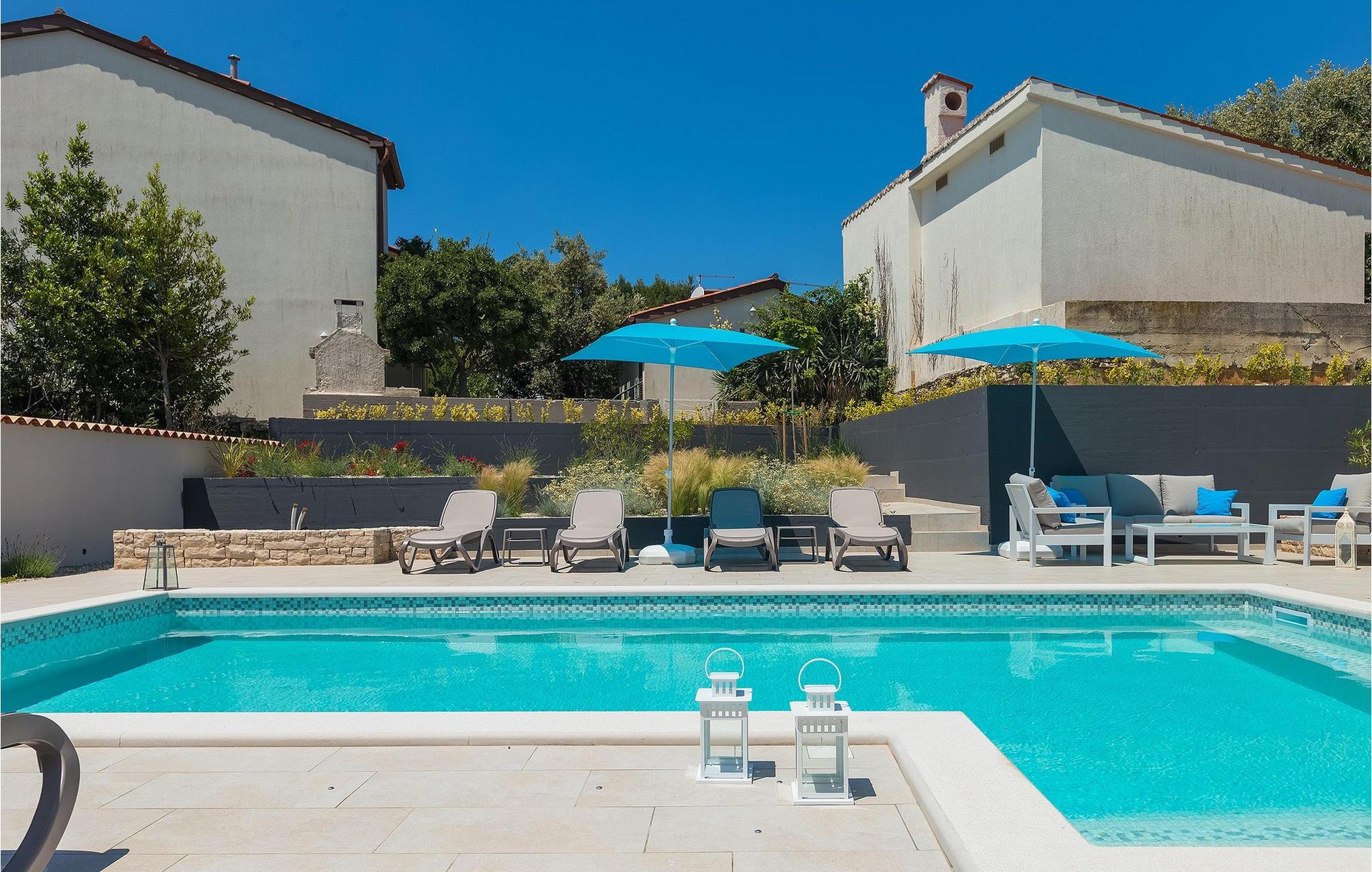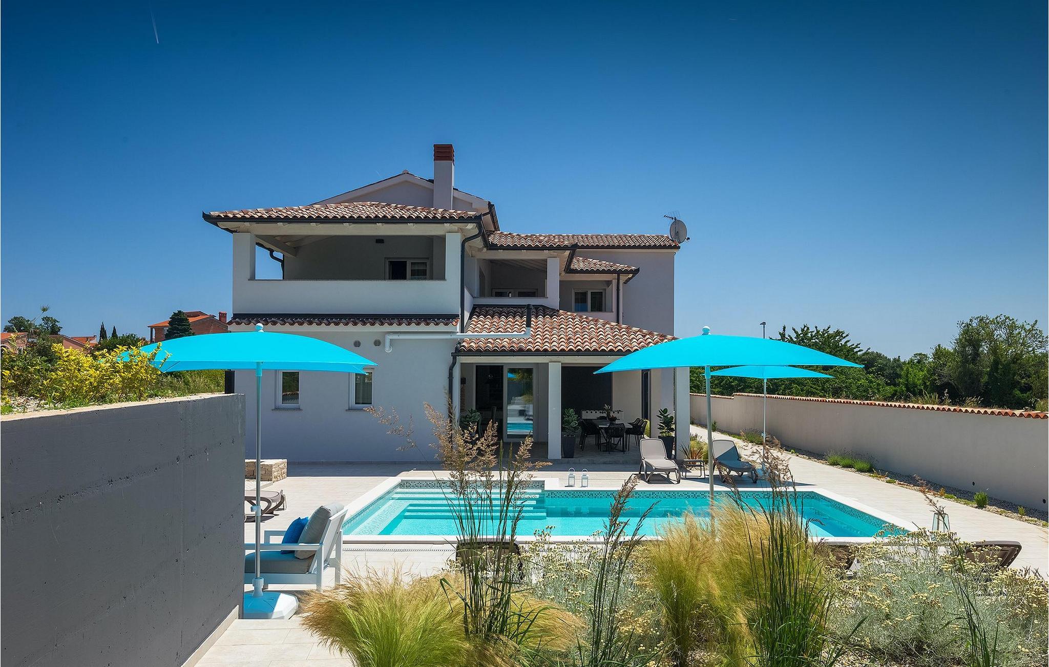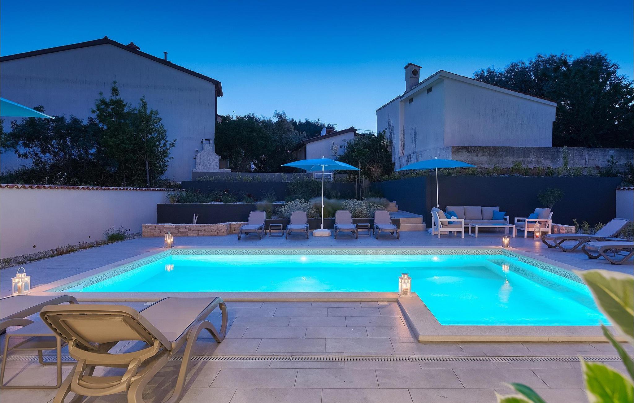 Uteområdet til Villa Dream House er ikke mindre attraktivt. Fra stuen og spisestuen er det glassdører ut til den overbygde terrassen med spisebord, kullgrill og bordfotball. Hva ville vel et drømmehus være uten et privat basseng? Forfrisk deg i det kjølige vannet eller slapp av på solsengene og nyt Istrias sol.