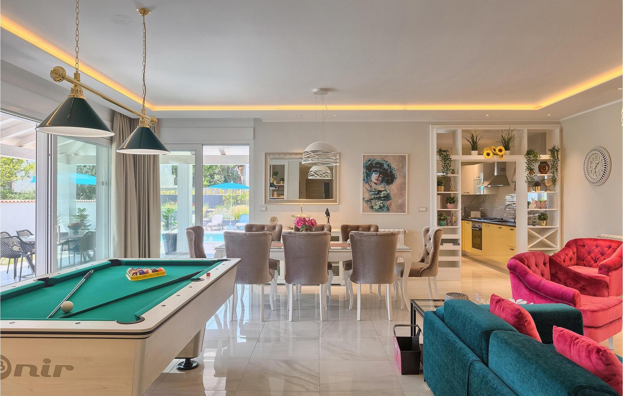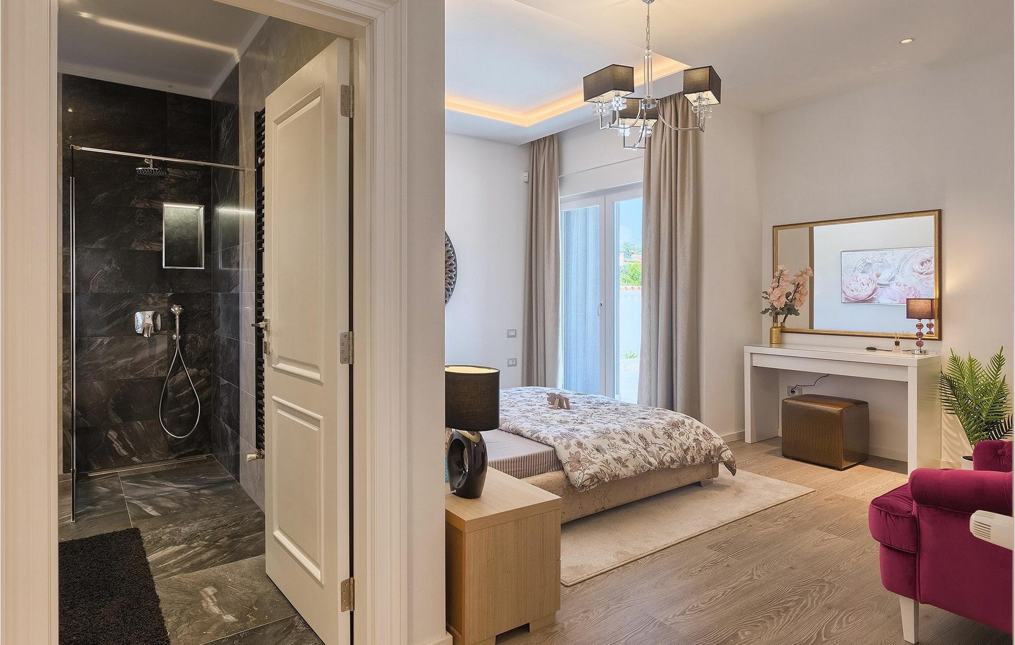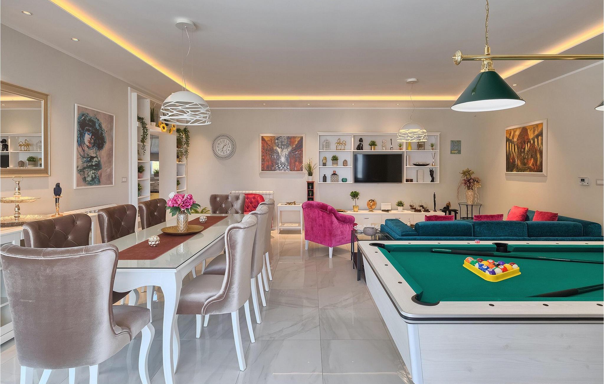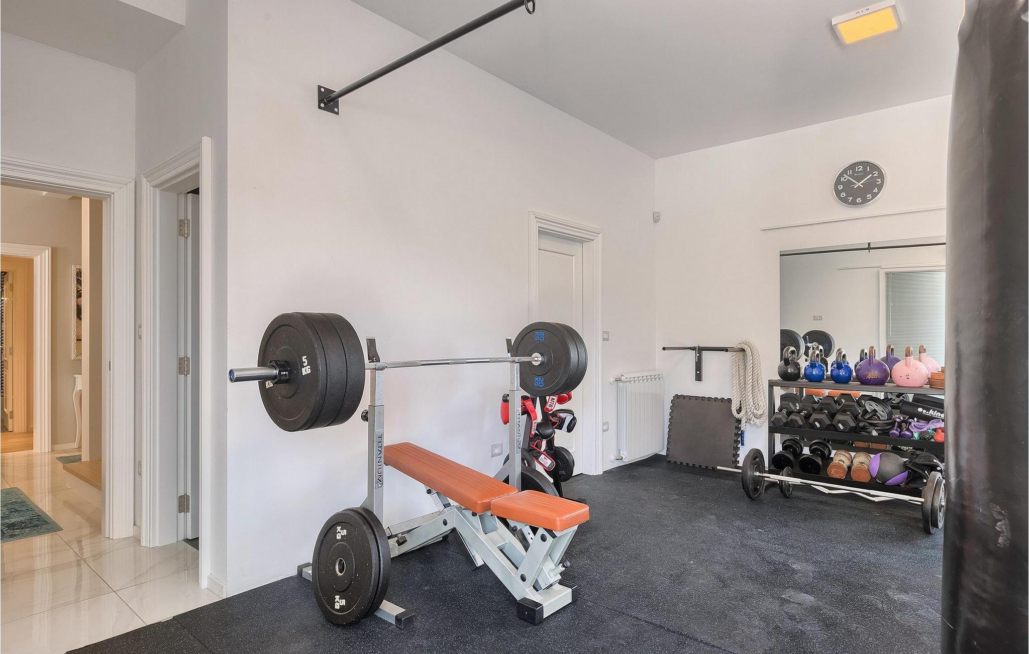 Villaens stilfulle sentrum ligger i første etasje. Stuen og spisestuen med kjøkken er ideell for sosialt samvær. Ta et slag biljard eller slapp av i den koselige, blågrønne sofaen og nyt den gode atmosfæren i dette rommet. Foretrekker du å være aktiv og vil ikke gå glipp av sport i løpet av ferien? Villa Dream House har et treningsrom med vekter, pressbenk og boksesekk. Det er også et bad der du kan friske deg opp etter en energigivende treningsøkt. I første etasje finner du et komfortabelt soverom med flatskjerm-TV og eget bad. I andre etasje finner du ytterligere tre soverom som er designet med sans for detaljer, alle med en komfortabel dobbeltseng, flatskjerm-TV, eget bad og utgang til balkongen, der du kan hilse dagen velkommen med en kopp kaffe.
