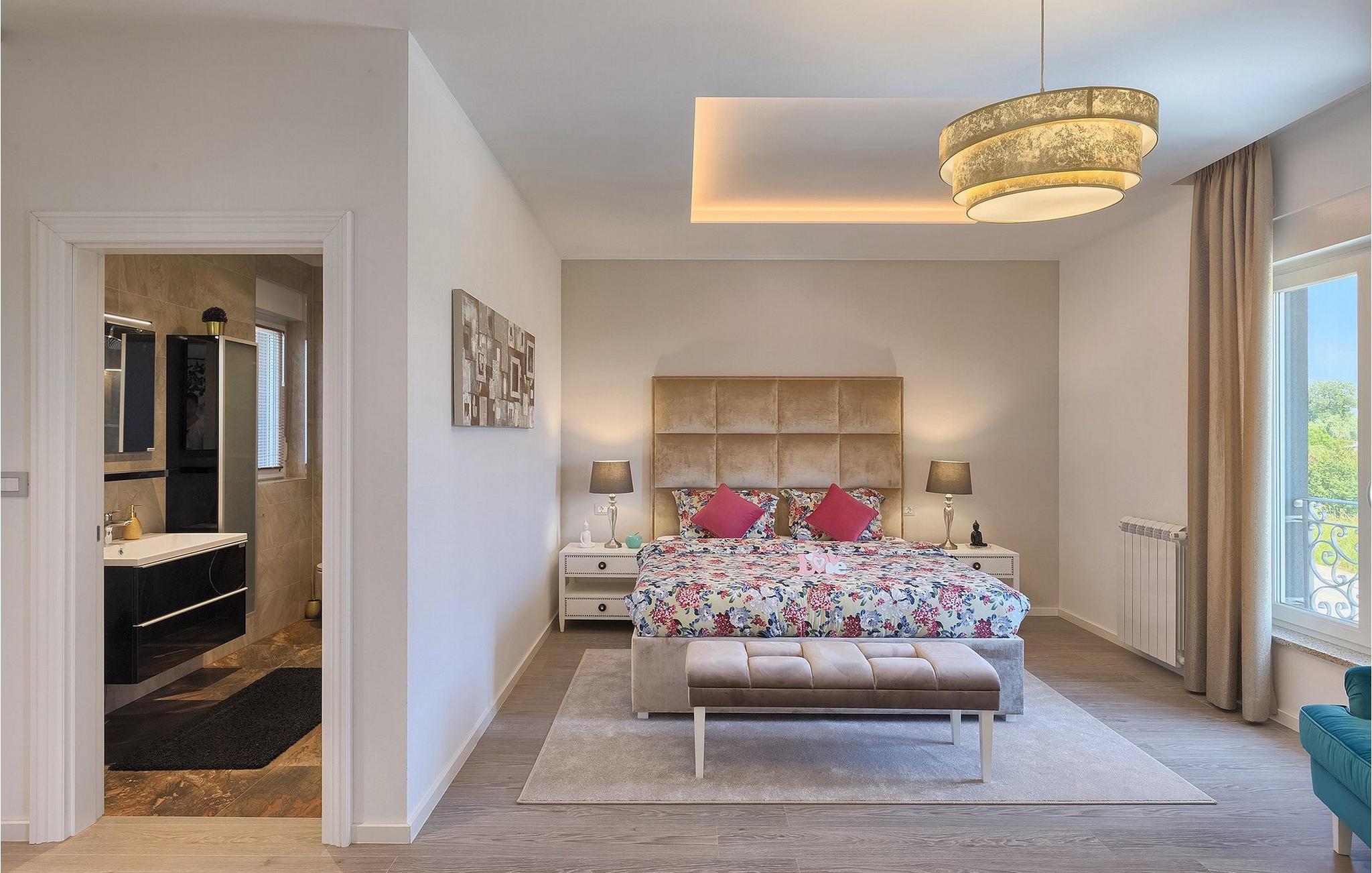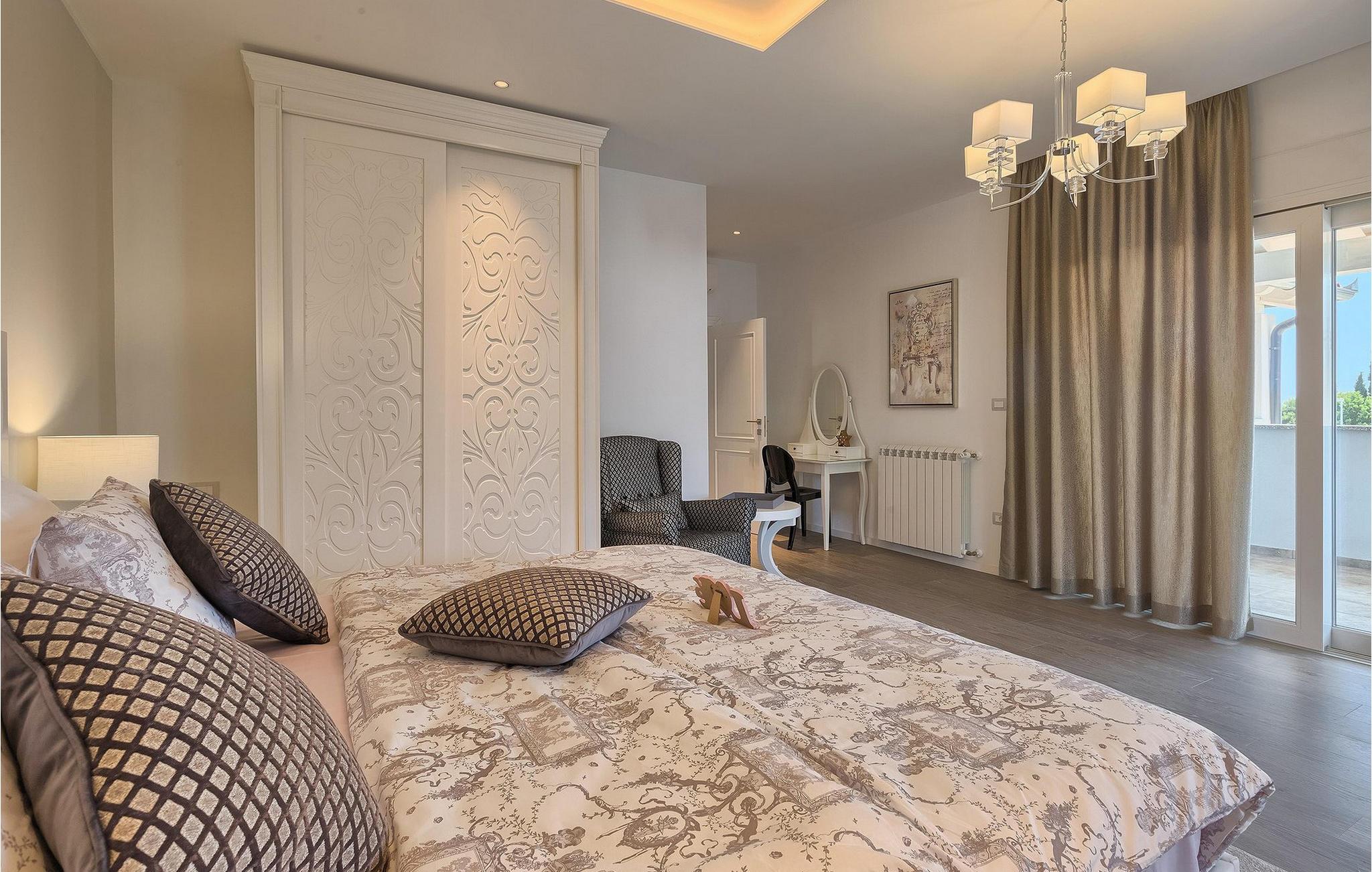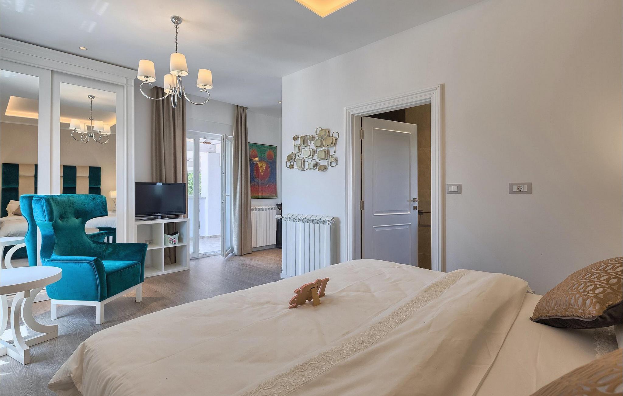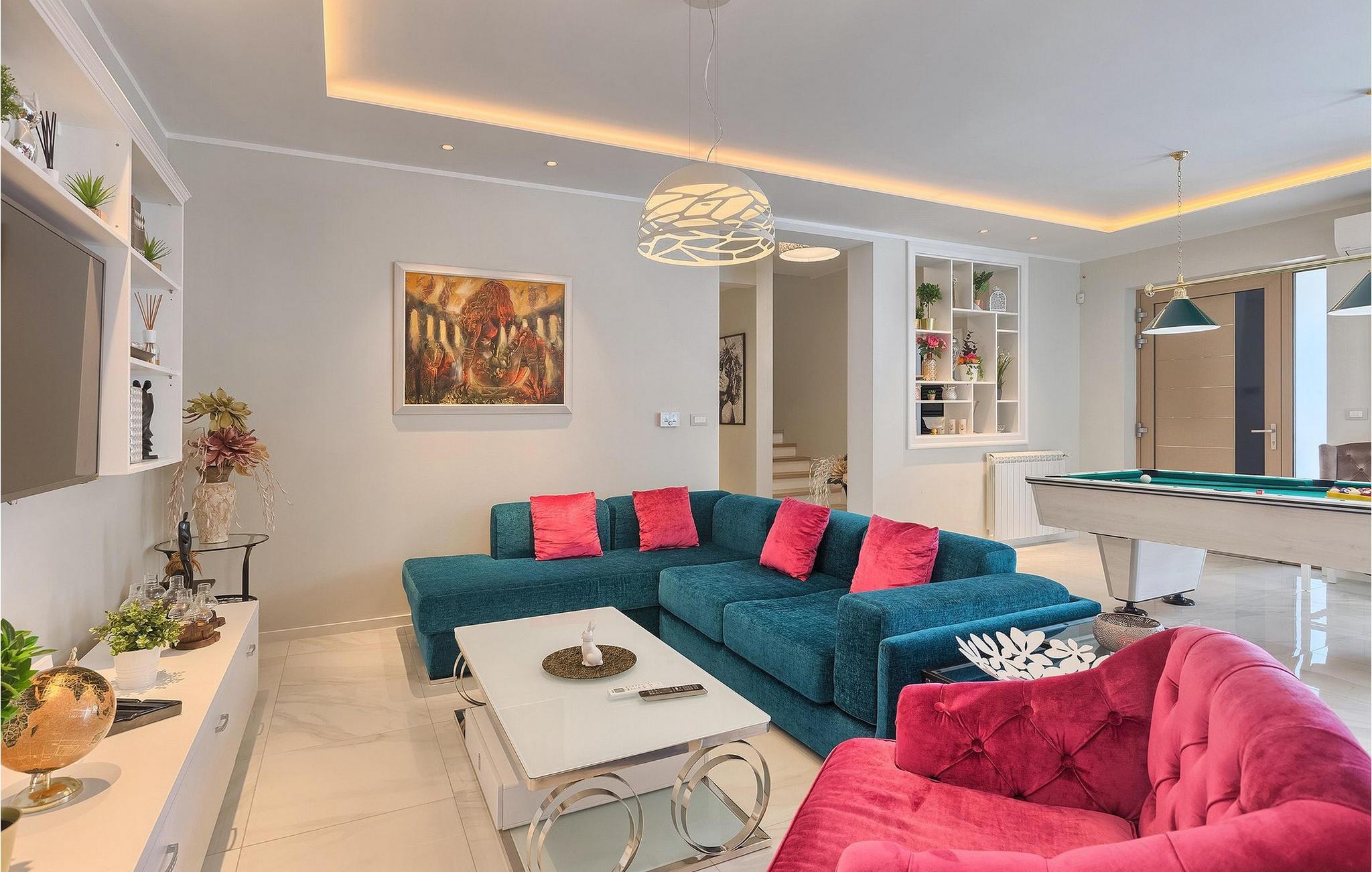 Villaens stilfulle sentrum ligger i første etasje. Stuen og spisestuen med kjøkken er ideell for sosialt samvær. Ta et slag biljard eller slapp av i den koselige, blågrønne sofaen og nyt den gode atmosfæren i dette rommet. Foretrekker du å være aktiv og vil ikke gå glipp av sport i løpet av ferien? Villa Dream House har et treningsrom med vekter, pressbenk og boksesekk. Det er også et bad der du kan friske deg opp etter en energigivende treningsøkt. I første etasje finner du et komfortabelt soverom med flatskjerm-TV og eget bad. I andre etasje finner du ytterligere tre soverom som er designet med sans for detaljer, alle med en komfortabel dobbeltseng, flatskjerm-TV, eget bad og utgang til balkongen, der du kan hilse dagen velkommen med en kopp kaffe.