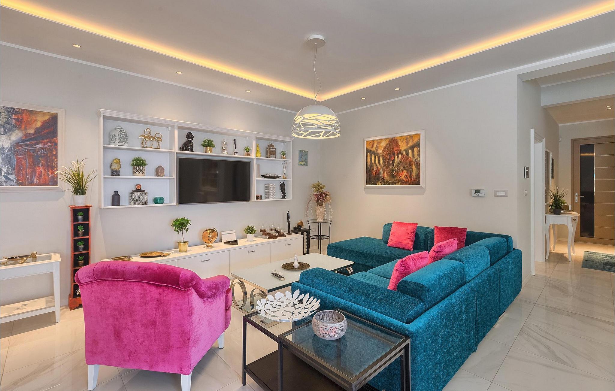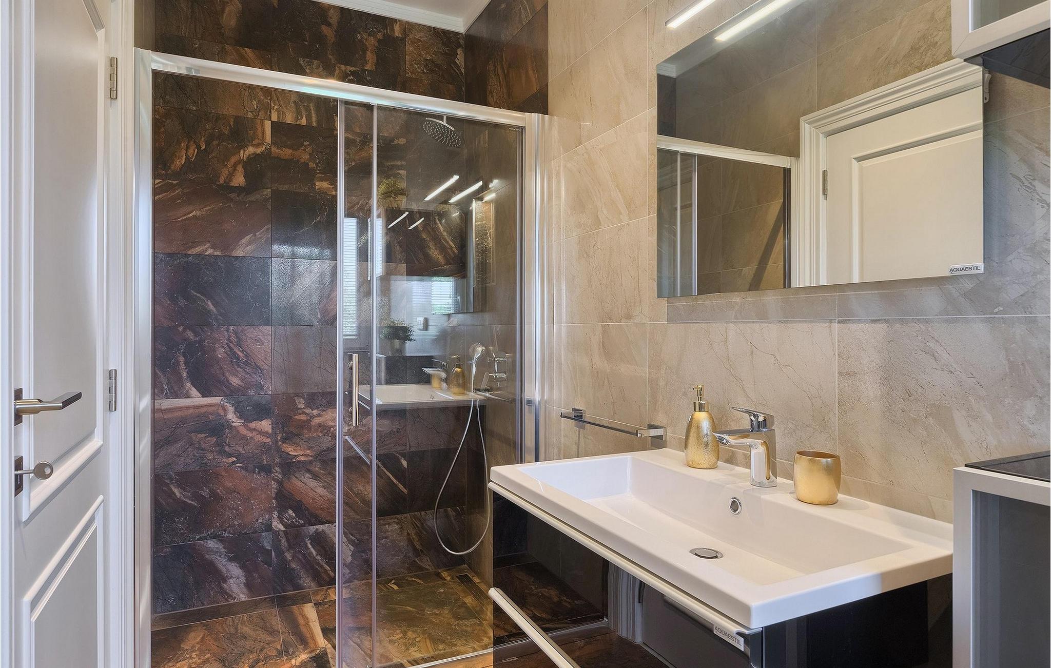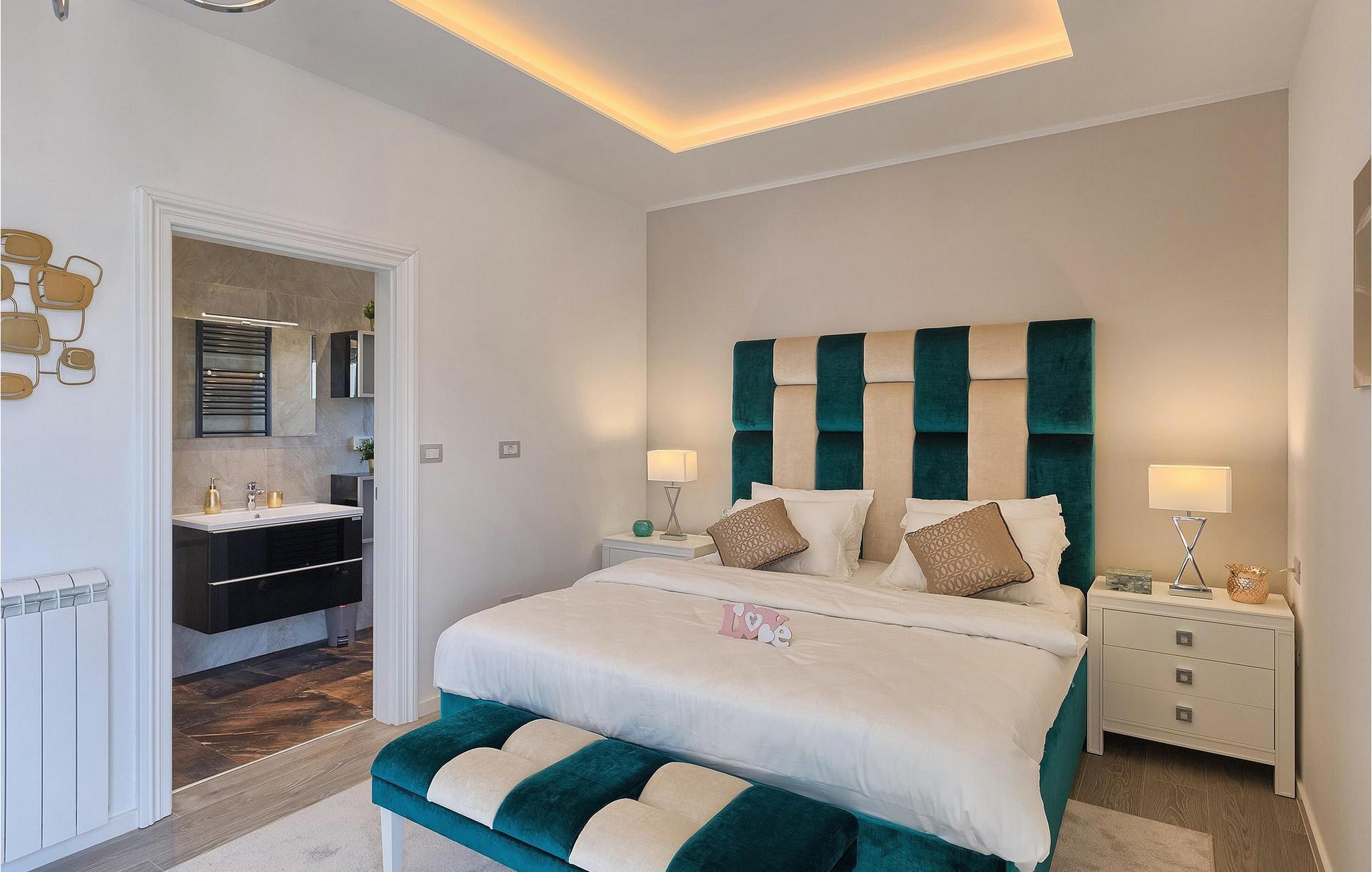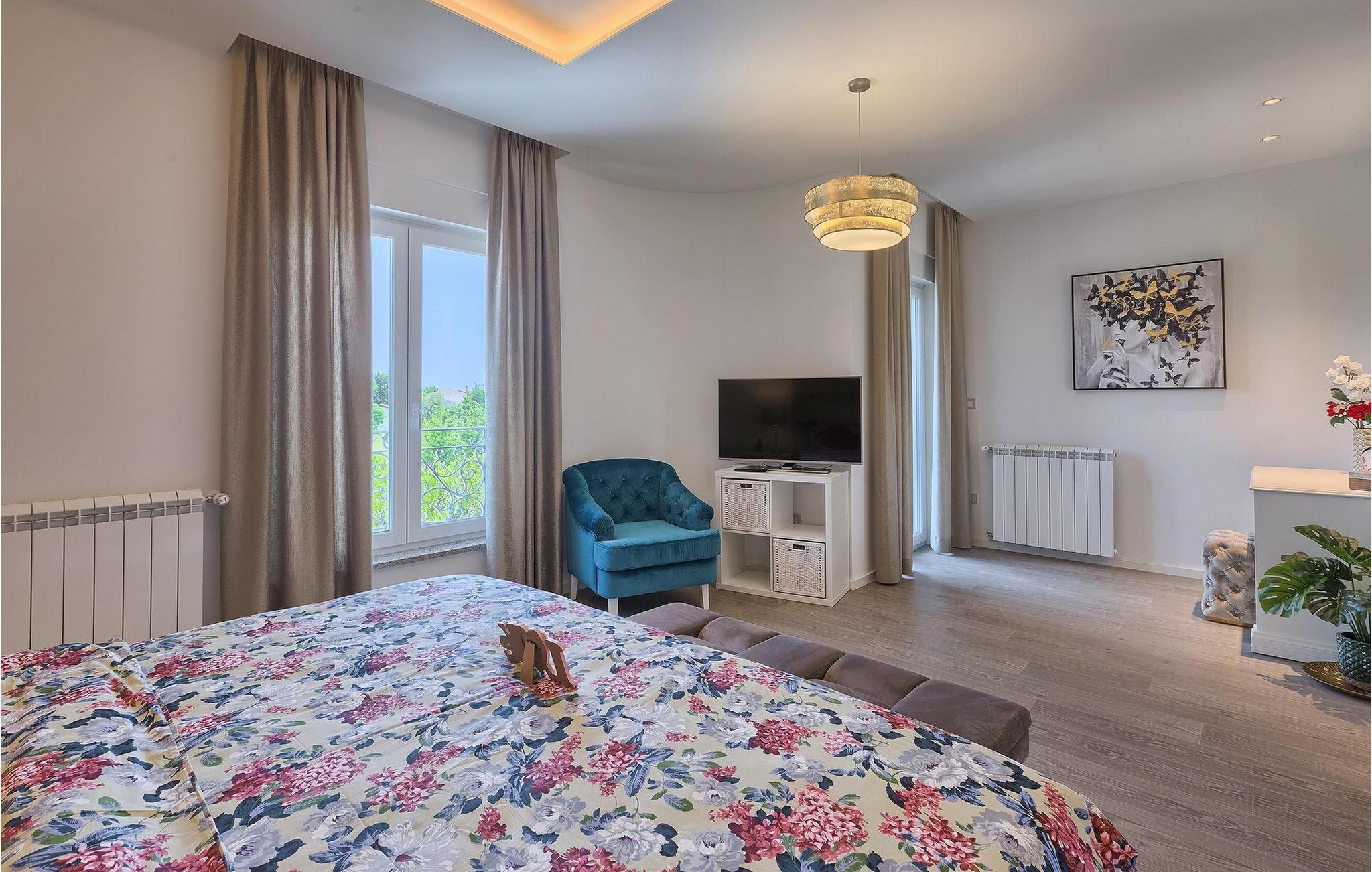 Villaens stilfulle sentrum ligger i første etasje. Stuen og spisestuen med kjøkken er ideell for sosialt samvær. Ta et slag biljard eller slapp av i den koselige, blågrønne sofaen og nyt den gode atmosfæren i dette rommet. Foretrekker du å være aktiv og vil ikke gå glipp av sport i løpet av ferien? Villa Dream House har et treningsrom med vekter, pressbenk og boksesekk. Det er også et bad der du kan friske deg opp etter en energigivende treningsøkt. I første etasje finner du et komfortabelt soverom med flatskjerm-TV og eget bad. I andre etasje finner du ytterligere tre soverom som er designet med sans for detaljer, alle med en komfortabel dobbeltseng, flatskjerm-TV, eget bad og utgang til balkongen, der du kan hilse dagen velkommen med en kopp kaffe.