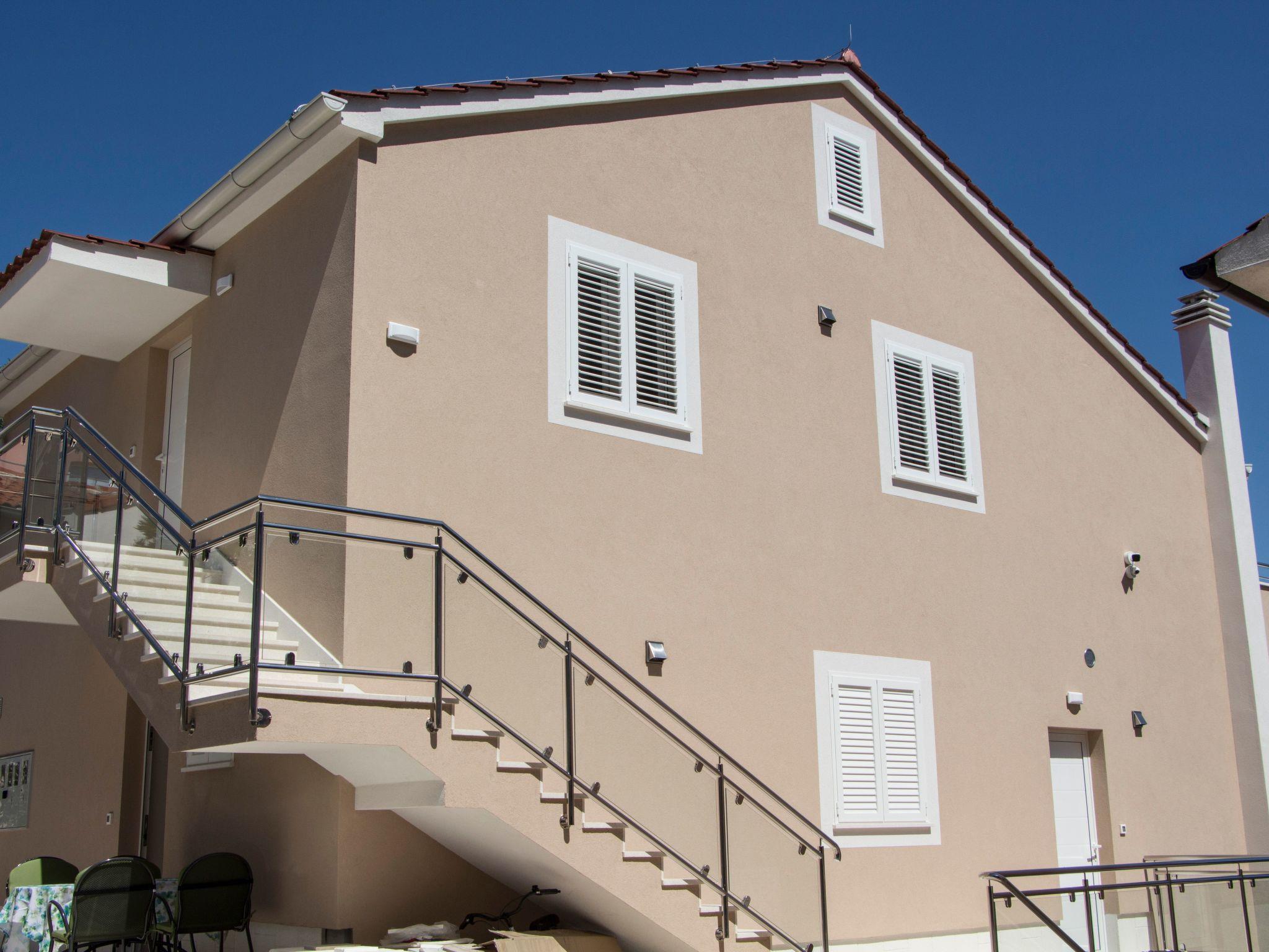 Step outside to discover an array of outdoor features designed for leisure and relaxation. The apartment's balcony presents a wonderful spot to enjoy the sea's serene views with your morning coffee or an evening drink. For a more immersive experience, the rooftop terrace offers exclusive access to an expansive area, perfect for sunbathing or enjoying a romantic dinner under the stars. Additionally, the communal pool beckons for a refreshing dip, set against the backdrop of Primošten's picturesque bay.