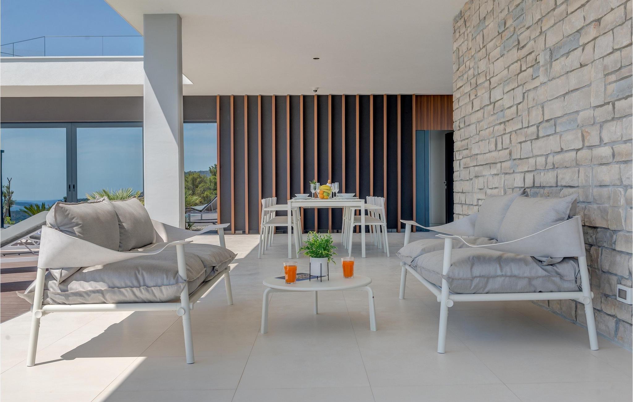 Fra stuen, rett ved siden av det store bassenget, finner du en uteservering med fascinerende havutsikt hvor du kan nyte måltidene sammen med familie og venner.