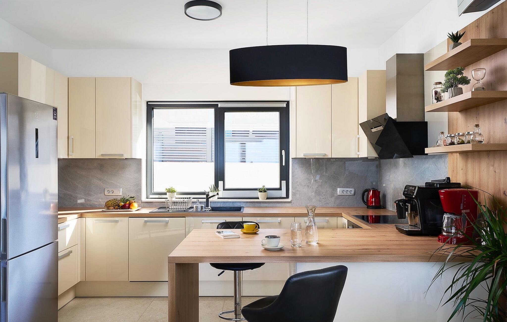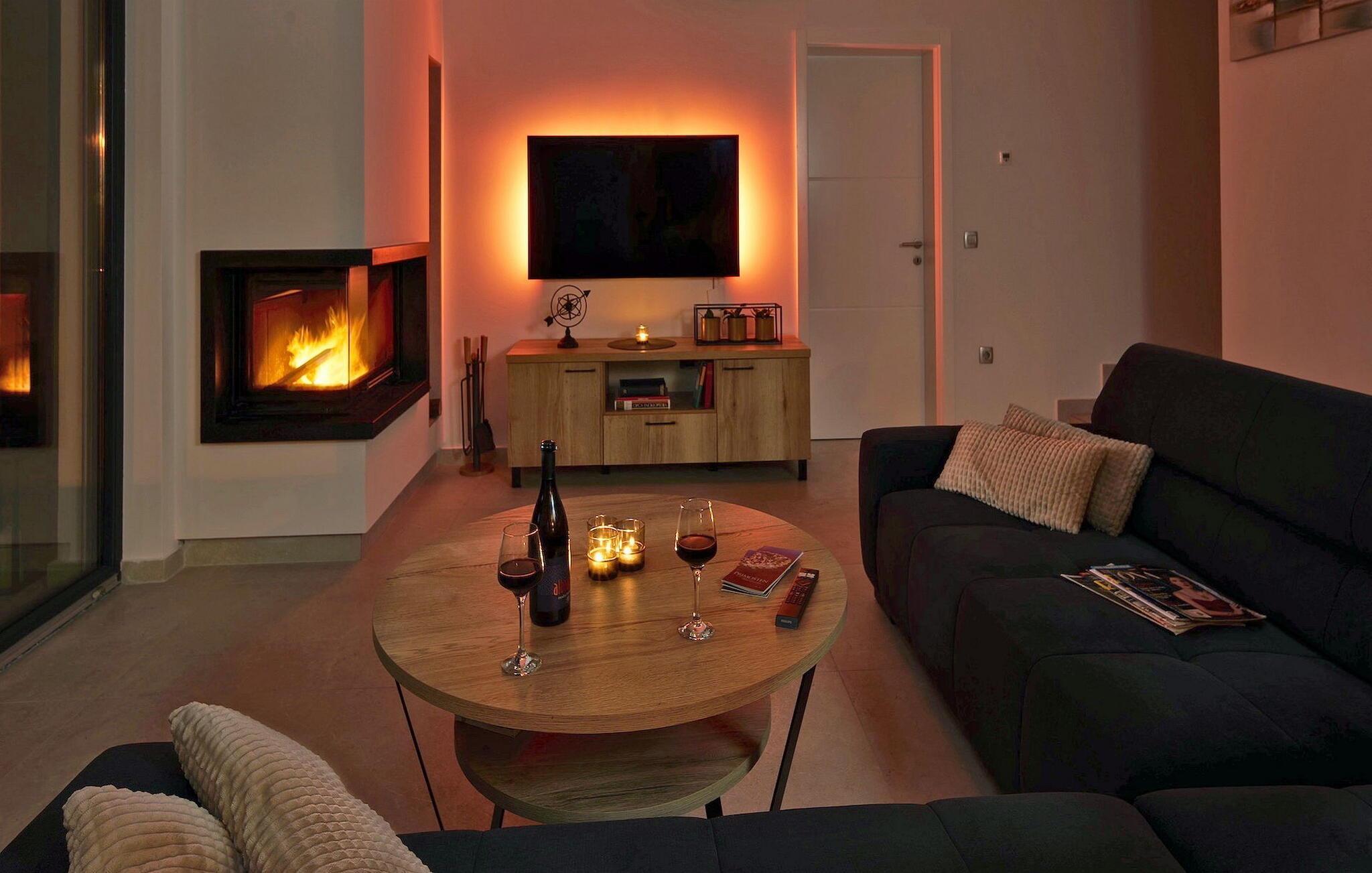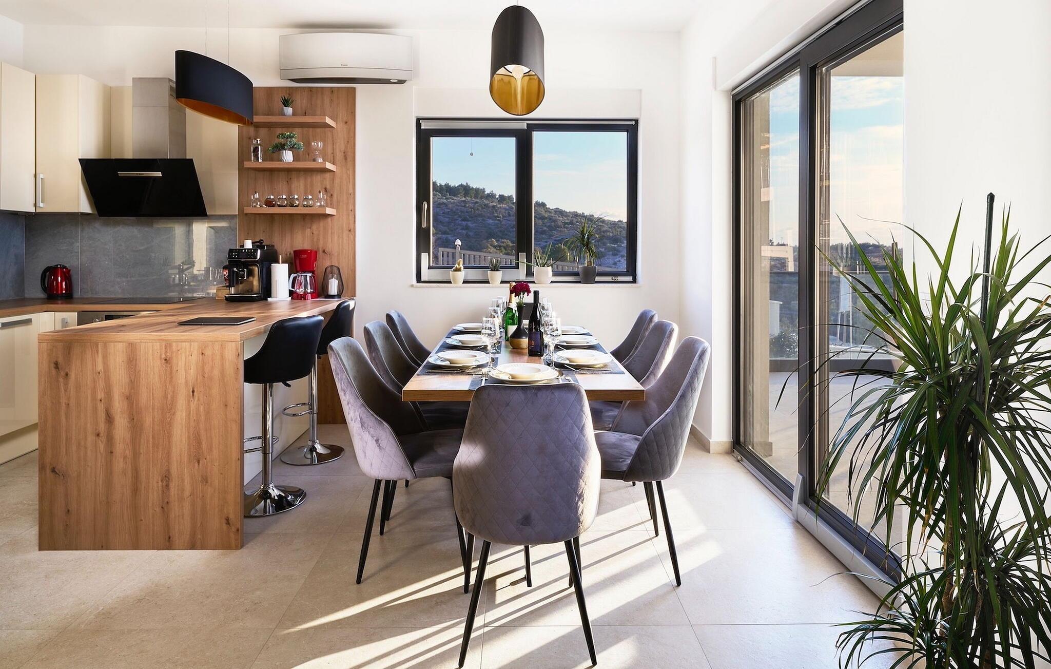 I villaens første etasje finner du en koselig peis og en sofa som vender ut mot glassdøren der du kan se solen gå ned over havet. I samme rom finner du et fullt utstyrt kjøkken med naturlig lys og en annen spisestue for opptil 8 personer.
