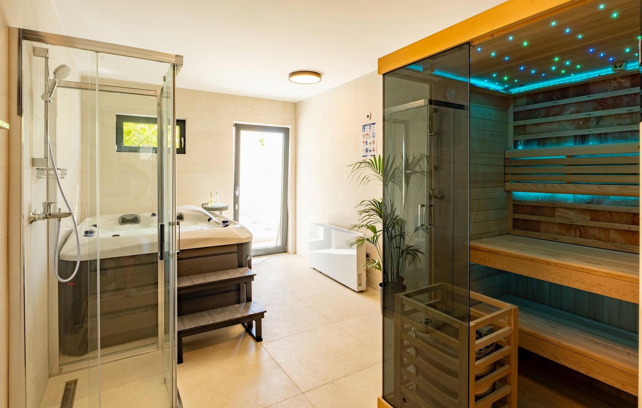Andre fasiliteter du kan forvente deg er en badstue med boblebad, et biljardrom med bar og TV og et privat treningsområde. Ett av de komfortable og elegant innredede dobbeltrommene ligger i første etasje, mens de tre andre ligger i andre etasje. Her finner du en stor balkong hvor du kan nyte morgenkaffen med utsikt over det glitrende havet.