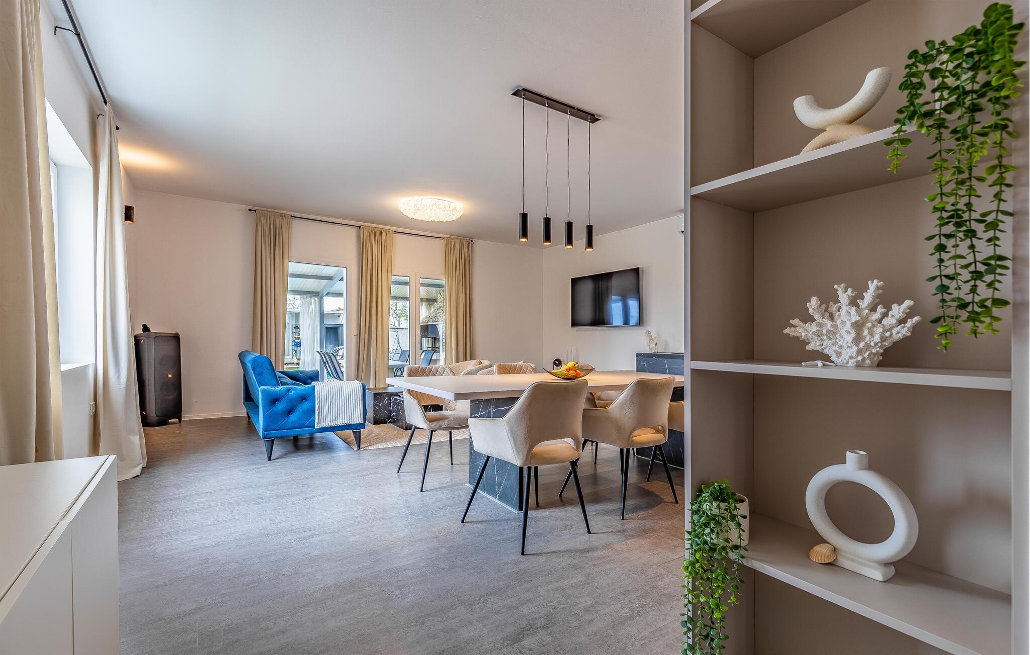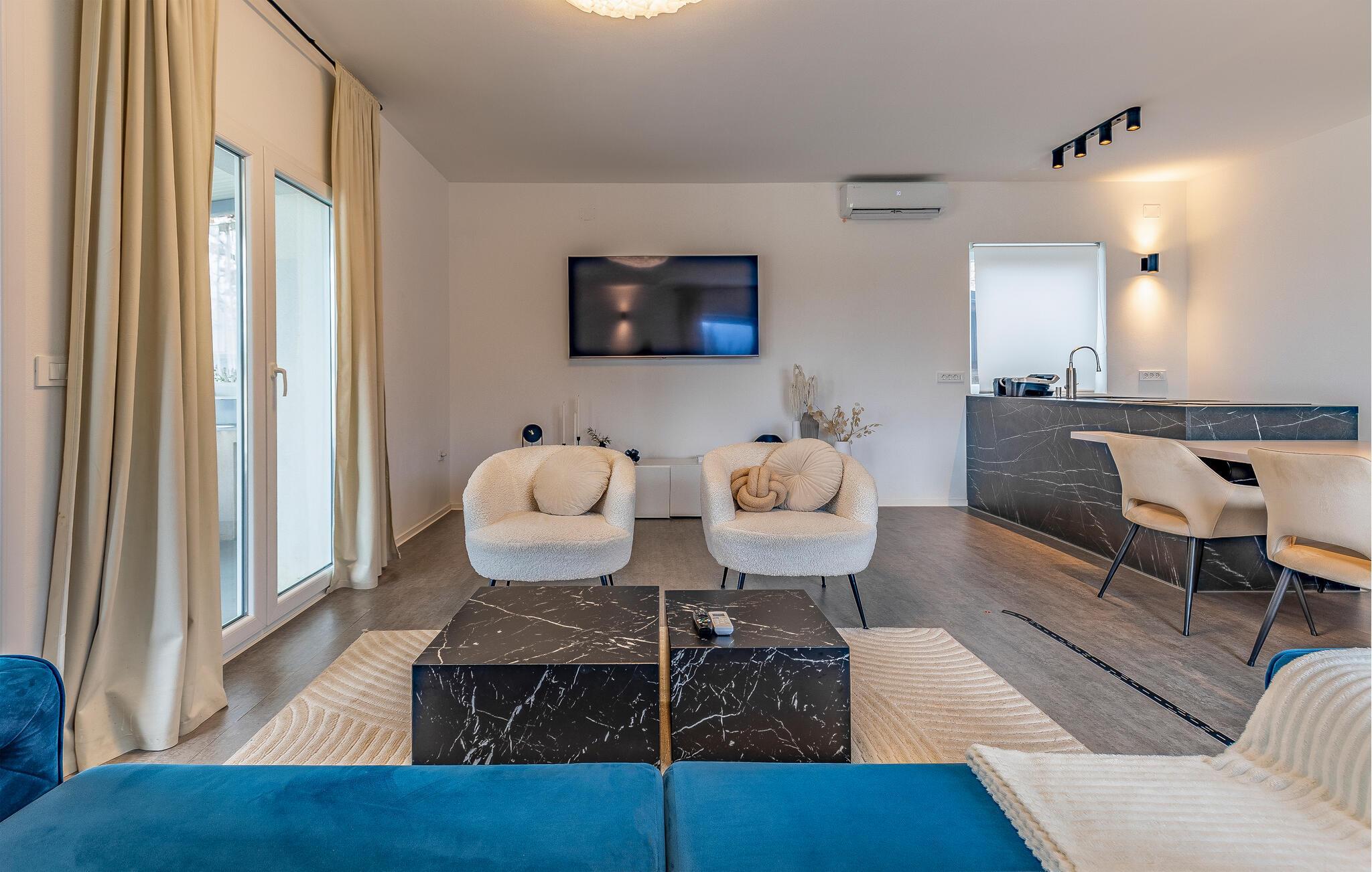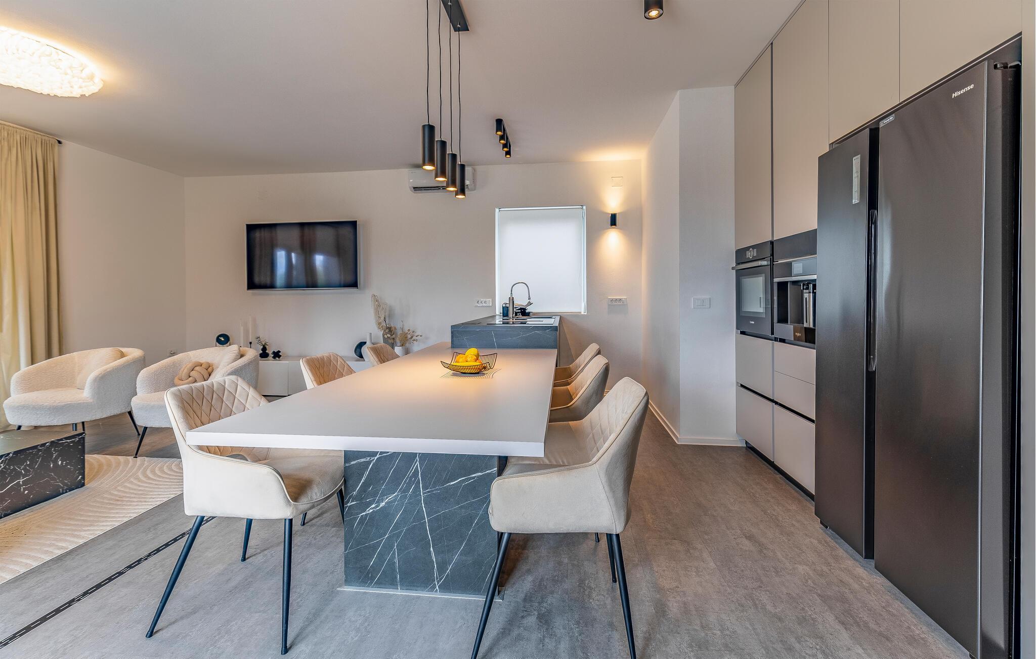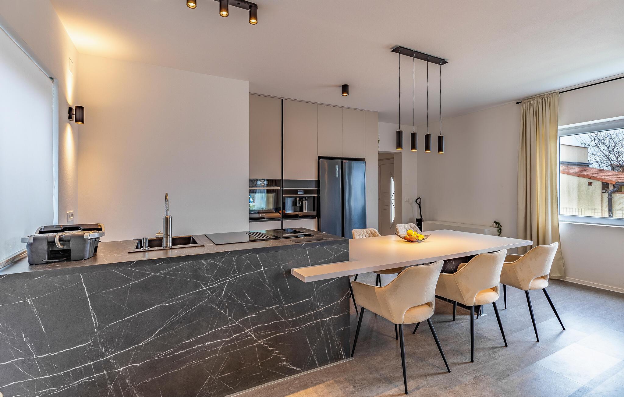 Stig inn og la deg inspirere av den elegante atmosfæren i dette barnevennlige feriehuset. Lag kroatiske spesialiteter på det velutstyrte kjøkkenet og slå deg ned ved det stilfullt opplyste spisebordet. Sett deg godt til rette i sofaen om kvelden, stream en spennende serie eller organiser en spillkveld.