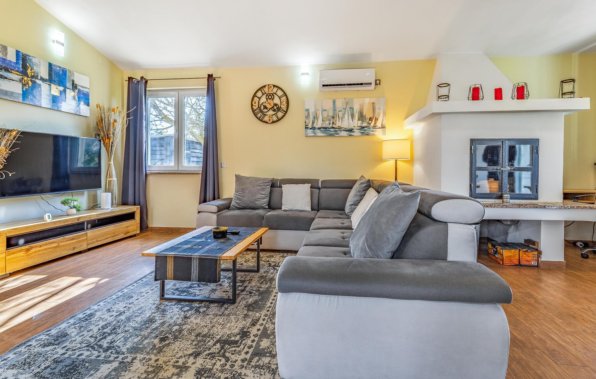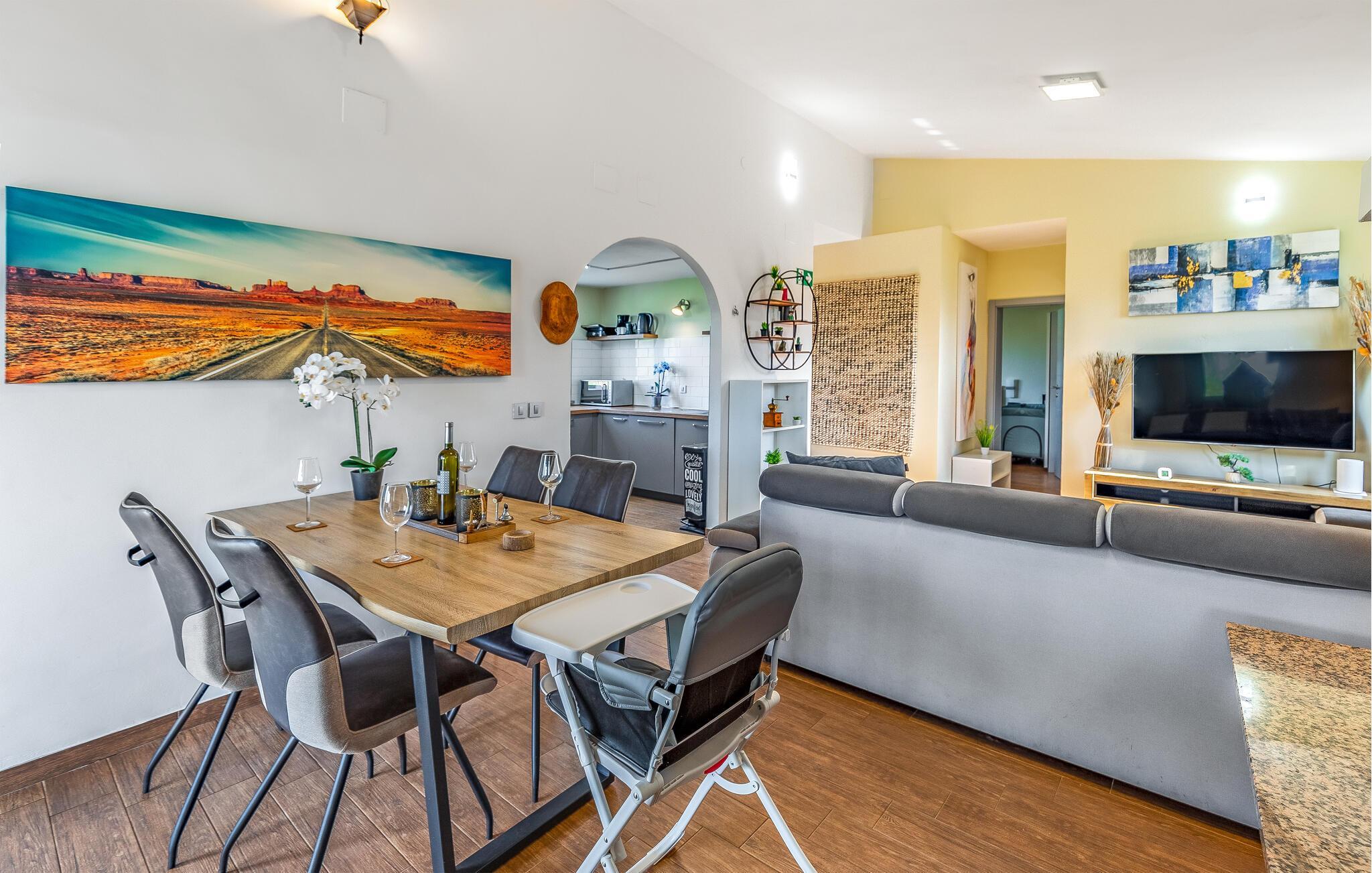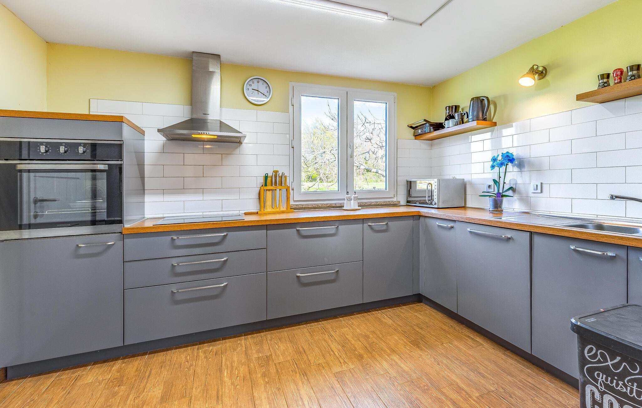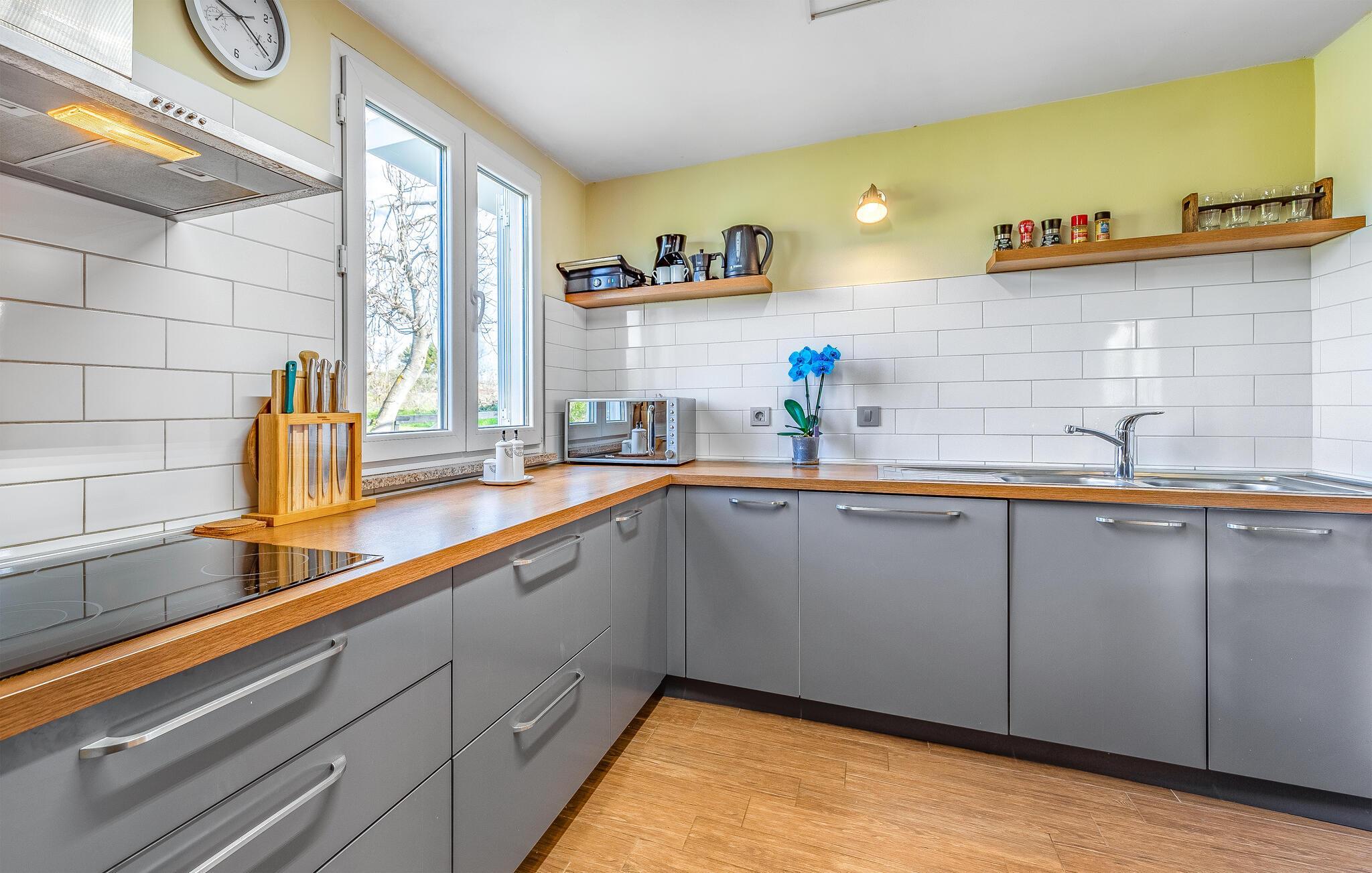Velkommen til dette hyggelige feriehuset, som inviterer deg til en harmonisk ferie i landlige omgivelser og skjemmer deg bort med et moderne og koselig interiør. La deg inspirere av utsikten over de grønne omgivelsene på det romslige kjøkkenet, og gled deg til felles måltider ved det stilfulle spisebordet. Kose deg i den koselige sofaen, streame en film eller nyte en spillkveld med dine nærmeste.