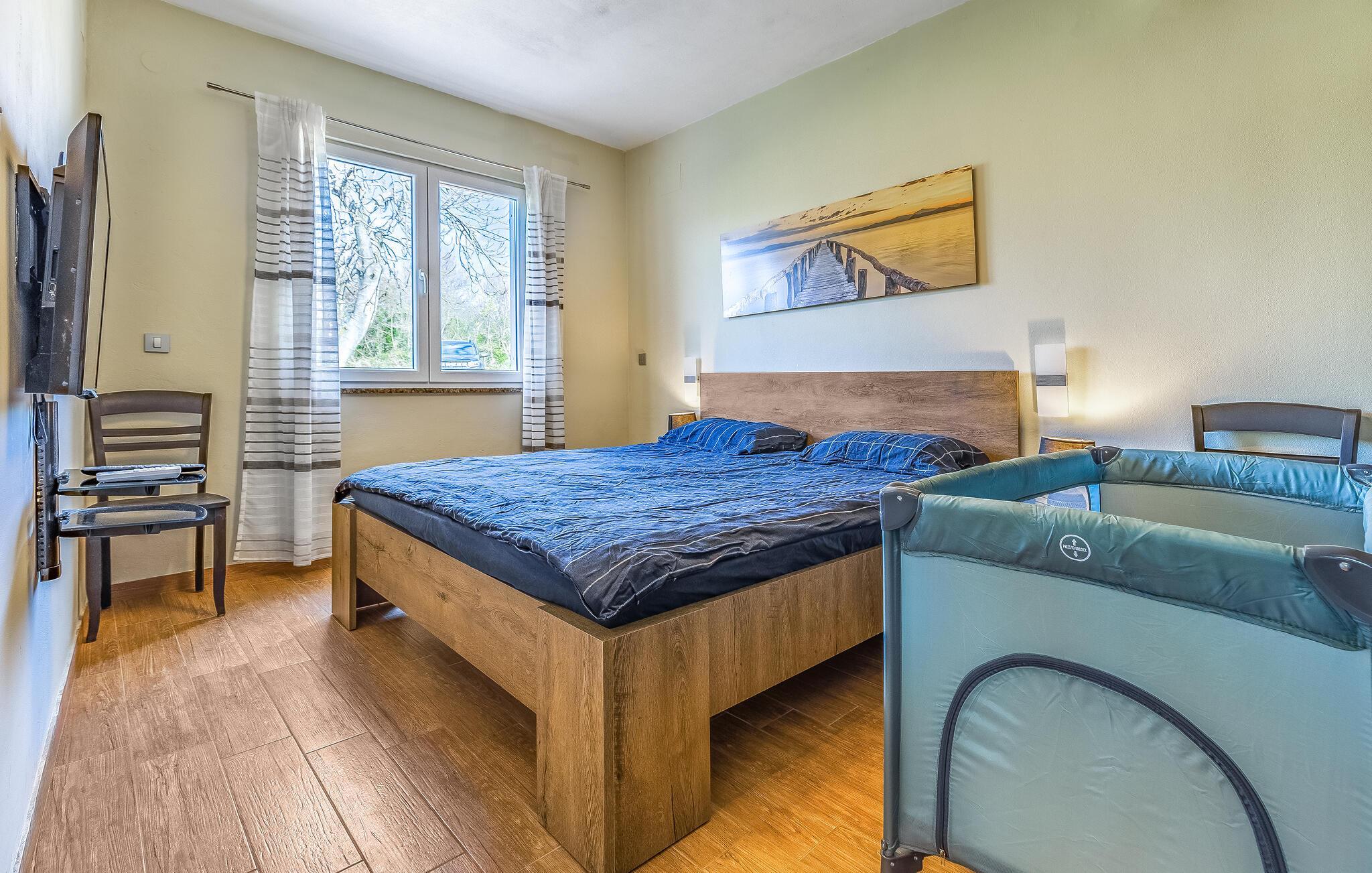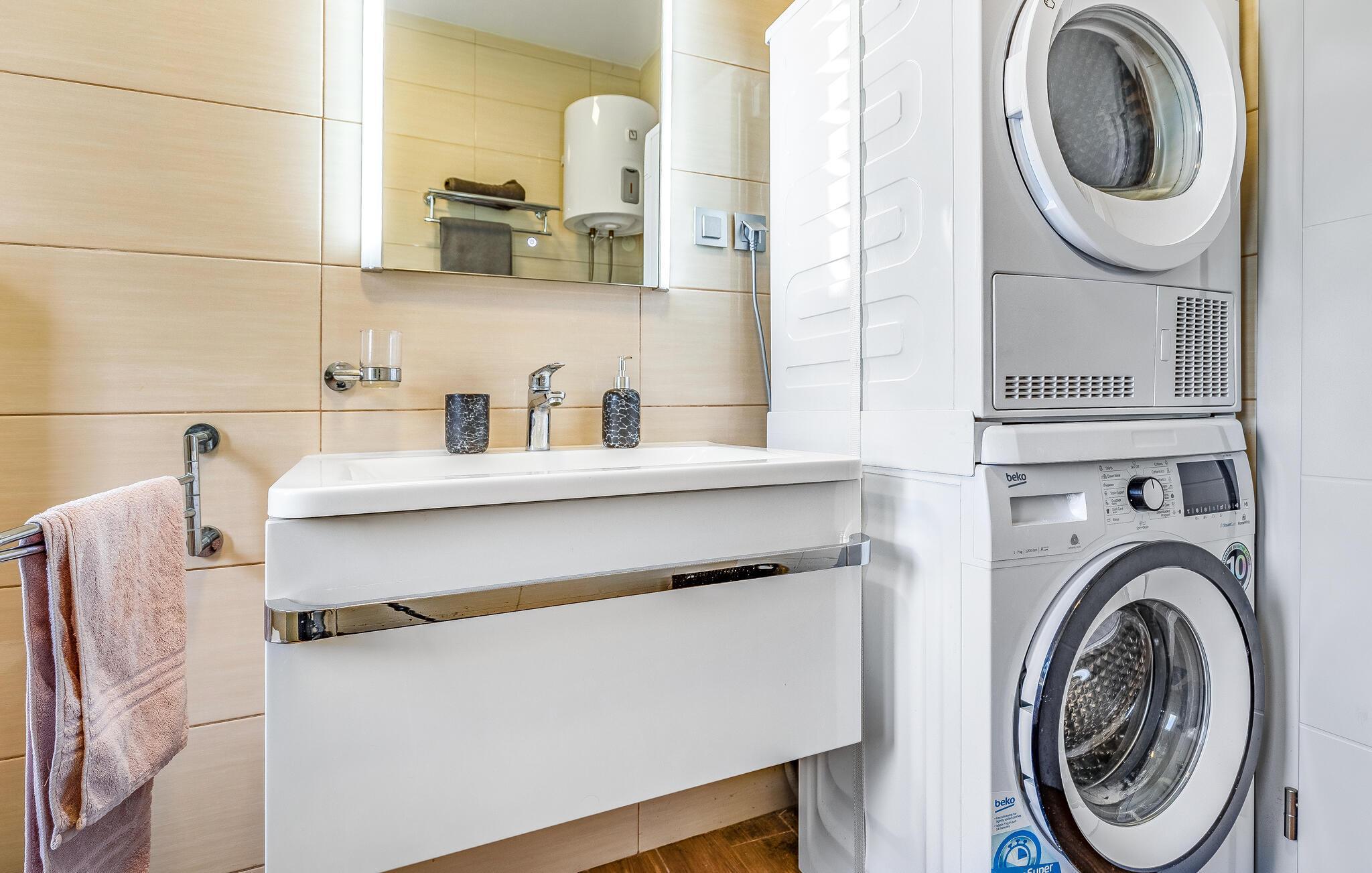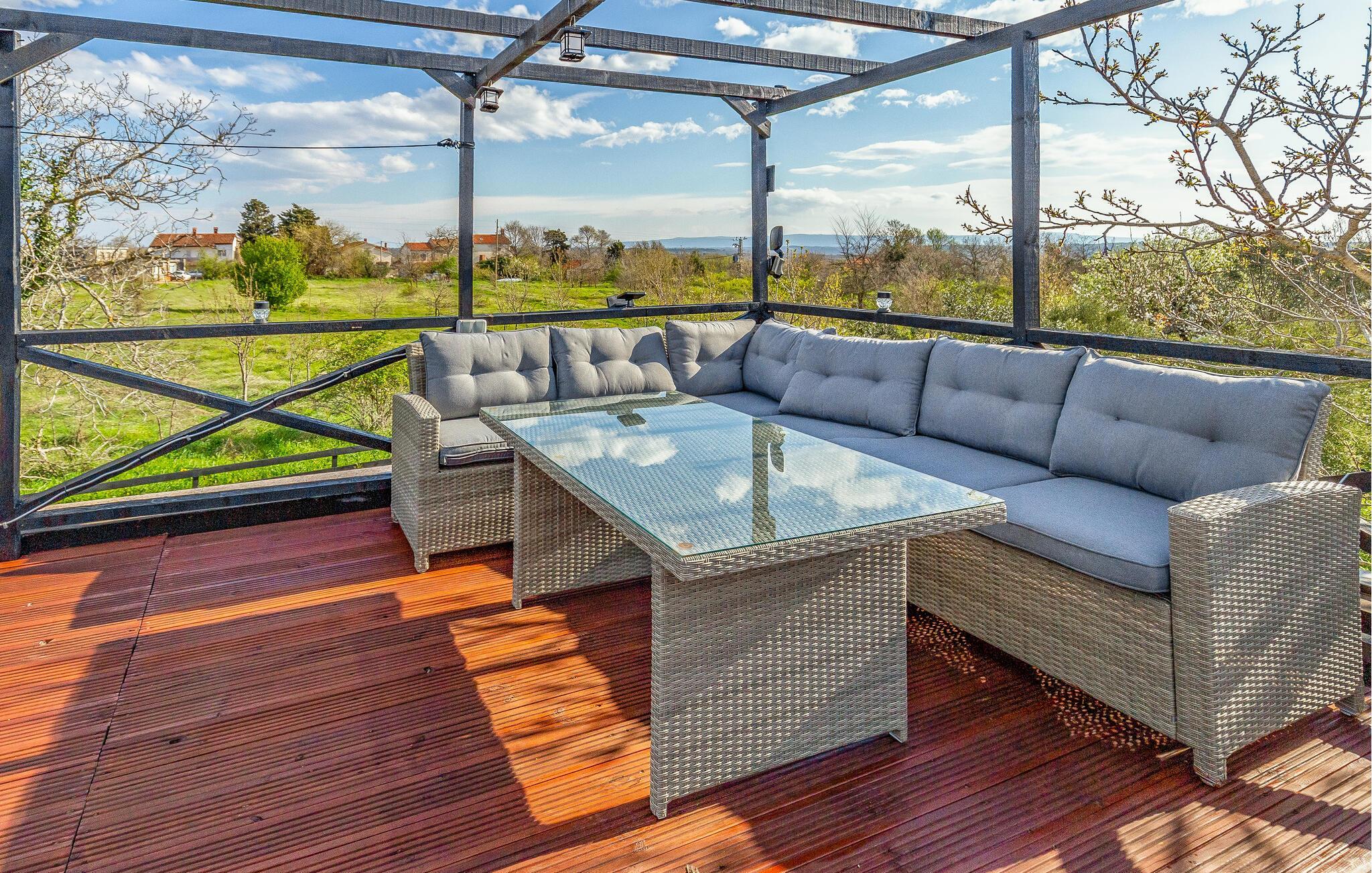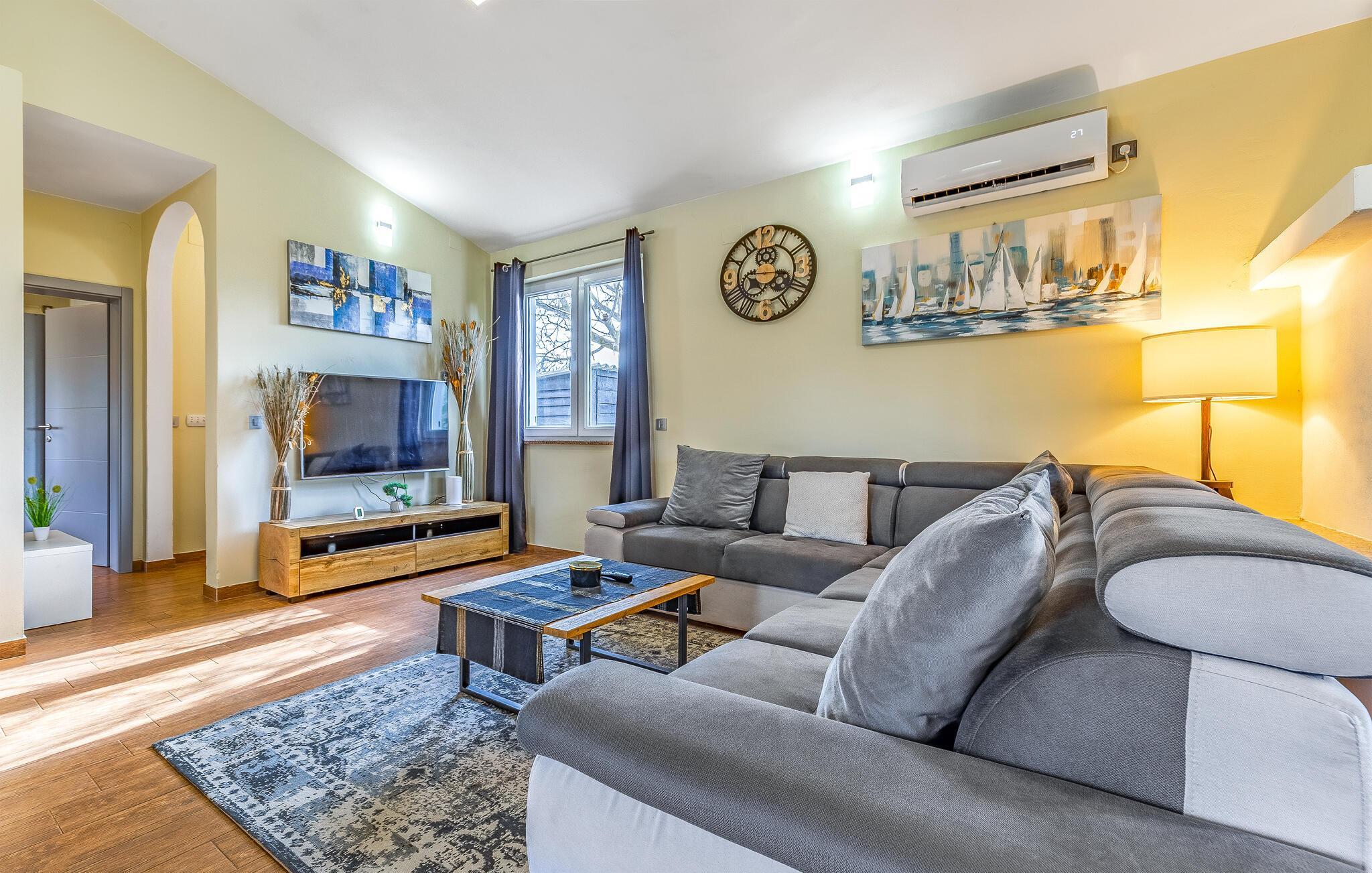 Velkommen til dette hyggelige feriehuset, som inviterer deg til en harmonisk ferie i landlige omgivelser og skjemmer deg bort med et moderne og koselig interiør. La deg inspirere av utsikten over de grønne omgivelsene på det romslige kjøkkenet, og gled deg til felles måltider ved det stilfulle spisebordet. Kose deg i den koselige sofaen, streame en film eller nyte en spillkveld med dine nærmeste.