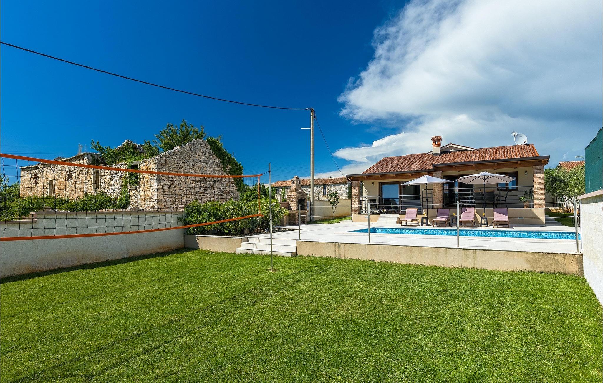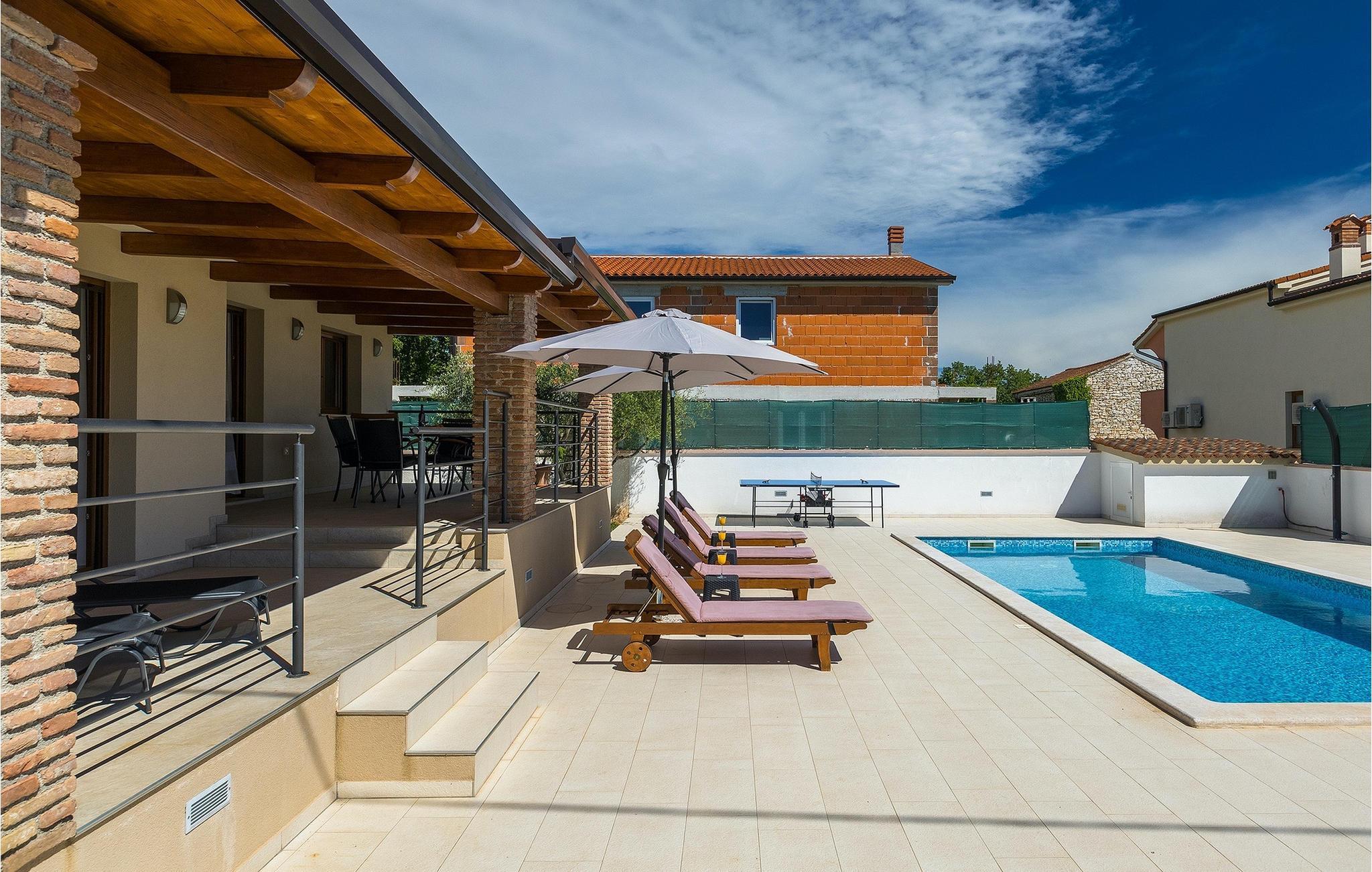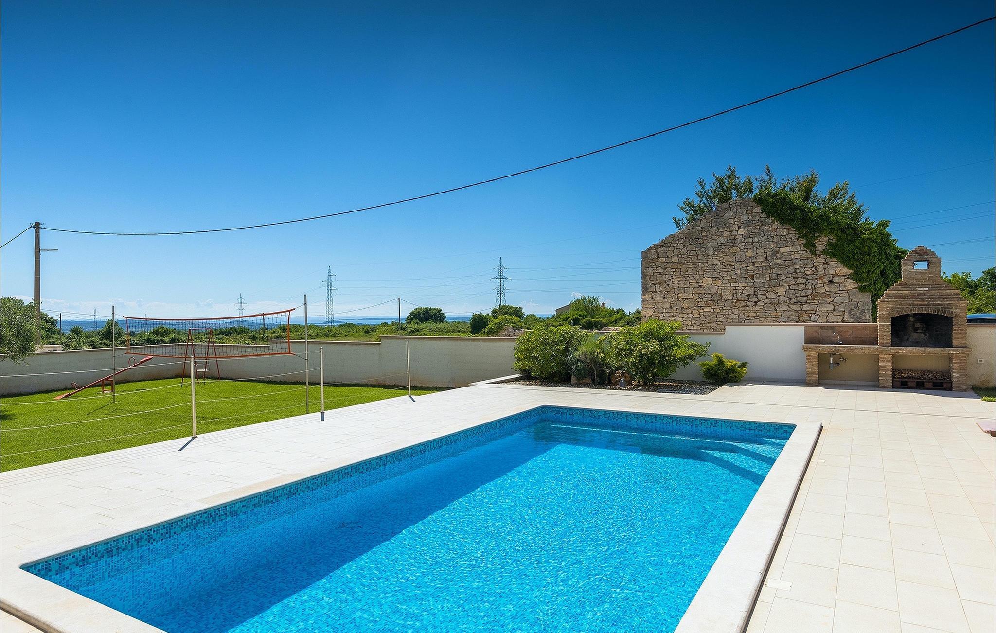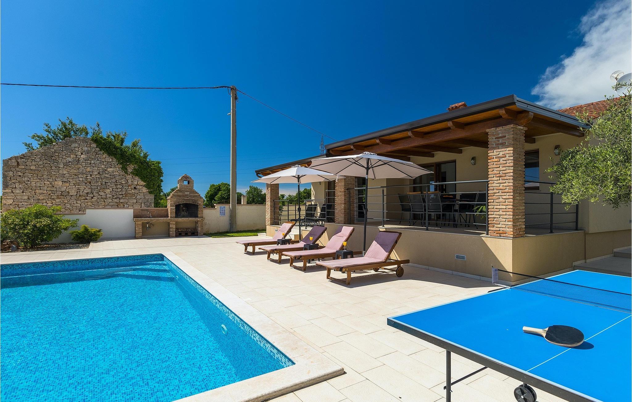 Den attraktive Villa Monteci ligger i nærheten av Pula, bare 4 kilometer fra vakre rullesteinsstrender. Villaen er et enetasjes hus med plass til totalt 8 personer. Interiøret er lyst og luftig takket være de store vinduene. Første etasje i åpen planløsning består av en koselig stue, et fullt utstyrt kjøkken og en spiseplass for 6 personer. Villaen har tre vakkert innredede soverom med dobbeltsenger, hvorav to har eget bad med dusj. Hvis du vil tilbringe ferien i solen, finner du et stort og svært innbydende basseng foran villaen hvor du kan slappe av med en forfriskende drink. Villaen har også en kullgrill hvor du kan tilberede deilige måltider til venner og familie. Villaen gir deg mange muligheter til å holde deg aktiv, for eksempel bordtennis, volleyball og badminton. Du kan låne sykler for å oppdage og utforske området. I denne villaen vil familien din oppleve spesielle øyeblikk og vakre minner, så ikke gå glipp av denne muligheten og bestill denne vakre villaen nå.Villa Monteci ligger ikke langt fra Pula i den lille landsbyen Galizana. Hvis du ønsker å tilbringe ferien ved sjøen, ligger de vakre rullesteinsstrendene bare 4 km fra villaen. Vi anbefaler deg å besøke Brijuni nasjonalpark, en gruppe øyer som er kjent for sine uberørte strender, arkeologiske utgravninger samt en golfbane og en dyrehage. For å komme til nasjonalparken kan du ta en turistbåt fra Fazana eller leie en båt og oppdage de skjulte buktene og strendene på Brijuni-øyene. Etter en hyggelig dag på stranden kan du besøke den historiske byen Pula, som er kjent for sitt best bevarte amfiteater i Europa, sine mange smale gater og historiske monumenter. Her kan du nyte det rike gastronomiske tilbudet og smake på tradisjonelle retter som fersk fisk og sjømat, fuzi med trøfler, pljukanci og istrisk boskarinbiff, som tilbys på mange av de beste restaurantene. Villaen har sykler som du kan bruke til å utforske området rundt. Istria er et ideelt sted for syklister, ettersom det finnes mange sykkelstier som passer for alle. Hvis du vil vite mer om Istria, kan du bla gjennom My Istria Guide, der du finner en rekke interessante artikler.