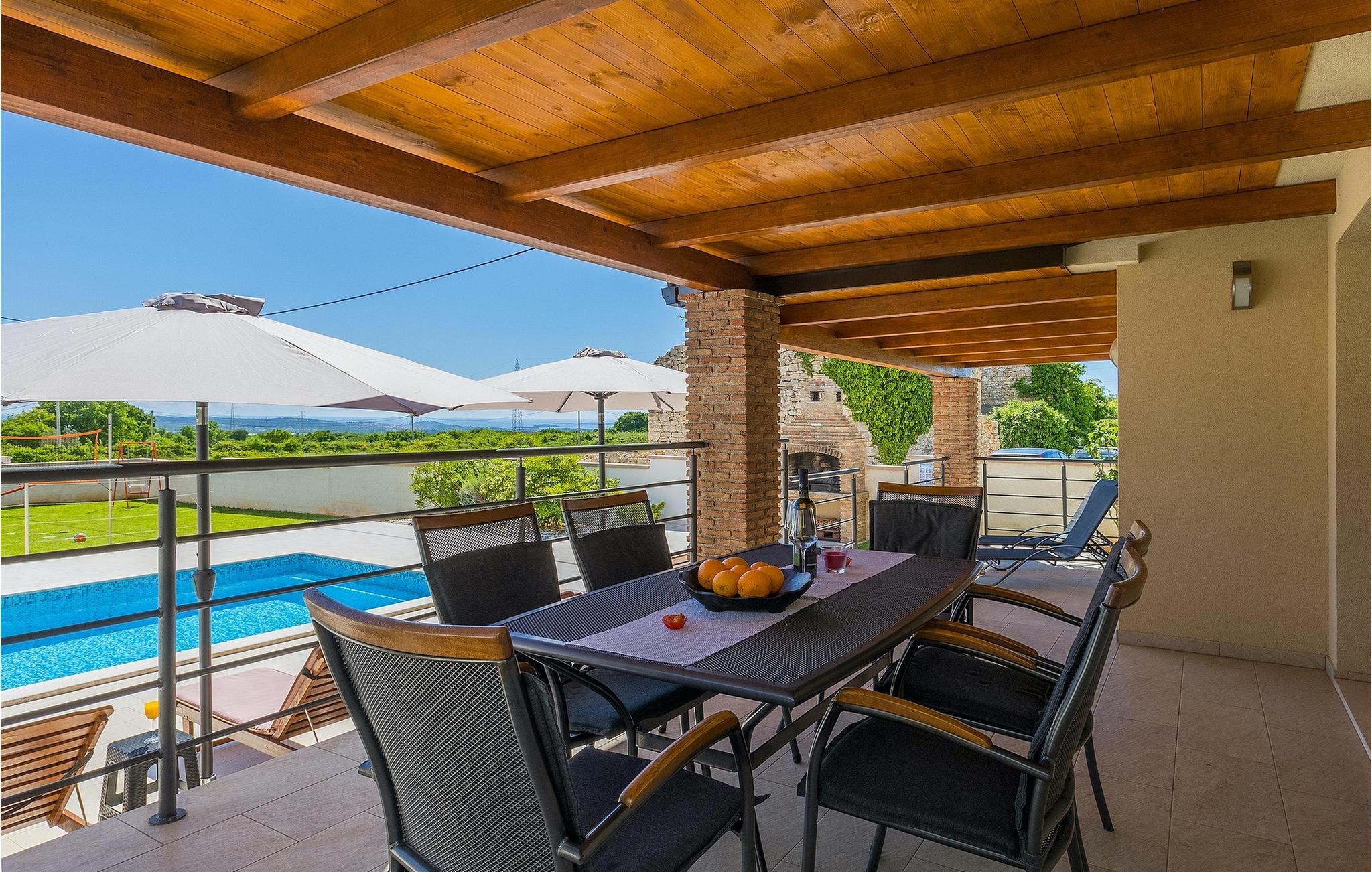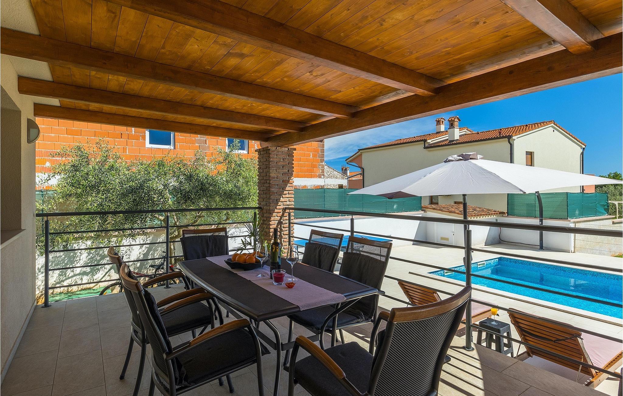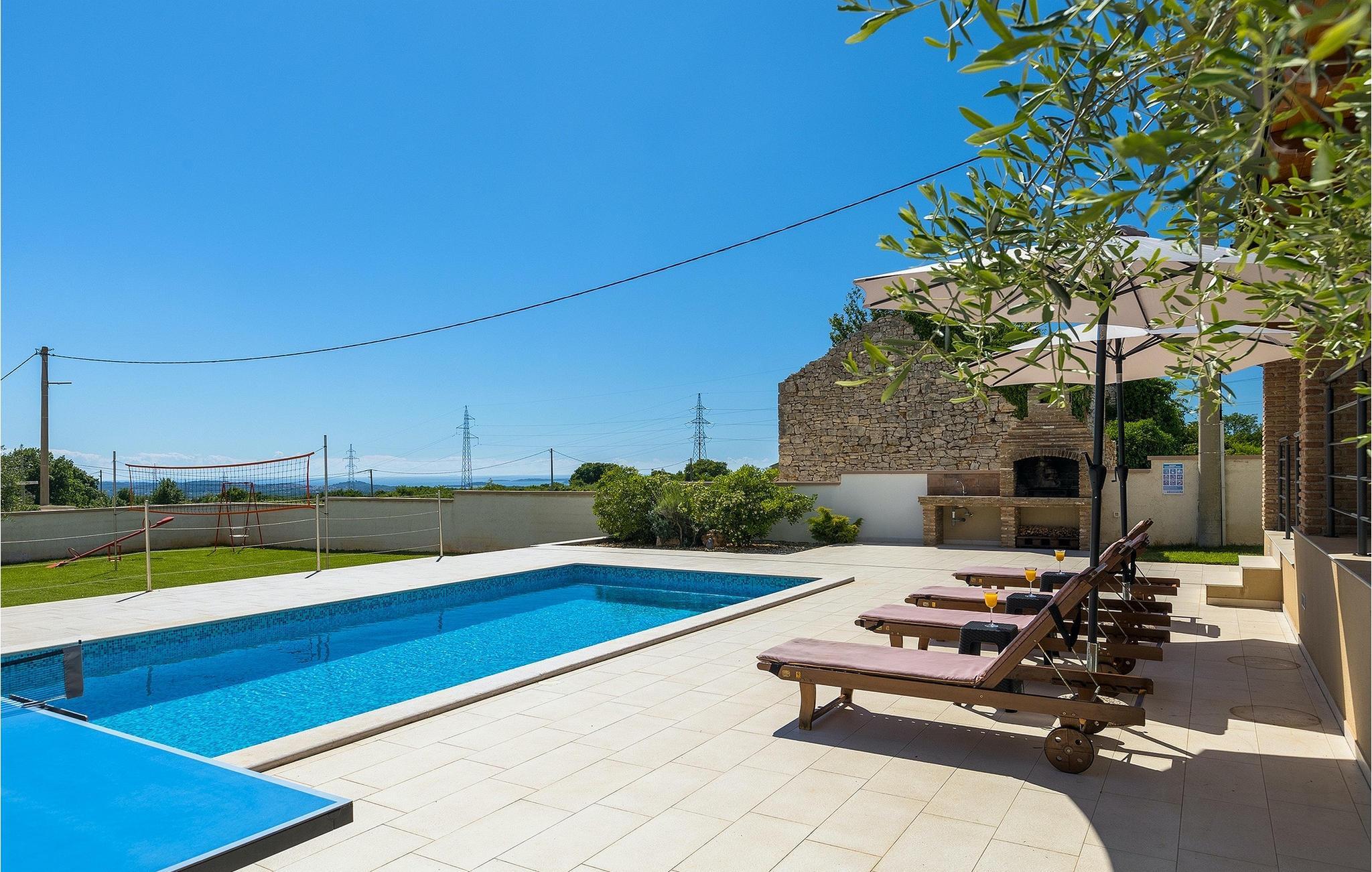 Den attraktive Villa Monteci ligger i nærheten av Pula, bare 4 kilometer fra vakre rullesteinsstrender. Villaen er et enetasjes hus med plass til totalt 8 personer. Interiøret er lyst og luftig takket være de store vinduene. Første etasje i åpen planløsning består av en koselig stue, et fullt utstyrt kjøkken og en spiseplass for 6 personer. Villaen har tre vakkert innredede soverom med dobbeltsenger, hvorav to har eget bad med dusj. Hvis du vil tilbringe ferien i solen, finner du et stort og svært innbydende basseng foran villaen hvor du kan slappe av med en forfriskende drink. Villaen har også en kullgrill hvor du kan tilberede deilige måltider til venner og familie. Villaen gir deg mange muligheter til å holde deg aktiv, for eksempel bordtennis, volleyball og badminton. Du kan låne sykler for å oppdage og utforske området. I denne villaen vil familien din oppleve spesielle øyeblikk og vakre minner, så ikke gå glipp av denne muligheten og bestill denne vakre villaen nå.Villa Monteci ligger ikke langt fra Pula i den lille landsbyen Galizana. Hvis du ønsker å tilbringe ferien ved sjøen, ligger de vakre rullesteinsstrendene bare 4 km fra villaen. Vi anbefaler deg å besøke Brijuni nasjonalpark, en gruppe øyer som er kjent for sine uberørte strender, arkeologiske utgravninger samt en golfbane og en dyrehage. For å komme til nasjonalparken kan du ta en turistbåt fra Fazana eller leie en båt og oppdage de skjulte buktene og strendene på Brijuni-øyene. Etter en hyggelig dag på stranden kan du besøke den historiske byen Pula, som er kjent for sitt best bevarte amfiteater i Europa, sine mange smale gater og historiske monumenter. Her kan du nyte det rike gastronomiske tilbudet og smake på tradisjonelle retter som fersk fisk og sjømat, fuzi med trøfler, pljukanci og istrisk boskarinbiff, som tilbys på mange av de beste restaurantene. Villaen har sykler som du kan bruke til å utforske området rundt. Istria er et ideelt sted for syklister, ettersom det finnes mange sykkelstier som passer for alle. Hvis du vil vite mer om Istria, kan du bla gjennom My Istria Guide, der du finner en rekke interessante artikler.