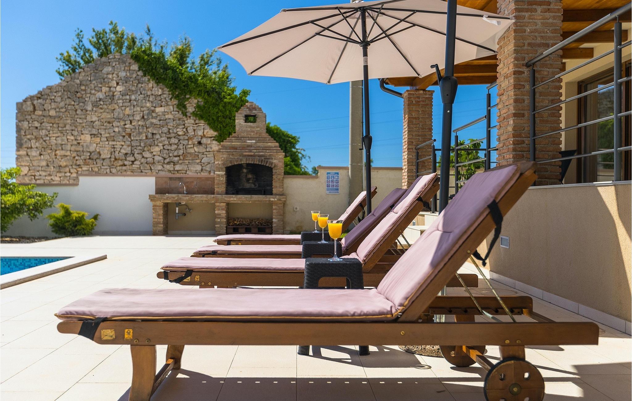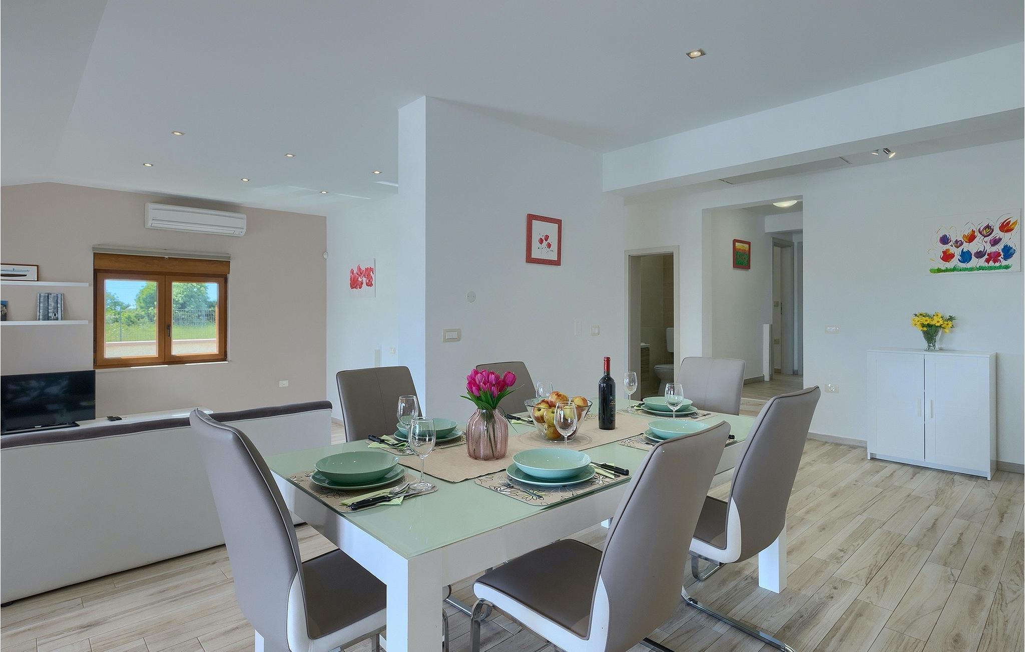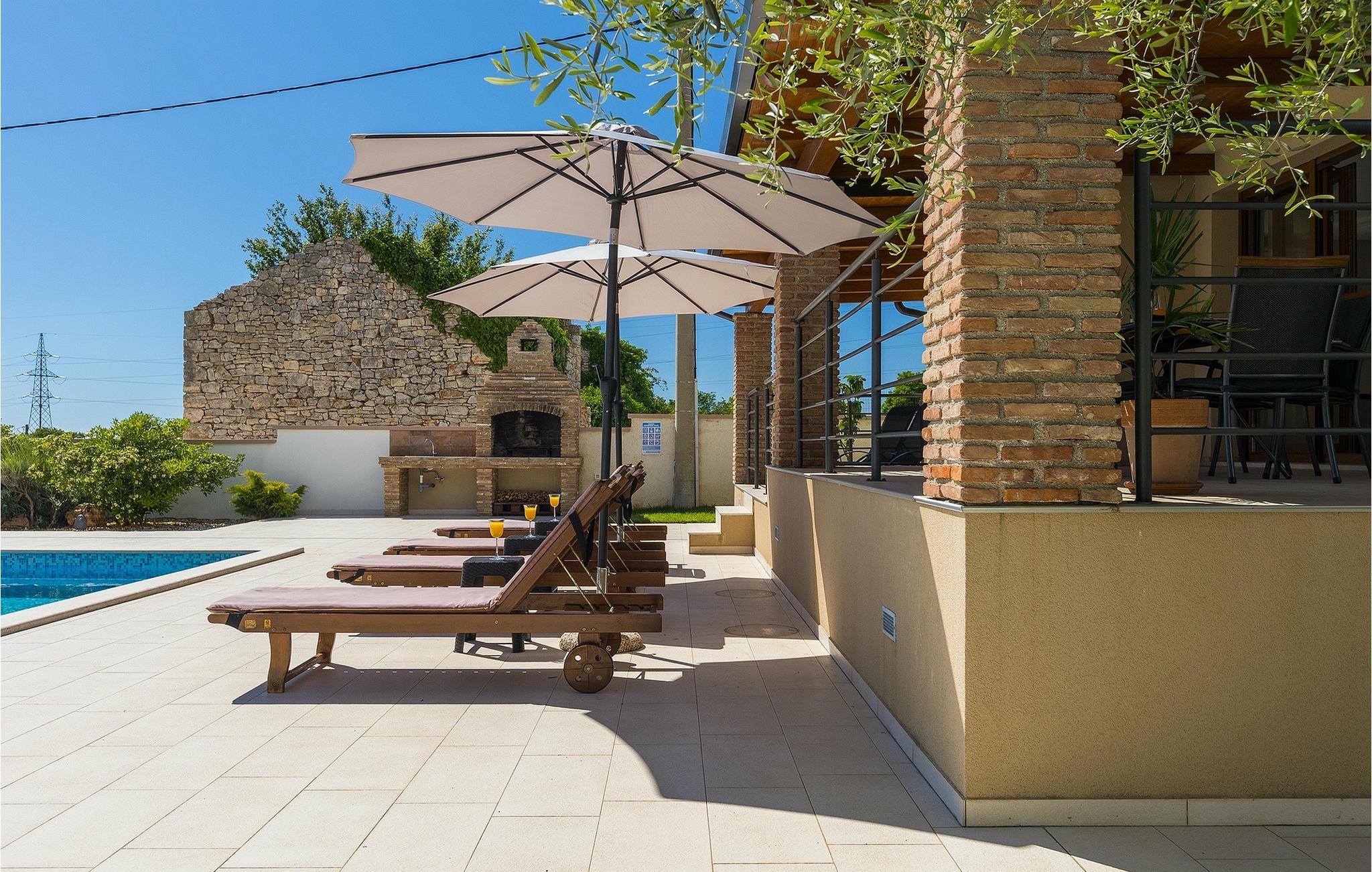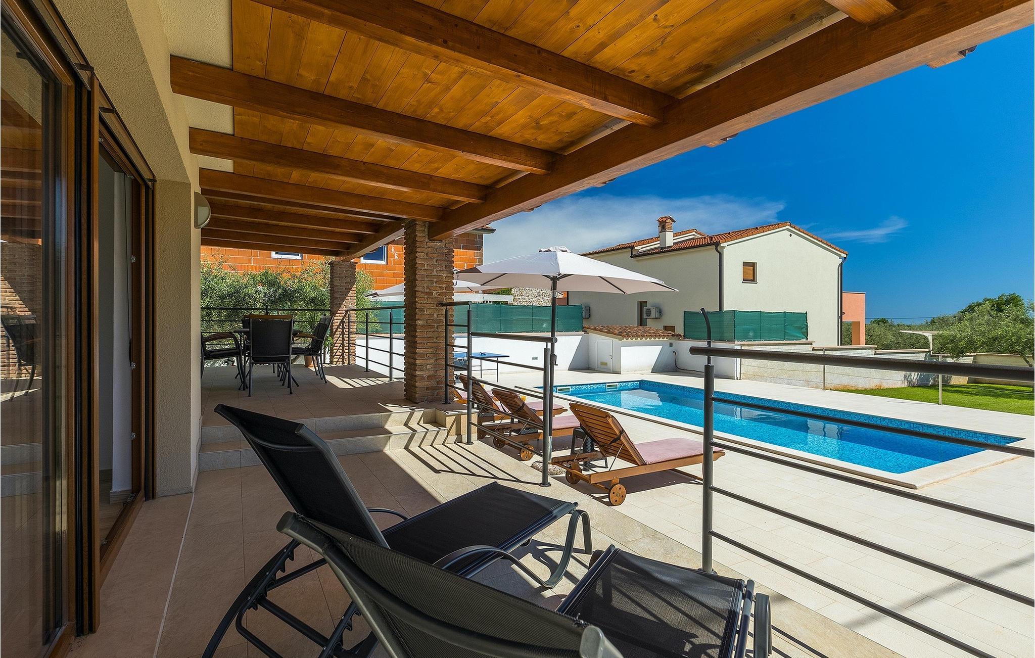 Den attraktive Villa Monteci ligger i nærheten av Pula, bare 4 kilometer fra vakre rullesteinsstrender. Villaen er et enetasjes hus med plass til totalt 8 personer. Interiøret er lyst og luftig takket være de store vinduene. Første etasje i åpen planløsning består av en koselig stue, et fullt utstyrt kjøkken og en spiseplass for 6 personer. Villaen har tre vakkert innredede soverom med dobbeltsenger, hvorav to har eget bad med dusj. Hvis du vil tilbringe ferien i solen, finner du et stort og svært innbydende basseng foran villaen hvor du kan slappe av med en forfriskende drink. Villaen har også en kullgrill hvor du kan tilberede deilige måltider til venner og familie. Villaen gir deg mange muligheter til å holde deg aktiv, for eksempel bordtennis, volleyball og badminton. Du kan låne sykler for å oppdage og utforske området. I denne villaen vil familien din oppleve spesielle øyeblikk og vakre minner, så ikke gå glipp av denne muligheten og bestill denne vakre villaen nå.Villa Monteci ligger ikke langt fra Pula i den lille landsbyen Galizana. Hvis du ønsker å tilbringe ferien ved sjøen, ligger de vakre rullesteinsstrendene bare 4 km fra villaen. Vi anbefaler deg å besøke Brijuni nasjonalpark, en gruppe øyer som er kjent for sine uberørte strender, arkeologiske utgravninger samt en golfbane og en dyrehage. For å komme til nasjonalparken kan du ta en turistbåt fra Fazana eller leie en båt og oppdage de skjulte buktene og strendene på Brijuni-øyene. Etter en hyggelig dag på stranden kan du besøke den historiske byen Pula, som er kjent for sitt best bevarte amfiteater i Europa, sine mange smale gater og historiske monumenter. Her kan du nyte det rike gastronomiske tilbudet og smake på tradisjonelle retter som fersk fisk og sjømat, fuzi med trøfler, pljukanci og istrisk boskarinbiff, som tilbys på mange av de beste restaurantene. Villaen har sykler som du kan bruke til å utforske området rundt. Istria er et ideelt sted for syklister, ettersom det finnes mange sykkelstier som passer for alle. Hvis du vil vite mer om Istria, kan du bla gjennom My Istria Guide, der du finner en rekke interessante artikler.