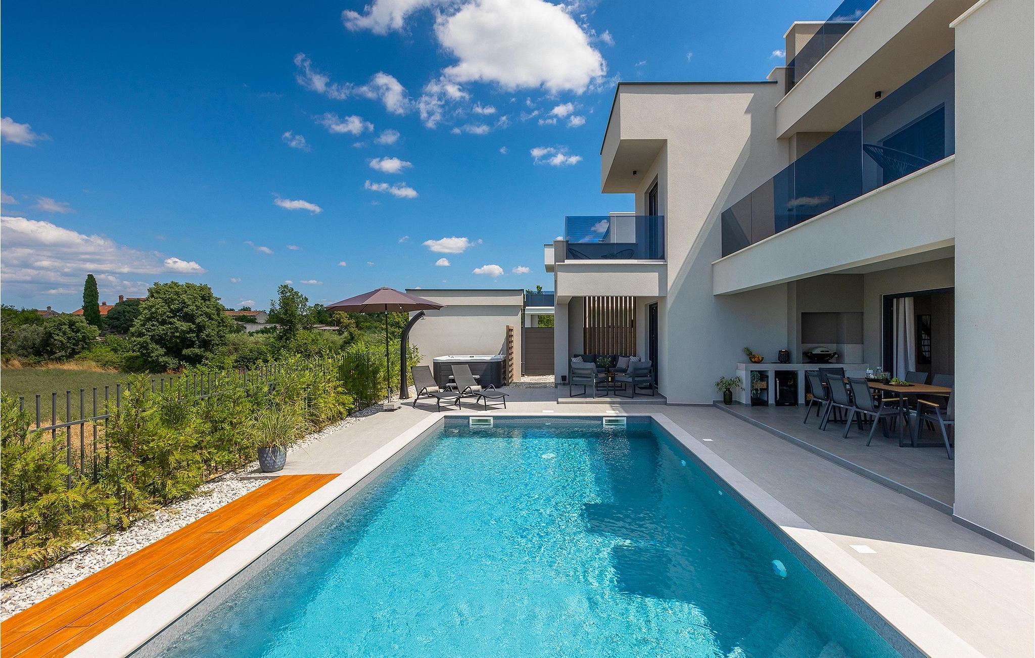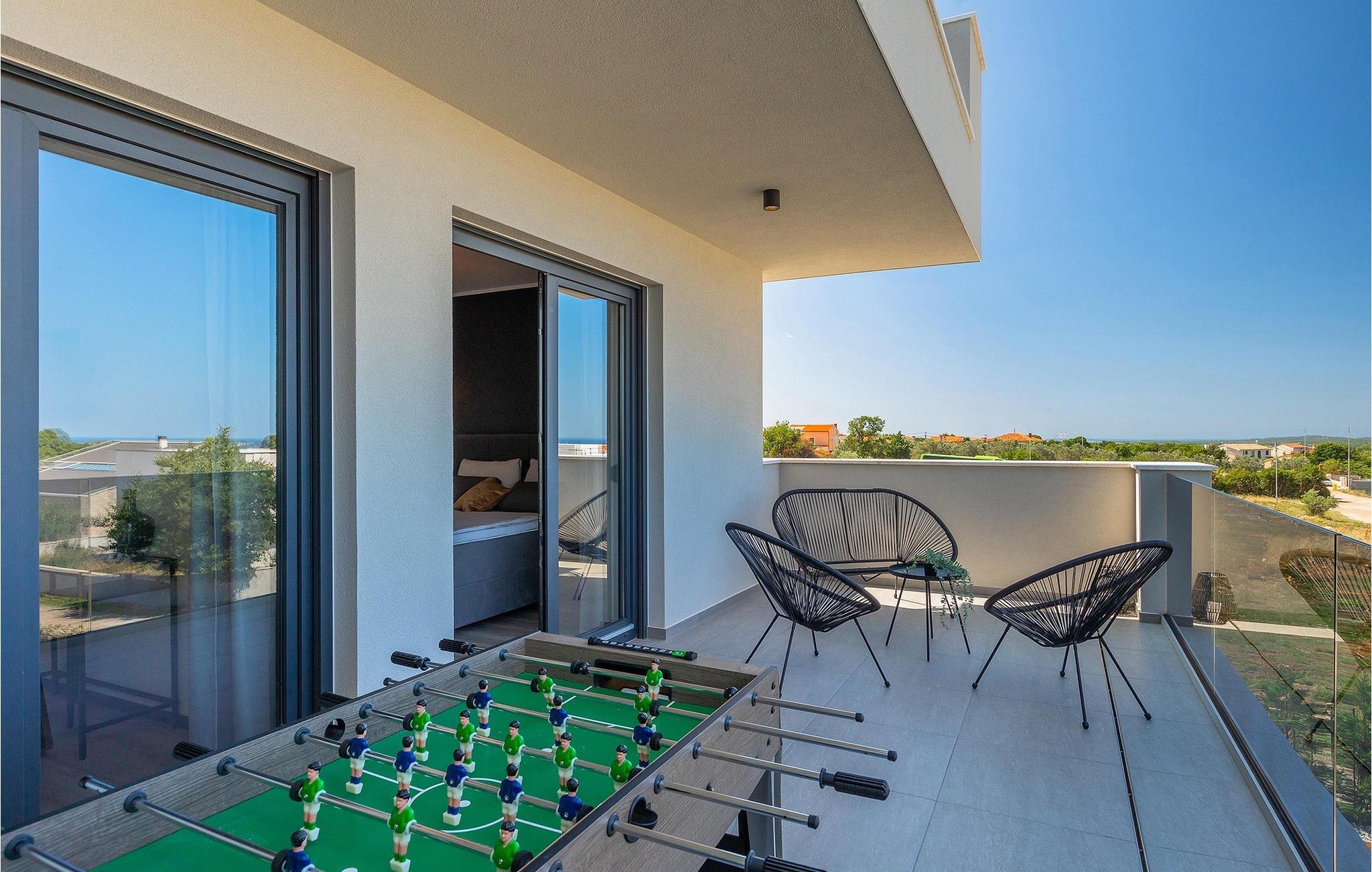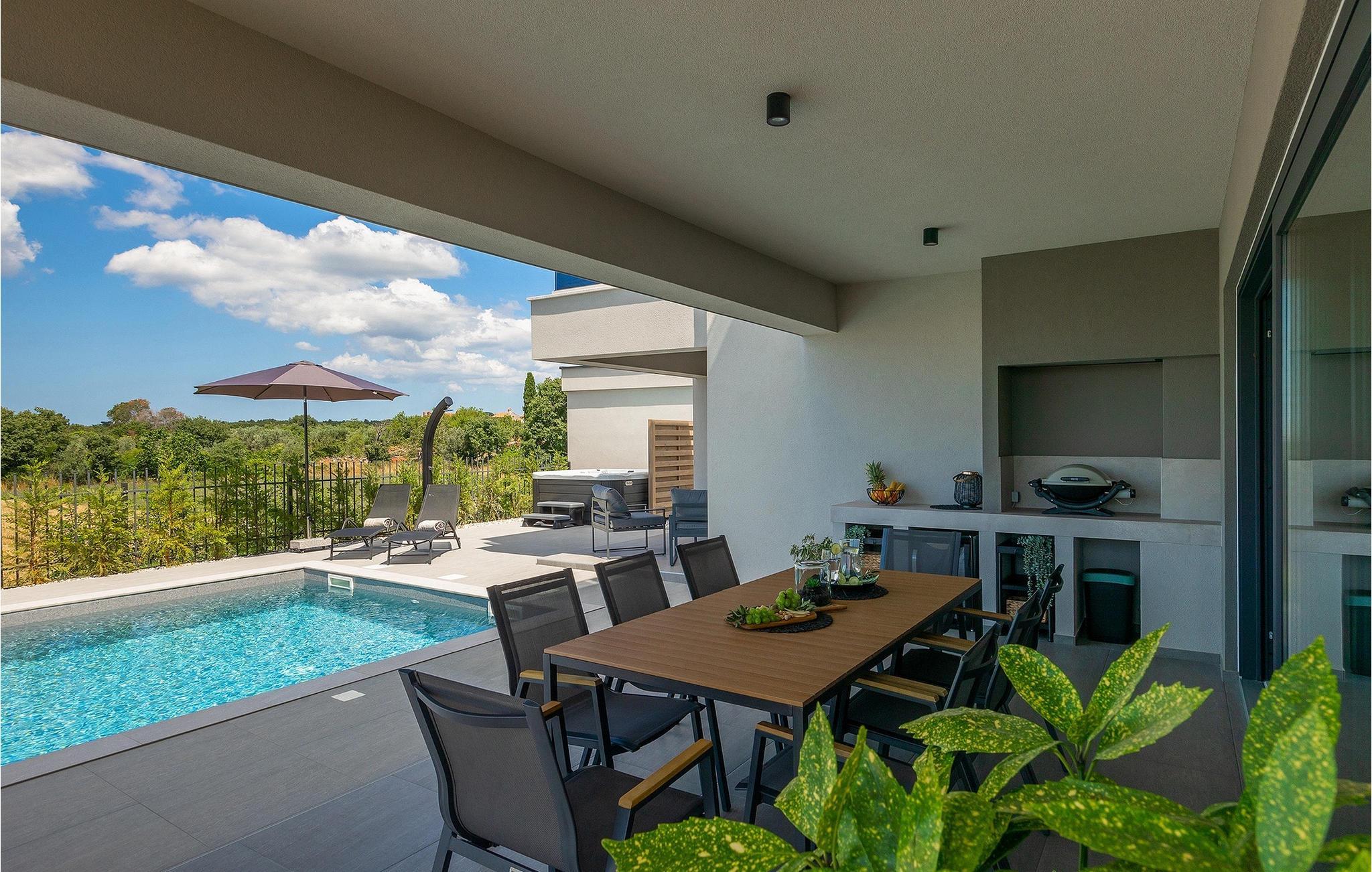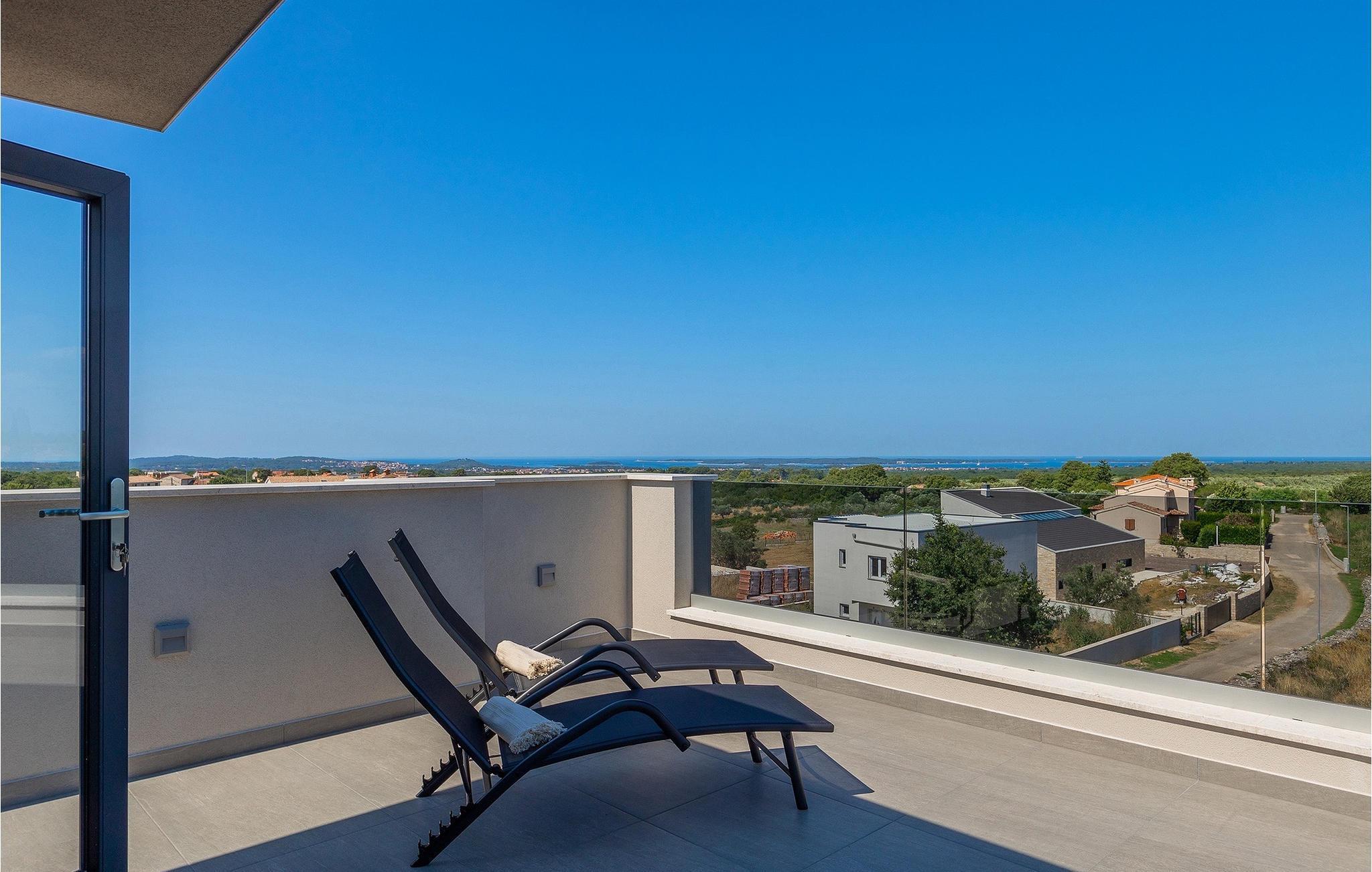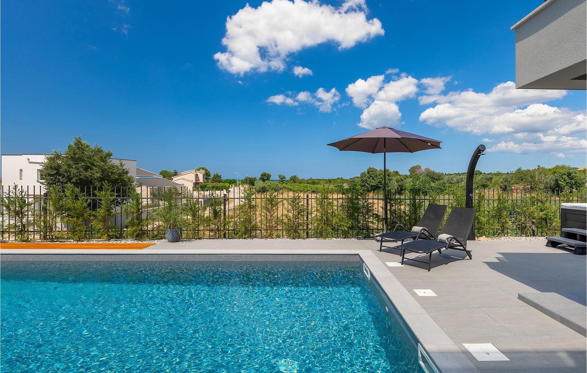 Villa IVaLA er en vakker familievilla i nærheten av Pula, ideell for en drømmeferie med familie og venner. Foran villaen ligger et vakkert basseng på 32 m2. I sommervarmen finner du forfriskninger i bassenget, mens soldyrkere kan nyte den istriske solen på solsengene rett ved bassenget. Slapp av i det utendørs boblebadet. Nyt istriske retter tilberedt på grillen i et overbygd område foran villaen, hvor du kan finne et spisebord for 8 personer. De yngste gjestene kan ha det gøy på lekeplassen, som er utstyrt med husker og klatrestativer. Men det er også mye moro å finne på inne i villaen. På terrassen i villaens første etasje kan du spille bordfotball. I første etasje av villaen er det en koselig stue med en fantastisk utsikt over bassenget. I den åpne planløsningen er det også et utstyrt kjøkken med alt du trenger for å tilberede deilige måltider og en spisestue med plass til 6 personer. I samme etasje er det et bad og et separat toalett. Soverommene ligger i første etasje. Det første soverommet har en dobbeltseng og eget bad. De to andre soverommene har dobbeltsenger, og det er et separat bad i denne etasjen. Alle soverommene har klimaanlegg, TV og egen terrasse hvor du kan nyte morgenkaffen mens du beundrer den vakre havutsikten. Det spesielle med villaen er takterrassen, som ligger i andre etasje. Her kan du nyte den unike utsikten over Brijuni-øyene og det vakre havet, som vil ta pusten fra deg. Ikke gå glipp av en unik ferie i Villa IVaLA med panoramautsikt og nyt atmosfæren i den sjarmerende landsbyen Galizana. Galizana er en landsby i Istria mellom Vodnjan og Pula. Galizana har en rik historie og tradisjon som går tilbake til antikken. Lokalbefolkningen vil glede deg med produktene sine. Gå ikke glipp av å smake på ekstra jomfruolivenolje, saueost og andre lokale produkter. Ha det gøy på lokale arrangementer som galiciske kvelder og folklore. Gå ikke glipp av å besøke Vodnjan med sitt rike gastronomiske tilbud. Utforsk Vodnjan med sine interessante veggmalerier, kirken St Foska, i nærheten av hvilken det finnes tre kazuner, tradisjonelle tilfluktsrom laget av istrisk stein. Naturelskere vil nyte landsbyen Peroj og beundre den vakre utsikten over Fazana-kanalen og Brijuni-skjærgården. Et uunnværlig reisemål er Istrias største by Pula, der du kan besøke Pula Arena, Augustus-tempelet, Den gylne port og mange andre kulturelle og historiske monumenter. På slutten av ditt istriske eventyr kan du utforske Brijuni-skjærgården med den berømte Brijuni nasjonalpark og safariparken.
