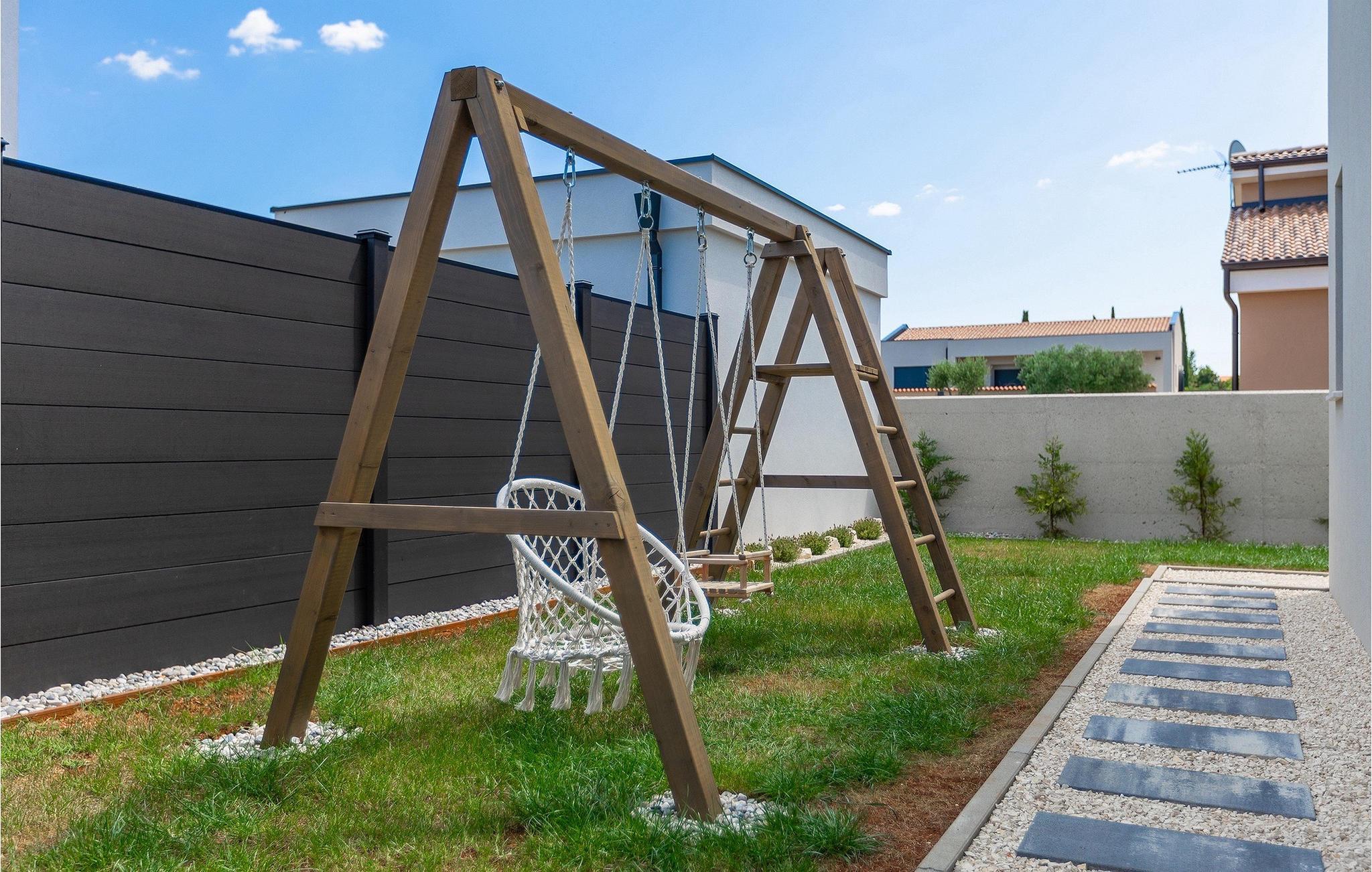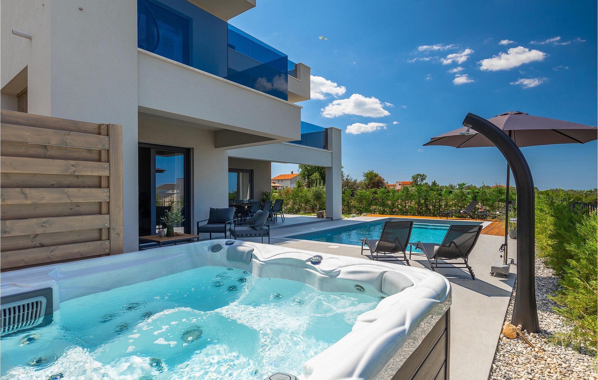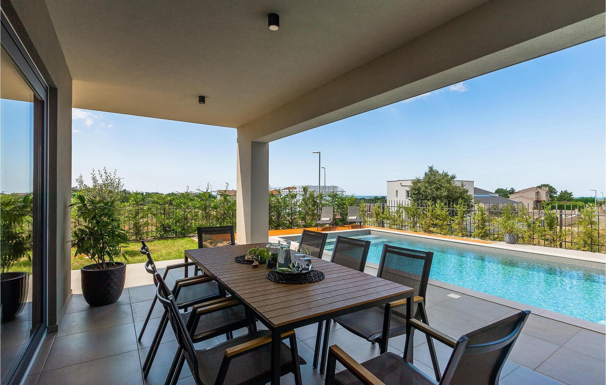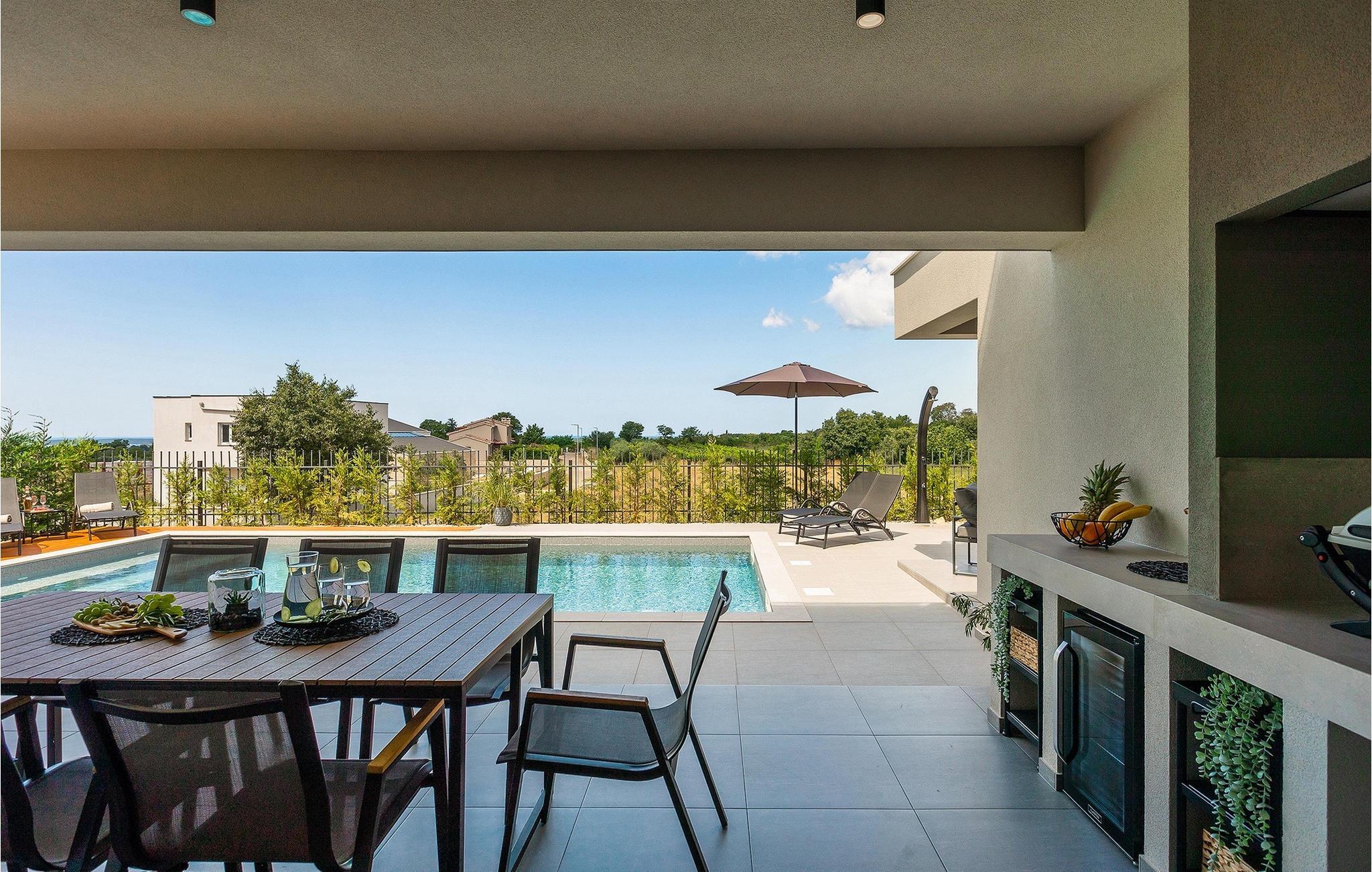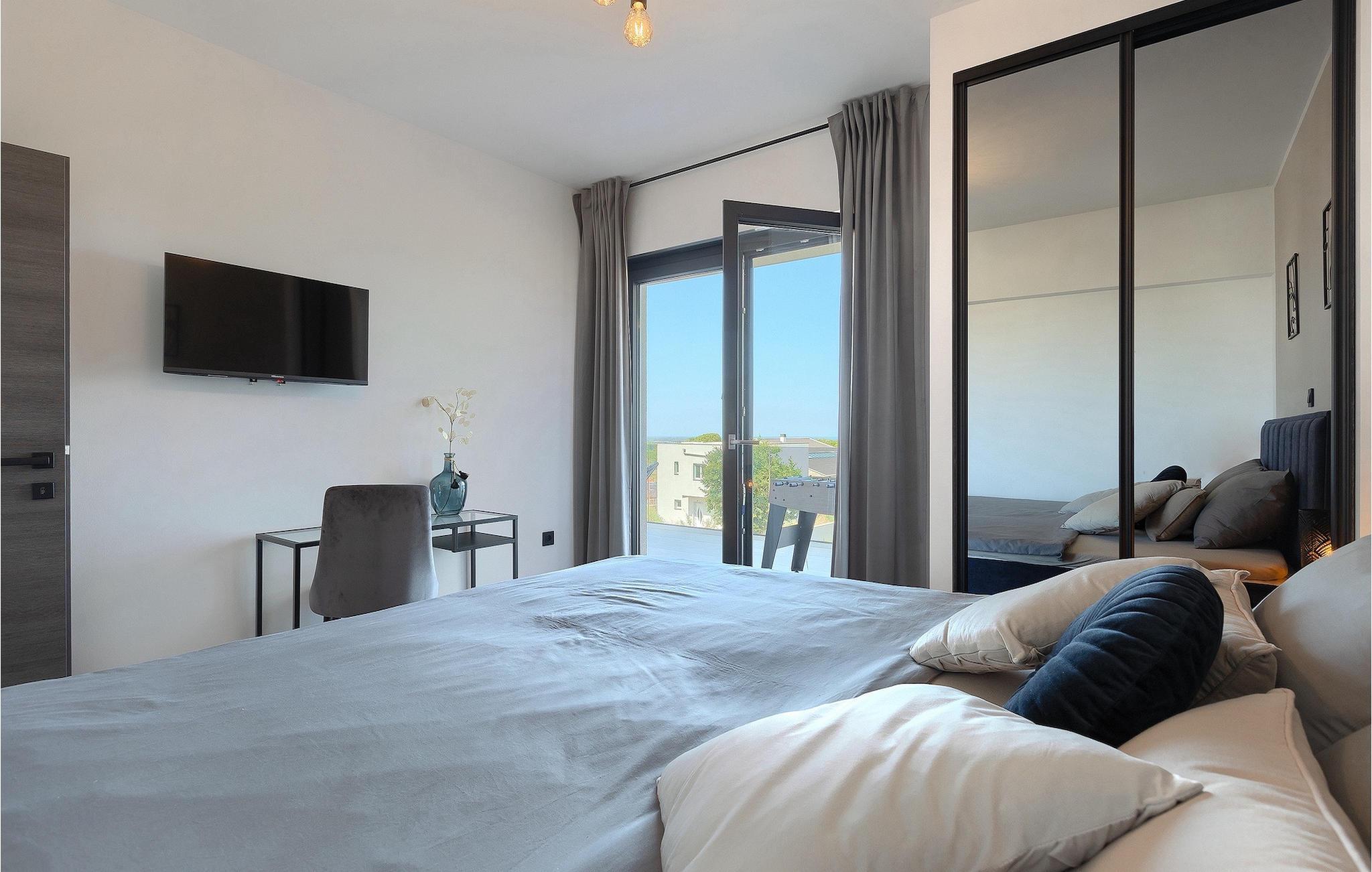 Villa IVaLA er en vakker familievilla i nærheten av Pula, ideell for en drømmeferie med familie og venner. Foran villaen ligger et vakkert basseng på 32 m2. I sommervarmen finner du forfriskninger i bassenget, mens soldyrkere kan nyte den istriske solen på solsengene rett ved bassenget. Slapp av i det utendørs boblebadet. Nyt istriske retter tilberedt på grillen i et overbygd område foran villaen, hvor du kan finne et spisebord for 8 personer. De yngste gjestene kan ha det gøy på lekeplassen, som er utstyrt med husker og klatrestativer. Men det er også mye moro å finne på inne i villaen. På terrassen i villaens første etasje kan du spille bordfotball. I første etasje av villaen er det en koselig stue med en fantastisk utsikt over bassenget. I den åpne planløsningen er det også et utstyrt kjøkken med alt du trenger for å tilberede deilige måltider og en spisestue med plass til 6 personer. I samme etasje er det et bad og et separat toalett. Soverommene ligger i første etasje. Det første soverommet har en dobbeltseng og eget bad. De to andre soverommene har dobbeltsenger, og det er et separat bad i denne etasjen. Alle soverommene har klimaanlegg, TV og egen terrasse hvor du kan nyte morgenkaffen mens du beundrer den vakre havutsikten. Det spesielle med villaen er takterrassen, som ligger i andre etasje. Her kan du nyte den unike utsikten over Brijuni-øyene og det vakre havet, som vil ta pusten fra deg. Ikke gå glipp av en unik ferie i Villa IVaLA med panoramautsikt og nyt atmosfæren i den sjarmerende landsbyen Galizana. Galizana er en landsby i Istria mellom Vodnjan og Pula. Galizana har en rik historie og tradisjon som går tilbake til antikken. Lokalbefolkningen vil glede deg med produktene sine. Gå ikke glipp av å smake på ekstra jomfruolivenolje, saueost og andre lokale produkter. Ha det gøy på lokale arrangementer som galiciske kvelder og folklore. Gå ikke glipp av å besøke Vodnjan med sitt rike gastronomiske tilbud. Utforsk Vodnjan med sine interessante veggmalerier, kirken St Foska, i nærheten av hvilken det finnes tre kazuner, tradisjonelle tilfluktsrom laget av istrisk stein. Naturelskere vil nyte landsbyen Peroj og beundre den vakre utsikten over Fazana-kanalen og Brijuni-skjærgården. Et uunnværlig reisemål er Istrias største by Pula, der du kan besøke Pula Arena, Augustus-tempelet, Den gylne port og mange andre kulturelle og historiske monumenter. På slutten av ditt istriske eventyr kan du utforske Brijuni-skjærgården med den berømte Brijuni nasjonalpark og safariparken.