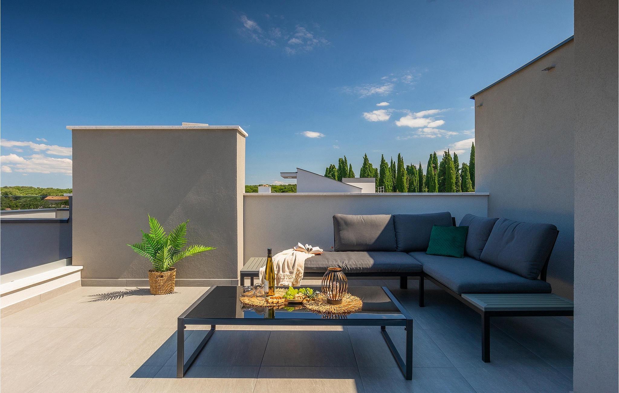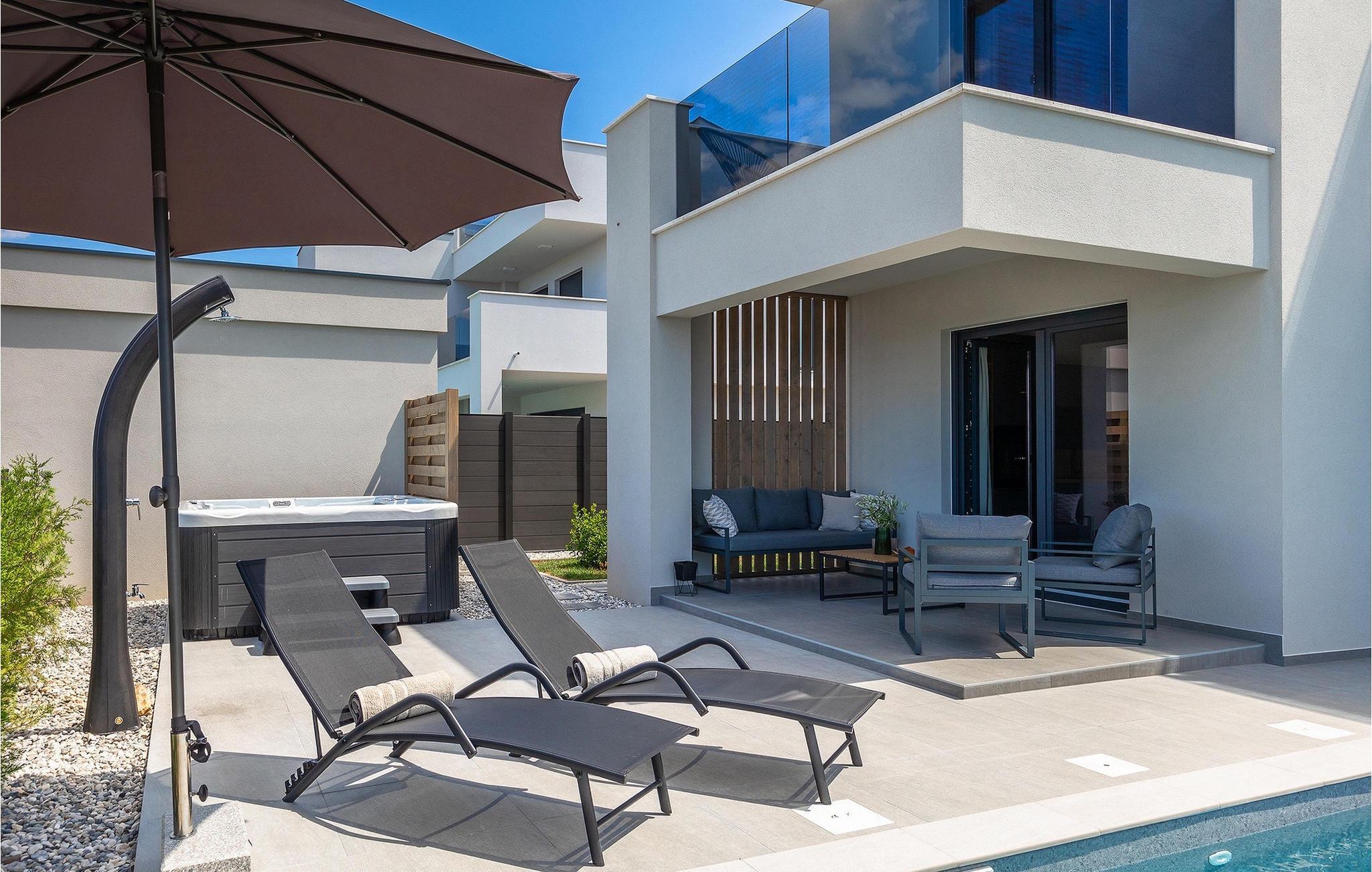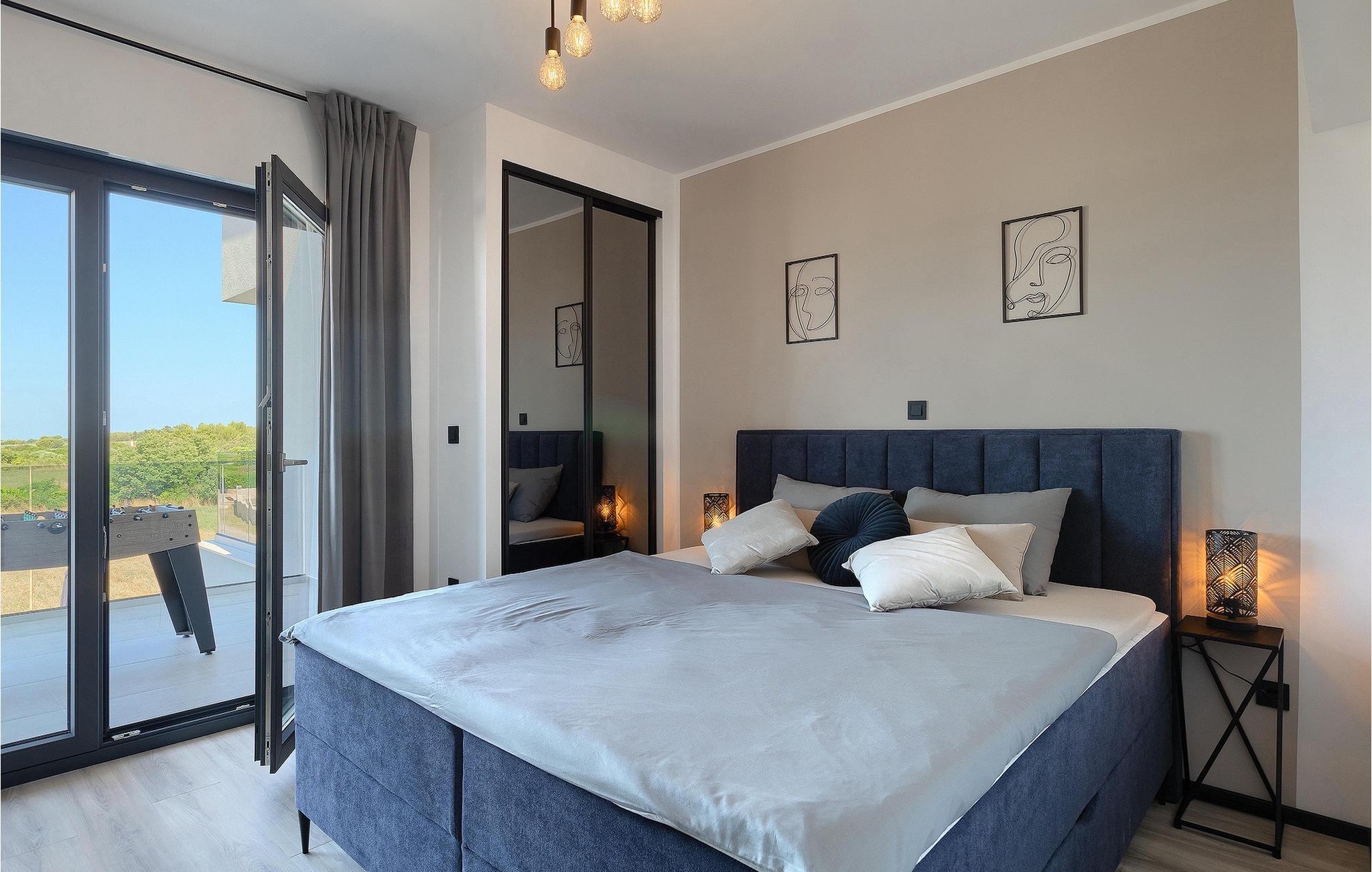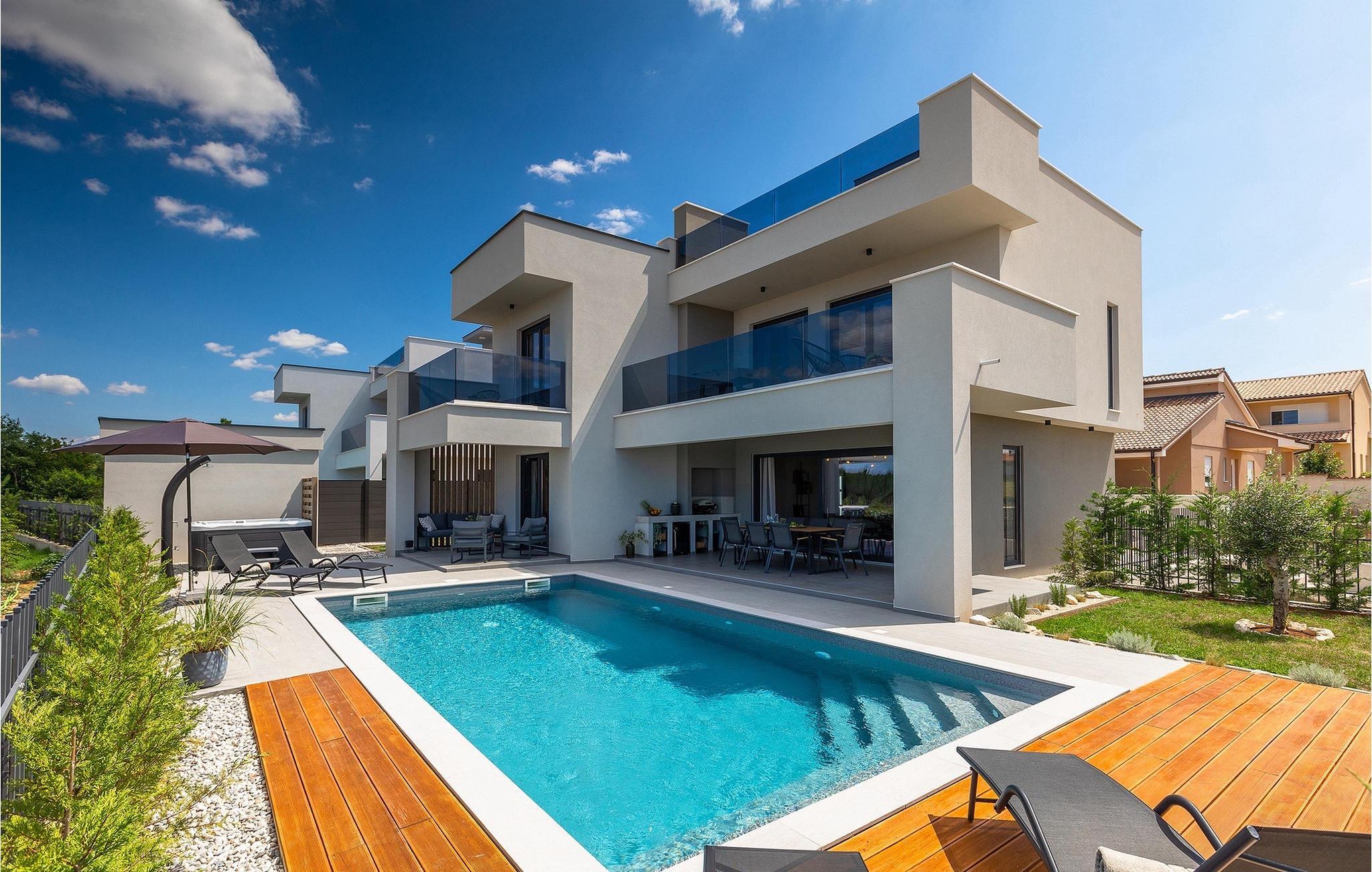 Villa IVaLA er en vakker familievilla i nærheten av Pula, ideell for en drømmeferie med familie og venner. Foran villaen ligger et vakkert basseng på 32 m2. I sommervarmen finner du forfriskninger i bassenget, mens soldyrkere kan nyte den istriske solen på solsengene rett ved bassenget. Slapp av i det utendørs boblebadet. Nyt istriske retter tilberedt på grillen i et overbygd område foran villaen, hvor du kan finne et spisebord for 8 personer. De yngste gjestene kan ha det gøy på lekeplassen, som er utstyrt med husker og klatrestativer. Men det er også mye moro å finne på inne i villaen. På terrassen i villaens første etasje kan du spille bordfotball. I første etasje av villaen er det en koselig stue med en fantastisk utsikt over bassenget. I den åpne planløsningen er det også et utstyrt kjøkken med alt du trenger for å tilberede deilige måltider og en spisestue med plass til 6 personer. I samme etasje er det et bad og et separat toalett. Soverommene ligger i første etasje. Det første soverommet har en dobbeltseng og eget bad. De to andre soverommene har dobbeltsenger, og det er et separat bad i denne etasjen. Alle soverommene har klimaanlegg, TV og egen terrasse hvor du kan nyte morgenkaffen mens du beundrer den vakre havutsikten. Det spesielle med villaen er takterrassen, som ligger i andre etasje. Her kan du nyte den unike utsikten over Brijuni-øyene og det vakre havet, som vil ta pusten fra deg. Ikke gå glipp av en unik ferie i Villa IVaLA med panoramautsikt og nyt atmosfæren i den sjarmerende landsbyen Galizana. Galizana er en landsby i Istria mellom Vodnjan og Pula. Galizana har en rik historie og tradisjon som går tilbake til antikken. Lokalbefolkningen vil glede deg med produktene sine. Gå ikke glipp av å smake på ekstra jomfruolivenolje, saueost og andre lokale produkter. Ha det gøy på lokale arrangementer som galiciske kvelder og folklore. Gå ikke glipp av å besøke Vodnjan med sitt rike gastronomiske tilbud. Utforsk Vodnjan med sine interessante veggmalerier, kirken St Foska, i nærheten av hvilken det finnes tre kazuner, tradisjonelle tilfluktsrom laget av istrisk stein. Naturelskere vil nyte landsbyen Peroj og beundre den vakre utsikten over Fazana-kanalen og Brijuni-skjærgården. Et uunnværlig reisemål er Istrias største by Pula, der du kan besøke Pula Arena, Augustus-tempelet, Den gylne port og mange andre kulturelle og historiske monumenter. På slutten av ditt istriske eventyr kan du utforske Brijuni-skjærgården med den berømte Brijuni nasjonalpark og safariparken.