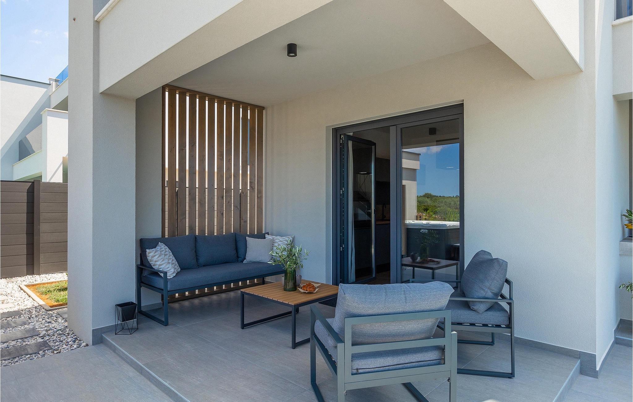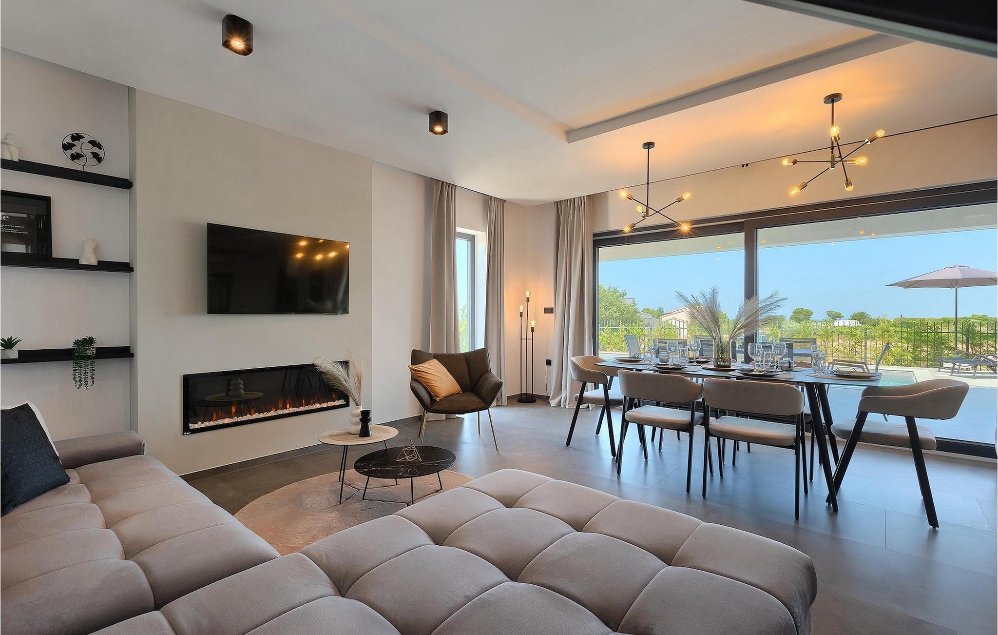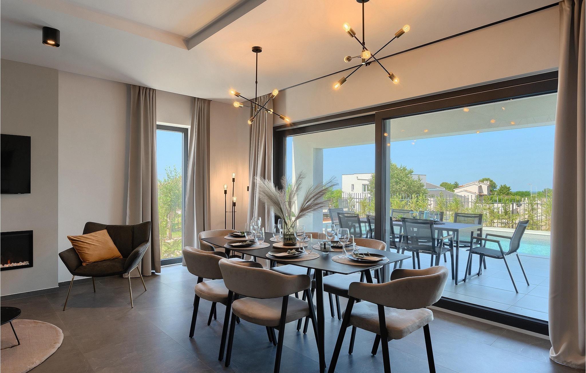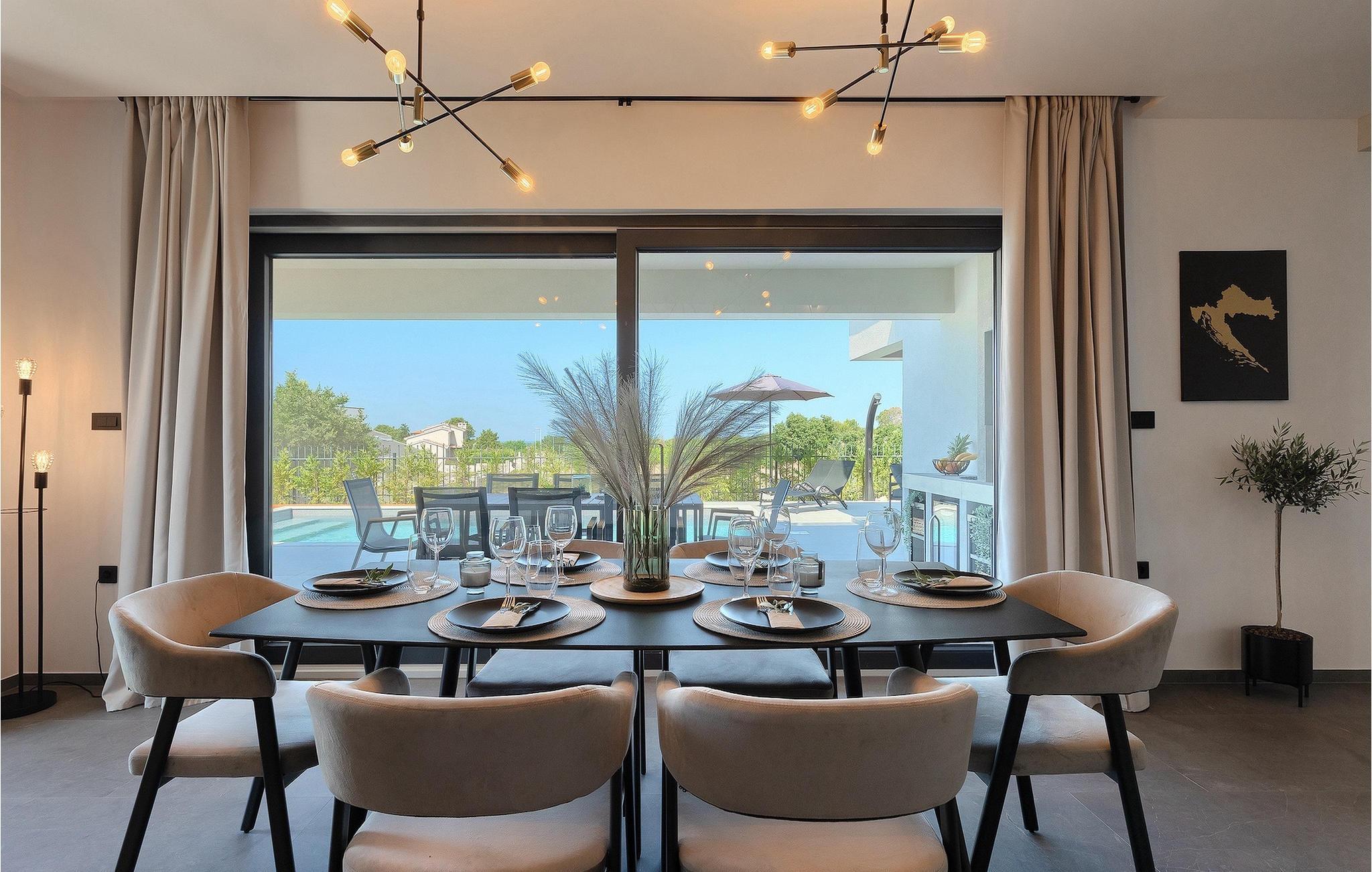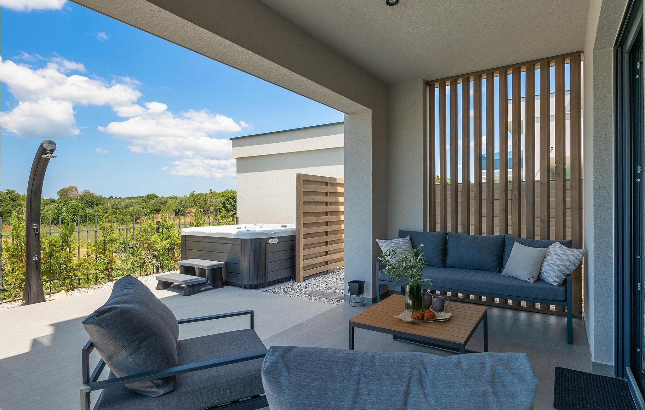 Villa IVaLA er en vakker familievilla i nærheten av Pula, ideell for en drømmeferie med familie og venner. Foran villaen ligger et vakkert basseng på 32 m2. I sommervarmen finner du forfriskninger i bassenget, mens soldyrkere kan nyte den istriske solen på solsengene rett ved bassenget. Slapp av i det utendørs boblebadet. Nyt istriske retter tilberedt på grillen i et overbygd område foran villaen, hvor du kan finne et spisebord for 8 personer. De yngste gjestene kan ha det gøy på lekeplassen, som er utstyrt med husker og klatrestativer. Men det er også mye moro å finne på inne i villaen. På terrassen i villaens første etasje kan du spille bordfotball. I første etasje av villaen er det en koselig stue med en fantastisk utsikt over bassenget. I den åpne planløsningen er det også et utstyrt kjøkken med alt du trenger for å tilberede deilige måltider og en spisestue med plass til 6 personer. I samme etasje er det et bad og et separat toalett. Soverommene ligger i første etasje. Det første soverommet har en dobbeltseng og eget bad. De to andre soverommene har dobbeltsenger, og det er et separat bad i denne etasjen. Alle soverommene har klimaanlegg, TV og egen terrasse hvor du kan nyte morgenkaffen mens du beundrer den vakre havutsikten. Det spesielle med villaen er takterrassen, som ligger i andre etasje. Her kan du nyte den unike utsikten over Brijuni-øyene og det vakre havet, som vil ta pusten fra deg. Ikke gå glipp av en unik ferie i Villa IVaLA med panoramautsikt og nyt atmosfæren i den sjarmerende landsbyen Galizana. Galizana er en landsby i Istria mellom Vodnjan og Pula. Galizana har en rik historie og tradisjon som går tilbake til antikken. Lokalbefolkningen vil glede deg med produktene sine. Gå ikke glipp av å smake på ekstra jomfruolivenolje, saueost og andre lokale produkter. Ha det gøy på lokale arrangementer som galiciske kvelder og folklore. Gå ikke glipp av å besøke Vodnjan med sitt rike gastronomiske tilbud. Utforsk Vodnjan med sine interessante veggmalerier, kirken St Foska, i nærheten av hvilken det finnes tre kazuner, tradisjonelle tilfluktsrom laget av istrisk stein. Naturelskere vil nyte landsbyen Peroj og beundre den vakre utsikten over Fazana-kanalen og Brijuni-skjærgården. Et uunnværlig reisemål er Istrias største by Pula, der du kan besøke Pula Arena, Augustus-tempelet, Den gylne port og mange andre kulturelle og historiske monumenter. På slutten av ditt istriske eventyr kan du utforske Brijuni-skjærgården med den berømte Brijuni nasjonalpark og safariparken.