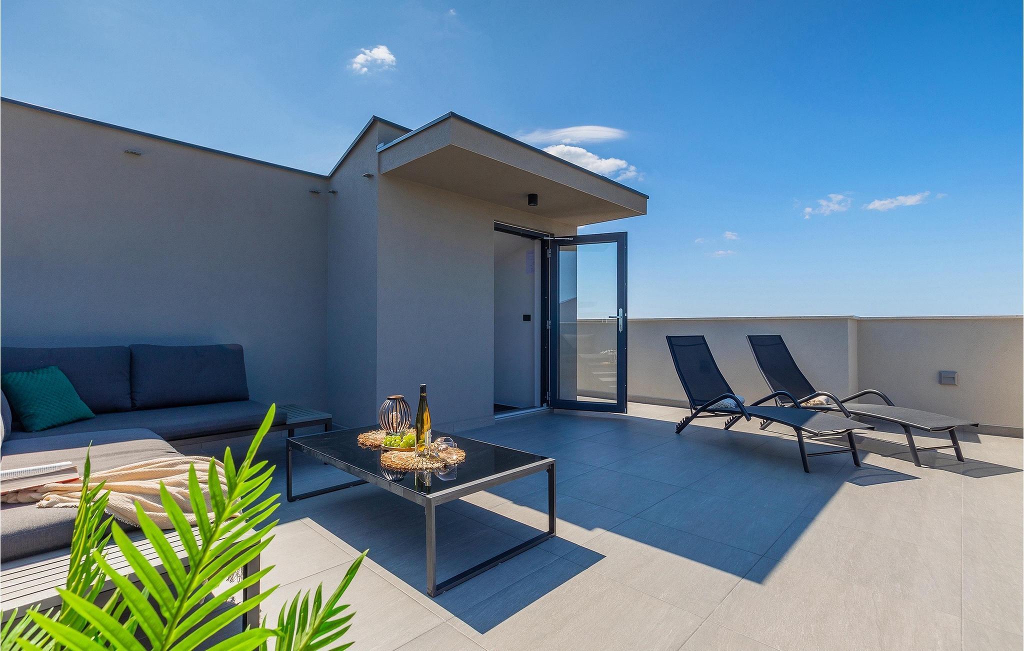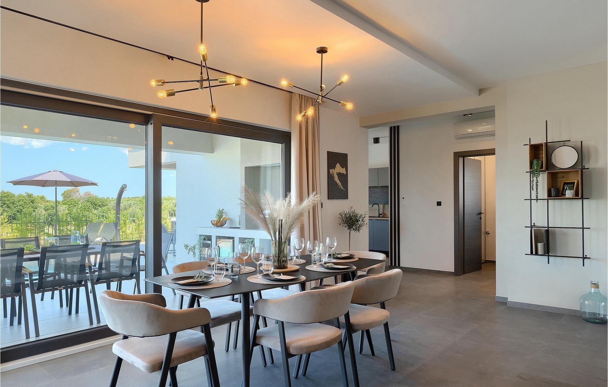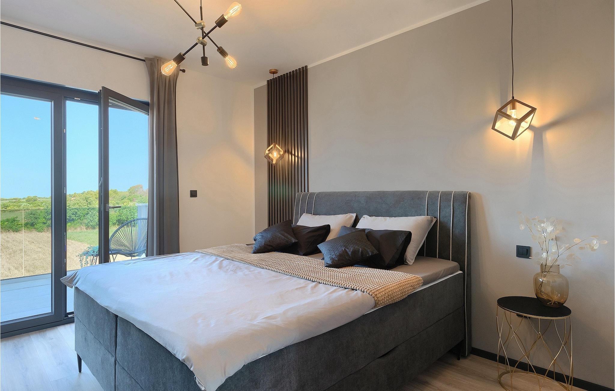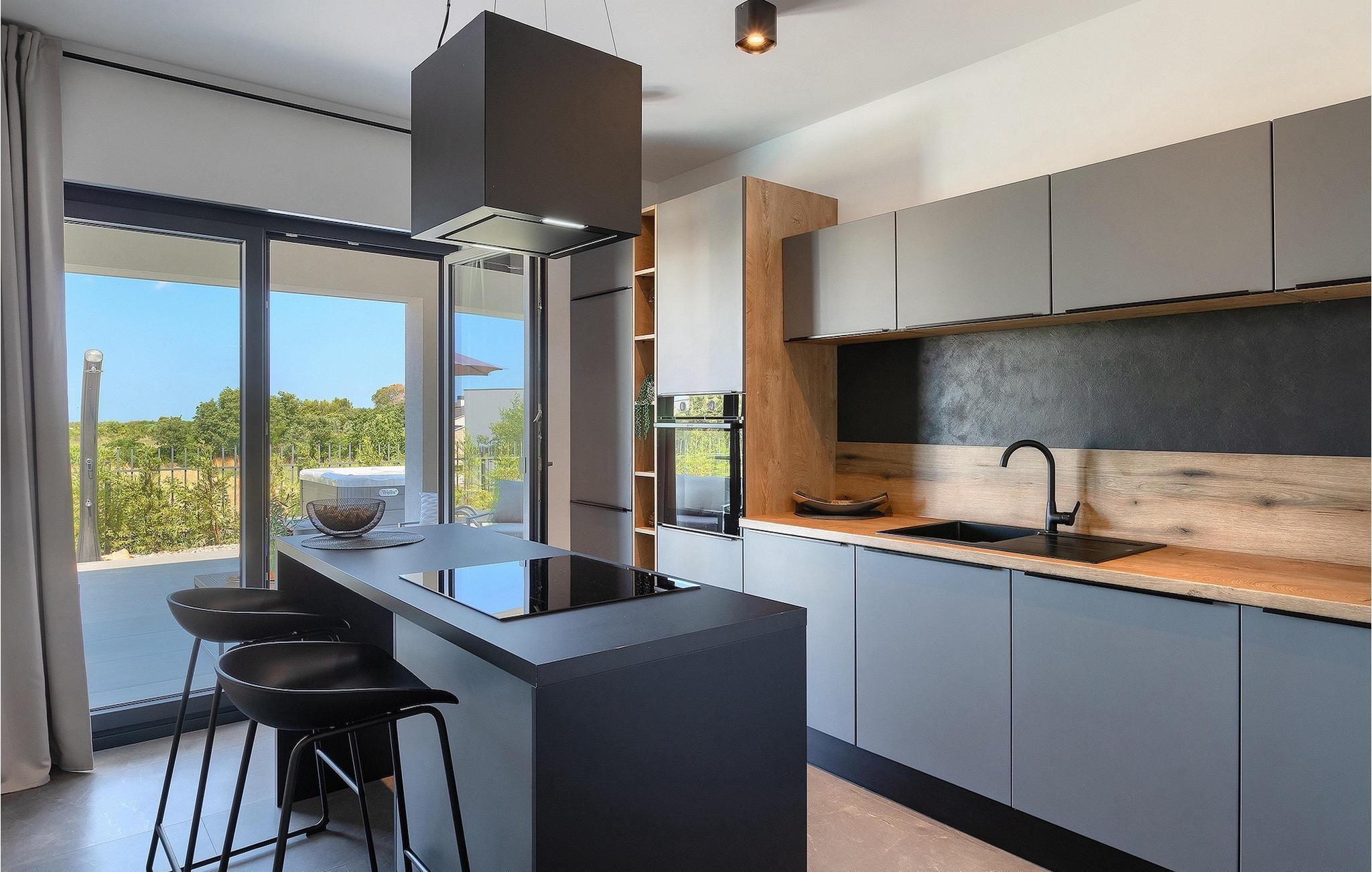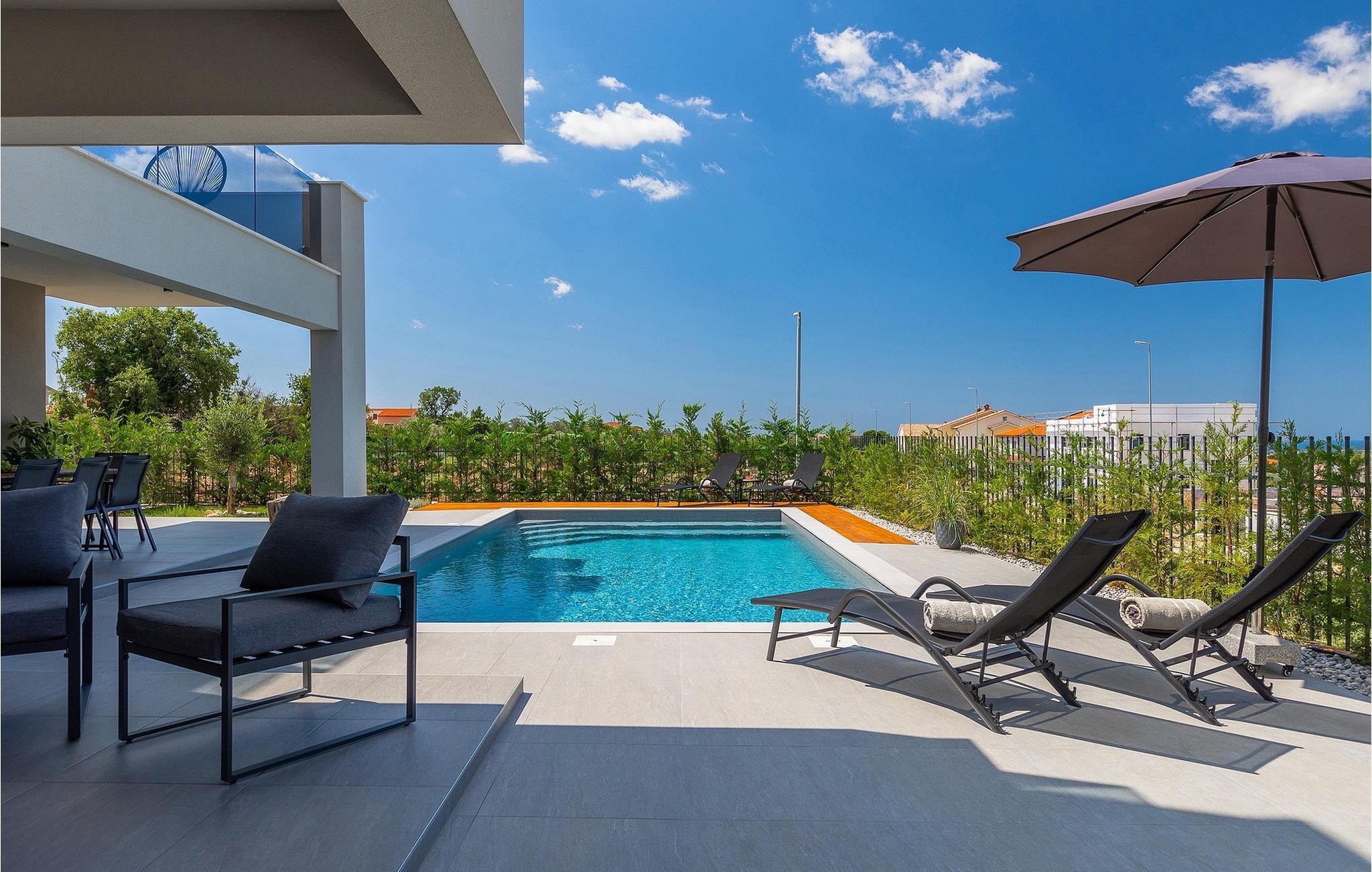 Villa IVaLA er en vakker familievilla i nærheten av Pula, ideell for en drømmeferie med familie og venner. Foran villaen ligger et vakkert basseng på 32 m2. I sommervarmen finner du forfriskninger i bassenget, mens soldyrkere kan nyte den istriske solen på solsengene rett ved bassenget. Slapp av i det utendørs boblebadet. Nyt istriske retter tilberedt på grillen i et overbygd område foran villaen, hvor du kan finne et spisebord for 8 personer. De yngste gjestene kan ha det gøy på lekeplassen, som er utstyrt med husker og klatrestativer. Men det er også mye moro å finne på inne i villaen. På terrassen i villaens første etasje kan du spille bordfotball. I første etasje av villaen er det en koselig stue med en fantastisk utsikt over bassenget. I den åpne planløsningen er det også et utstyrt kjøkken med alt du trenger for å tilberede deilige måltider og en spisestue med plass til 6 personer. I samme etasje er det et bad og et separat toalett. Soverommene ligger i første etasje. Det første soverommet har en dobbeltseng og eget bad. De to andre soverommene har dobbeltsenger, og det er et separat bad i denne etasjen. Alle soverommene har klimaanlegg, TV og egen terrasse hvor du kan nyte morgenkaffen mens du beundrer den vakre havutsikten. Det spesielle med villaen er takterrassen, som ligger i andre etasje. Her kan du nyte den unike utsikten over Brijuni-øyene og det vakre havet, som vil ta pusten fra deg. Ikke gå glipp av en unik ferie i Villa IVaLA med panoramautsikt og nyt atmosfæren i den sjarmerende landsbyen Galizana. Galizana er en landsby i Istria mellom Vodnjan og Pula. Galizana har en rik historie og tradisjon som går tilbake til antikken. Lokalbefolkningen vil glede deg med produktene sine. Gå ikke glipp av å smake på ekstra jomfruolivenolje, saueost og andre lokale produkter. Ha det gøy på lokale arrangementer som galiciske kvelder og folklore. Gå ikke glipp av å besøke Vodnjan med sitt rike gastronomiske tilbud. Utforsk Vodnjan med sine interessante veggmalerier, kirken St Foska, i nærheten av hvilken det finnes tre kazuner, tradisjonelle tilfluktsrom laget av istrisk stein. Naturelskere vil nyte landsbyen Peroj og beundre den vakre utsikten over Fazana-kanalen og Brijuni-skjærgården. Et uunnværlig reisemål er Istrias største by Pula, der du kan besøke Pula Arena, Augustus-tempelet, Den gylne port og mange andre kulturelle og historiske monumenter. På slutten av ditt istriske eventyr kan du utforske Brijuni-skjærgården med den berømte Brijuni nasjonalpark og safariparken.
