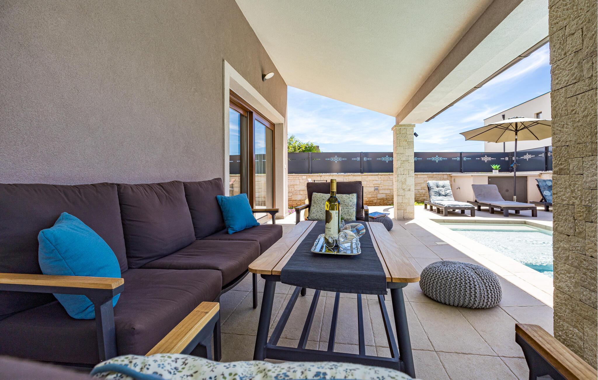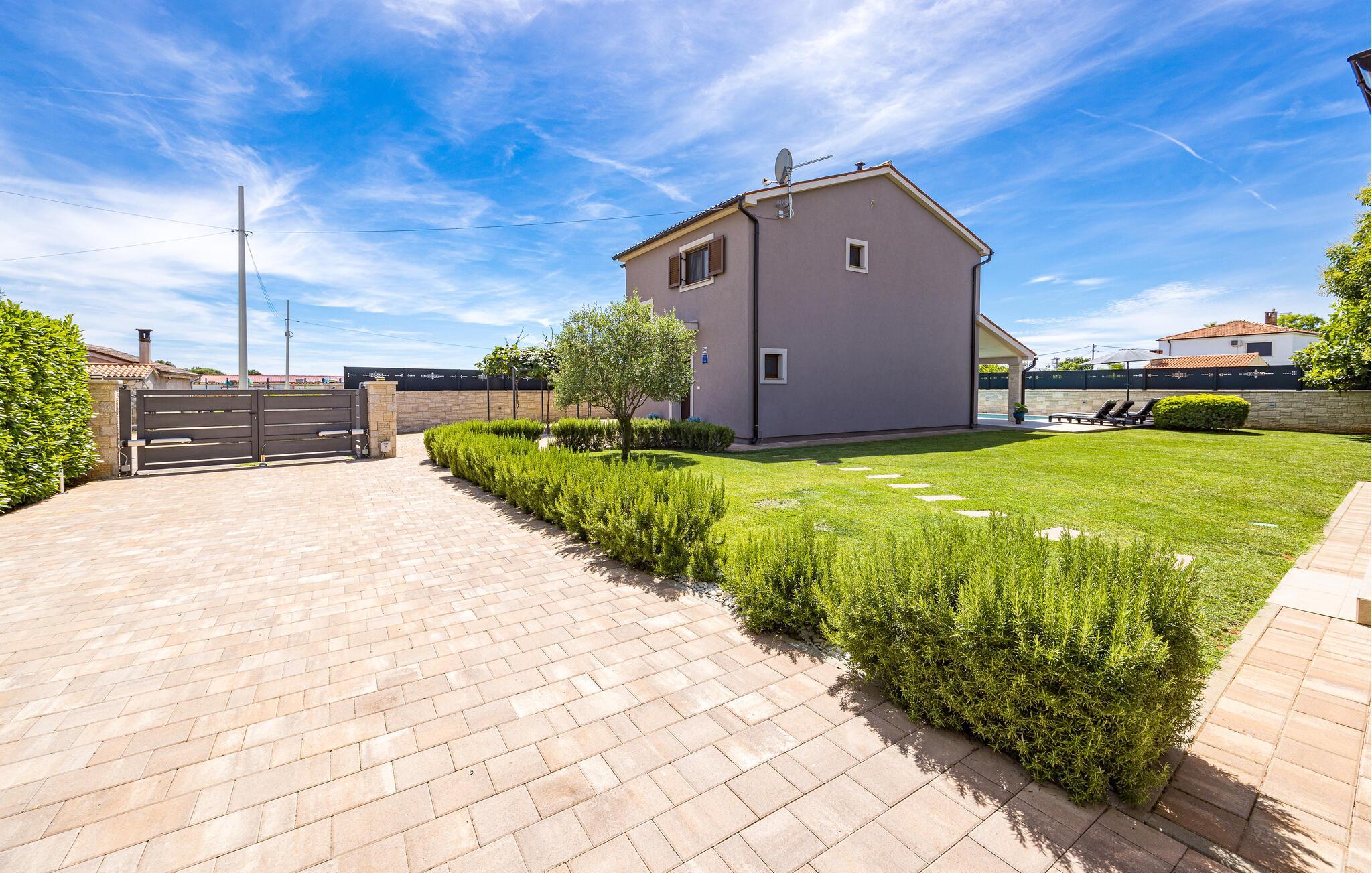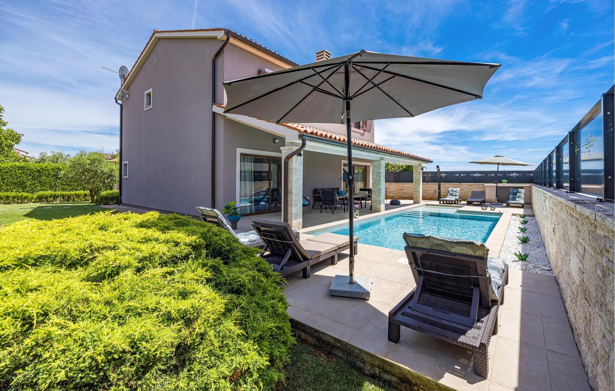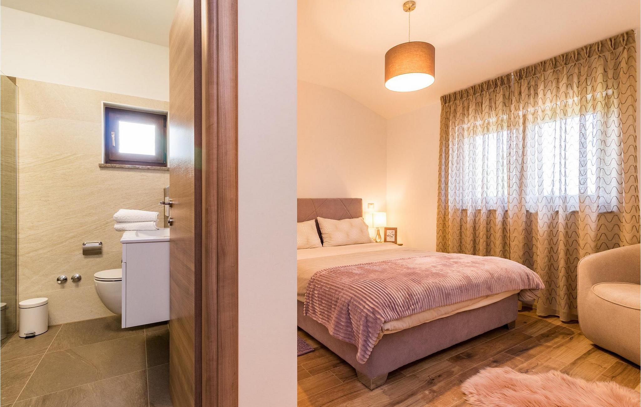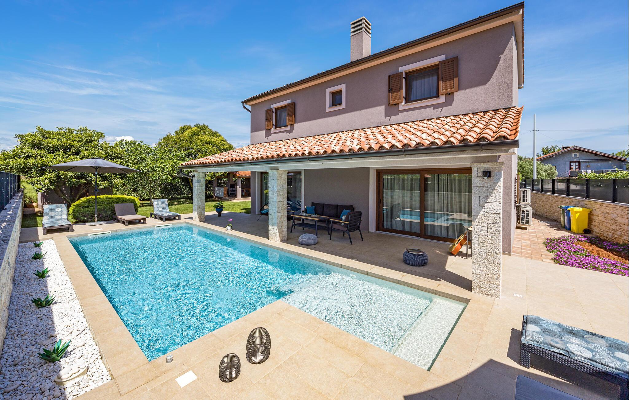 Villa Roma ligger på den sørlige delen av Istria-halvøya og tilbyr overnatting for 6 personer. Villaen består av 3 stilfullt innredede og koselige soverom, som alle har klimaanlegg og eget bad, slik at alle gjestene kan nyte maksimal komfort under oppholdet. Alle soverommene ligger i øverste etasje. I første etasje kan alle samles i den romslige stuen med peis og satellitt-TV eller tilberede måltider på kjøkkenet, som er utstyrt med alt du trenger under oppholdet. Det er også en kullgrill og en koselig spiseplass under tak hvis du foretrekker å spise ute. Det innbydende bassenget ligger bare noen få skritt fra stuen og byr på forfriskninger til alle døgnets tider. Nærmeste butikk og kafé ligger i sentrum av landsbyen, bare en kort spasertur fra villaen. Hvis du vil tilbringe dagen på stranden, er det mange muligheter i området, ettersom den sørlige delen av Istria har en svært variert kystlinje. Villaen har klimaanlegg, kjæledyrvennlig, 2 private parkeringsplasser og en inngjerdet hage - det perfekte valget for en avslappende ferie.Villa Roma ligger i den lille landsbyen Jadreski, bare ca. 7 km fra Pula. Pula er den største byen på Istria-halvøya og en av de viktigste turistbyene med mye å se og utforske. Pula ble bygget av romerne i år 46 f.Kr. Selv om Pula er som et oldtidsmuseum i det fri, må du også besøke det største monumentet, det berømte amfiteateret fra det 1. århundre, som ligger i nærheten av sentrum. Her finner mange arrangementer sted, fra konserter og filmvisninger til sportsbegivenheter. Forum med August-tempelet ligger i den gamle bykjernen. Her kan du også besøke Istrias historiske museum og Istrias arkeologiske museum. I nærområdet kan du besøke vakre istriske småbyer, utforske naturstrender og dra på fotturer, sykle eller dykke. Du kan også smake på deilige istriske spesialiteter under oppholdet.