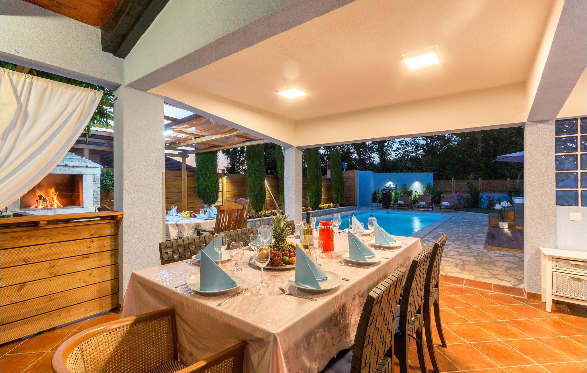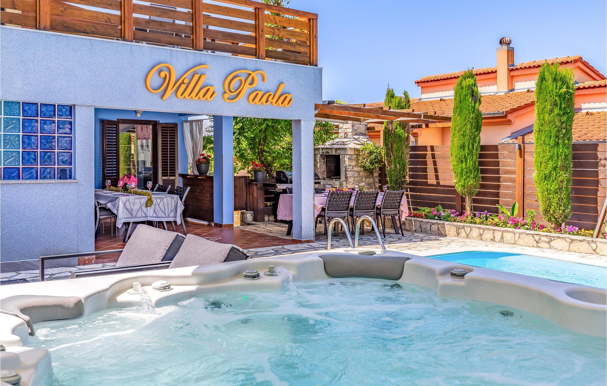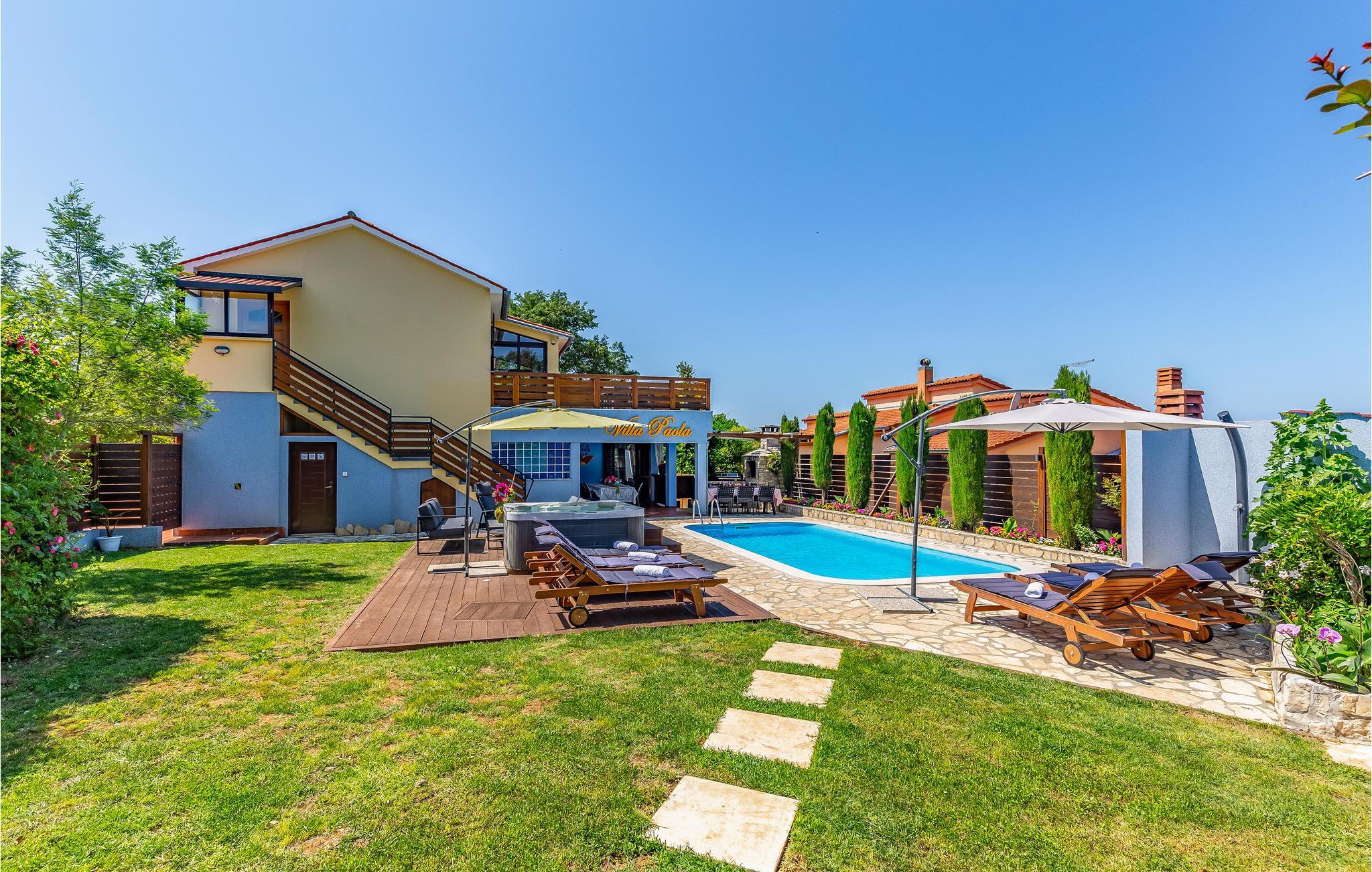 Dette vakre og komfortable feriehuset med basseng og boblebad for seks personer ligger i Loborika nær Pula, omgitt av natur. Her kan du nyte en avslappende ferie. Det indre av huset er spredt over to etasjer, som er forbundet med en utvendig trapp. I første etasje er det fire soverom og fire bad, hvorav ett har en utvendig inngang. I tillegg ligger en stor stue, en spisestue og et kjøkken med utgang til den overbygde terrassen i første etasje. I første etasje er det ytterligere to soverom som deler bad, en kjøkkenkrok og et stort oppholdsrom med biljardbord. Gårdsplassen med basseng er vakkert anlagt med mange blomster. Slapp av i det store boblebadet. Den store overbygde terrassen er ideell for bespisning og sosialt samvær på sommerdager.