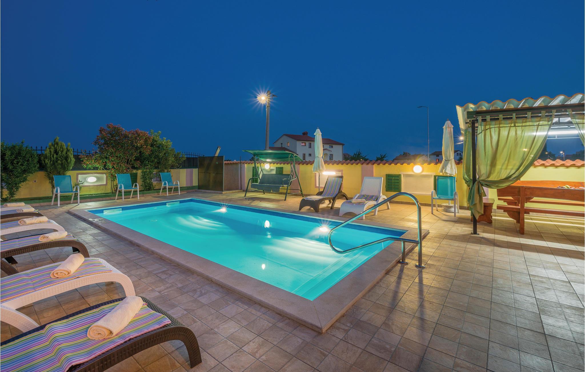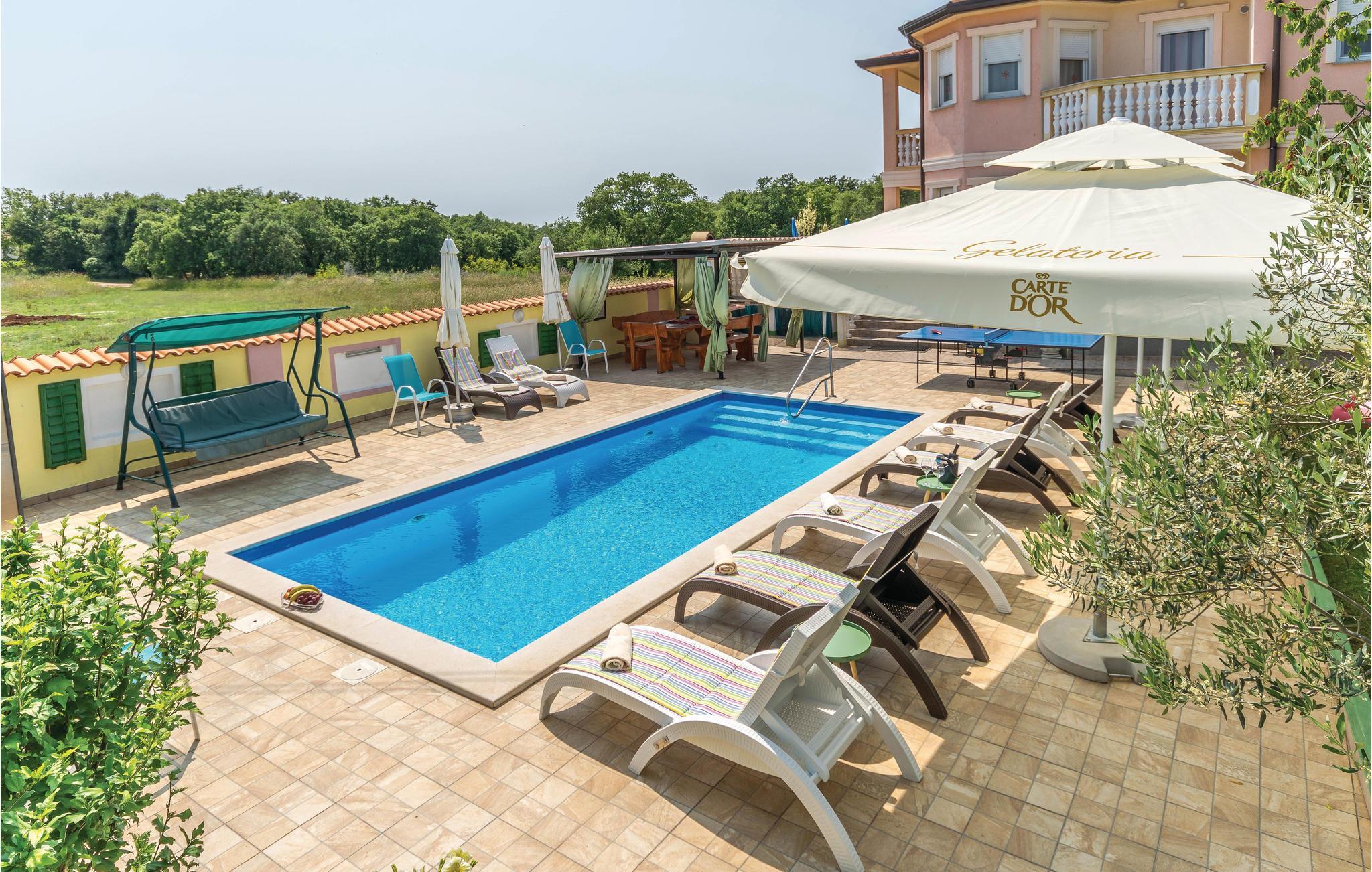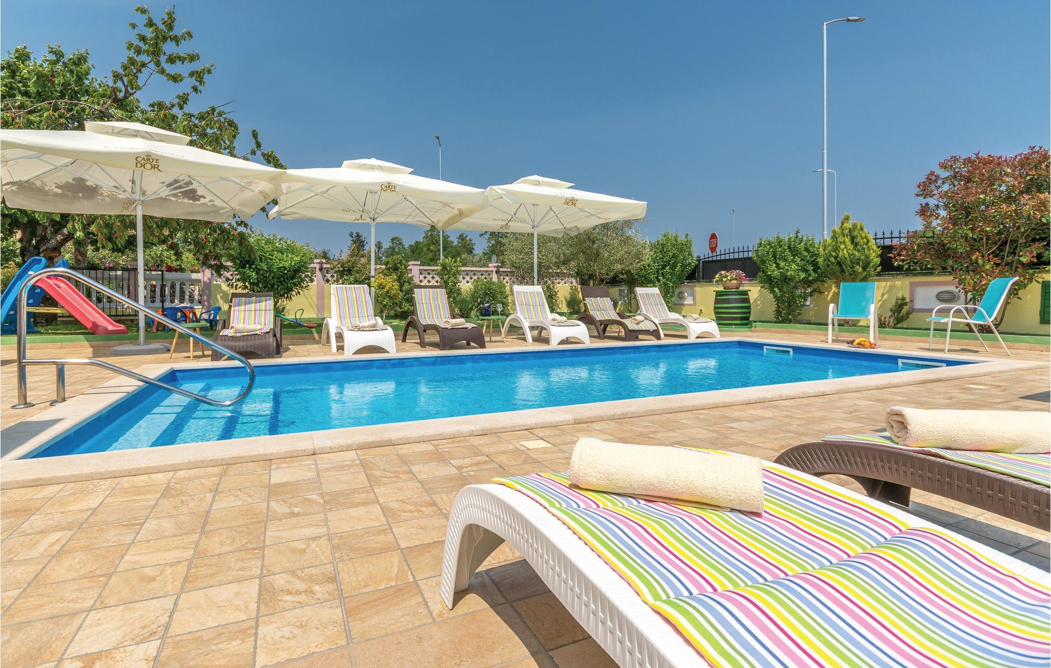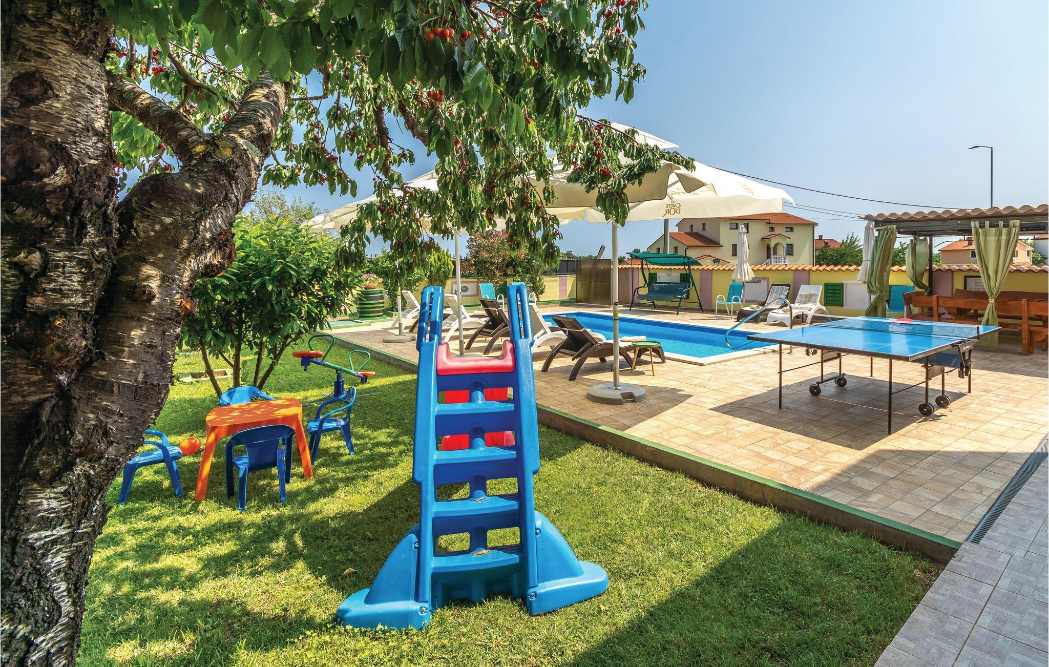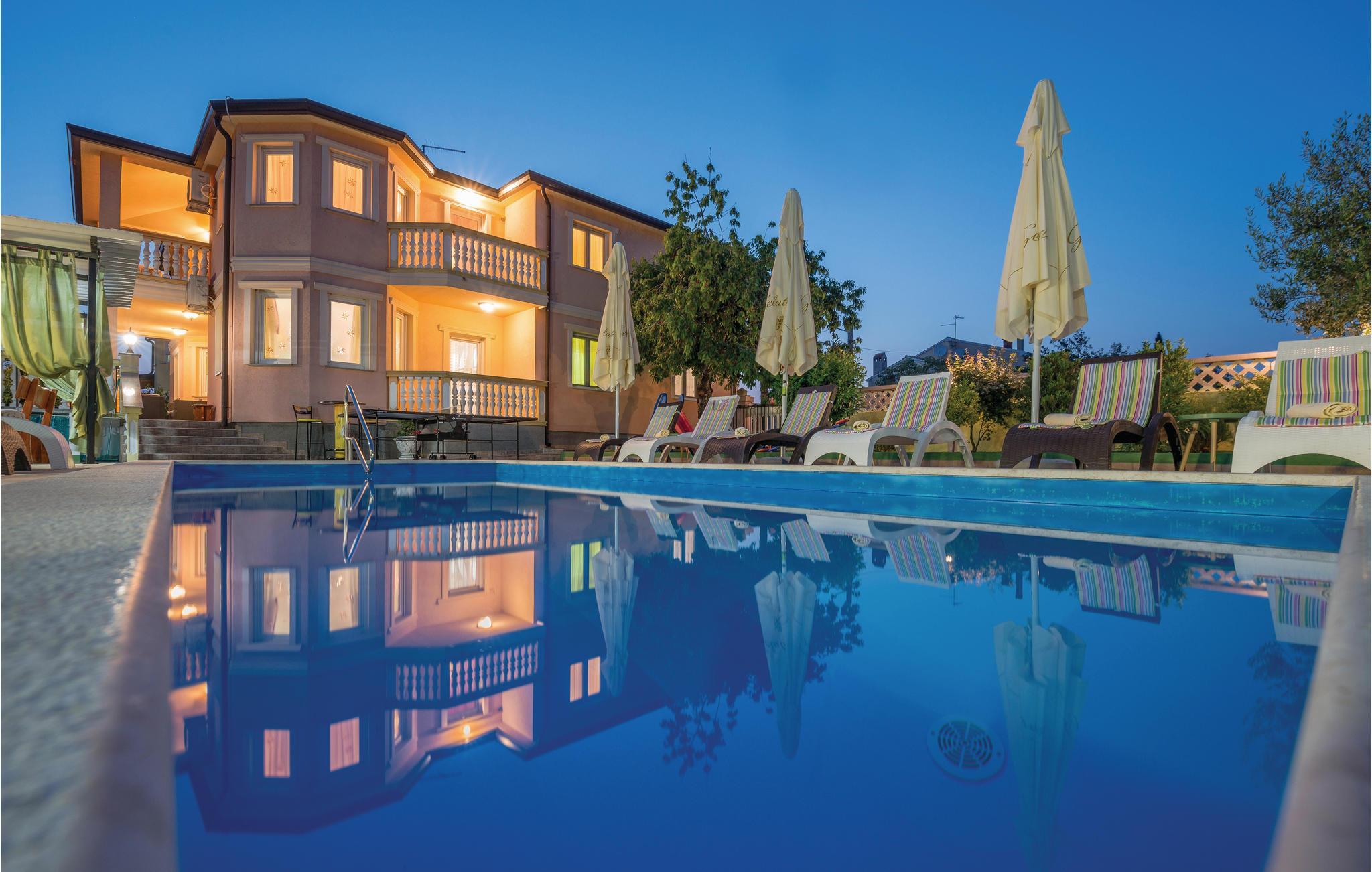 Dette moderne feriehuset ligger i landsbyen Loborika, 6 kilometer fra gamle Pula. Med romslige rom og komfortable møbler er du sikker på å få en hyggelig ferie. Siden første etasje og første etasje er forbundet med utvendige trapper, er huset ideelt for en felles ferie for to familier, som ikke trenger å gi avkall på privatliv i det hele tatt. Spisestuen i første etasje er stor nok til å imøtekomme alle gjestene i huset, og med den overbygde terrassen er det ideelle salonger for felles måltider, spill, underholdning og mer. De nysgjerrige øynene til andre mens du bader og soler deg ved bassenget forhindres av vegger, og garanterer dermed privatliv. De minste har vippen og sklia til disposisjon. Plasseringen av huset lar deg ta dagsturer til Pula, eller å utforske det vakre interiøret i Istria og dets funksjoner. De vakre strendene finner du i nærheten av Pula, Medulin, Krnica og Duga Uvala, sikkert din favorittstrand er blant dem.