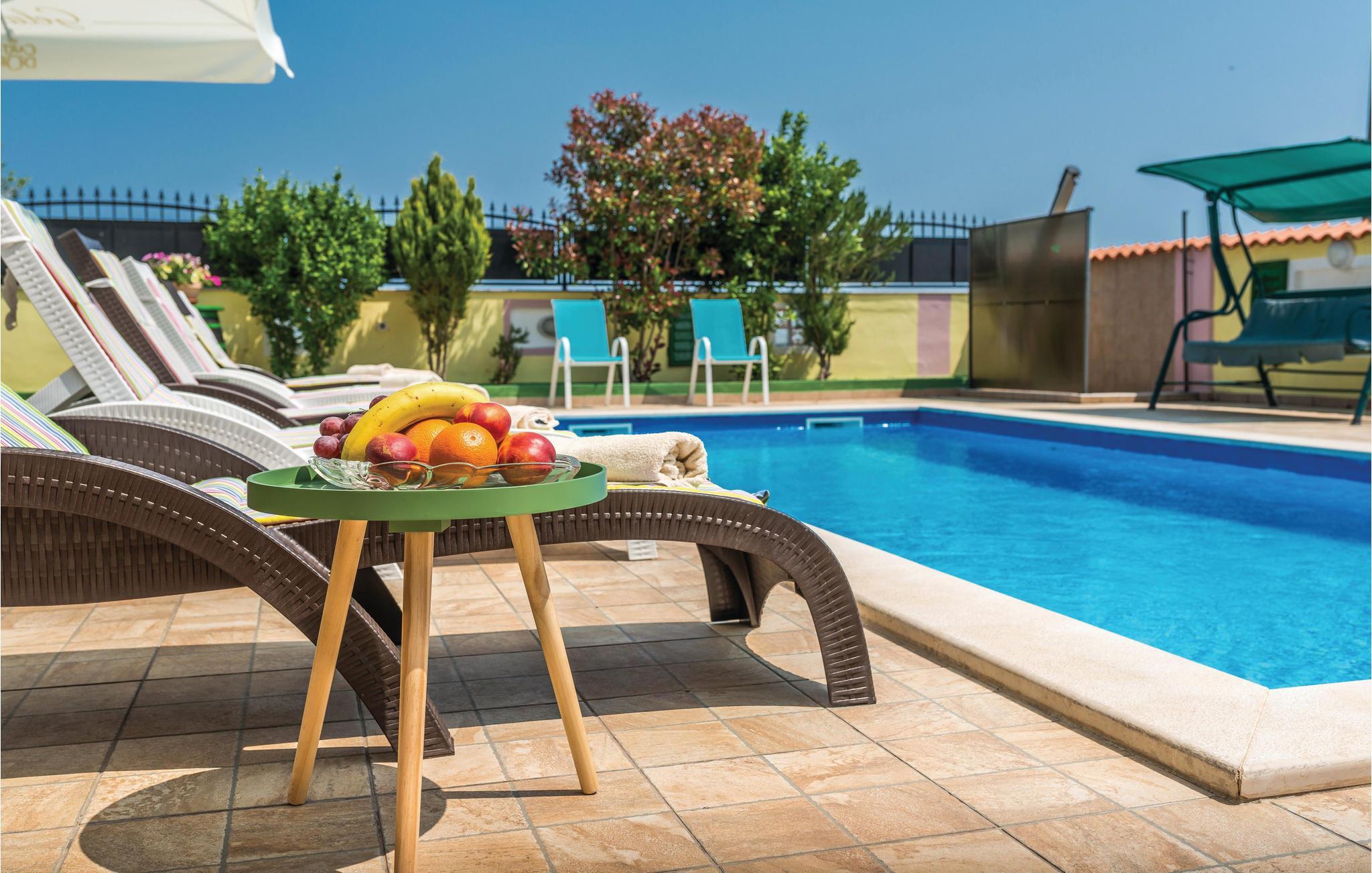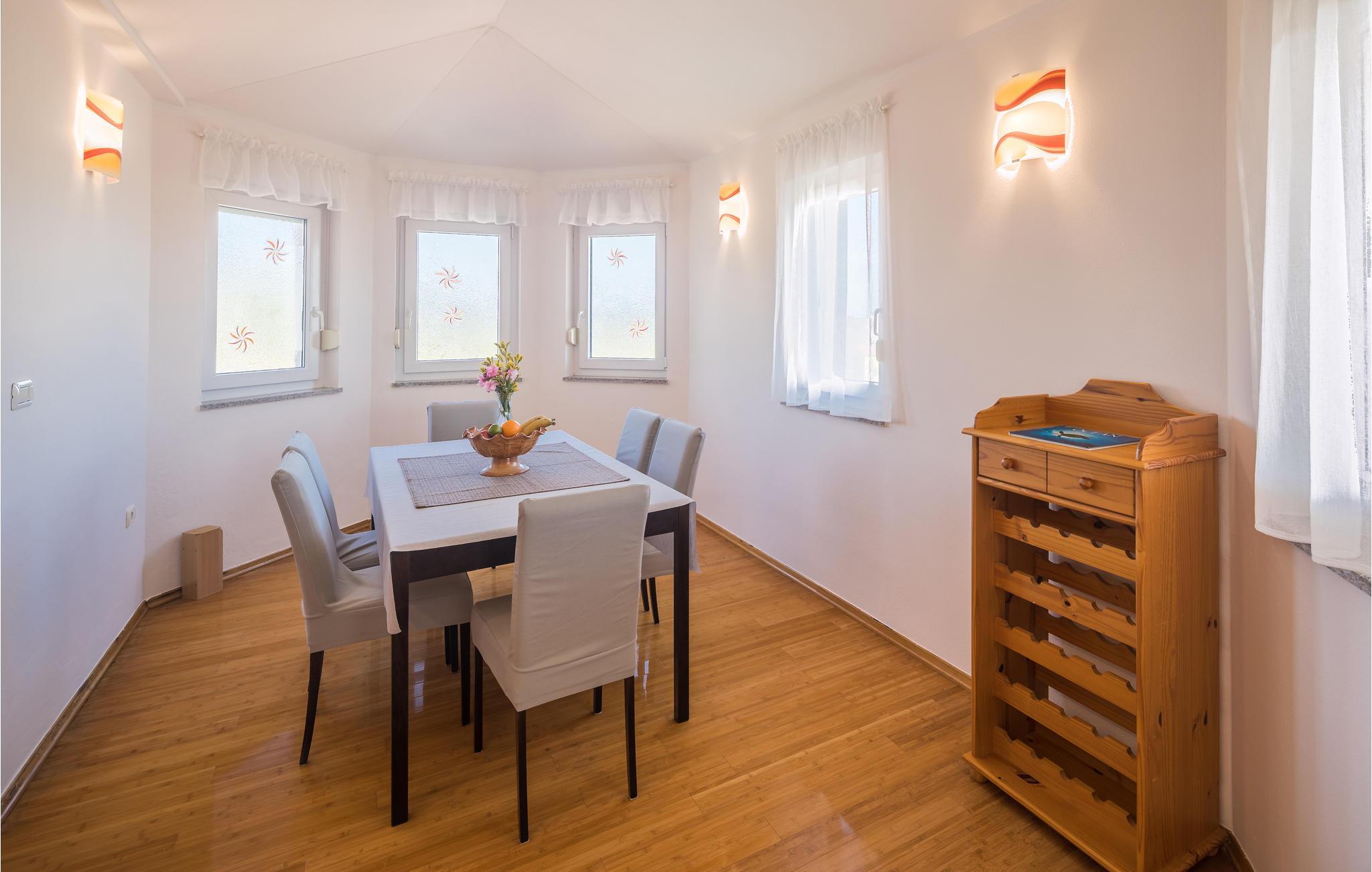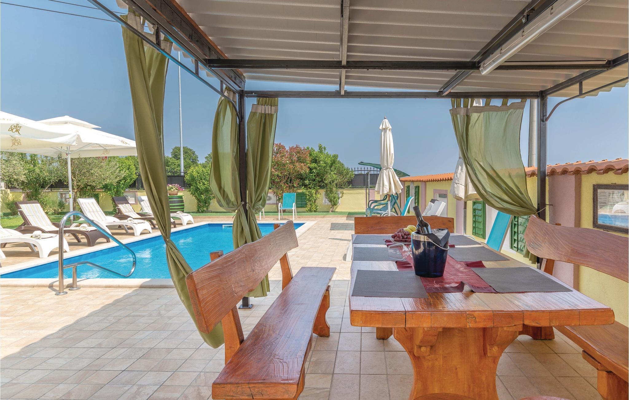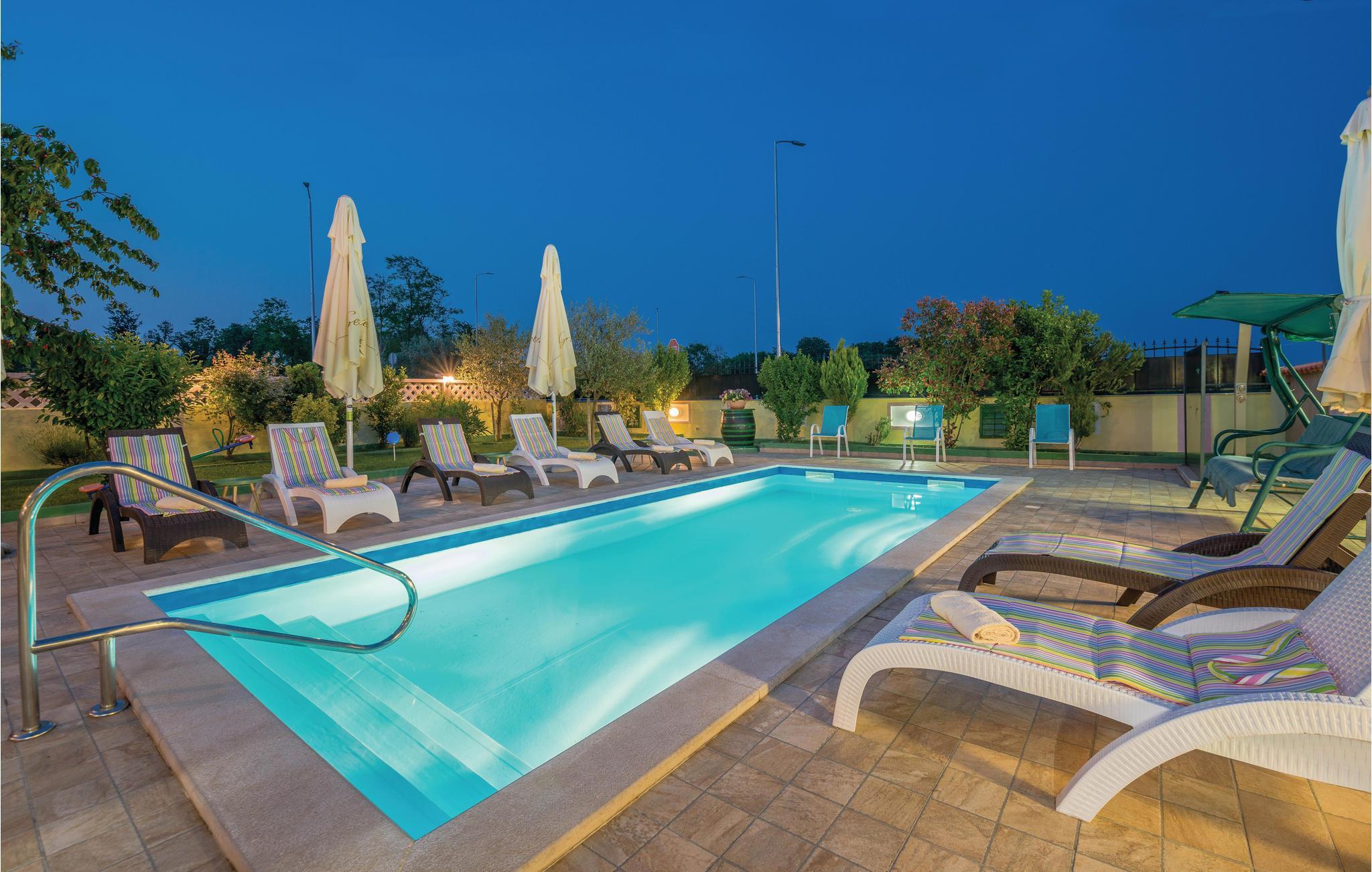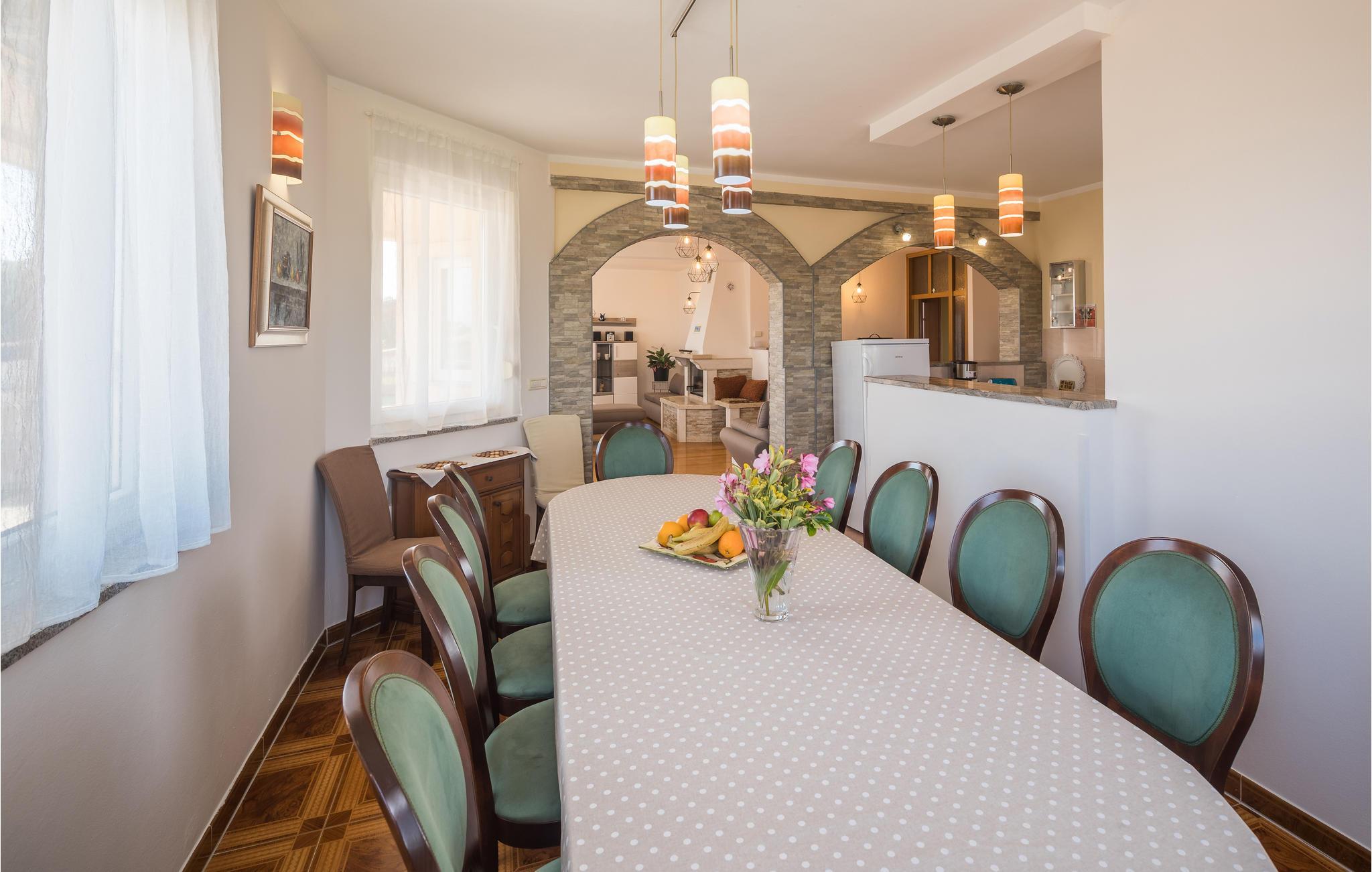 Dette moderne feriehuset ligger i landsbyen Loborika, 6 kilometer fra gamle Pula. Med romslige rom og komfortable møbler er du sikker på å få en hyggelig ferie. Siden første etasje og første etasje er forbundet med utvendige trapper, er huset ideelt for en felles ferie for to familier, som ikke trenger å gi avkall på privatliv i det hele tatt. Spisestuen i første etasje er stor nok til å imøtekomme alle gjestene i huset, og med den overbygde terrassen er det ideelle salonger for felles måltider, spill, underholdning og mer. De nysgjerrige øynene til andre mens du bader og soler deg ved bassenget forhindres av vegger, og garanterer dermed privatliv. De minste har vippen og sklia til disposisjon. Plasseringen av huset lar deg ta dagsturer til Pula, eller å utforske det vakre interiøret i Istria og dets funksjoner. De vakre strendene finner du i nærheten av Pula, Medulin, Krnica og Duga Uvala, sikkert din favorittstrand er blant dem.