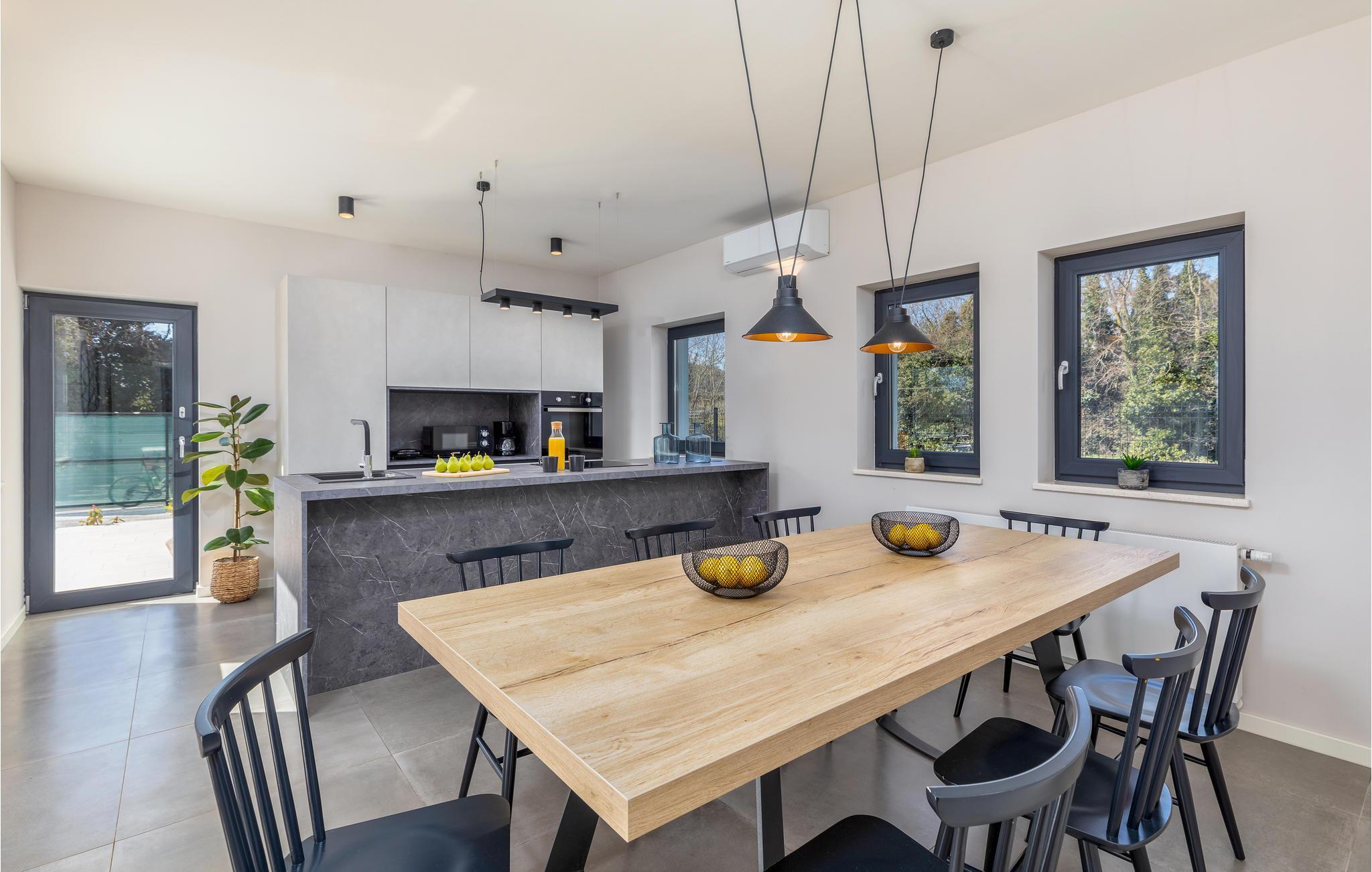 Dette romslige feriehuset ligger på en vakker naturtomt med utsikt over landskapet, noe som gjør det ideelt for en ferie med mye natur. Huset strekker seg over to etasjer, og innvendig kan du forvente et smakfullt interiør av høy kvalitet med mange vakre detaljer og komfort. Med sine 200 kvadratmeter tilbyr eiendommen god plass til en eller to familier med kjæledyr.