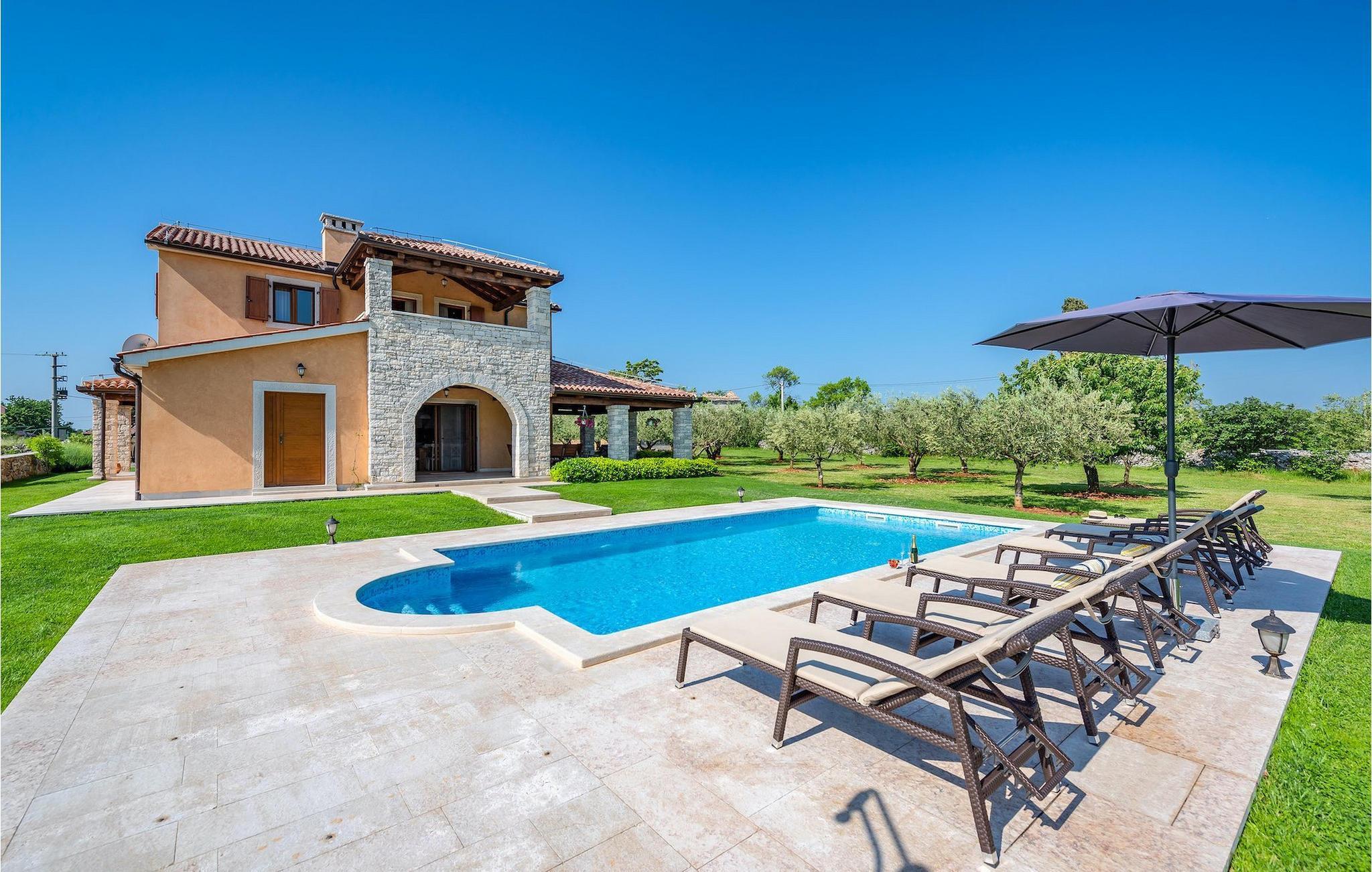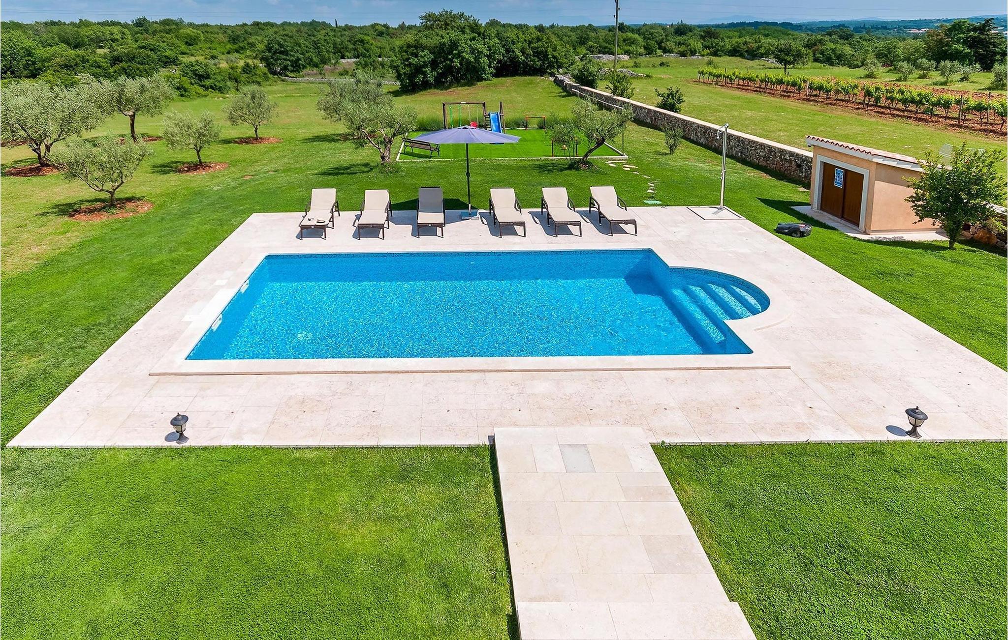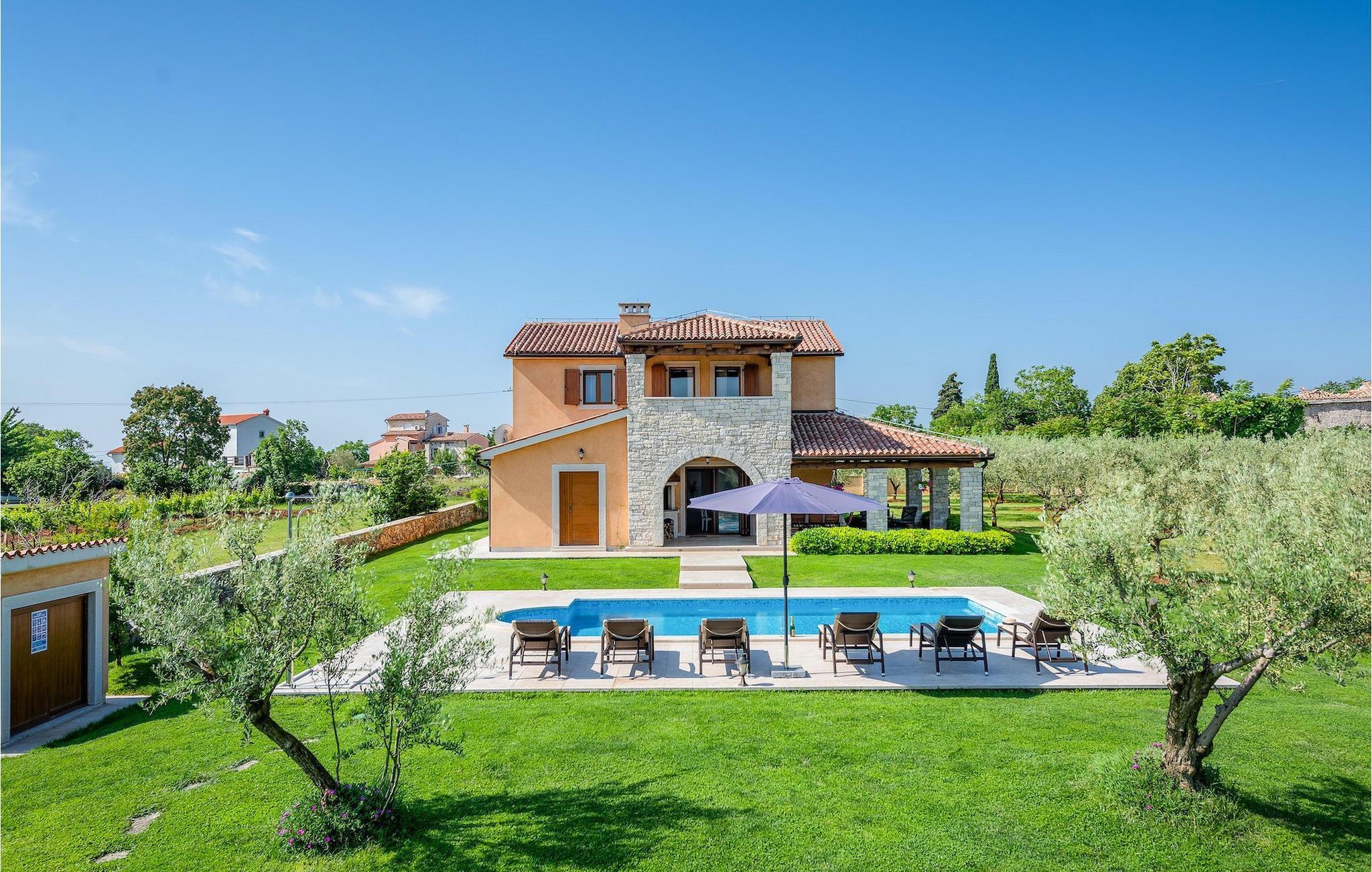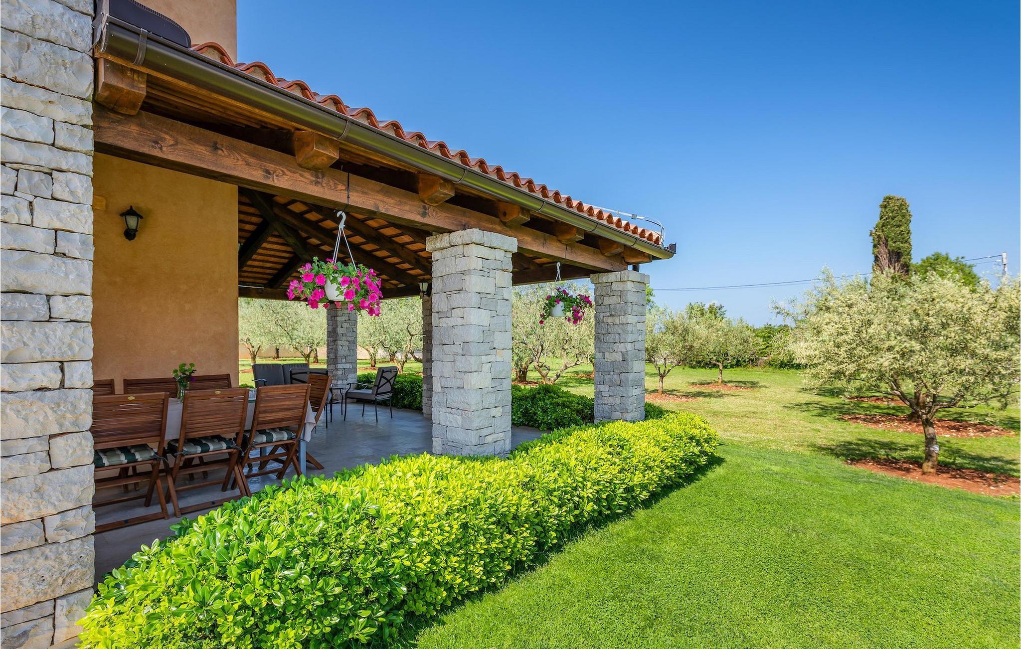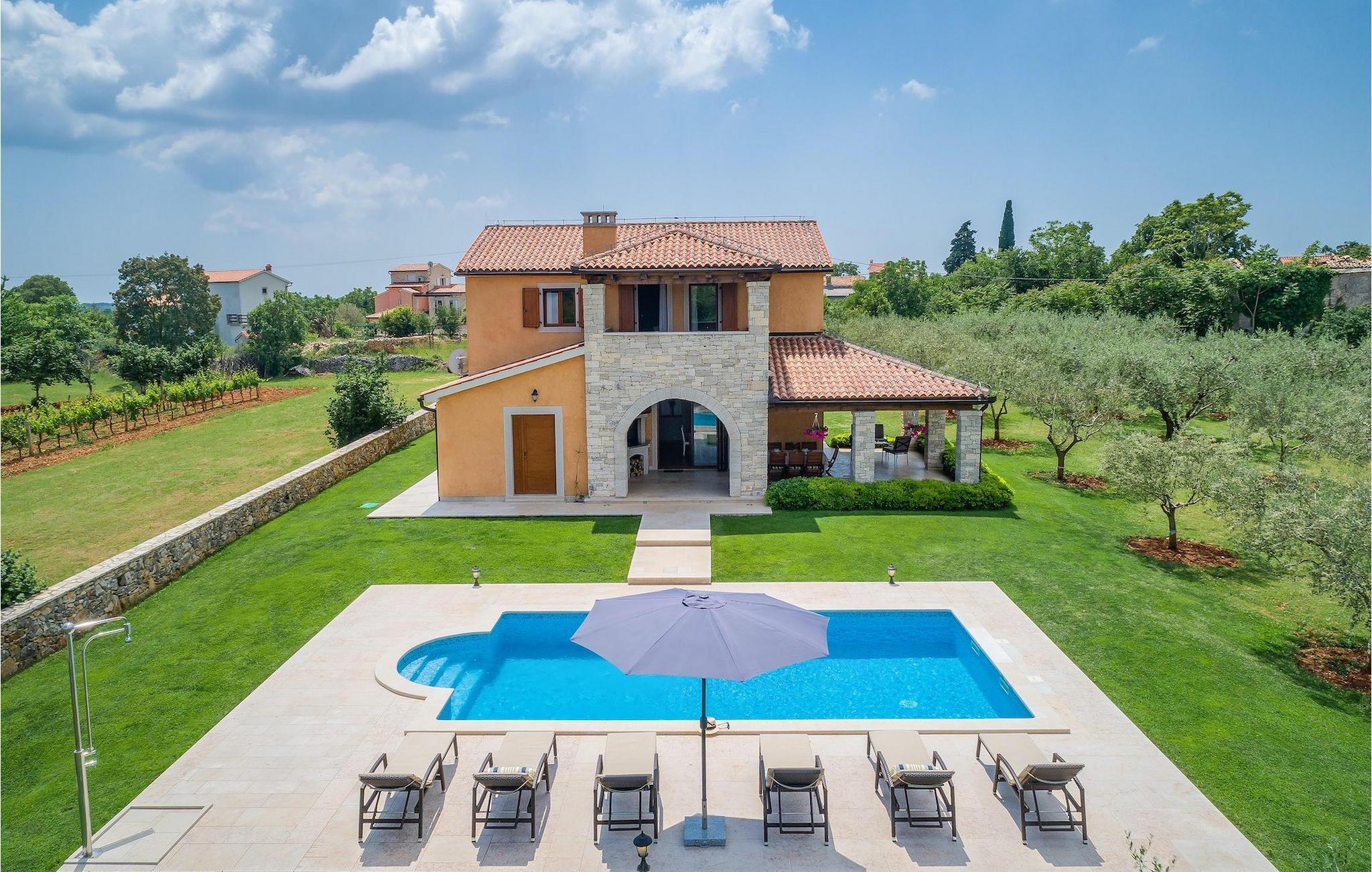 Vakkert feriehus omgitt av grøntområder. I enden av den lille landsbyen Filipana i det sørlige Istria, en halvøy ved Middelhavet. Feriehuset tilbyr en luksuriøs innkvartering med mye privatliv. Husets naturlige byggematerialer og belysningssystem er nøye gjennomtenkt for å gi maksimal komfort og en behagelig ferieopplevelse til enhver tid. Kjøkkenet, et toalett, et soverom med to enkeltsenger og bad, et soverom med dobbeltseng og direkte tilgang til badet, spisestuen og stuen ligger i første etasje med vakker utsikt over svømmebassenget. I andre etasje er det to soverom med dobbeltseng og to bad. Eiendommen ligger på en stor tomt med mange oliventrær, enger og skog, noe som gir en unik atmosfære og fullstendig privatliv for gjestene på en tomt på over 22 900 m2. Området rundt bassenget er møblert med solsenger laget av naturmaterialer. Dette vakre feriehuset ligger i den lille landsbyen Filipana sør på Istria-halvøya, og er ideelt for familieaktiviteter, romantiske utflukter og avslapning. Et ferieopphold i dette feriehuset tilbyr den perfekte balansen mellom ro og privat nytelse, vekk fra byens kjas og mas og turistmassene, men ikke langt fra alle de viktige stedene på halvøya.