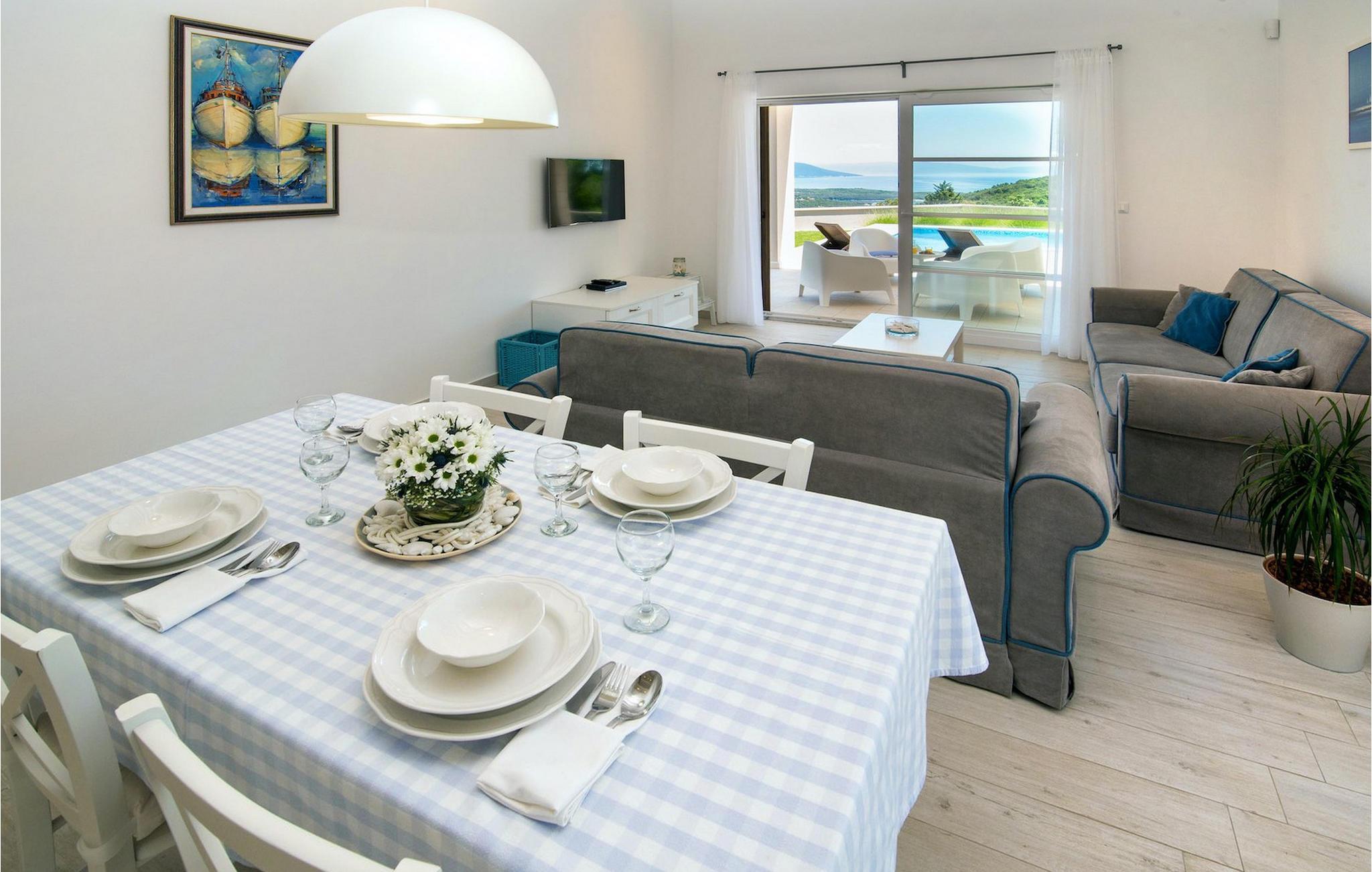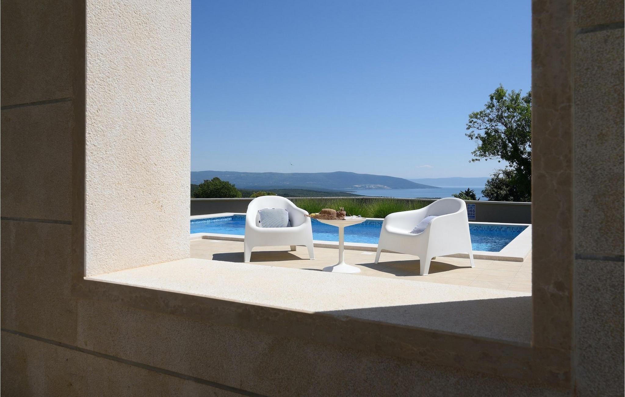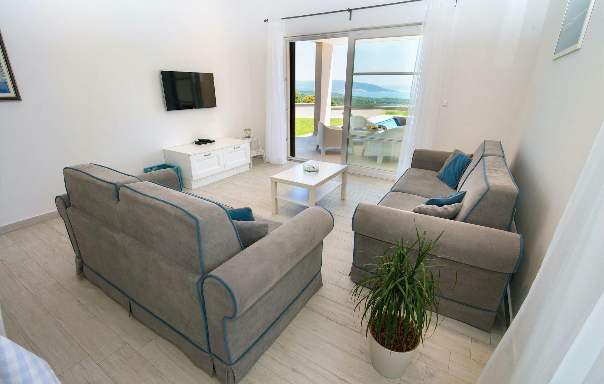 Den romslige og luftige stuen ligger i forbindelse med spiseplass og kjøkken og har direkte utgang til hagen med basseng. De to koselige dobbeltrommene har klimaanlegg og TV, slik at du kan slappe helt av i ferien. Fra den store hagen har du en fenomenal utsikt over havet, øya Cres og de omkringliggende åsene. Du bestemmer selv hvor du vil tilbringe mesteparten av tiden din. Kanskje på den overbygde terrassen med uteservering eller på en av solsengene ved siden av det private bassenget, hvorfra du kan nyte utsikten.
