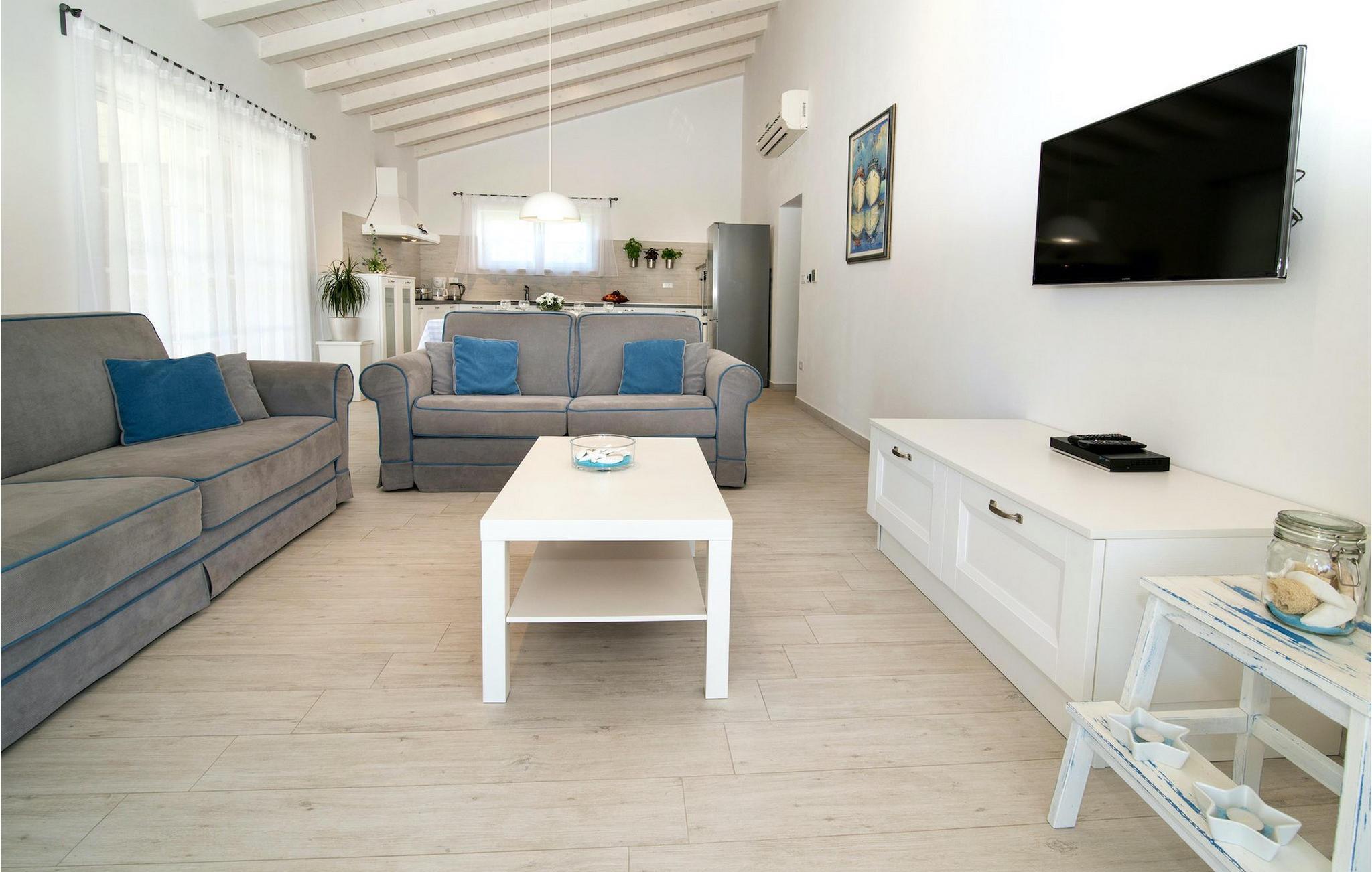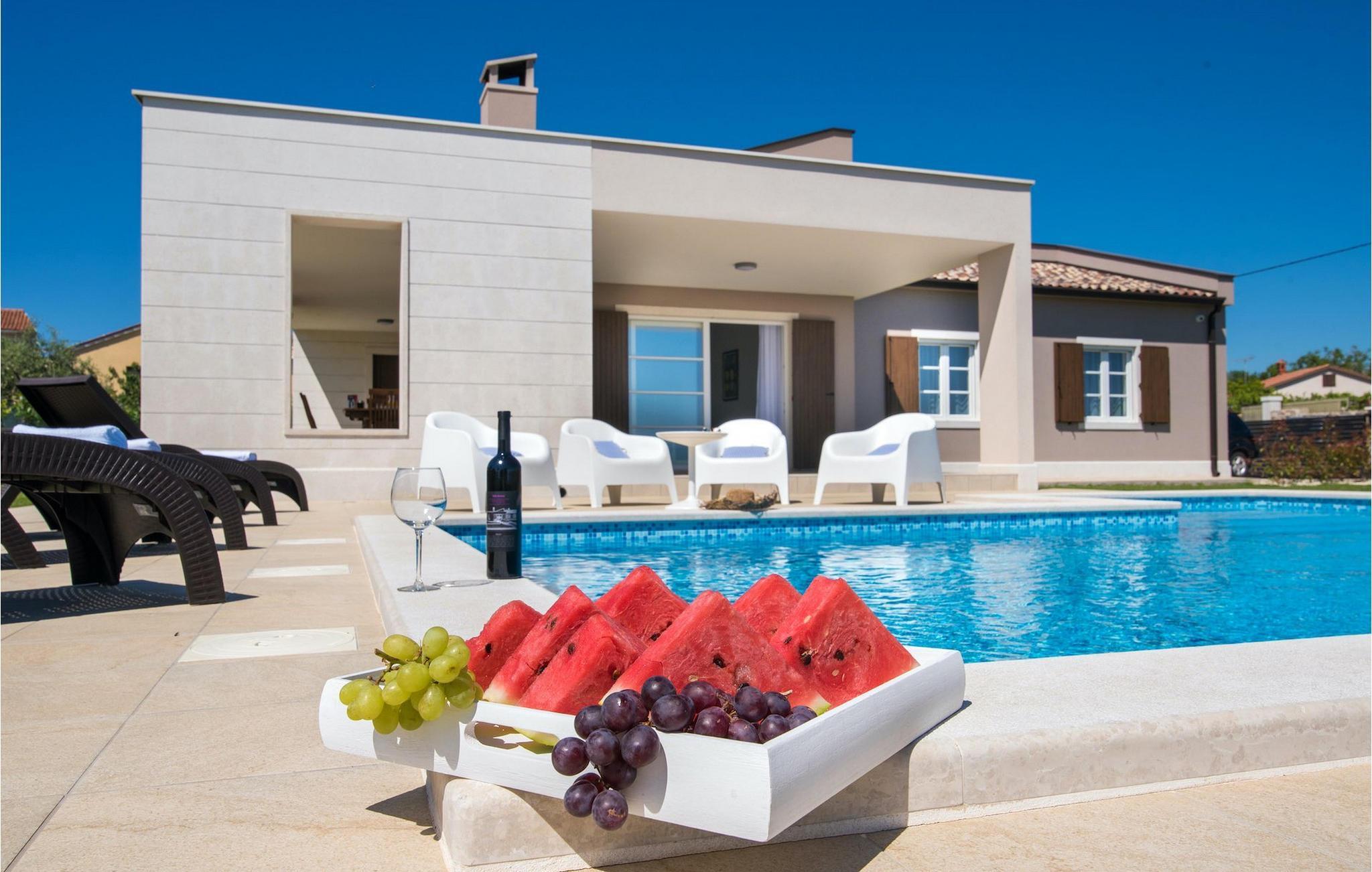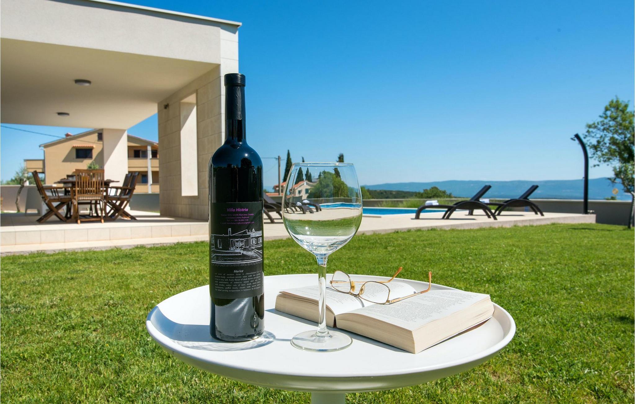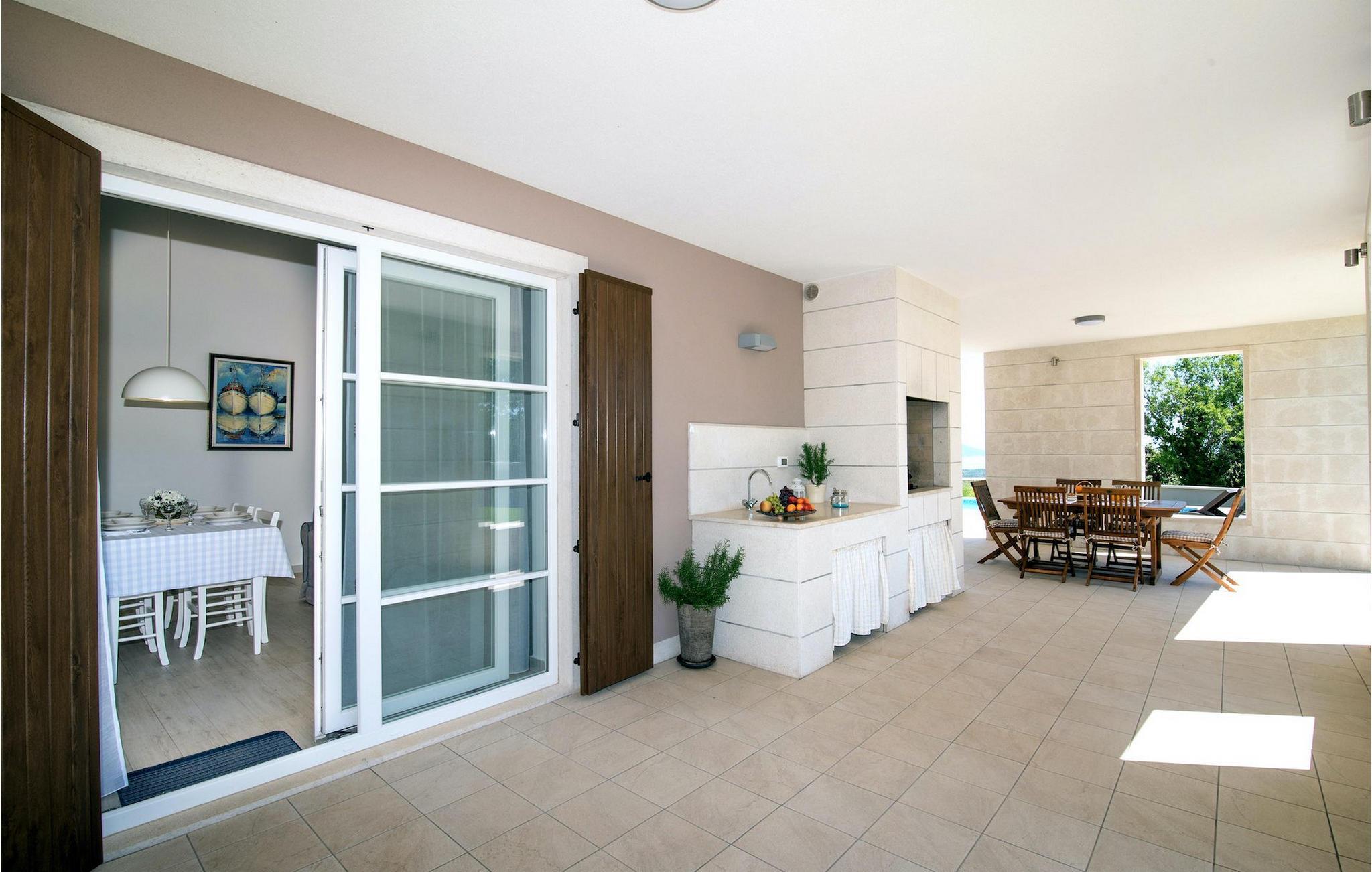 Den romslige og luftige stuen ligger i forbindelse med spiseplass og kjøkken og har direkte utgang til hagen med basseng. De to koselige dobbeltrommene har klimaanlegg og TV, slik at du kan slappe helt av i ferien. Fra den store hagen har du en fenomenal utsikt over havet, øya Cres og de omkringliggende åsene. Du bestemmer selv hvor du vil tilbringe mesteparten av tiden din. Kanskje på den overbygde terrassen med uteservering eller på en av solsengene ved siden av det private bassenget, hvorfra du kan nyte utsikten.